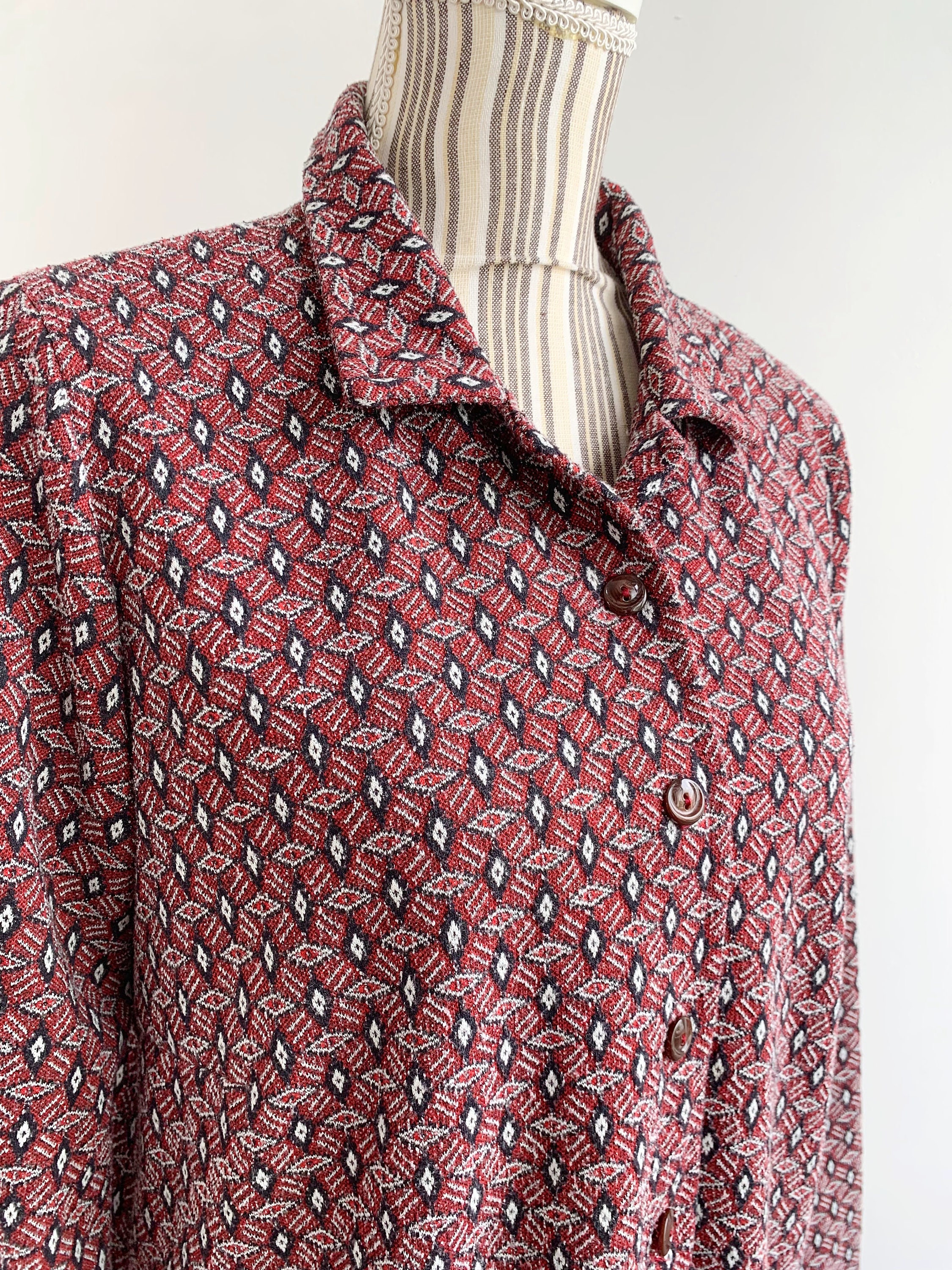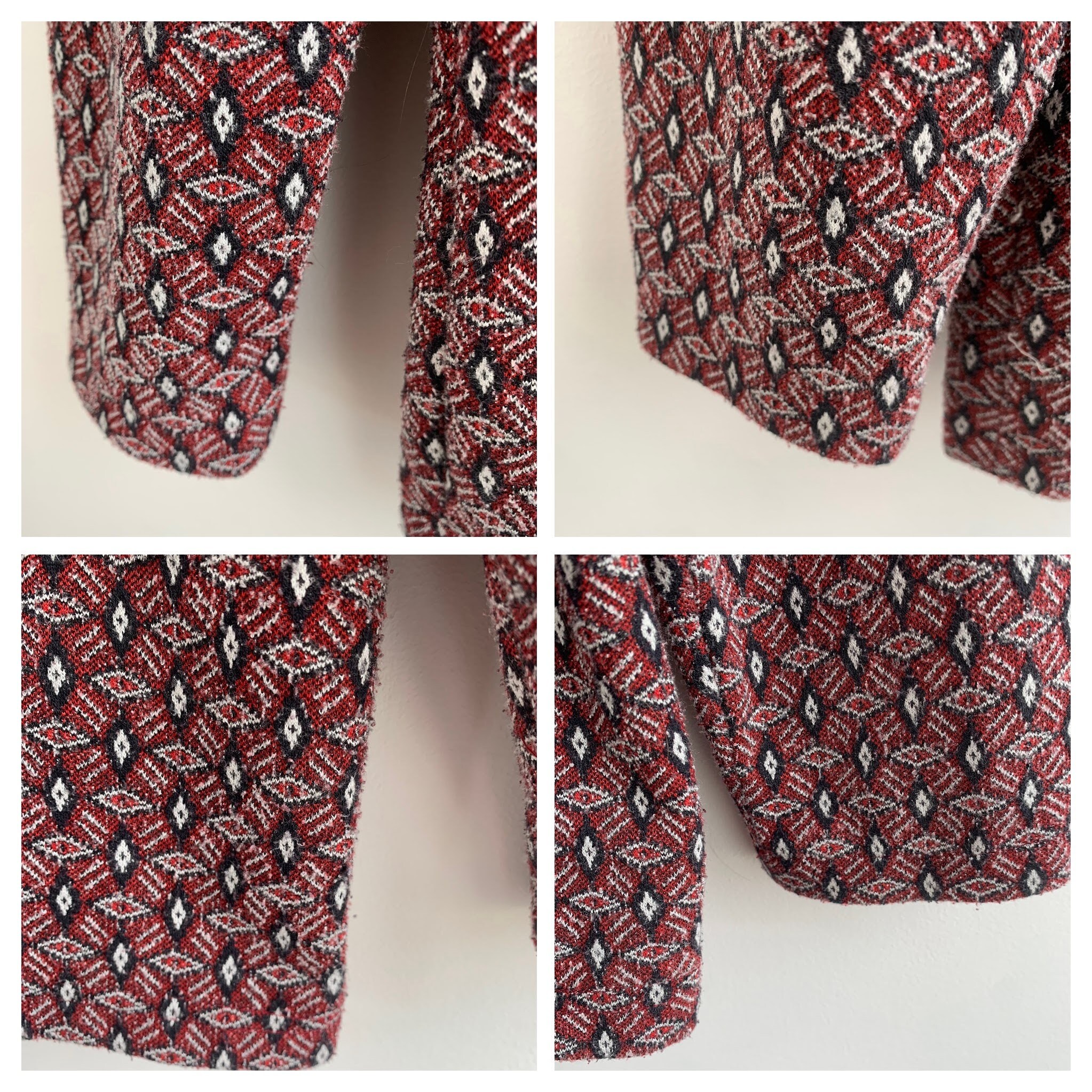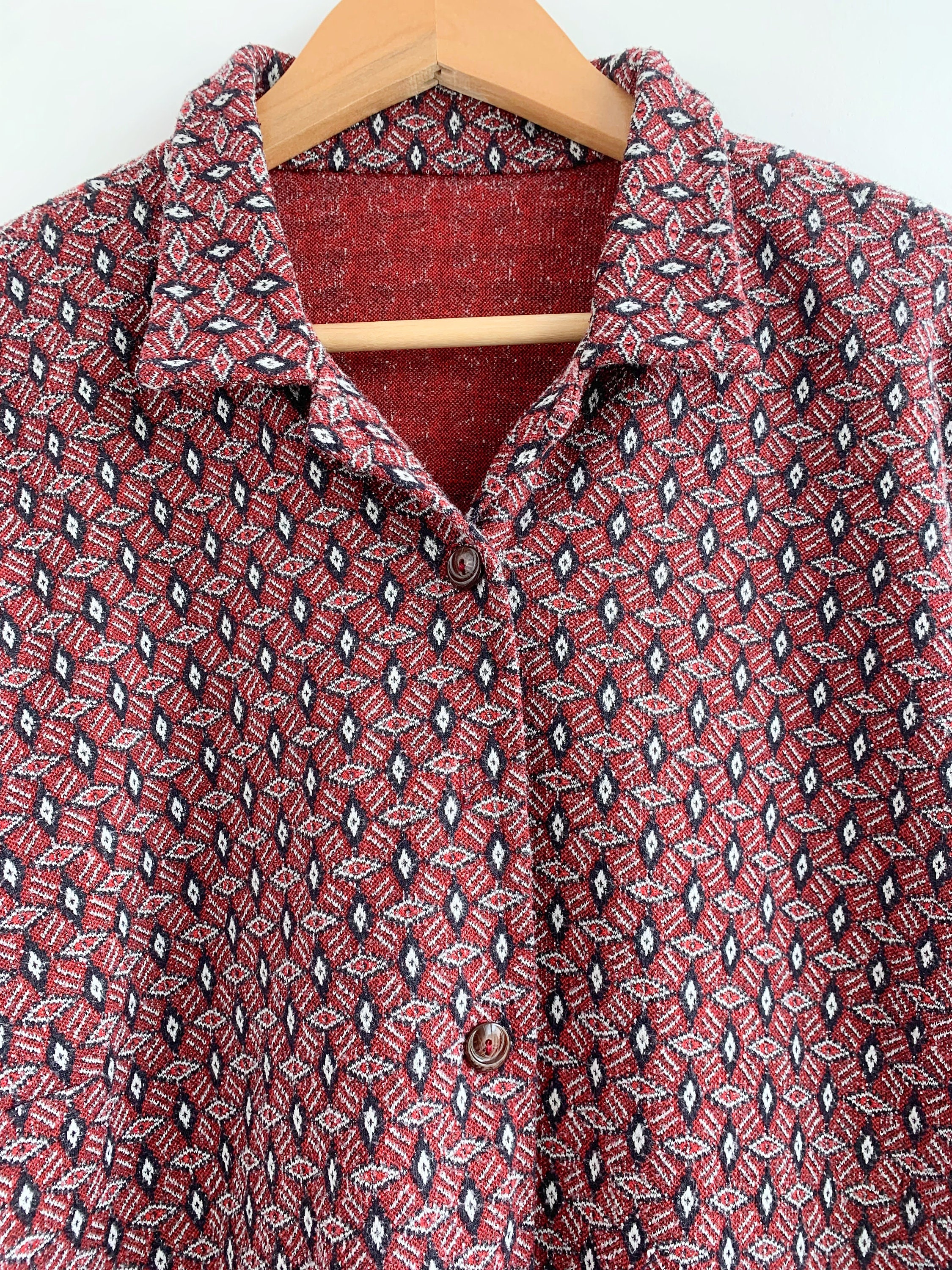 This is s vintage 70s burgundy red geometric tiny print collared button up shirt for women. This groovy seventies shirt is made of thick stretchy jersey fabric. It was handmade and it has no label. It fits like size L. Please check the measurements below.