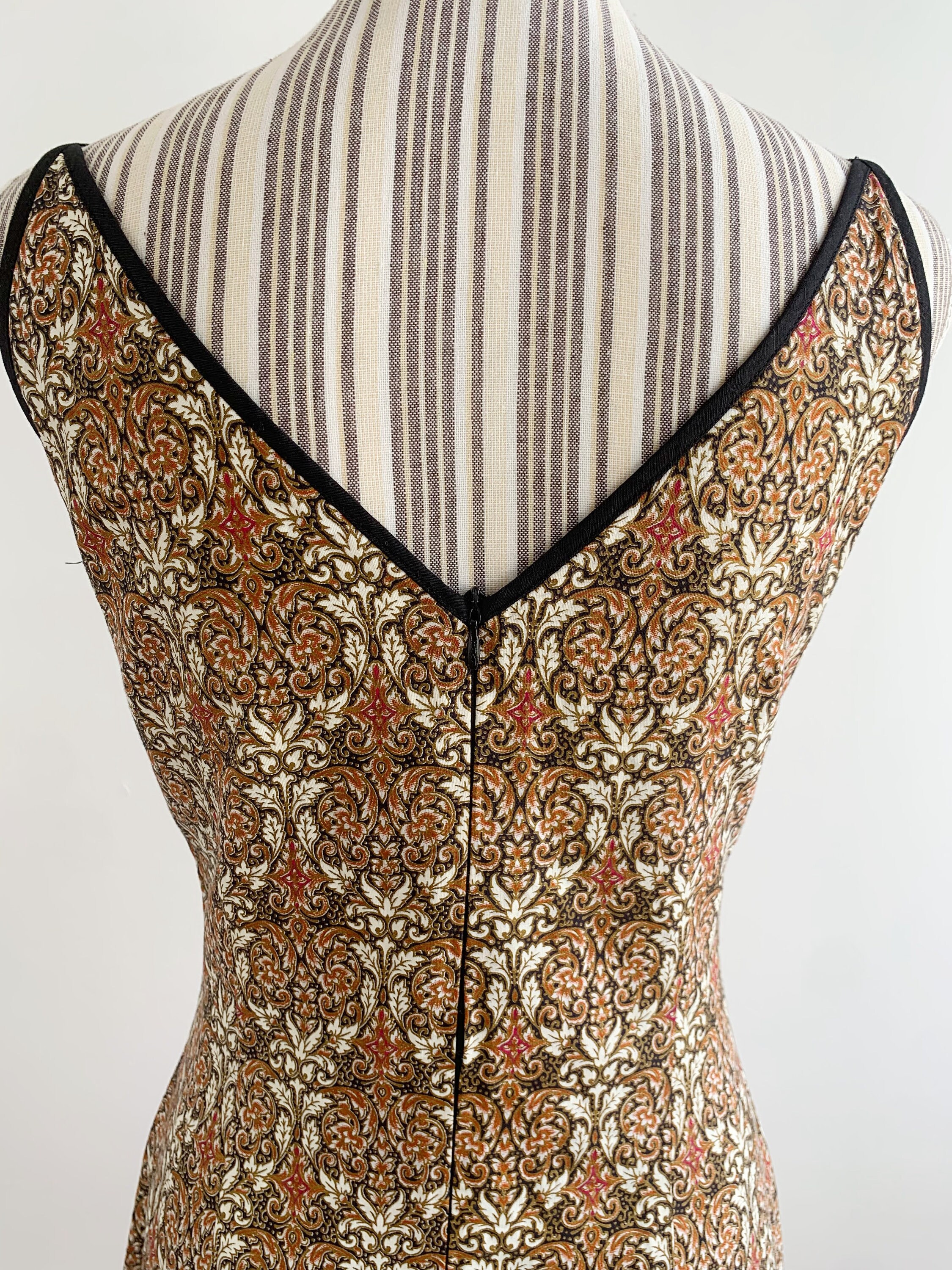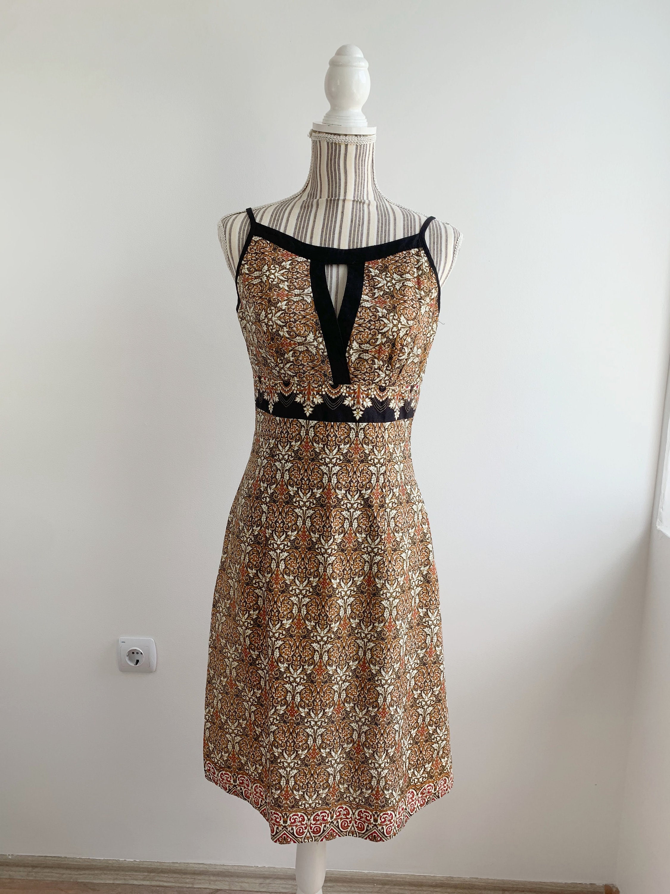 Beautiful earthy tone beige brown above the knee dress, made of cotton fabric with cut out V neckline, back zipper and back V neck. This lovely paisley print dress fits like size small to medium, the size marked is M, fits like S. The fabric has no stretch, it's a solid cotton fabric. It was made in Cambodia. I am modelling the dress. I wear size S/ EUR 36 / US 6 / UK 10.