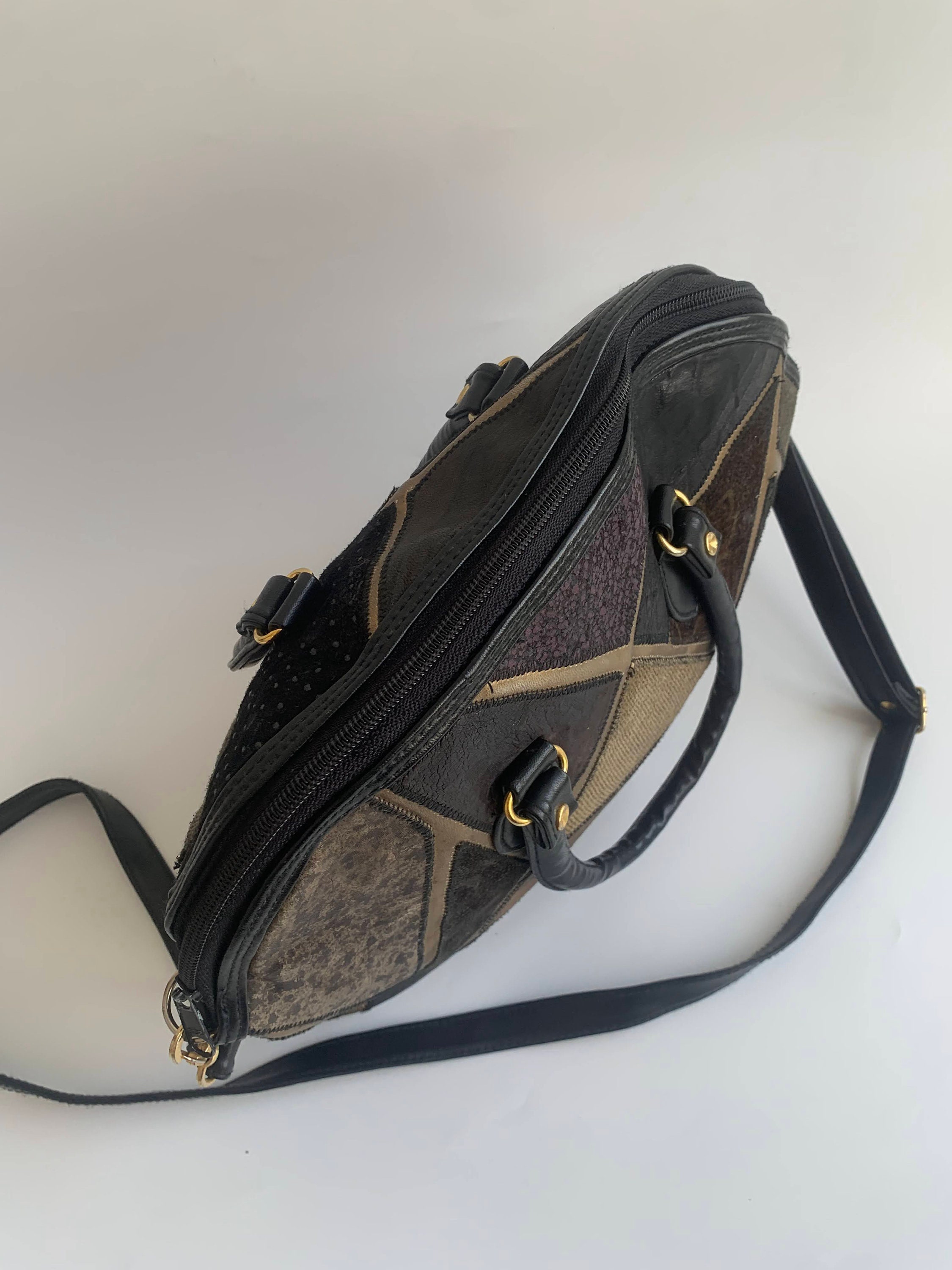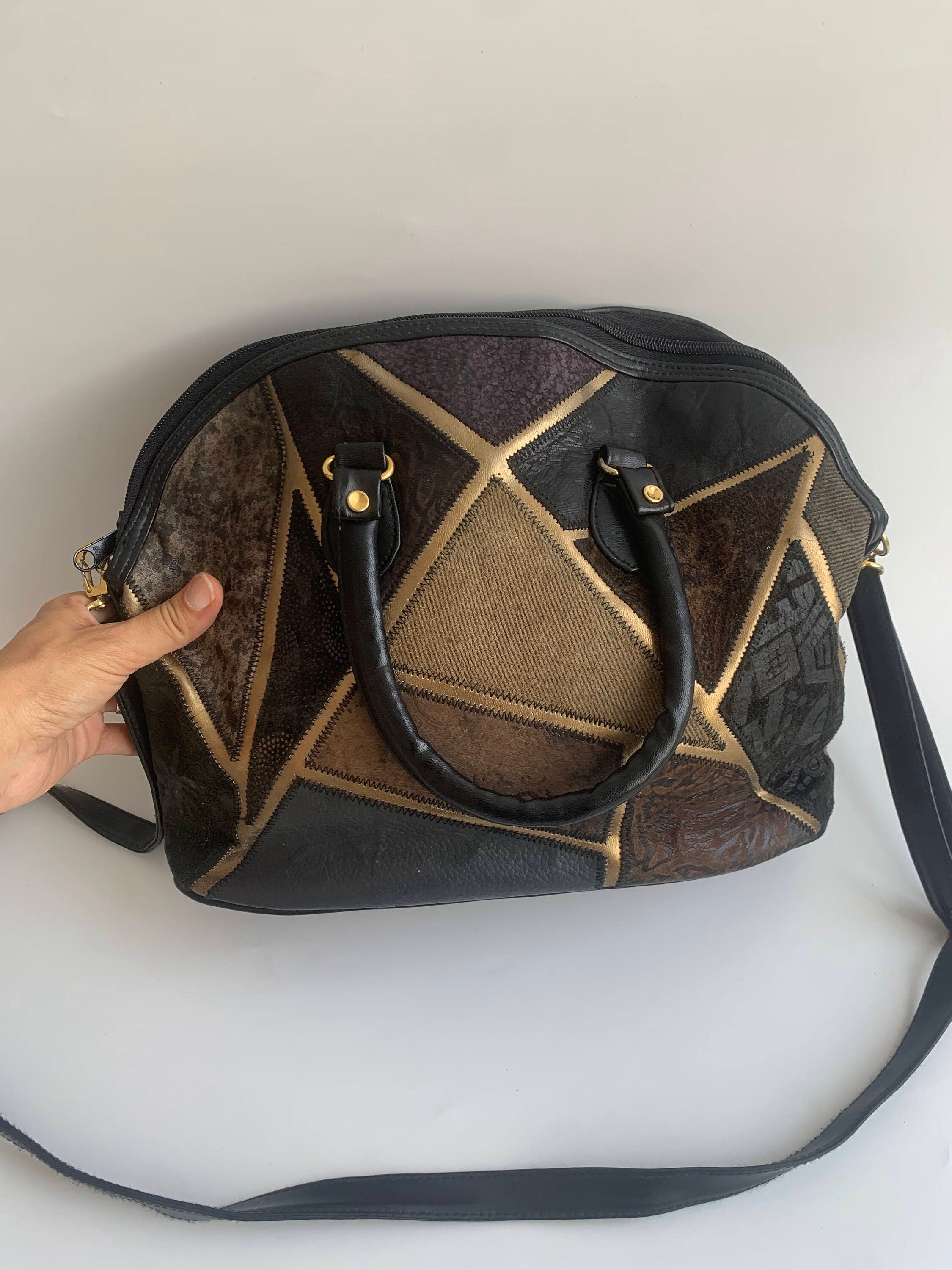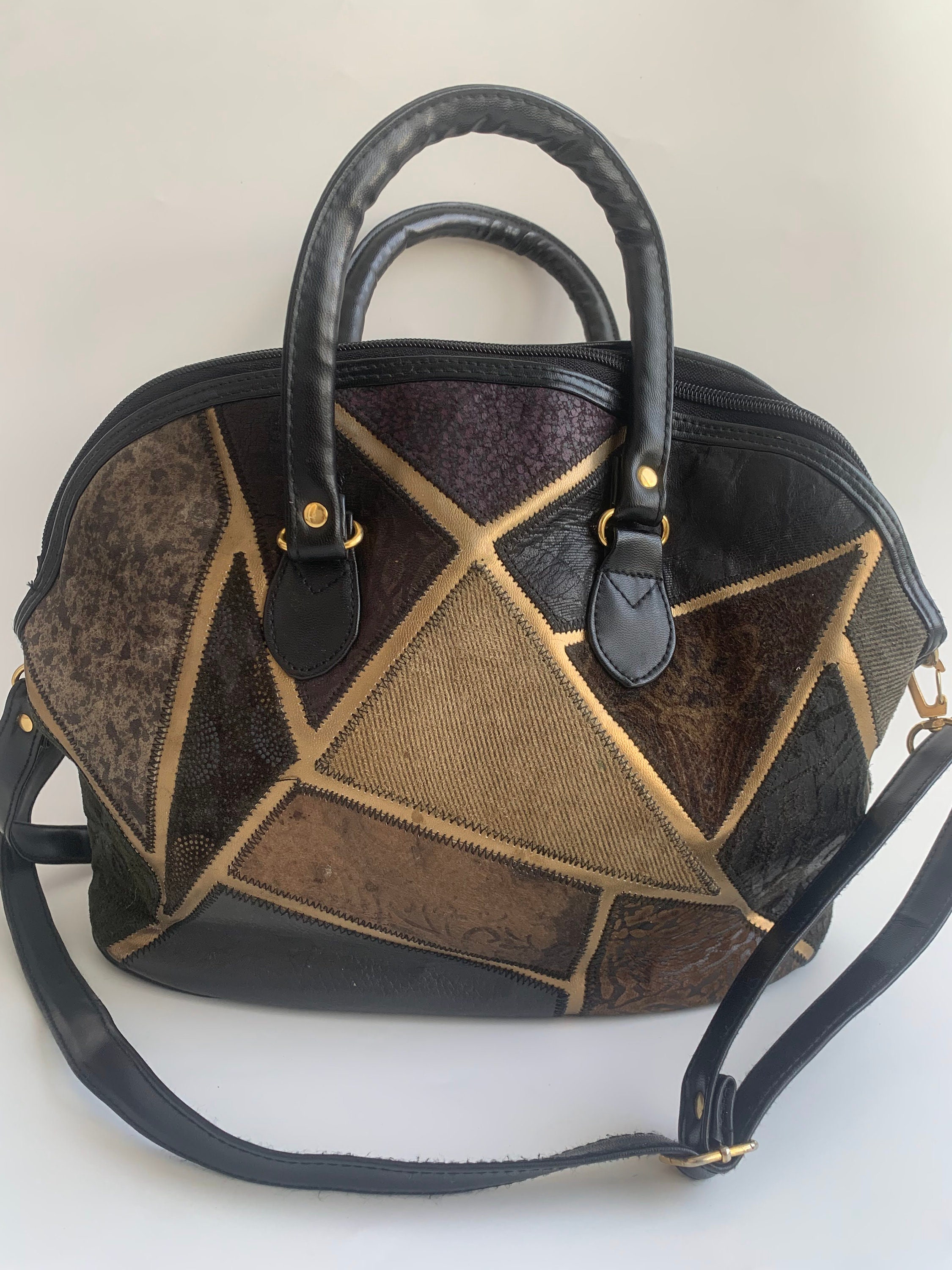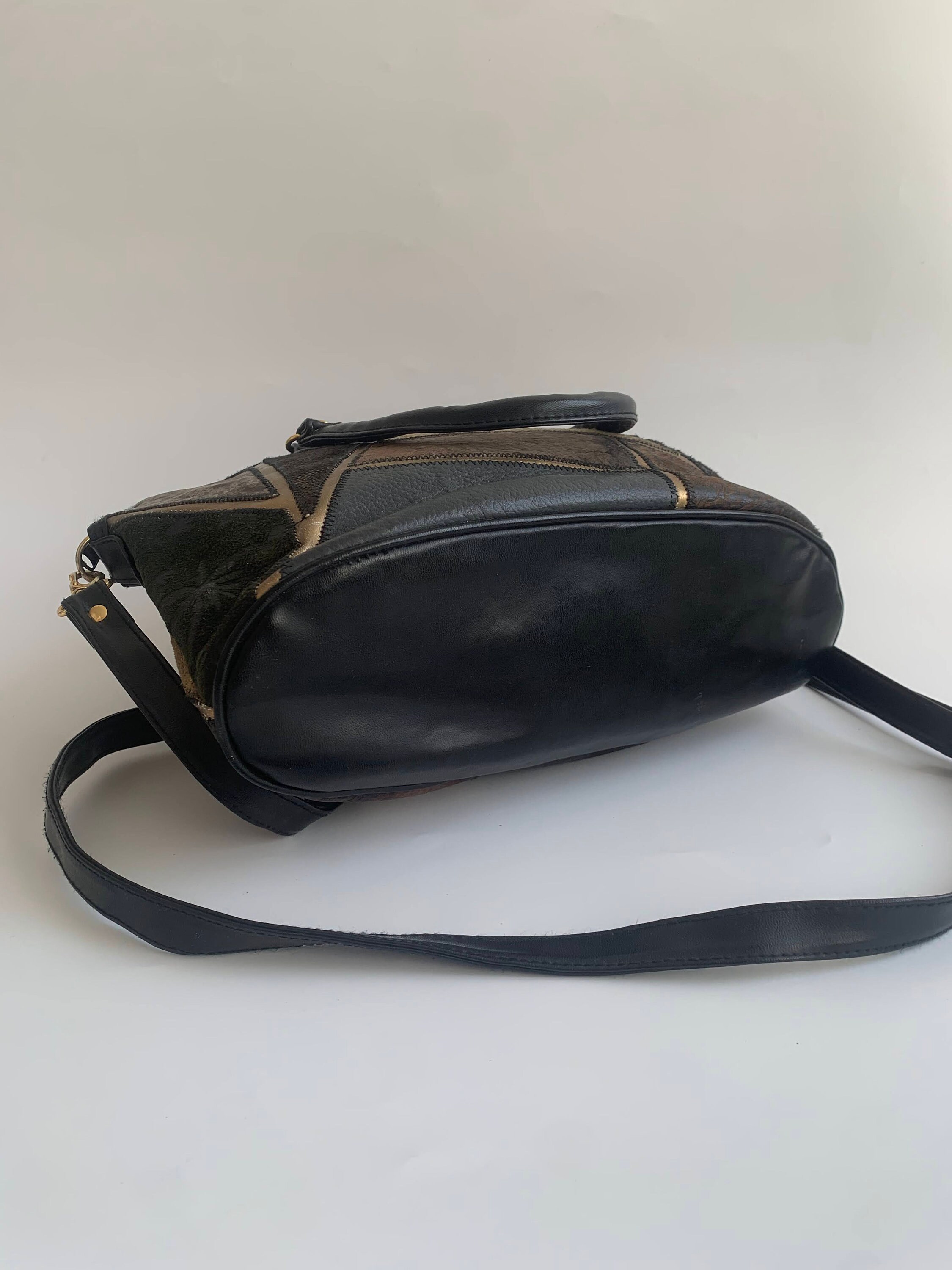This is a black patchwork leather tote bag with genuine leather and suede leather patchwork detailing at the front. The body of the purse and the straps are made of vegan leather. The colorful patches at the front are made of genuine leather and suede leather. This black tote bag has top zip closure. It has one zipper pocket at the front. The interior is lined in black cotton fabric. There is one compartment and one zipper pocket. Perfect medium size travel tote bag that is just the right size to fit all you need inside for your day out.
