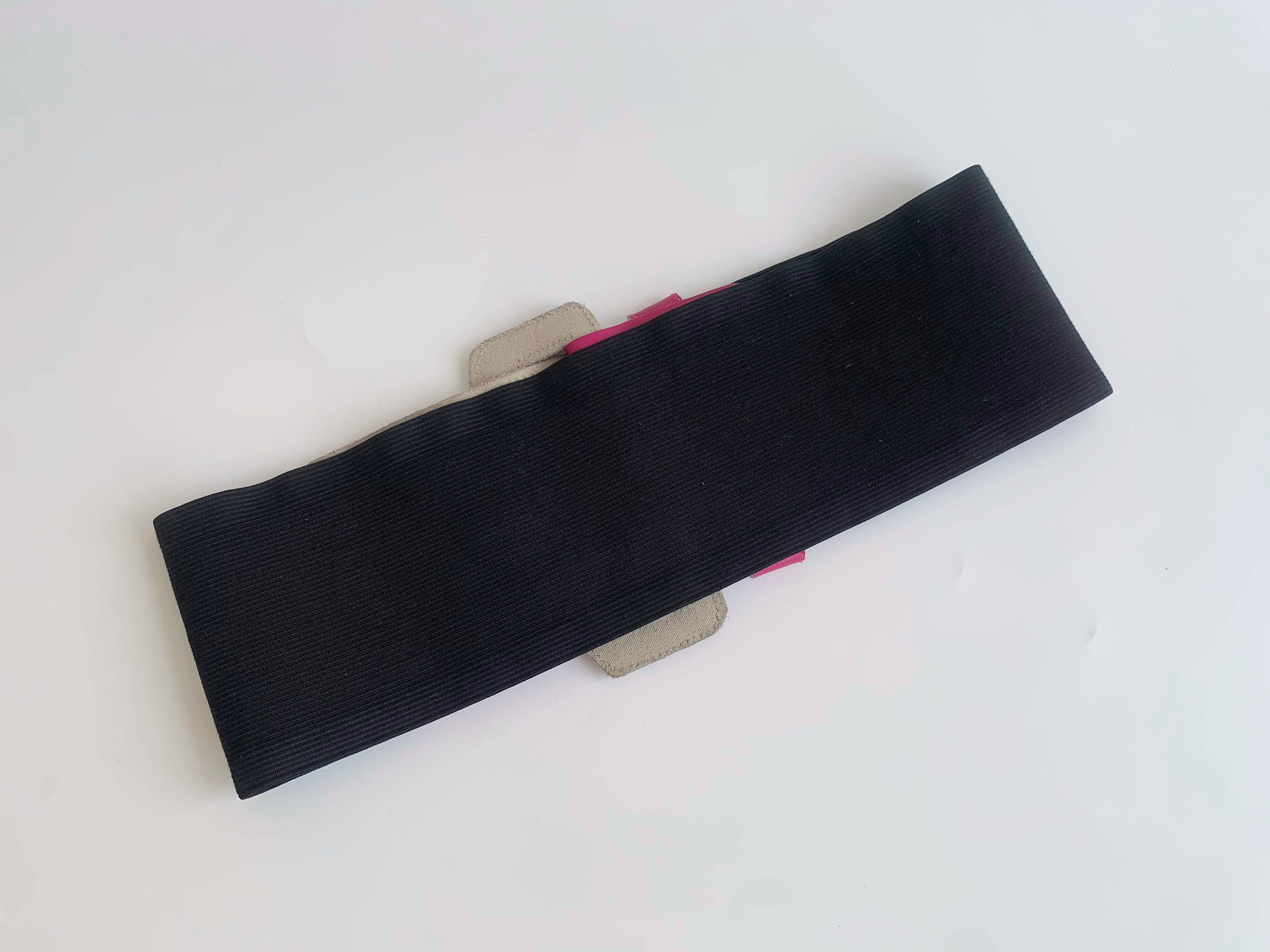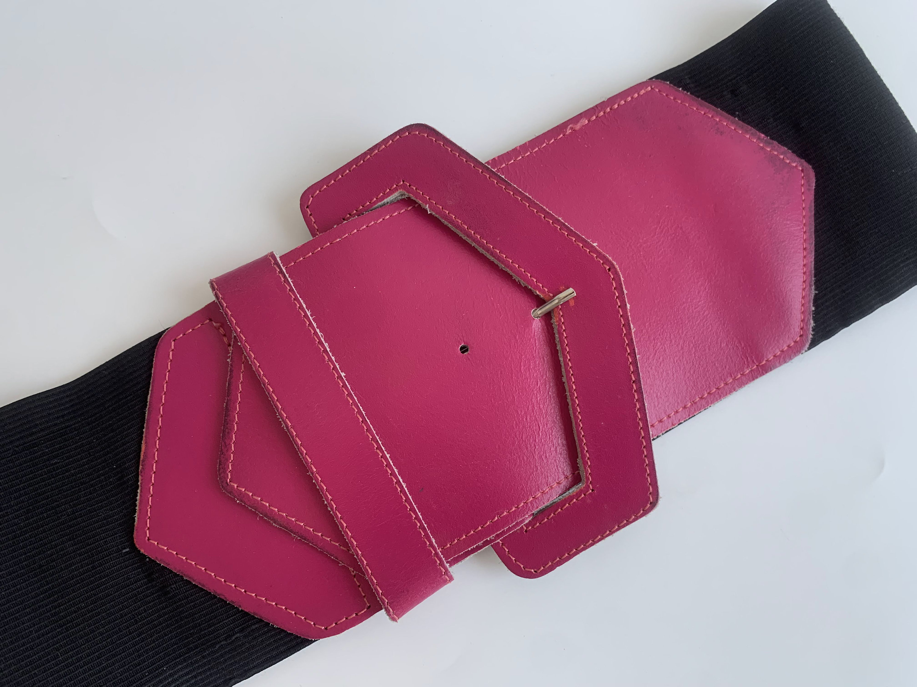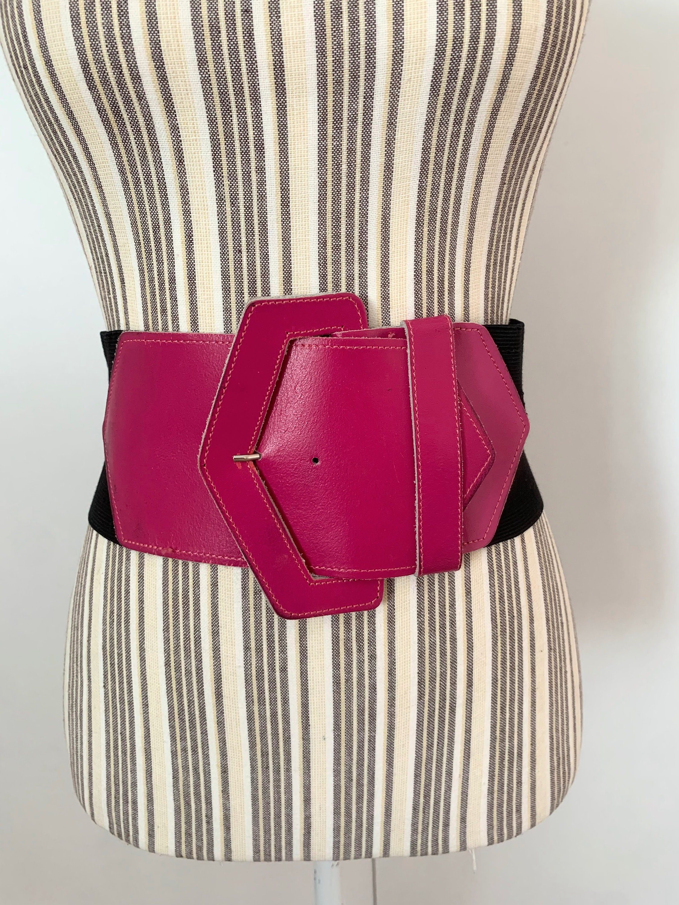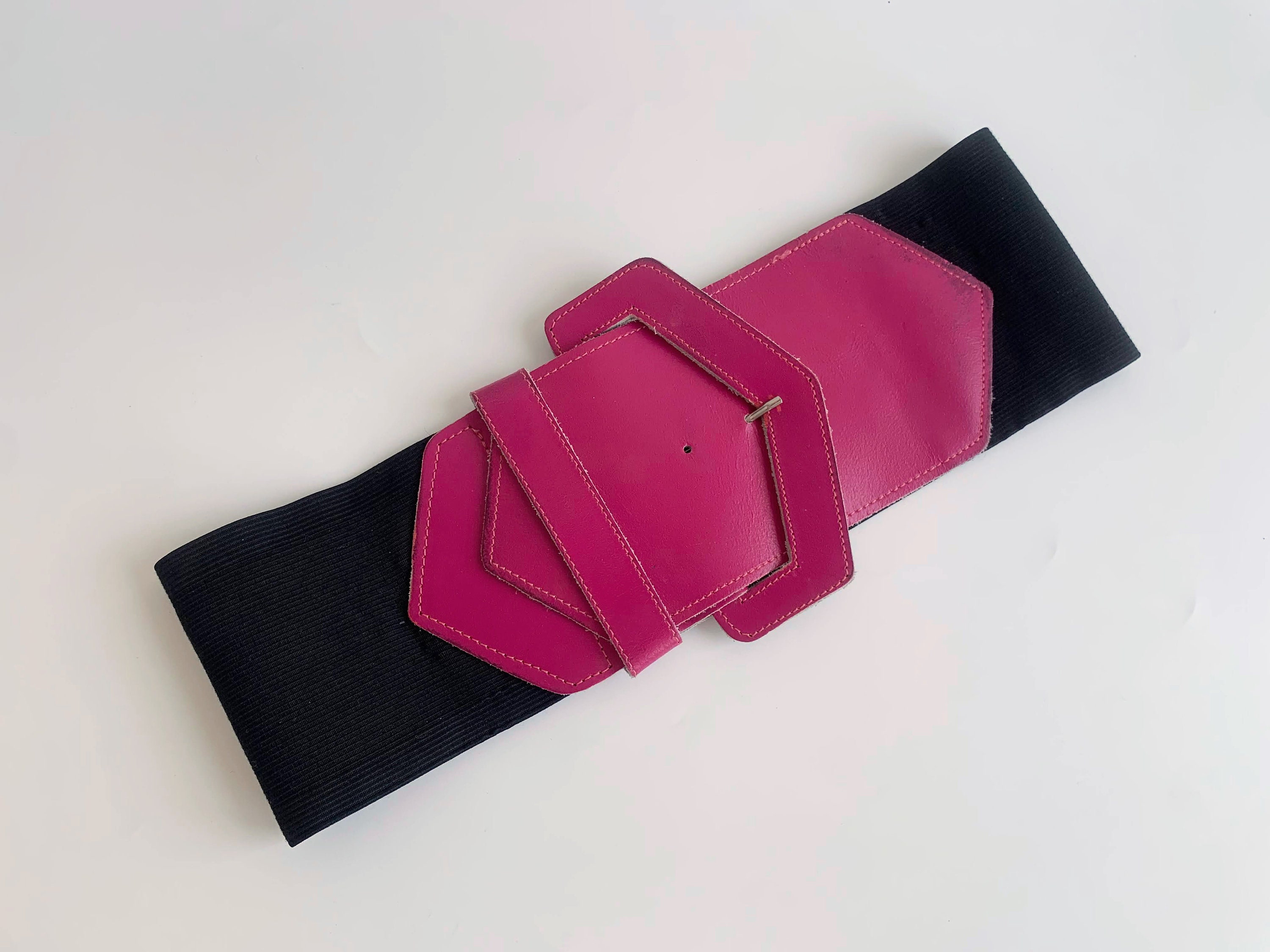 Simple minimalist super wide elastic belt with hot pink buckle. This stretch wide waist belt is made of elastic and hot pink genuine leather. This waistband belt has no size marked on it, but It would best fit size S. It fits waist from 26" - 27.6" / 66 - 70 cm when unstretched to 31.5" - 33.7" / 80- 86 cm when fully stretched. This wide waist belt is 4" / 10 cm wide.