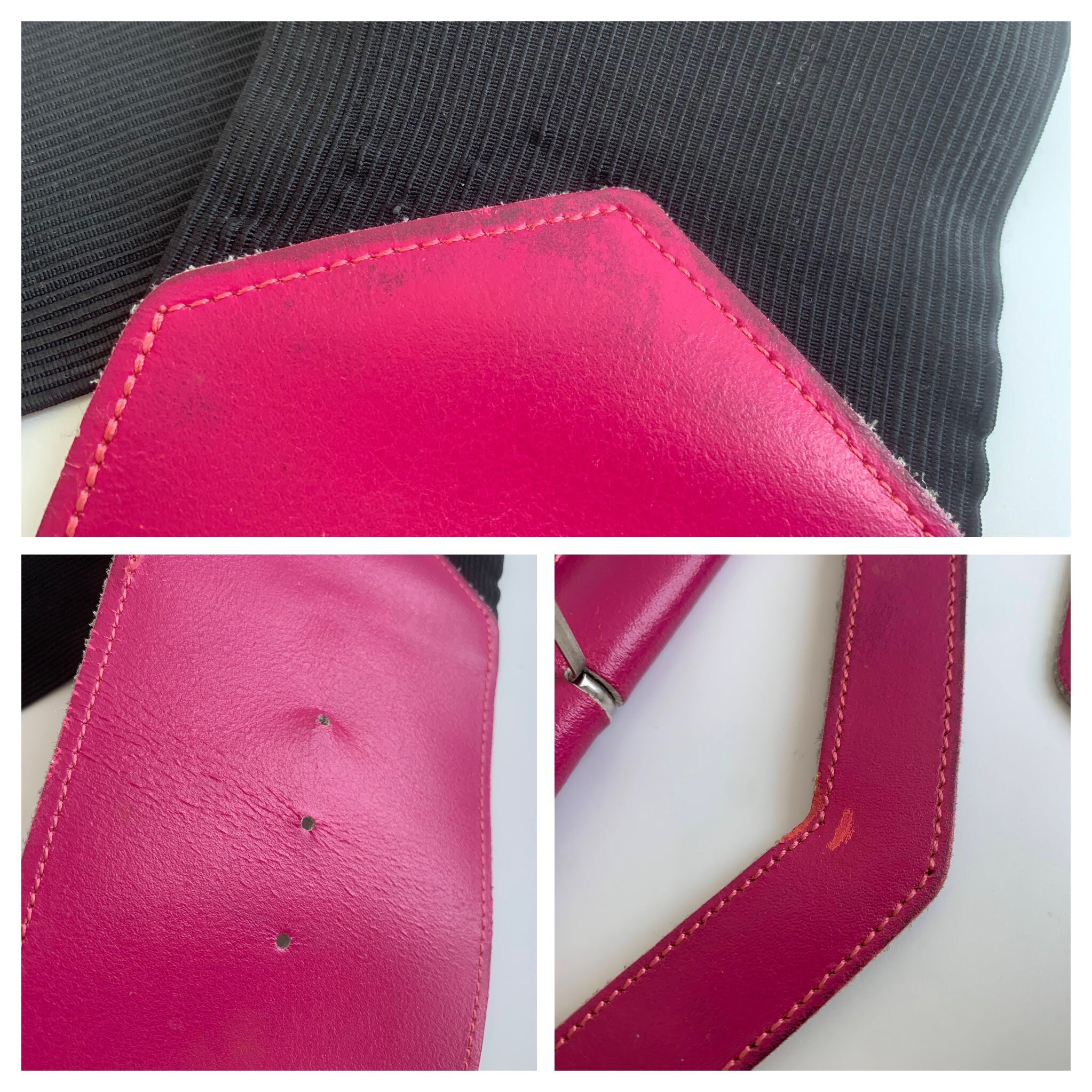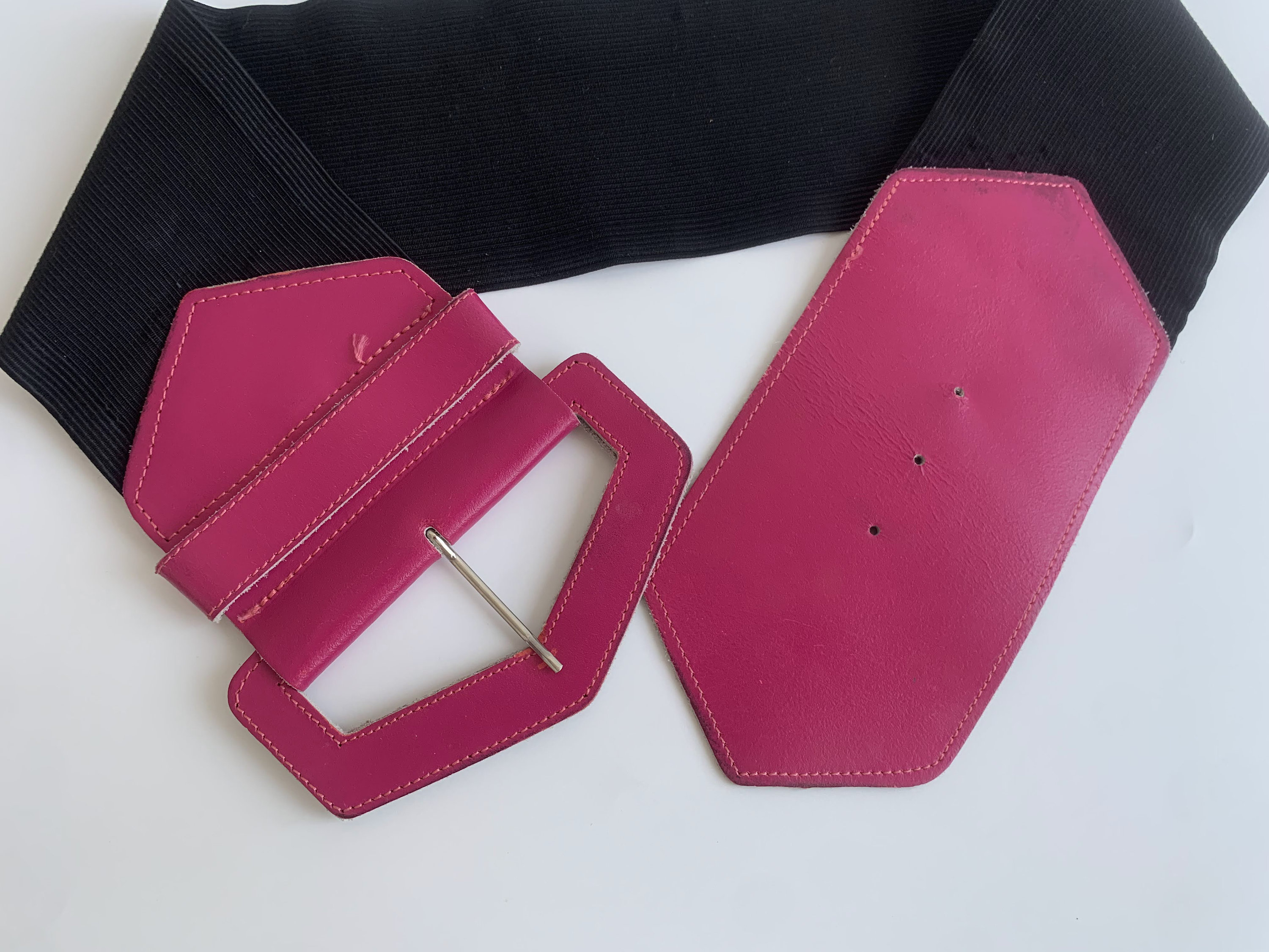 Condition: This elastic corset belt was pre loved and it shows some signs of wear. There are some scratches and marks on the hot pink leather buckle