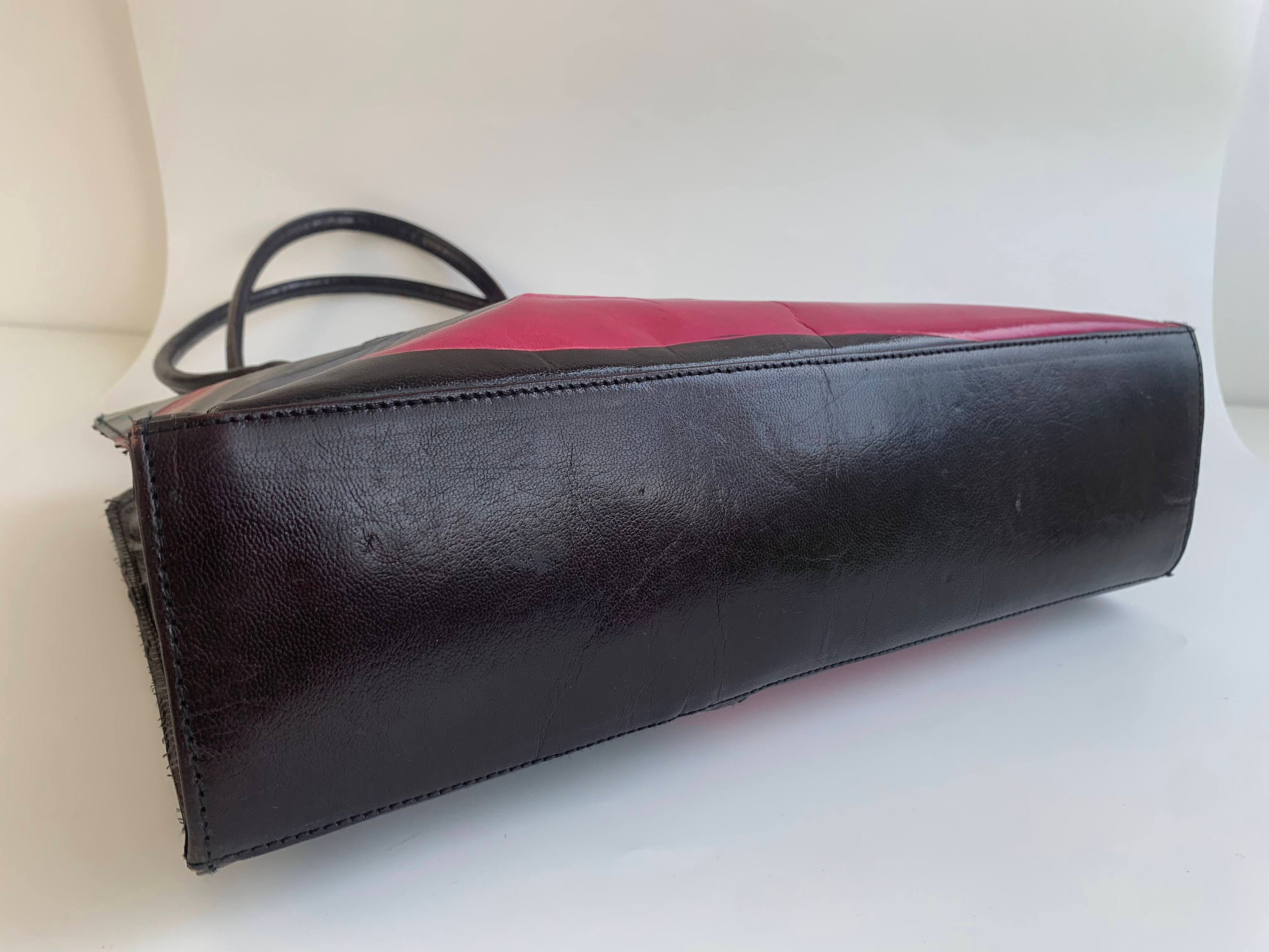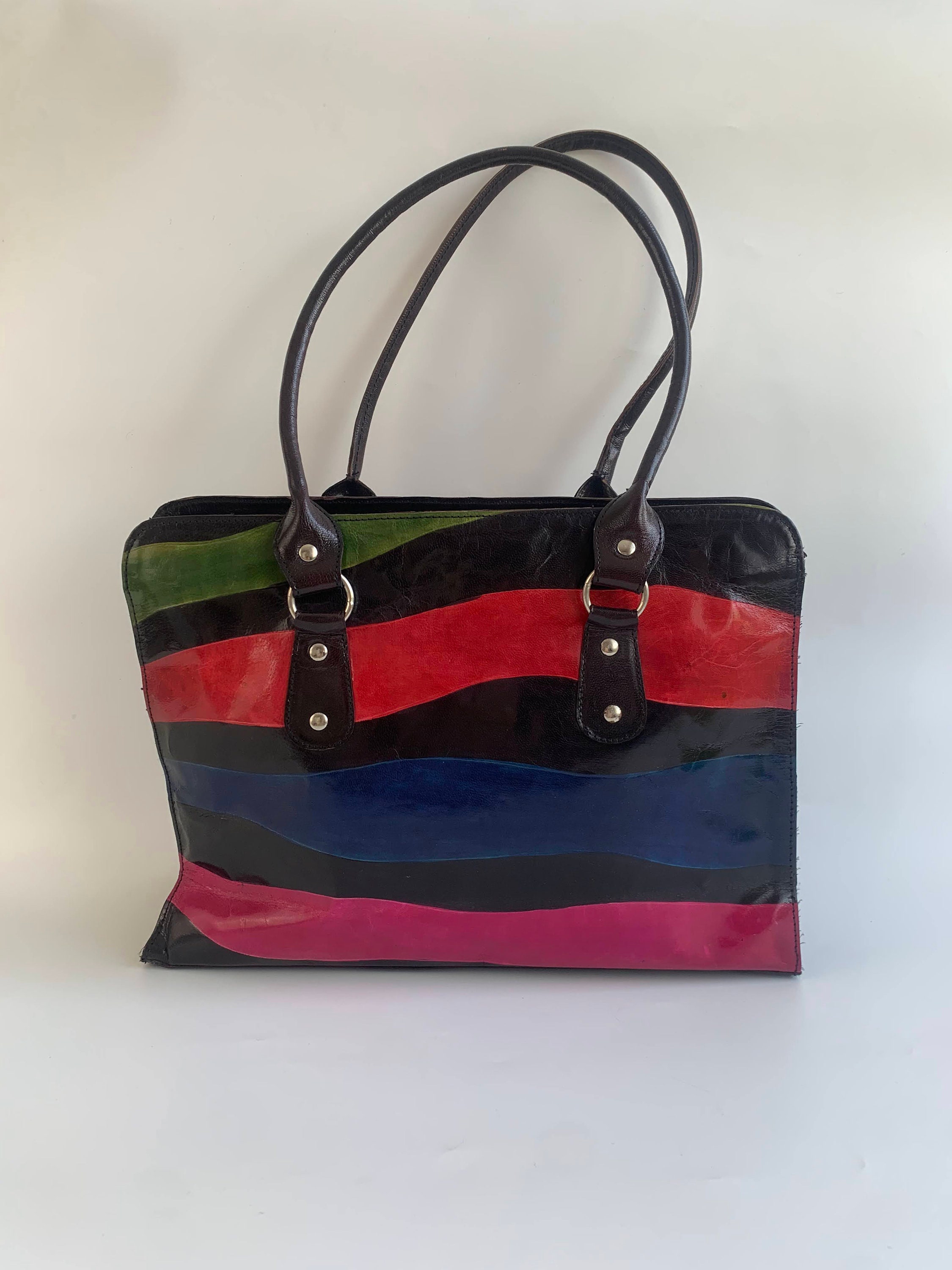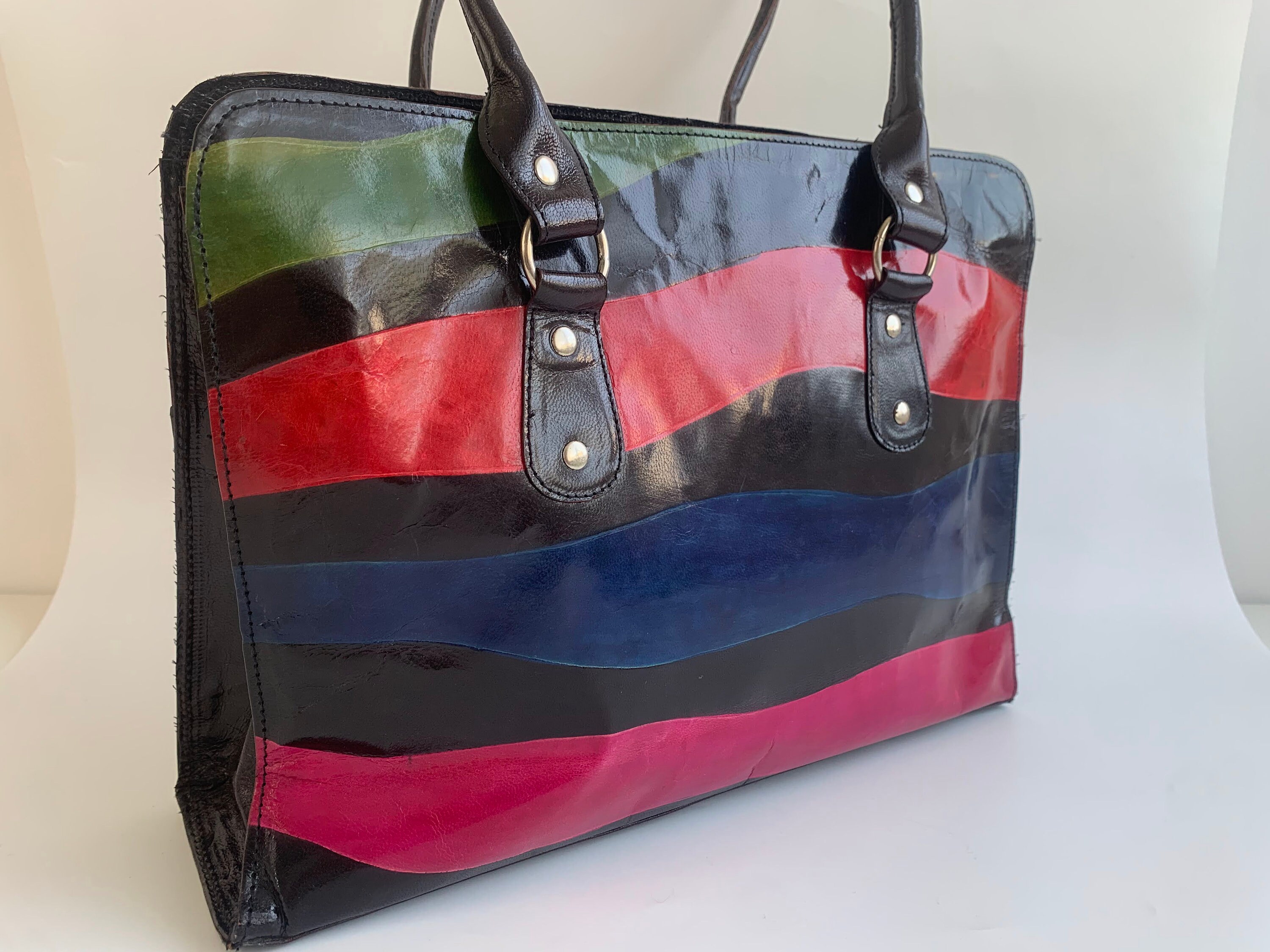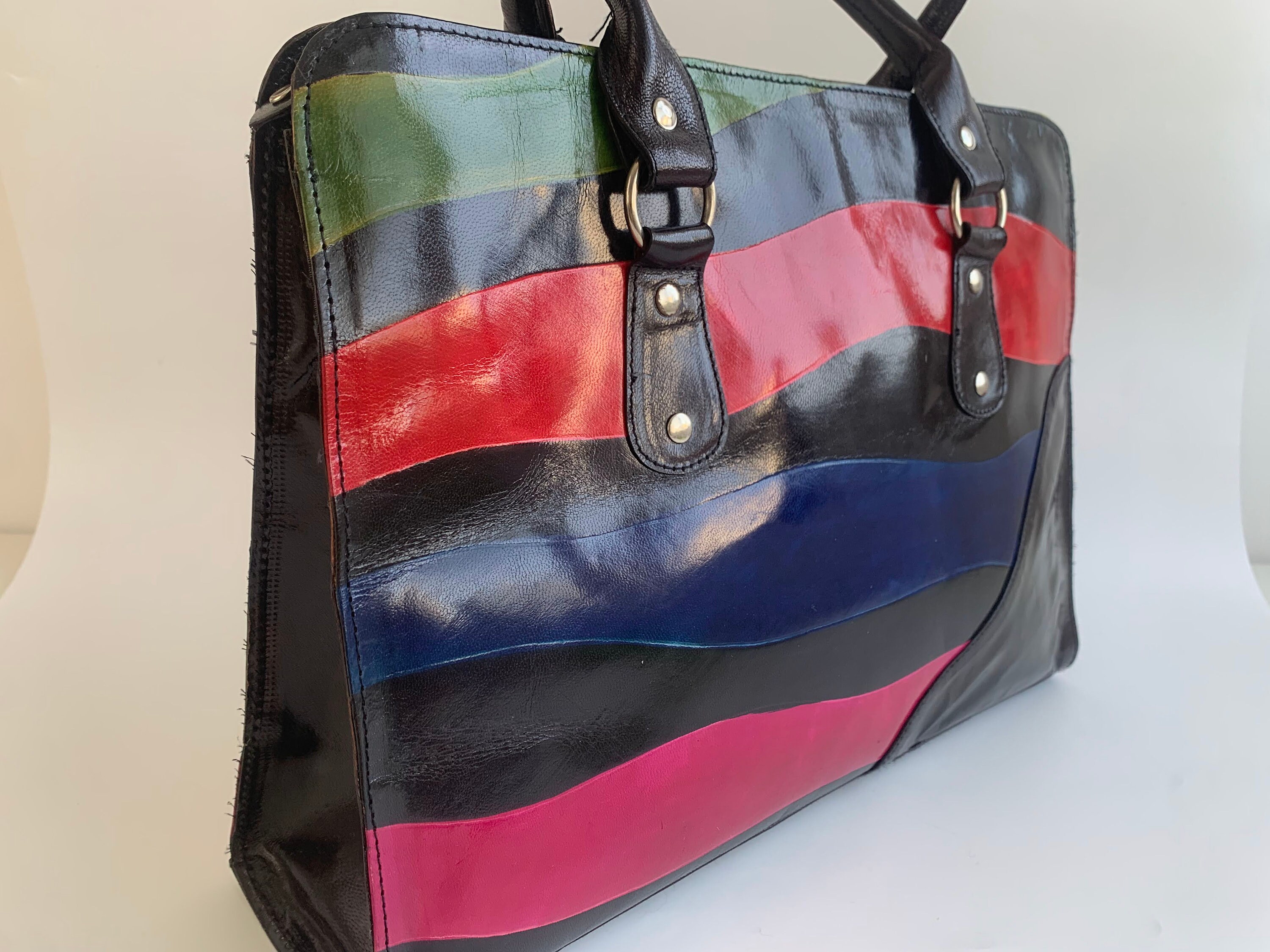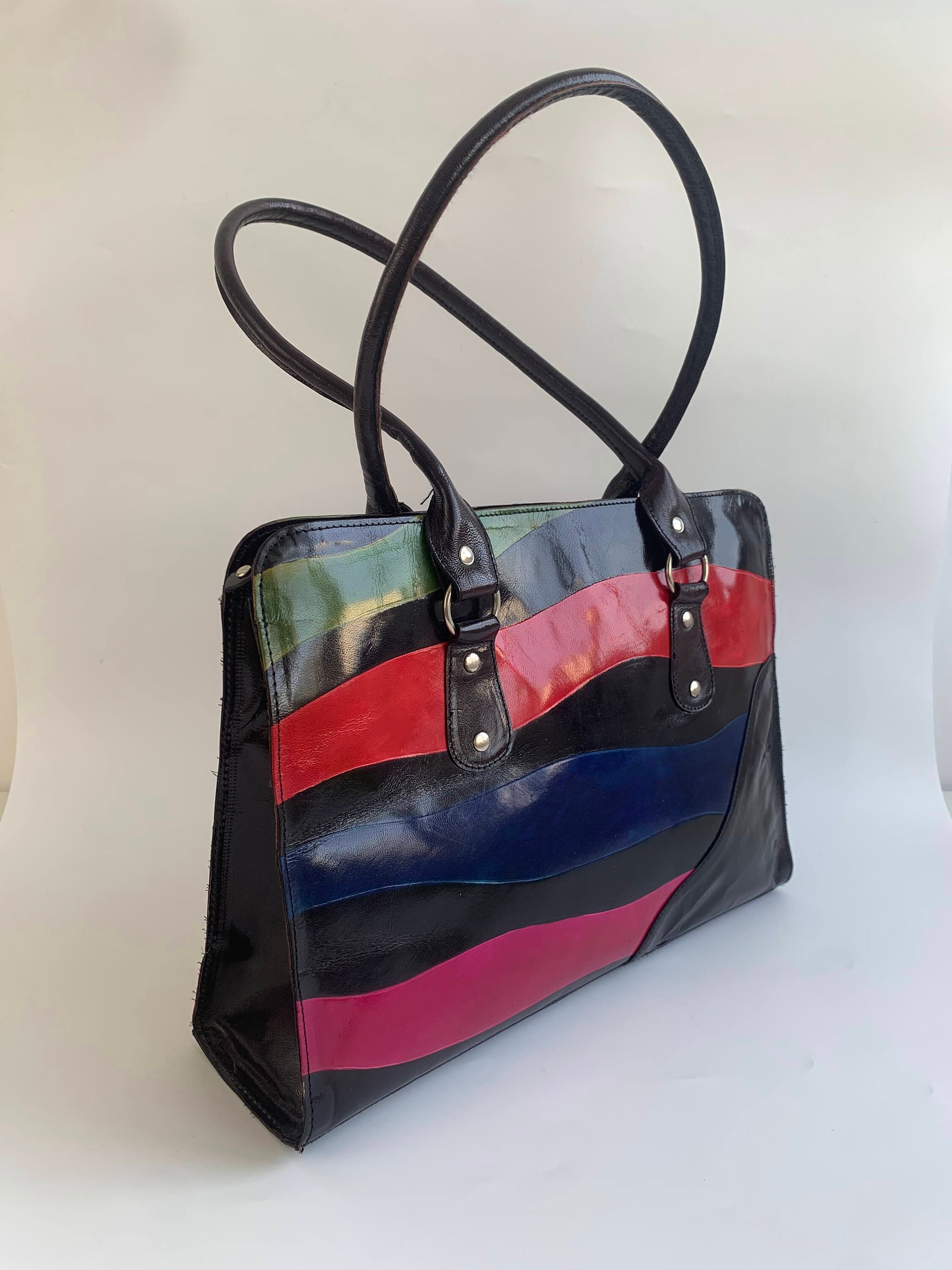 This is a lovely color block patent leather shiny tote purse with zip up closure. This real leather shoulder purse is made of real leather which shines bright in red, pink, blue and green. This leather tote purse has zip up closure. The interior is fully lined with cotton fabric. It has one compartment, one pocket with zip closure and one slip pocket.