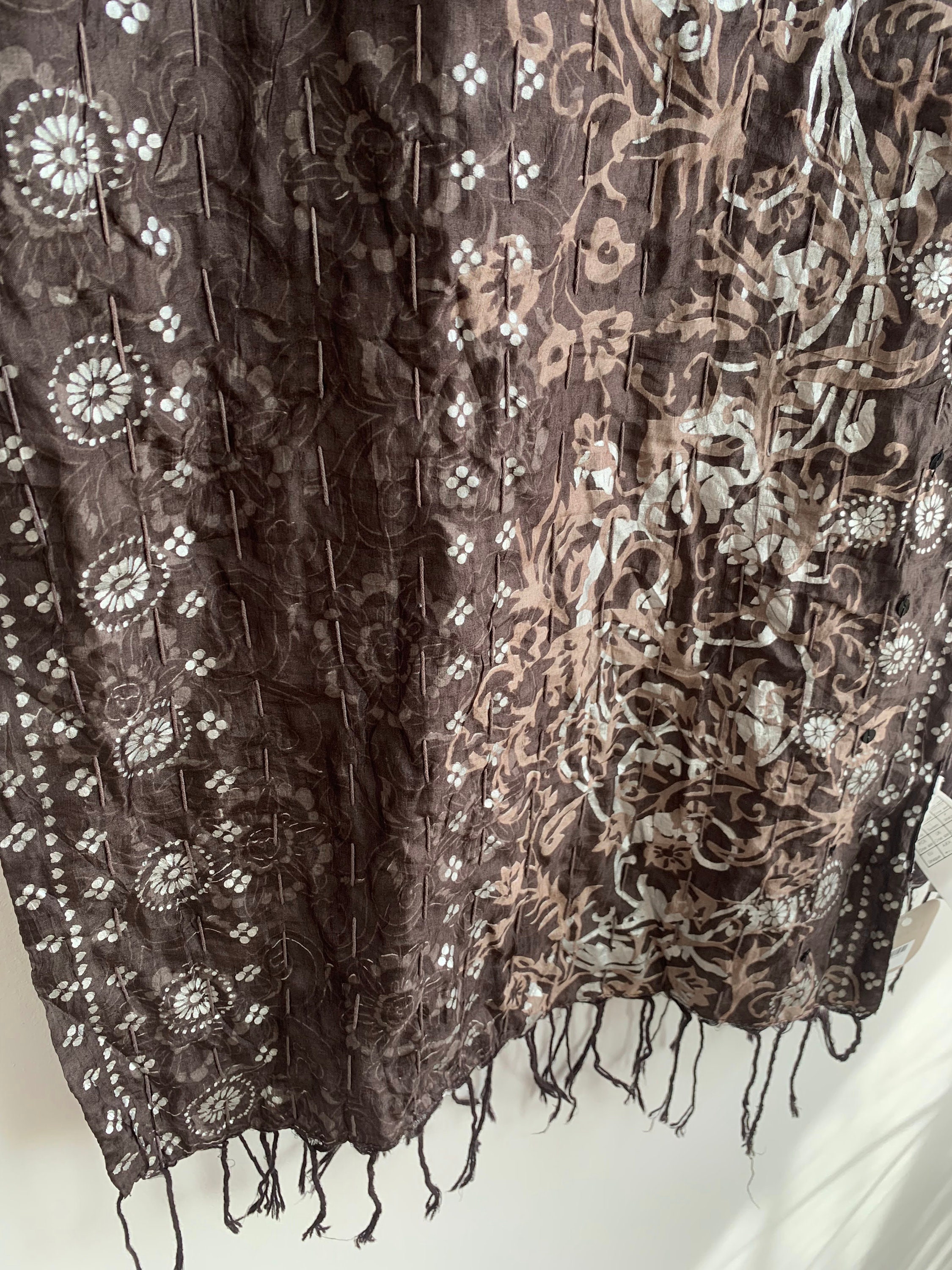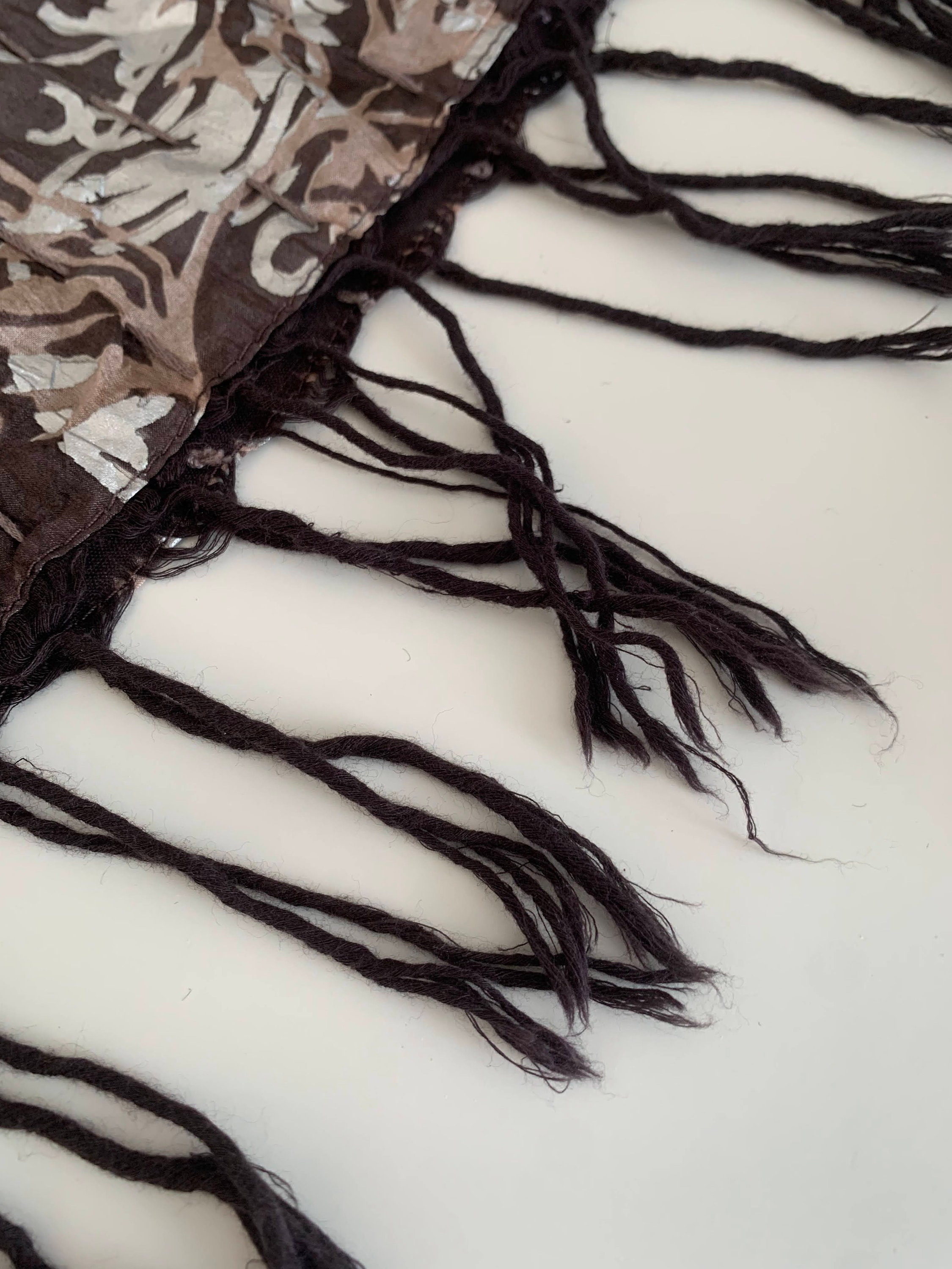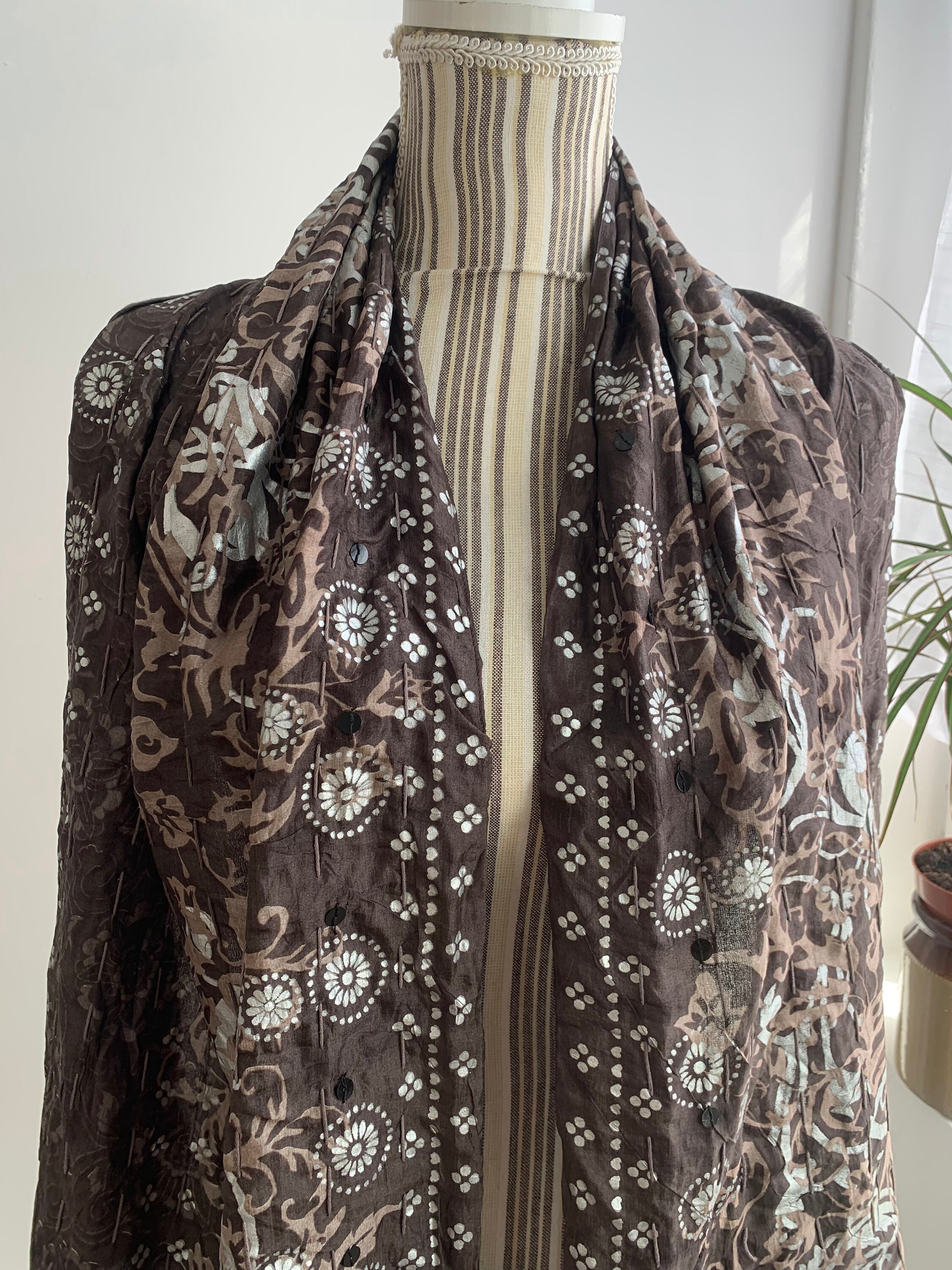 This is a vintage Indian silk scarf with paisley floral print. This beautiful brown silk scarf has metallic block print detailing in silver and taupe brown with sequin detailing. This bohemian wrap shawl has cotton lining.