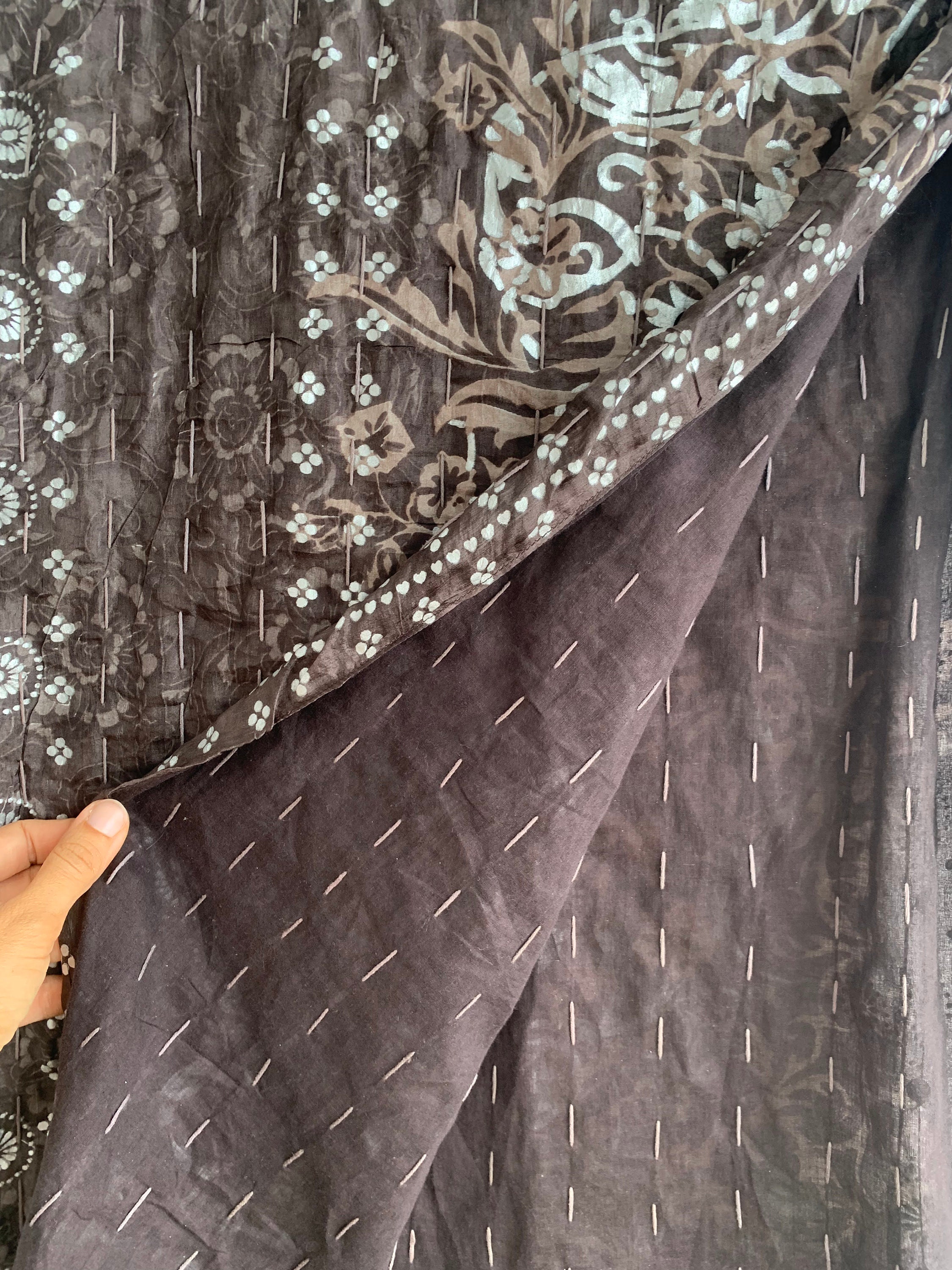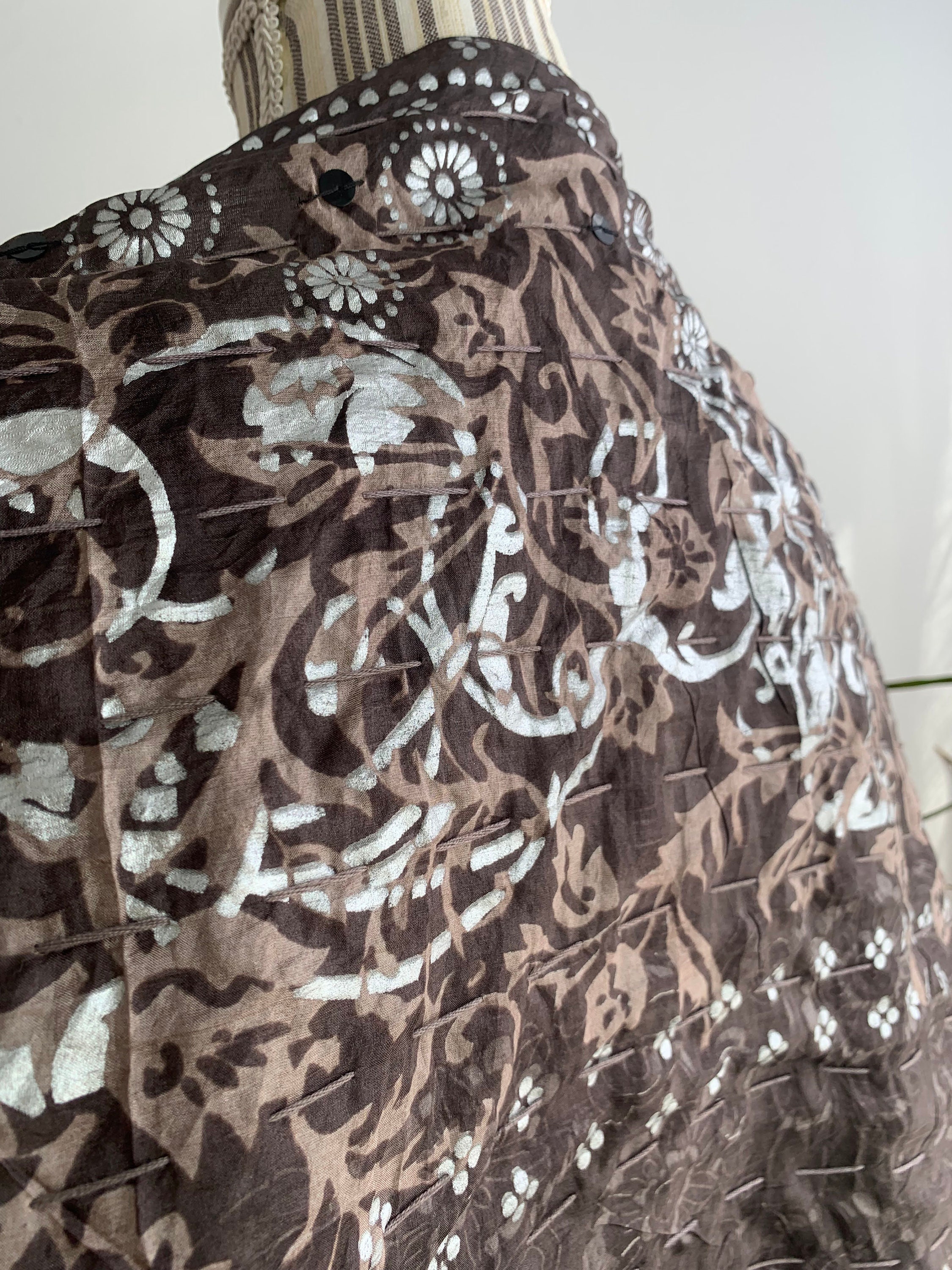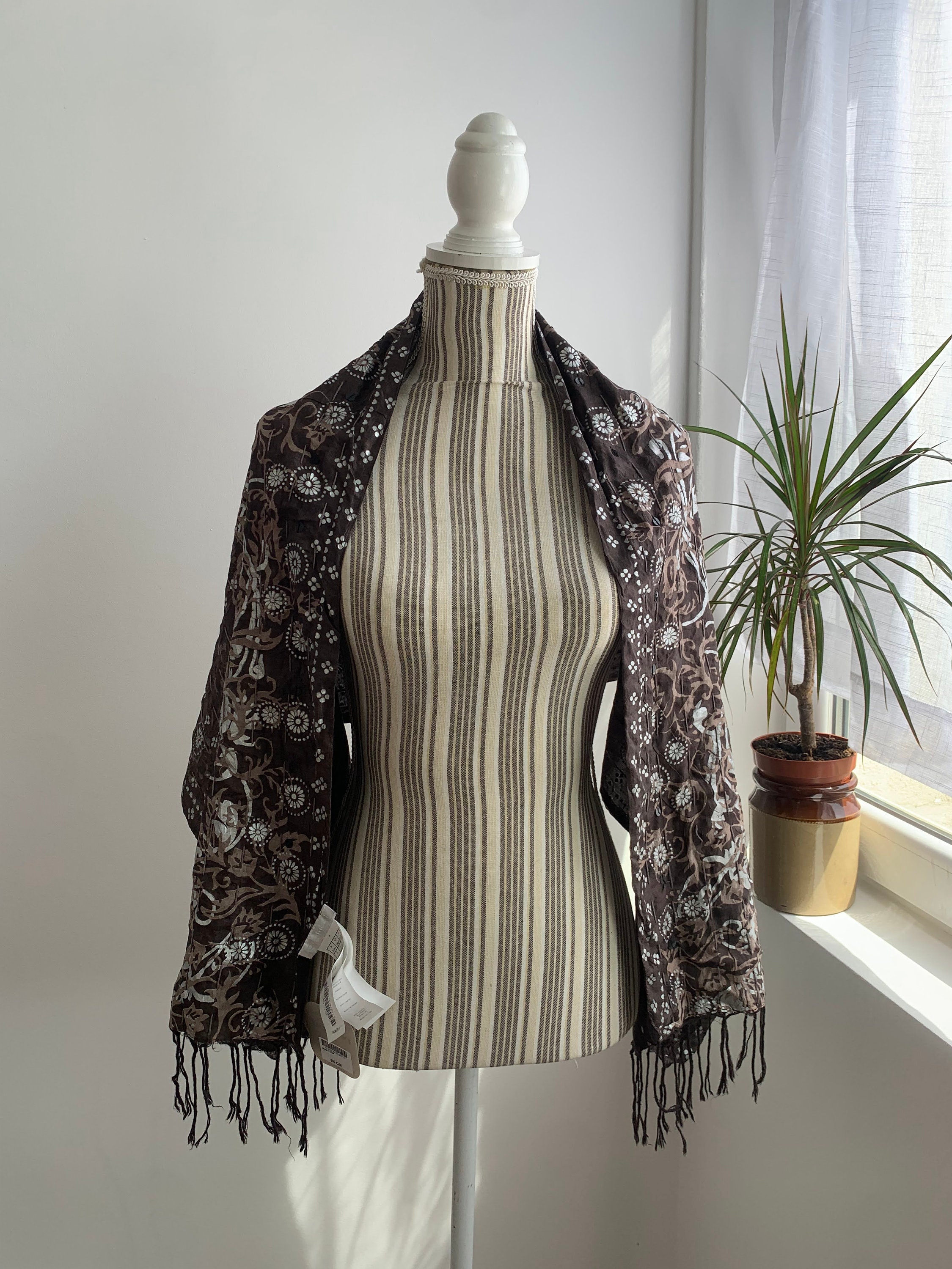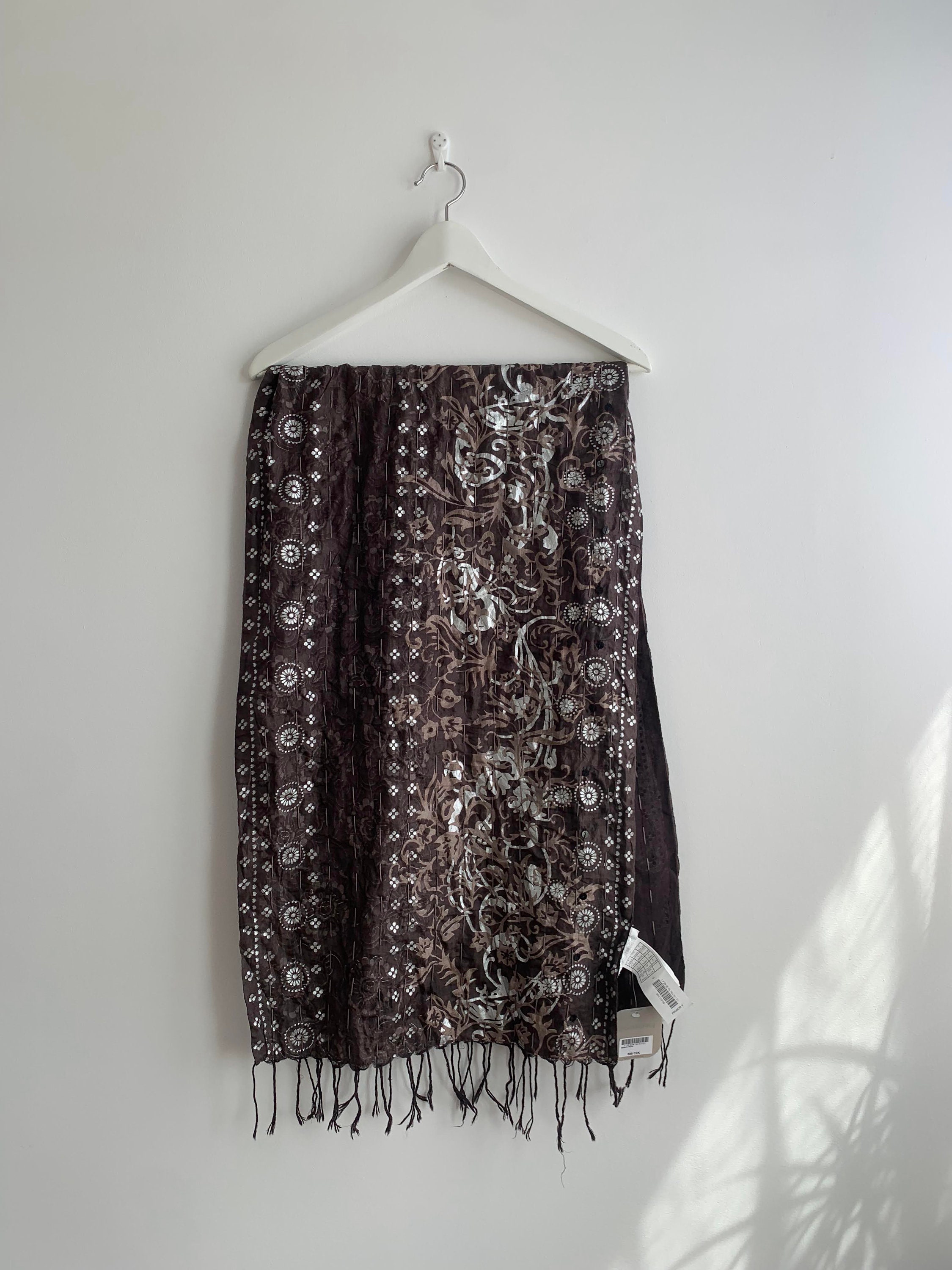 This is a vintage Indian silk scarf with paisley floral print. This beautiful brown silk scarf has metallic block print detailing in silver and taupe brown with sequin detailing. This bohemian wrap shawl has cotton lining.