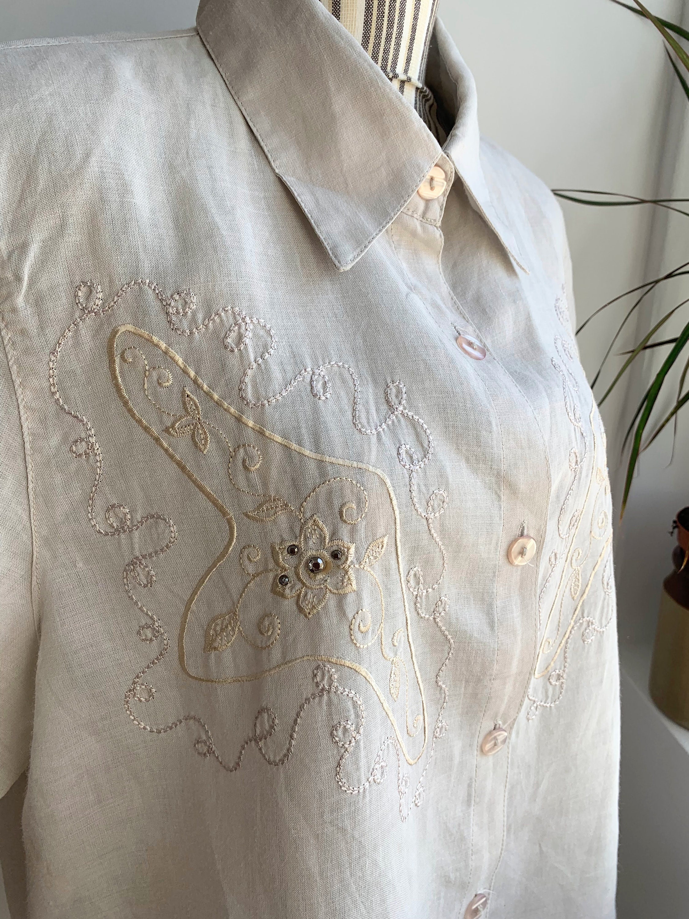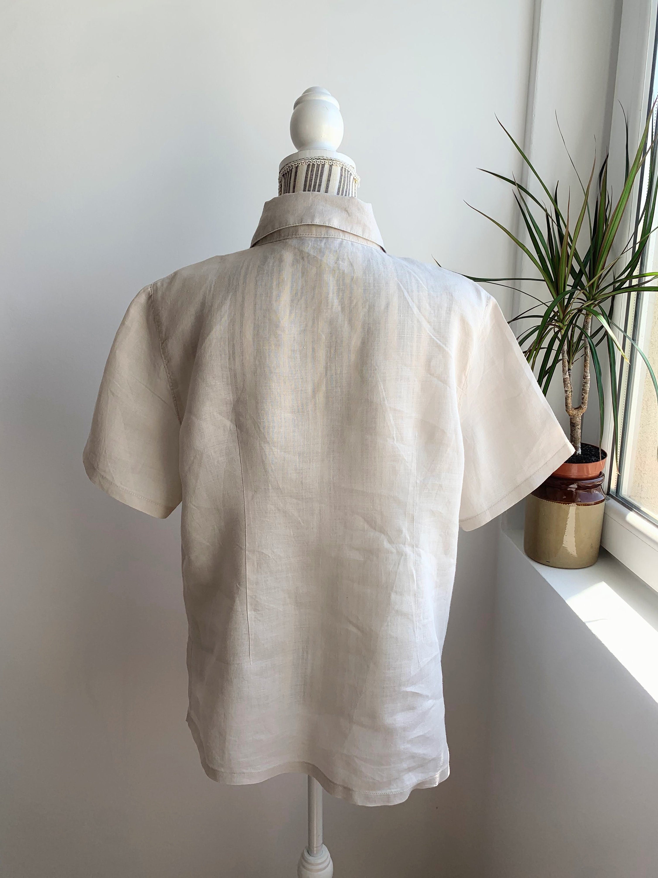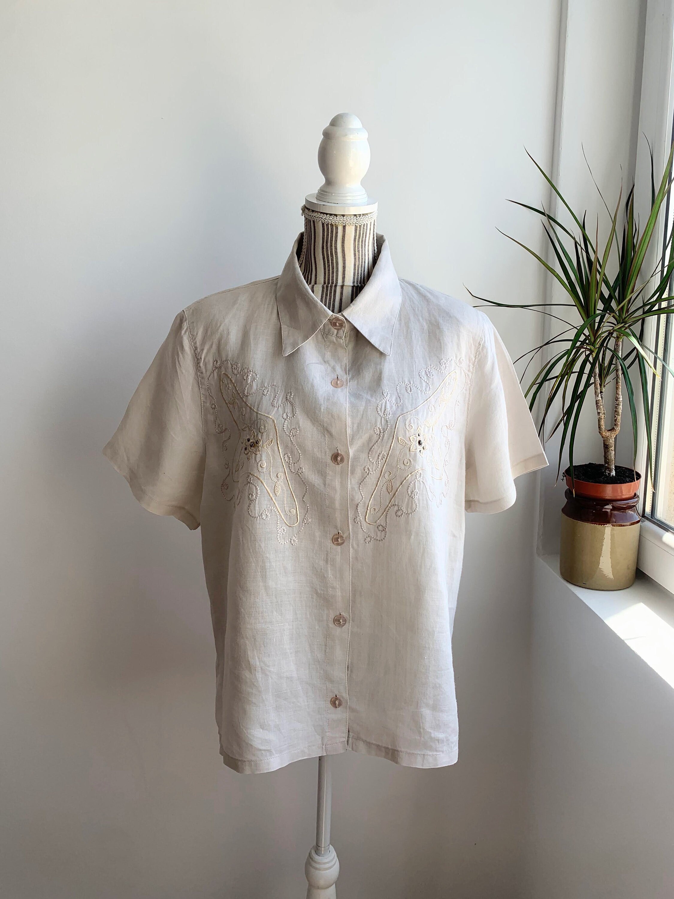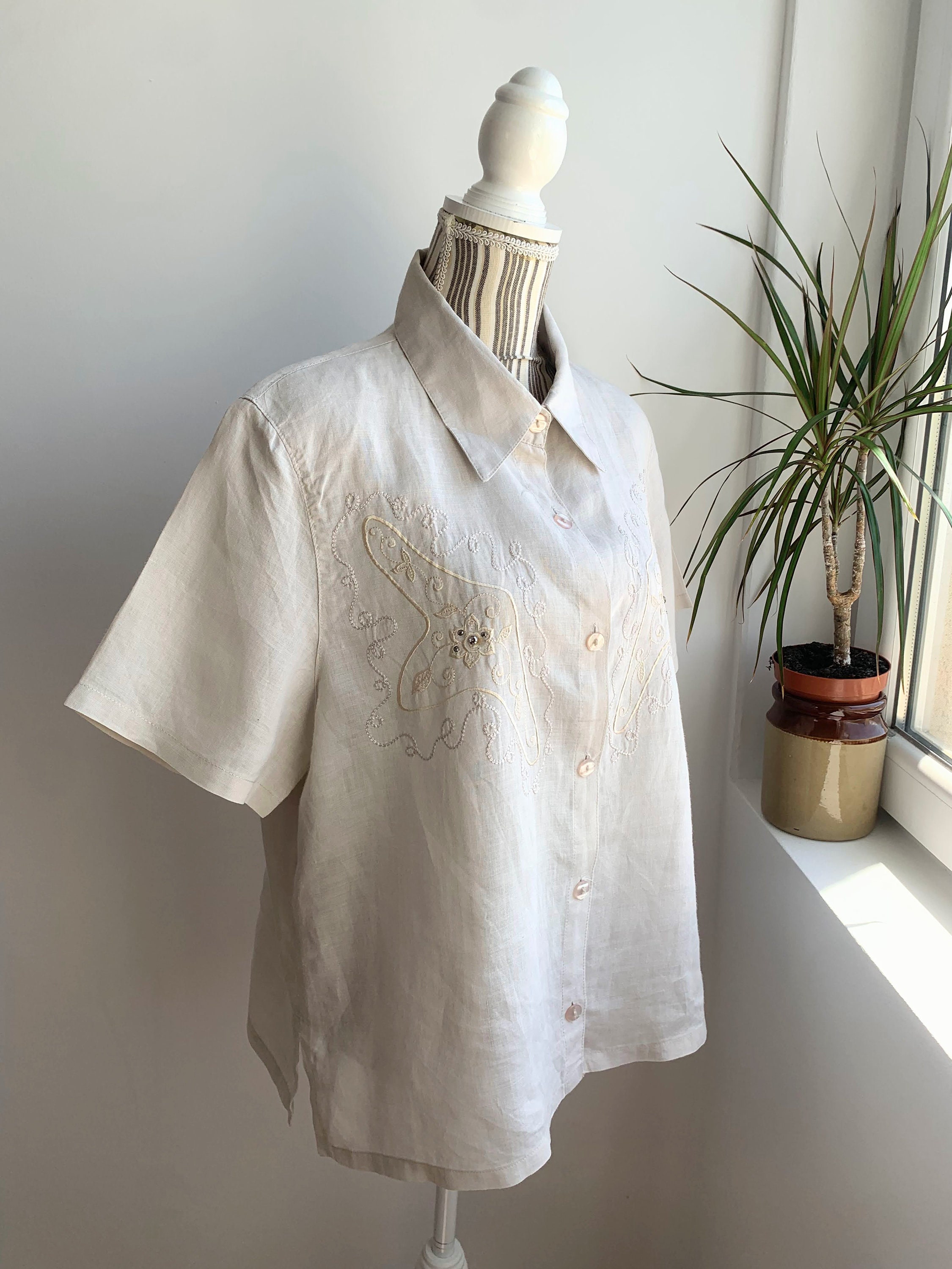 This is a vintage beige linen button up shirt for women with short sleeves and elegant collat. This vintage flax shirt is made of linen fabric in cream beige color. This linen button up blouse combines effortless-looking style with comfortable wear. This button up top is crafted from beautiful breathable, linen fabric with a loose fit cut that flatters the figure and wrinkles beautifully every time it’s worn due to the natural texture of the flax fabric. This embroidery linen blouse is designed to take you from a day at the office to night out with friends, achieving timeless elegance without compromising comfort. The flattering shape and stylish collar adds a pop of effortless elegance! Complete the classic look with capri pants or a minimalist summer skirt and you are ready to rock.