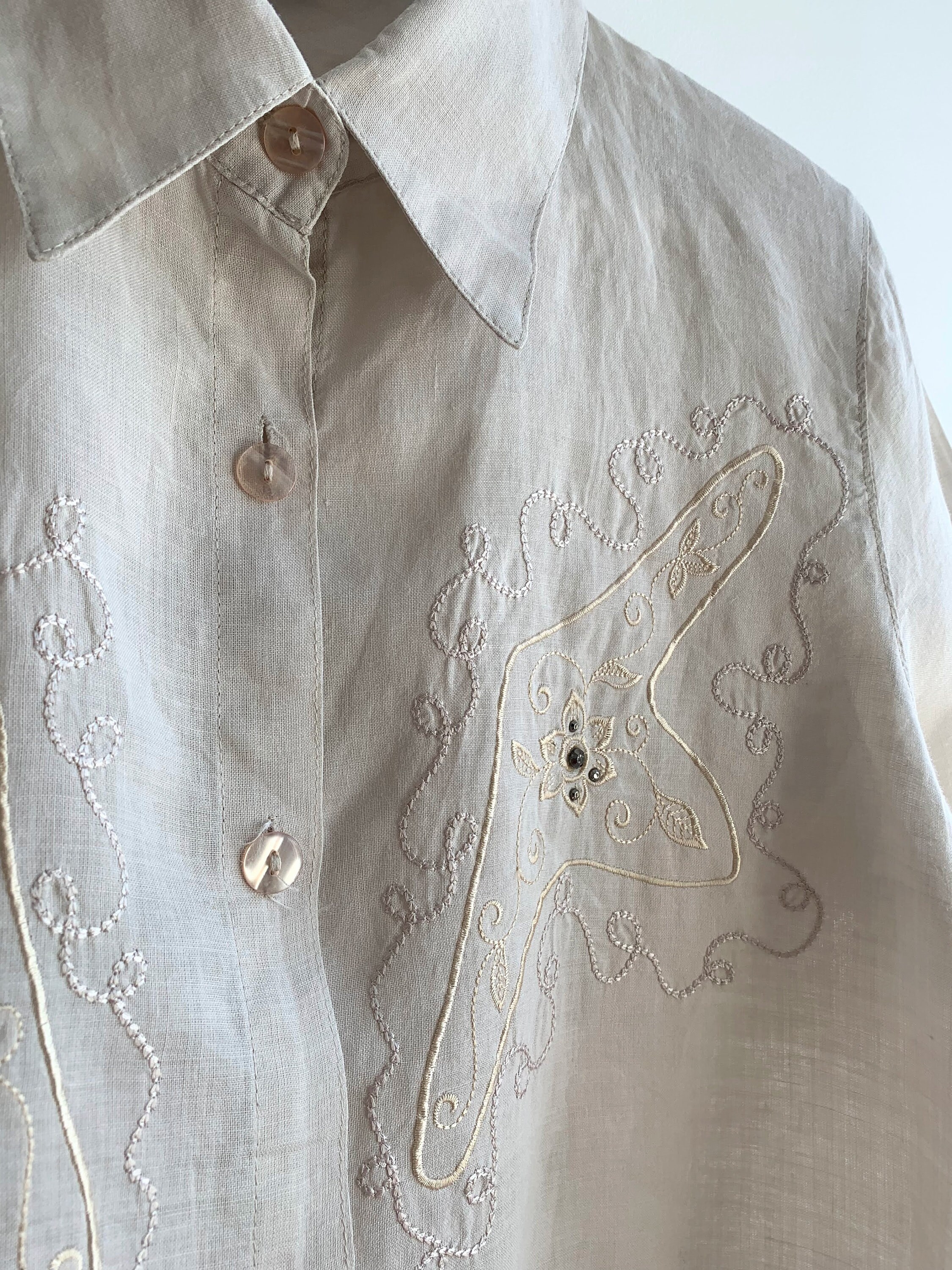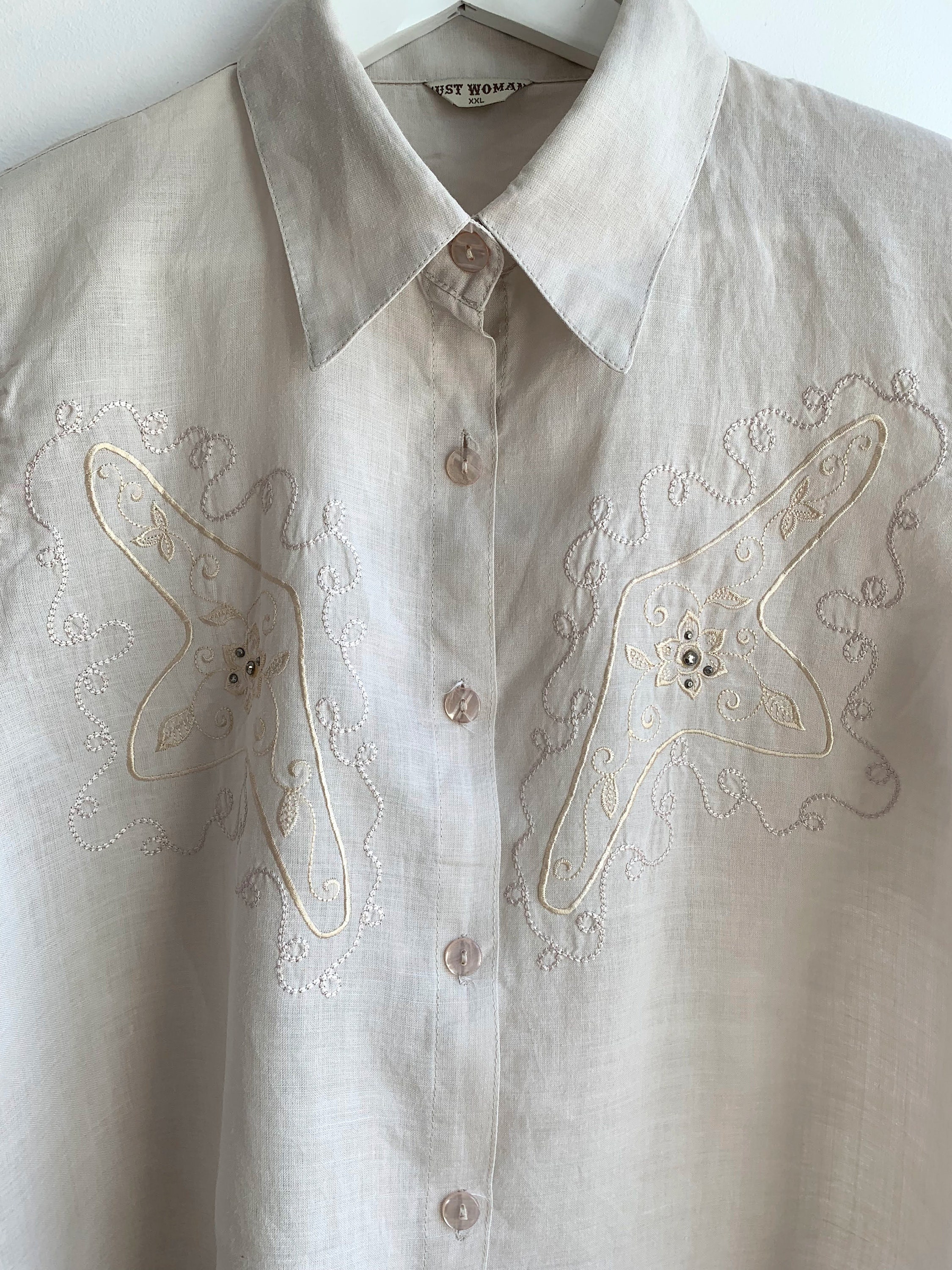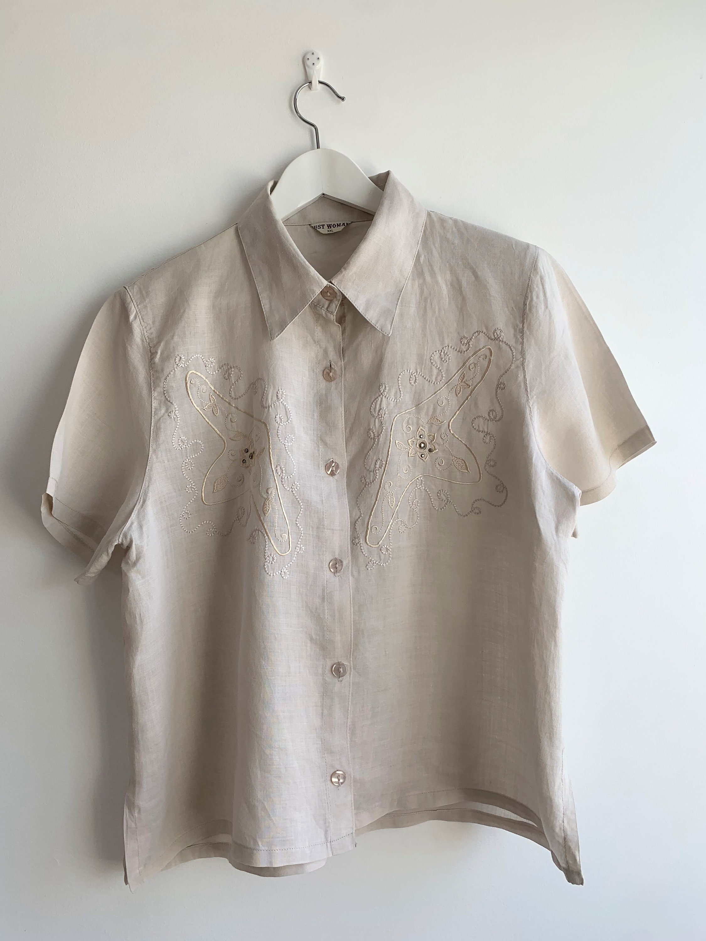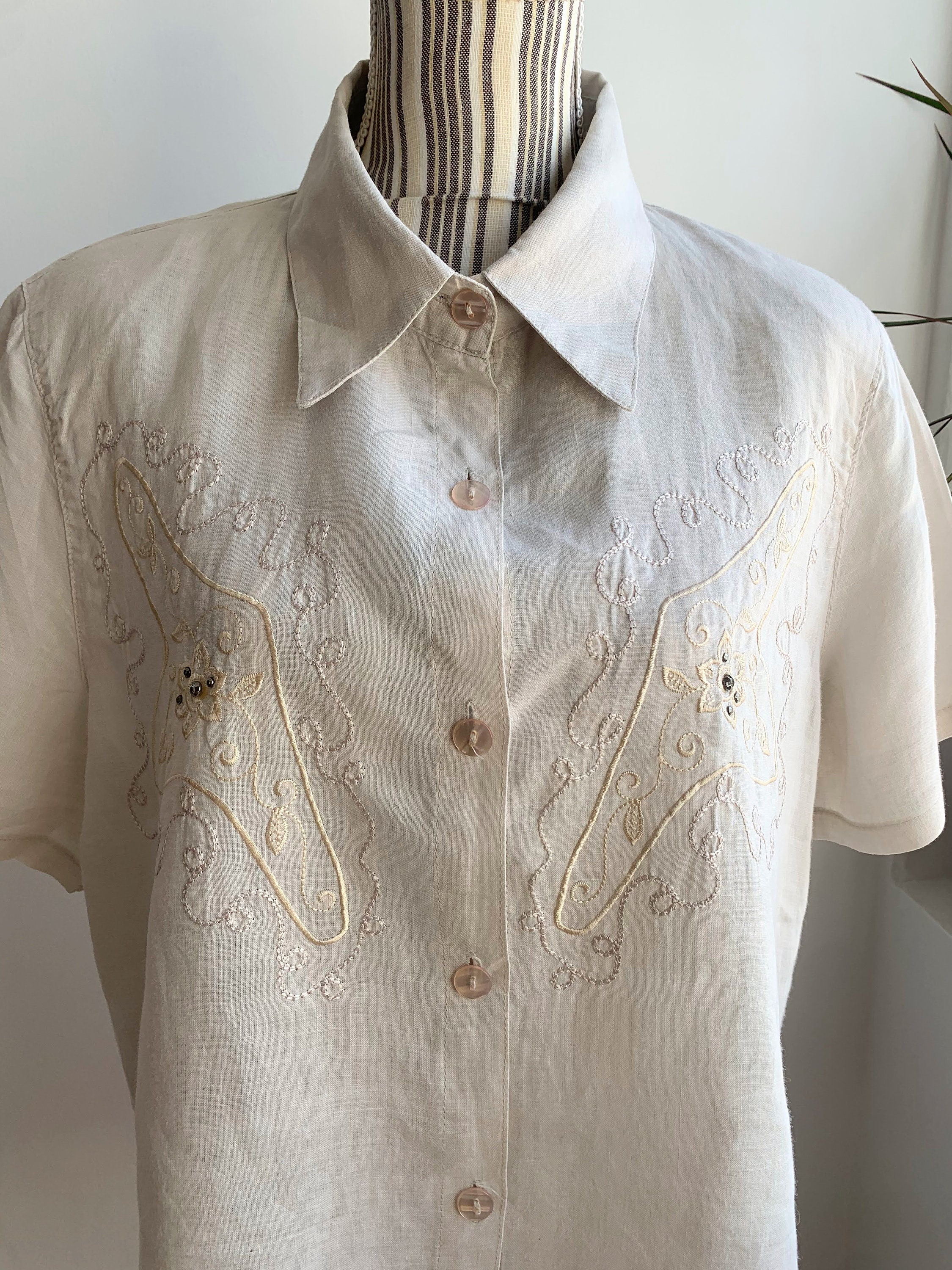 This is a vintage beige linen button up shirt for women with short sleeves and elegant collat. This vintage flax shirt is made of linen fabric in cream beige color. This linen button up blouse combines effortless-looking style with comfortable wear. This button up top is crafted from beautiful breathable, linen fabric with a loose fit cut that flatters the figure and wrinkles beautifully every time it’s worn due to the natural texture of the flax fabric. This embroidery linen blouse is designed to take you from a day at the office to night out with friends, achieving timeless elegance without compromising comfort. The flattering shape and stylish collar adds a pop of effortless elegance! Complete the classic look with capri pants or a minimalist summer skirt and you are ready to rock.