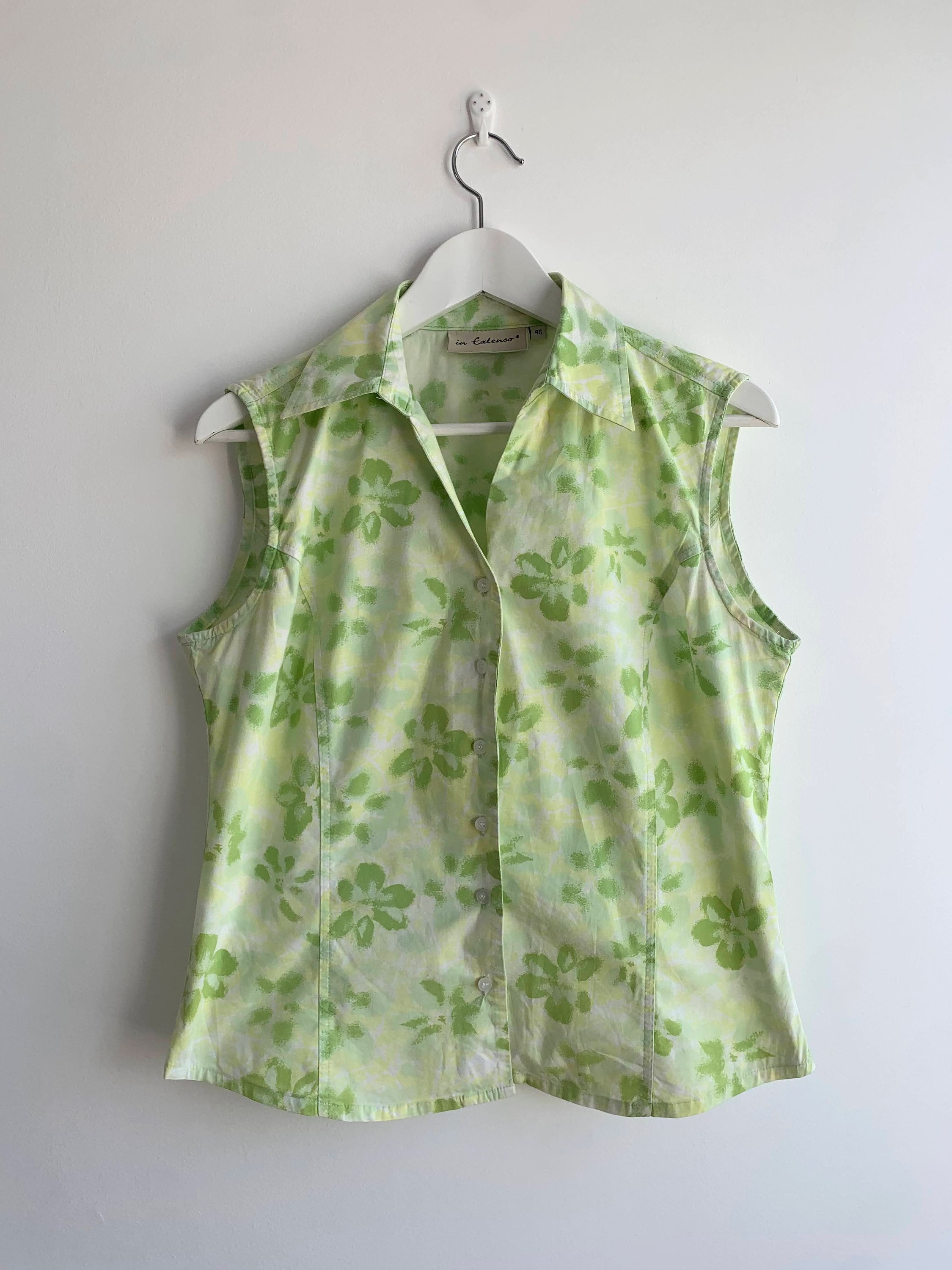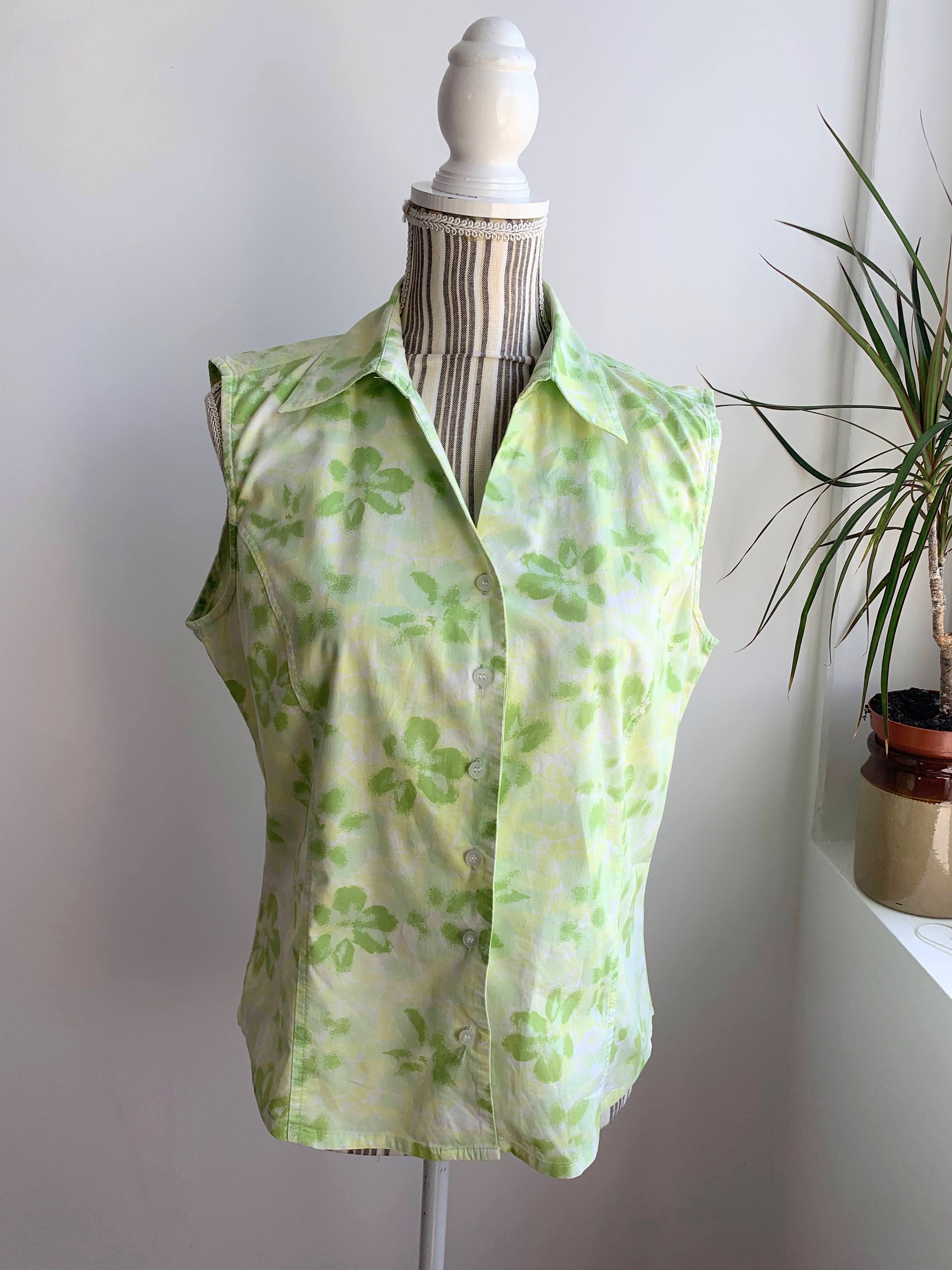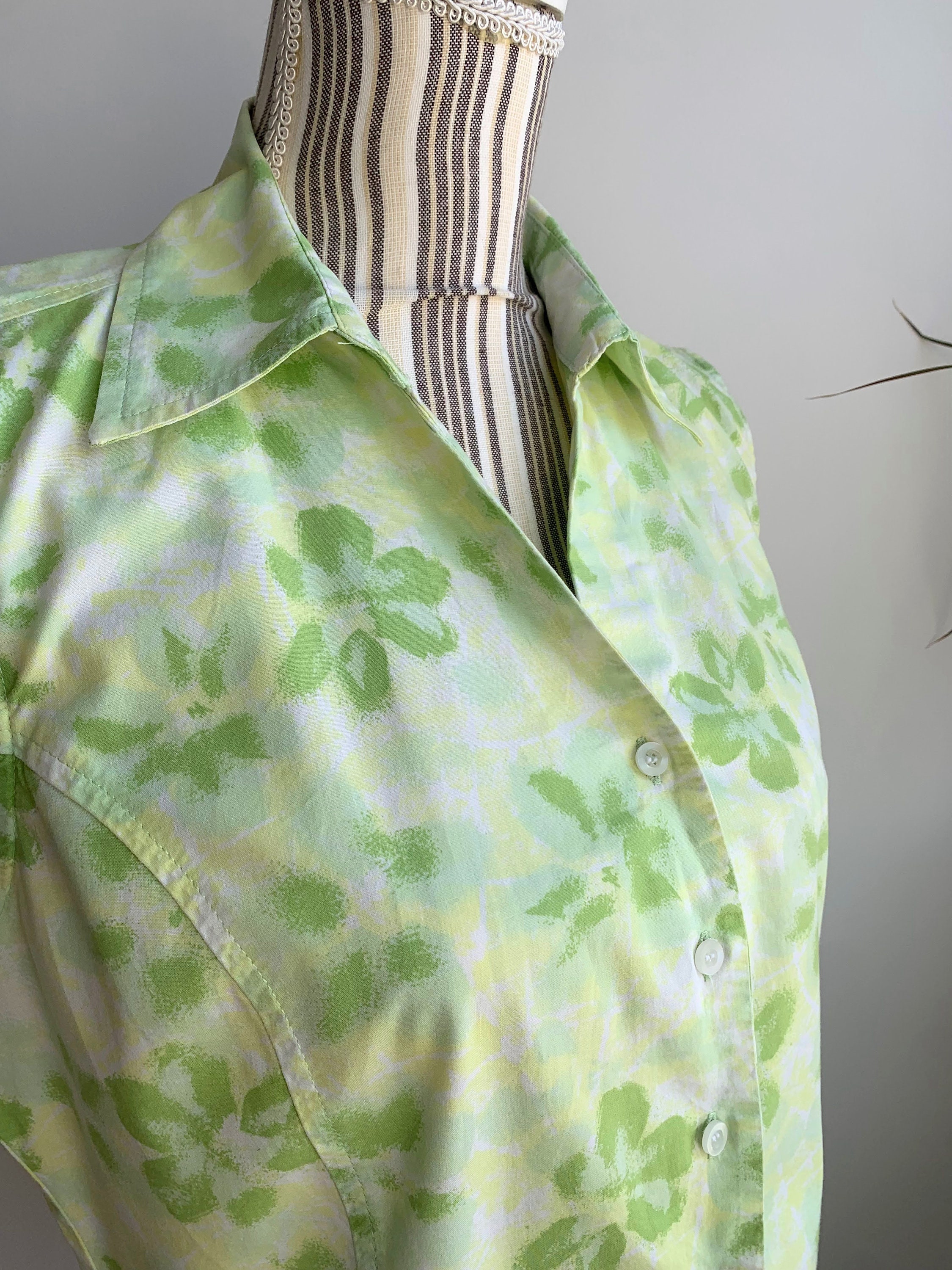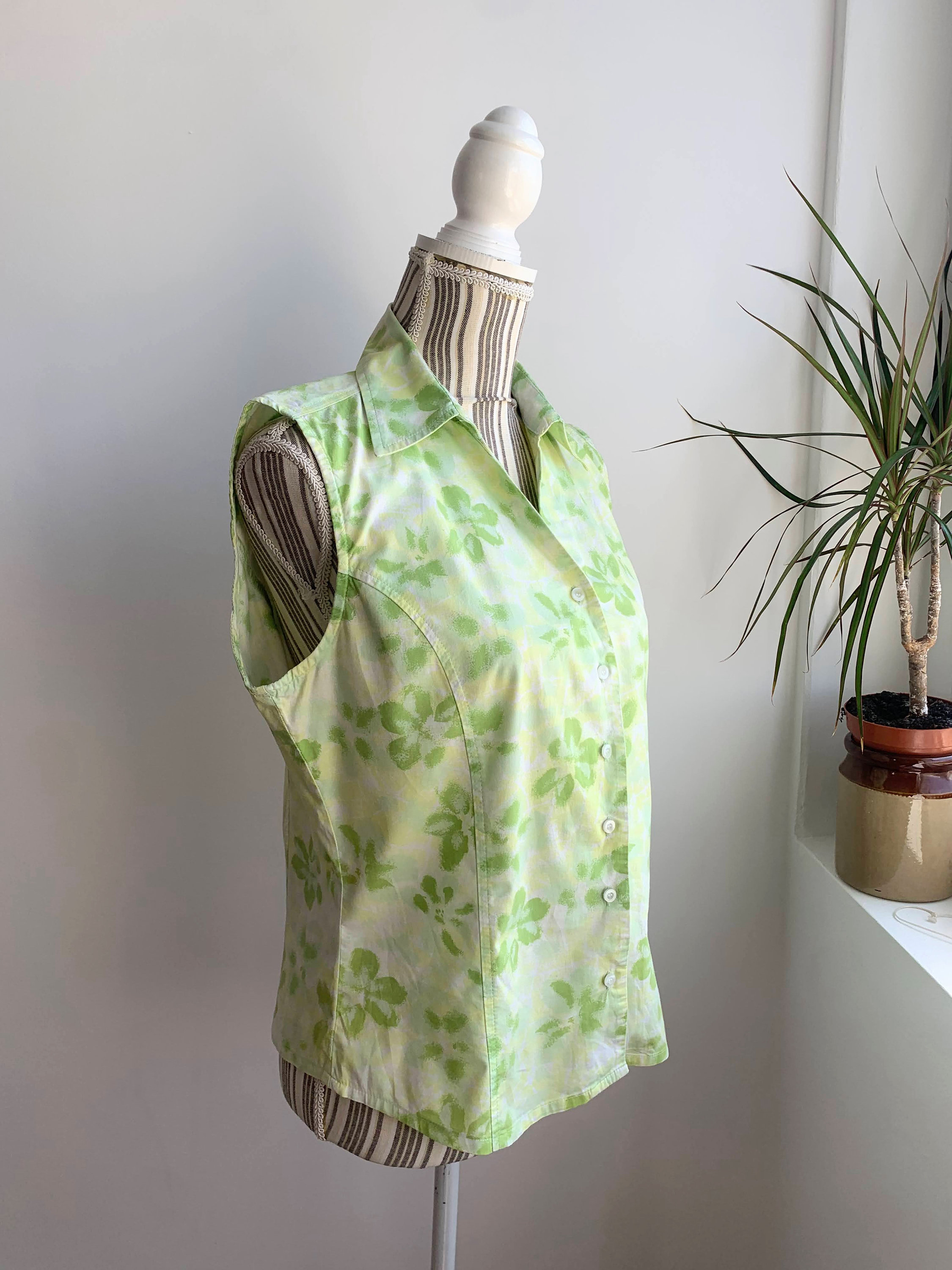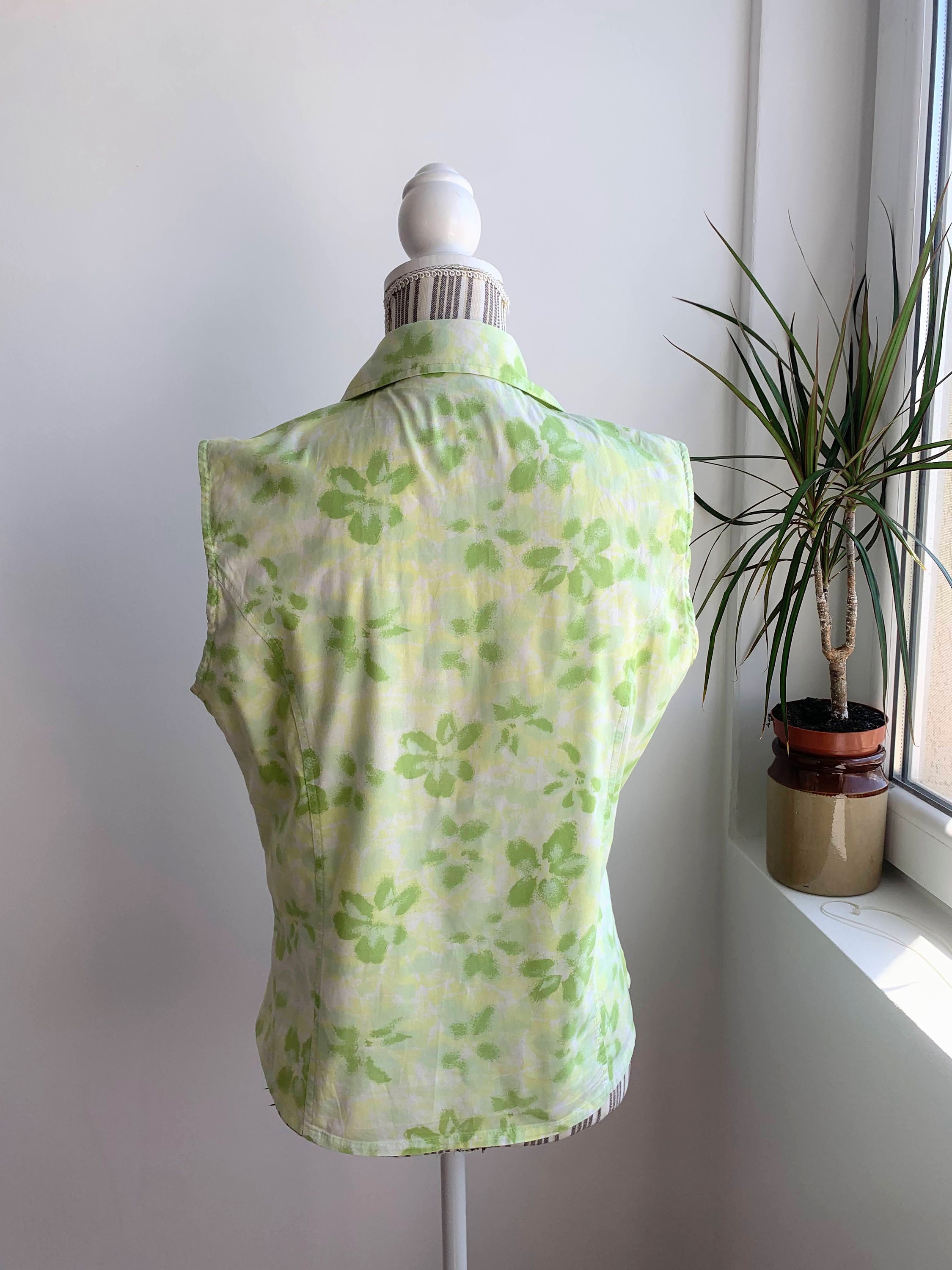 Vintage 90s cotton floral top for women with button down closure and tie up belt. This sleeveless top is made of 96% cotton and 4% elastane. It has simple loose fit silhouette which is slightly gathered at the waist . This sleeveless vest fits like size L. Please check the measurements below.