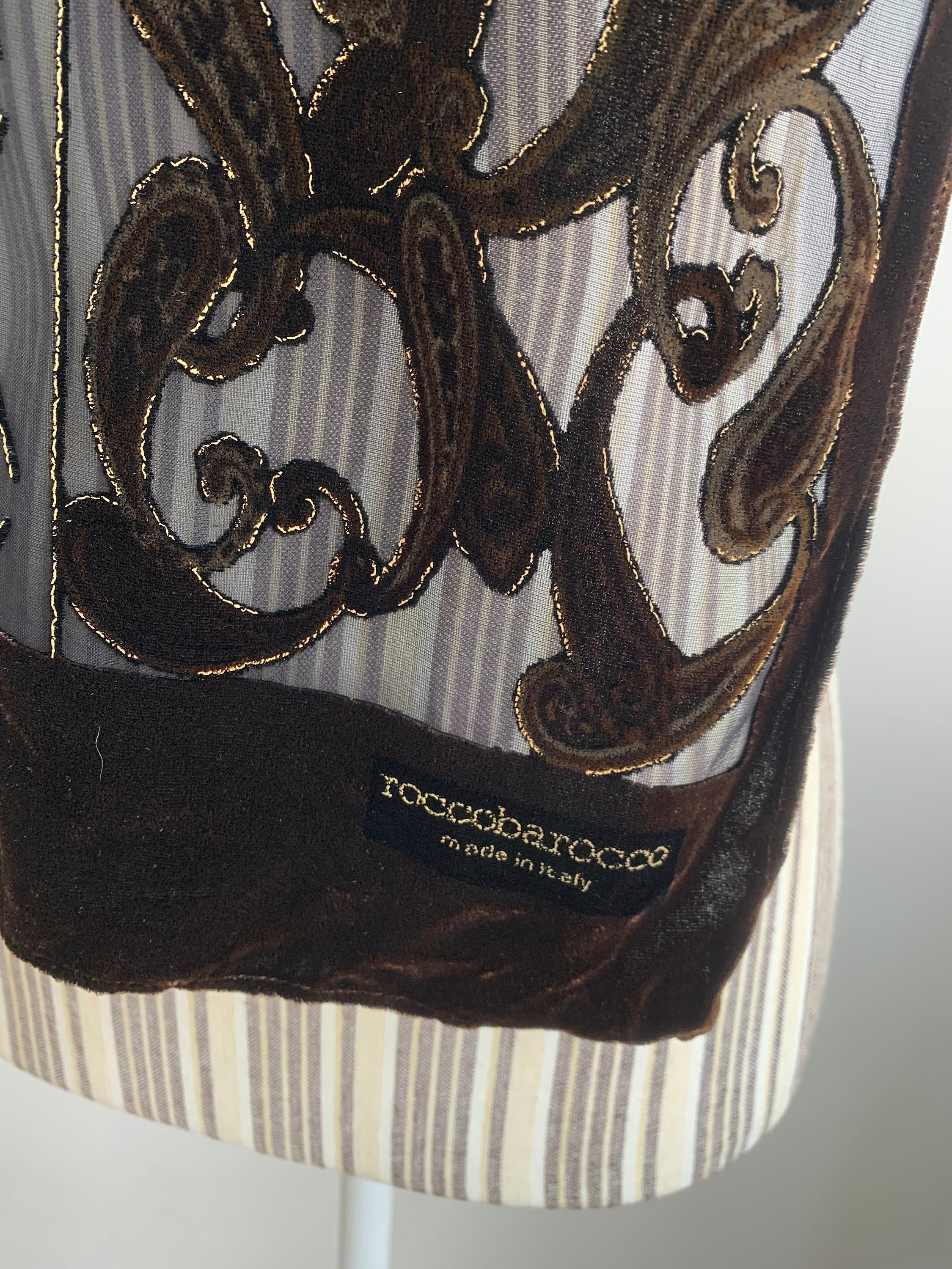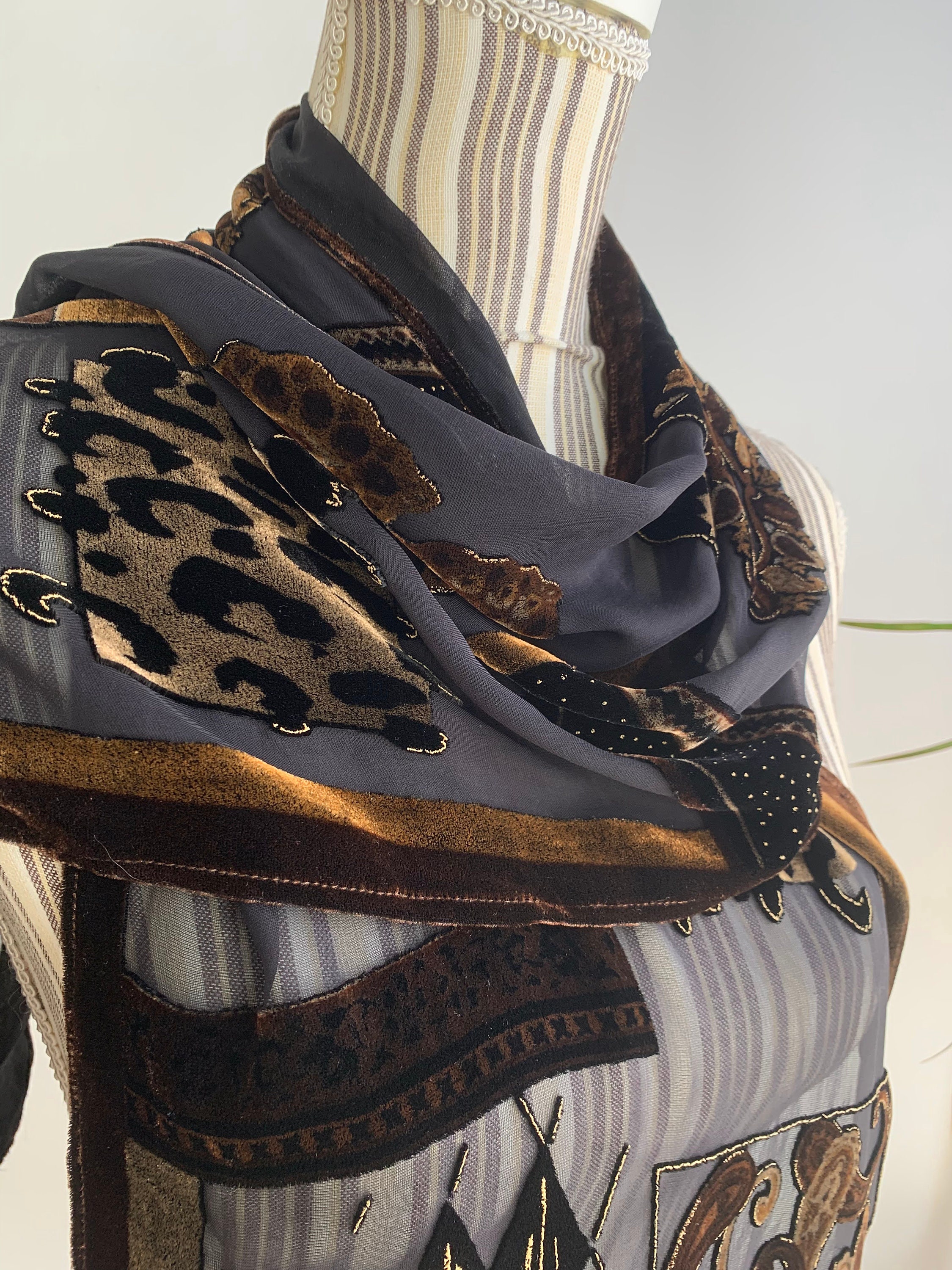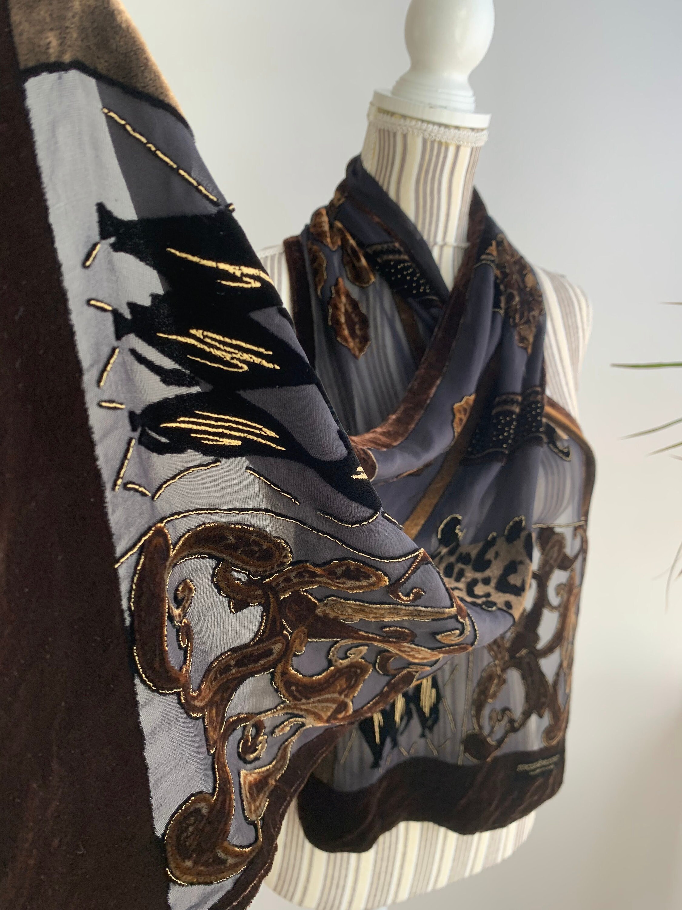 This is a beautiful vintage 90s copper brown burn out velvet scarf with floral paisley, animal and geometric print. This luxury cut out velvet scarf was made in Italy by Rocco Barocco. This silk velvet scarf is the perfect elegant accessory that you can wear daily or at special occasions. This gorgeous silk scarf is a wonderful add on to a simple evening gown. This gold brown velvet scarf will get all eyes on you. It is made of sheer fabric with velvet detailing. It has an adorable shine when exposed to light. This cut velvet scarf will make a unique vintage gift for your mother or grandmother!