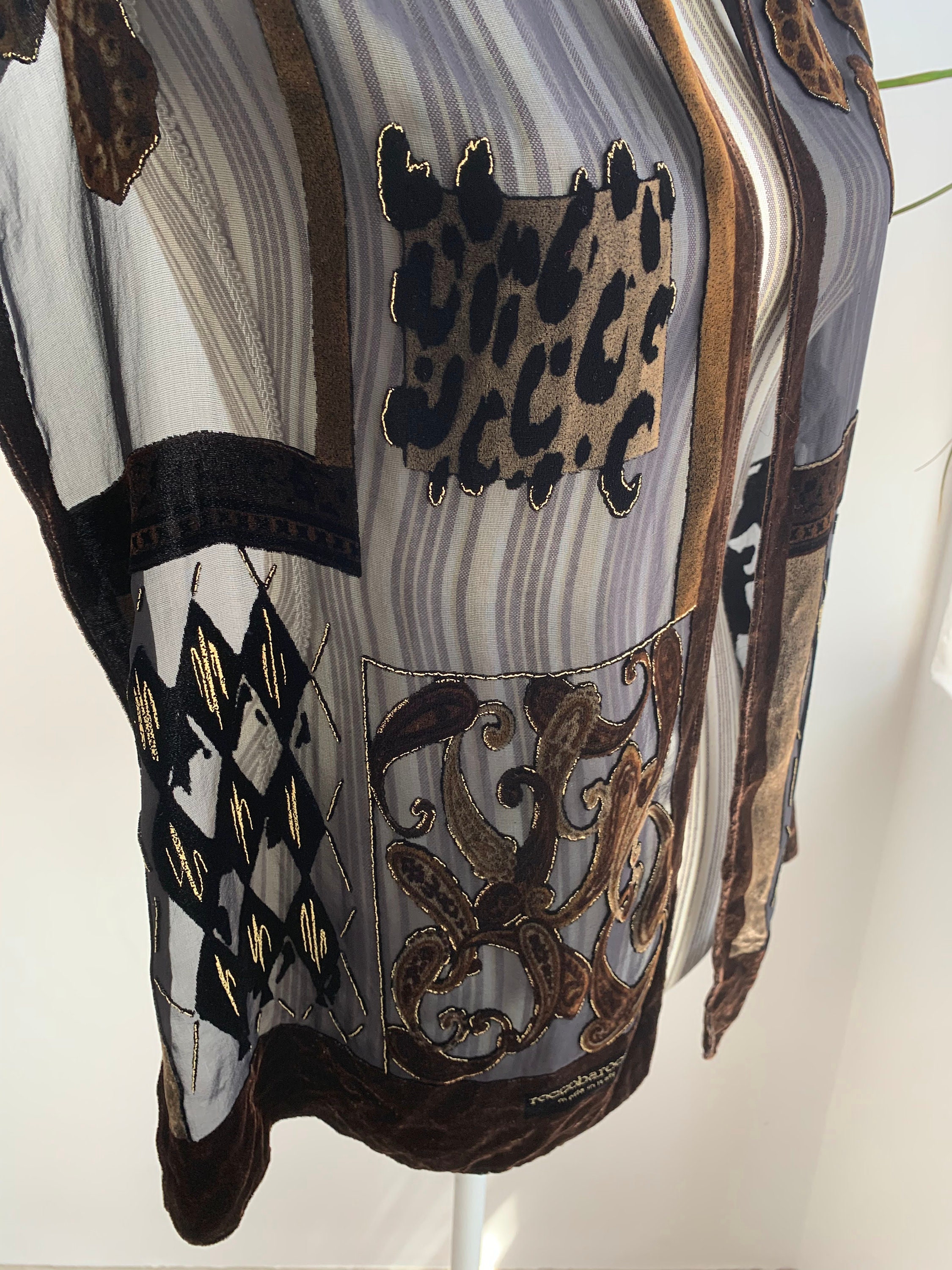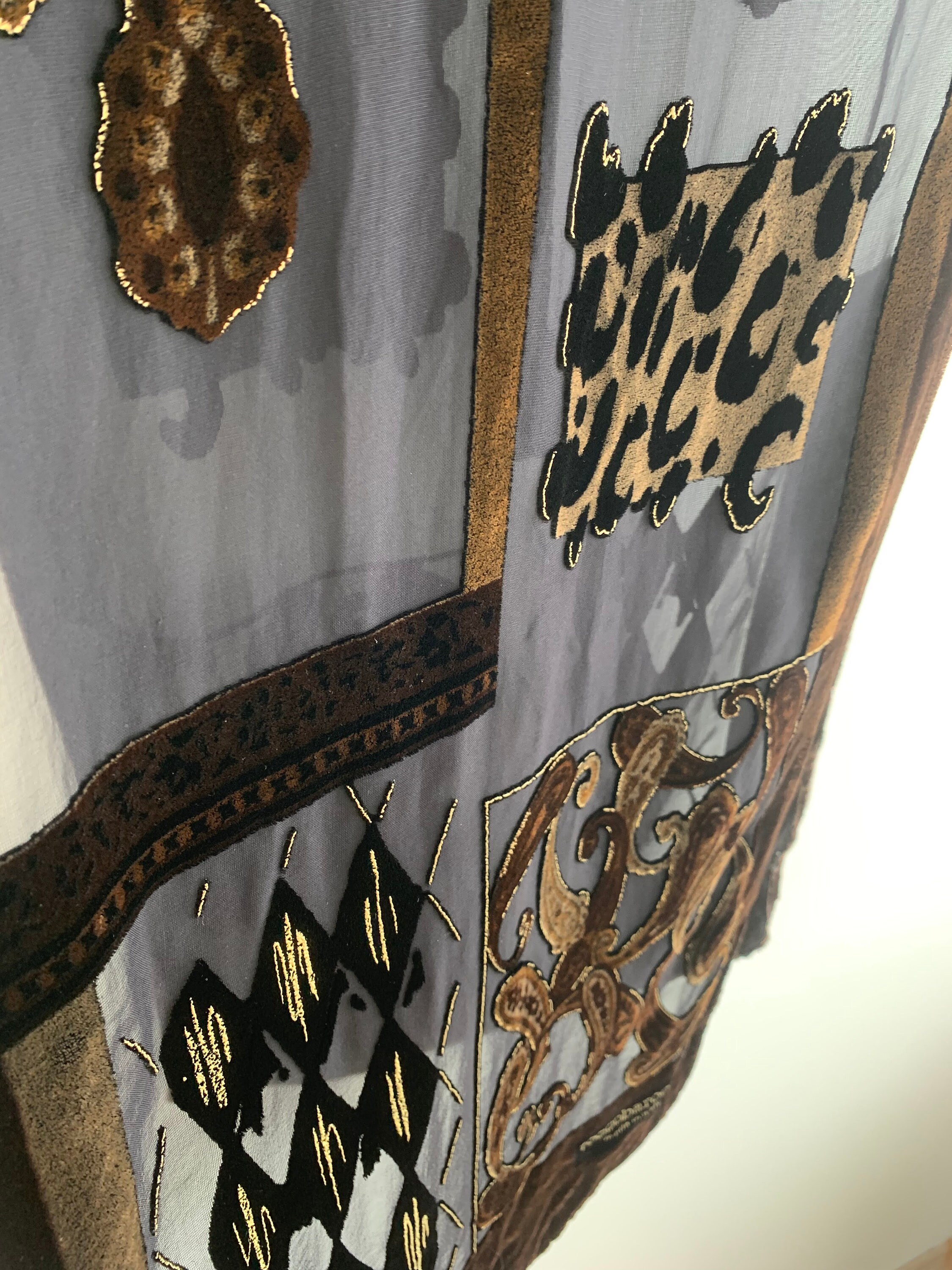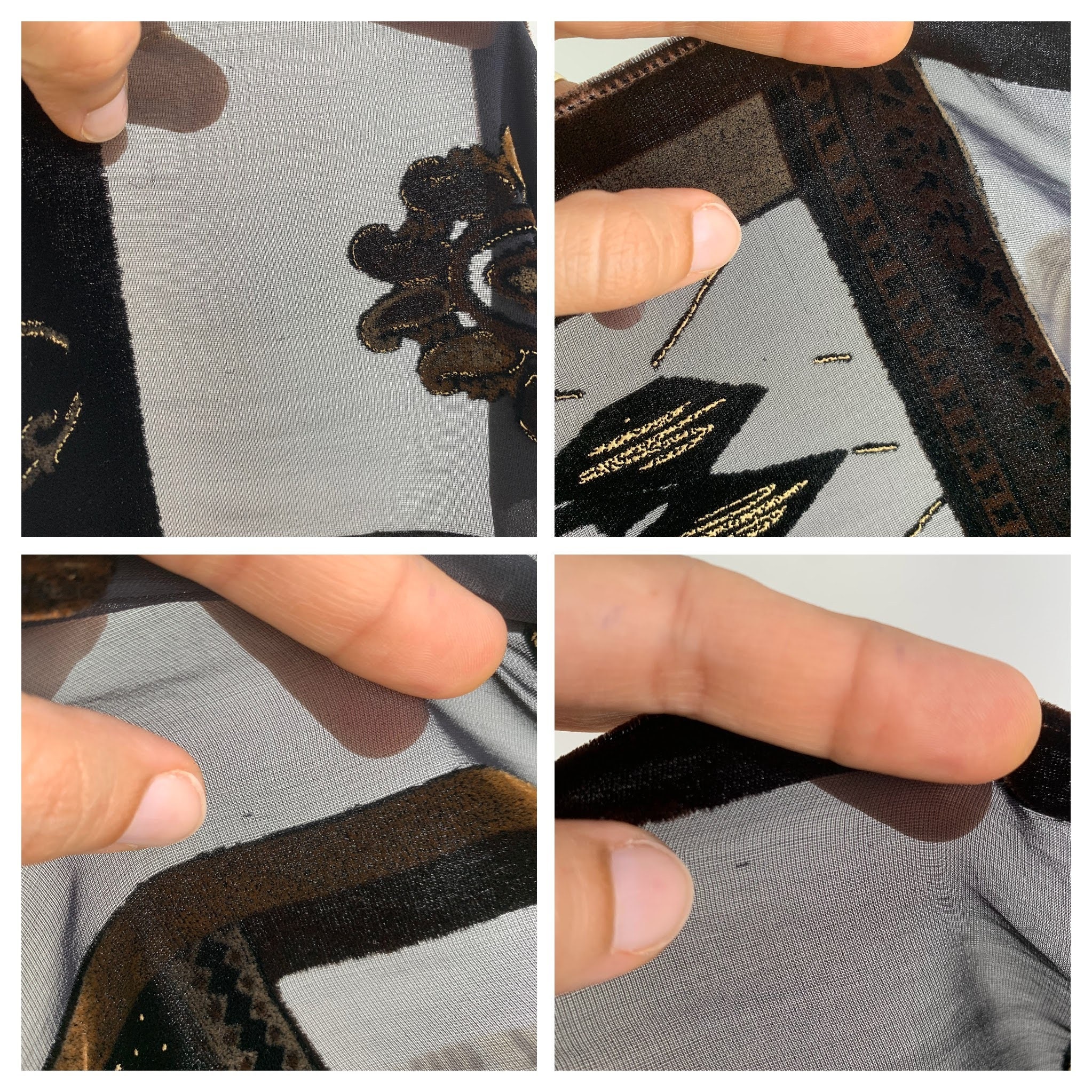 This is a beautiful vintage 90s copper brown burn out velvet scarf with floral paisley, animal and geometric print. This luxury cut out velvet scarf was made in Italy by Rocco Barocco. This silk velvet scarf is the perfect elegant accessory that you can wear daily or at special occasions. This gorgeous silk scarf is a wonderful add on to a simple evening gown. This gold brown velvet scarf will get all eyes on you. It is made of sheer fabric with velvet detailing. It has an adorable shine when exposed to light. This cut velvet scarf will make a unique vintage gift for your mother or grandmother!