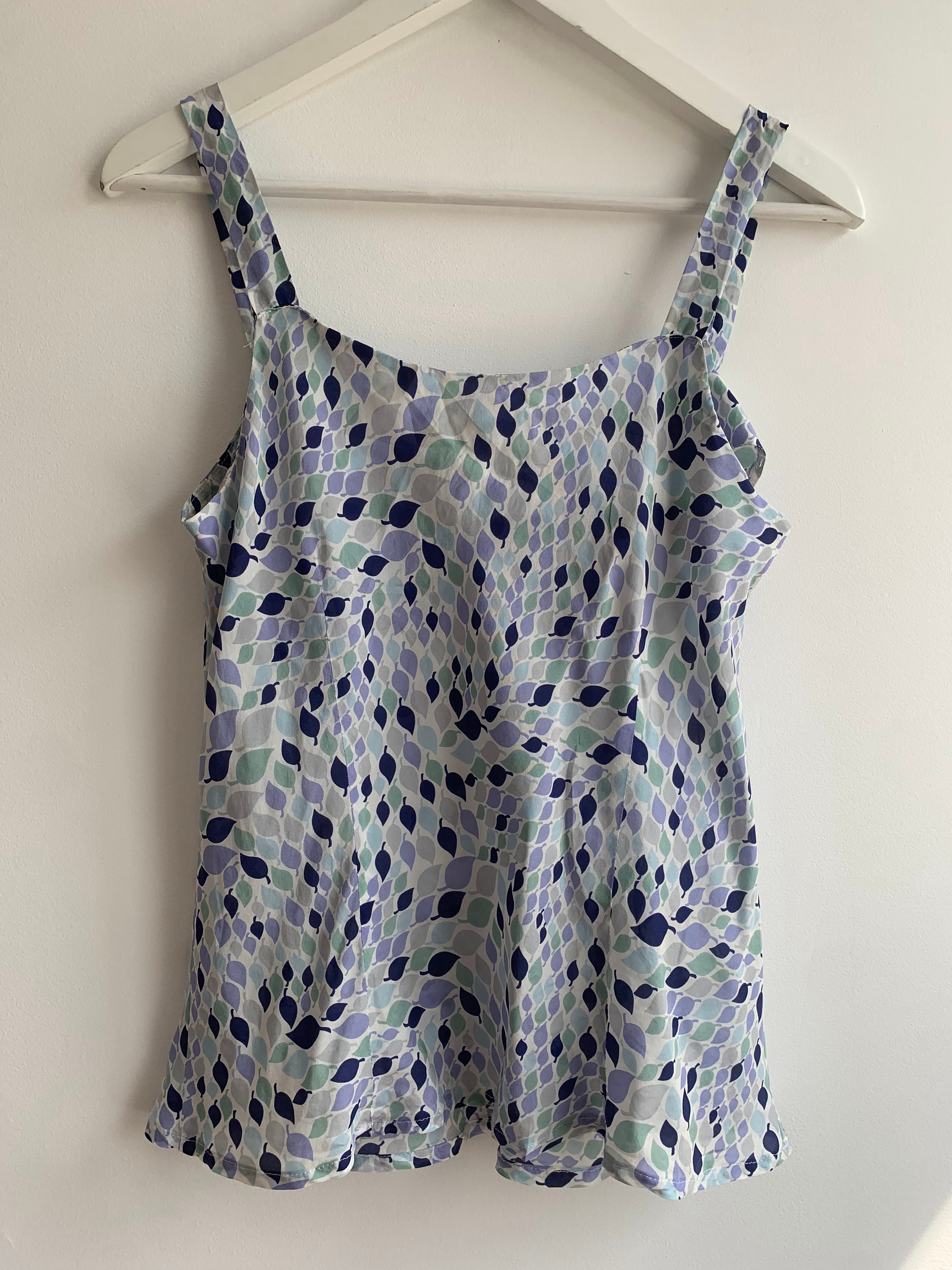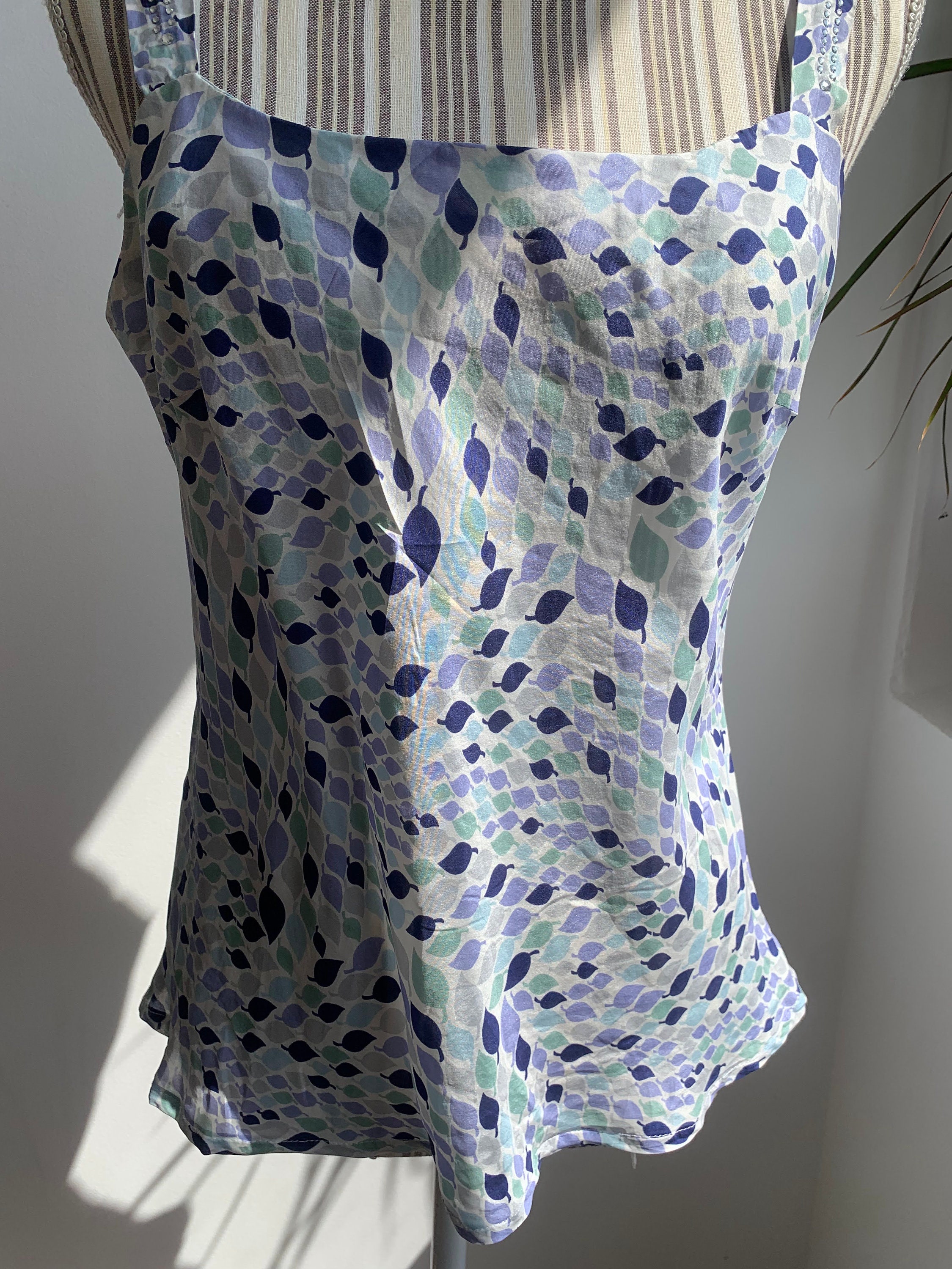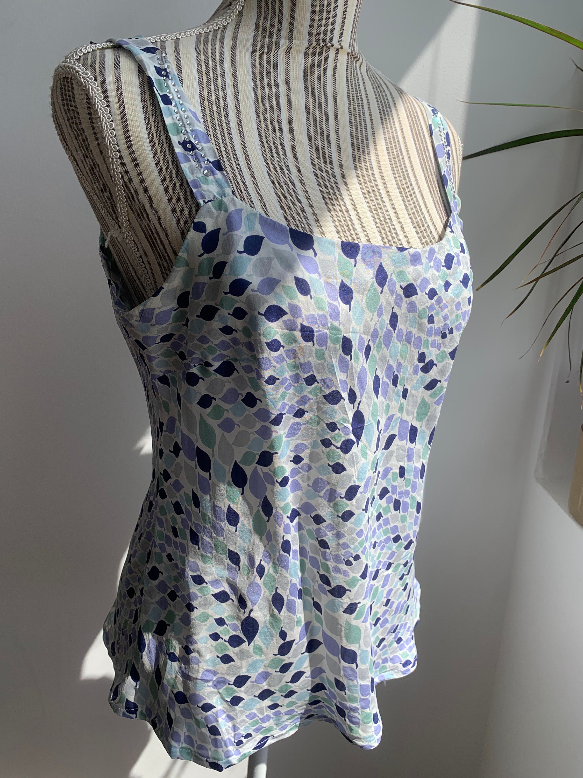 This is a lovely leaf print summer tank top made of 100% silk fabric with slim spaghetti straps and rhinestones. This flowy silk camisole is super comfortable and breathable, perfect for the summer.