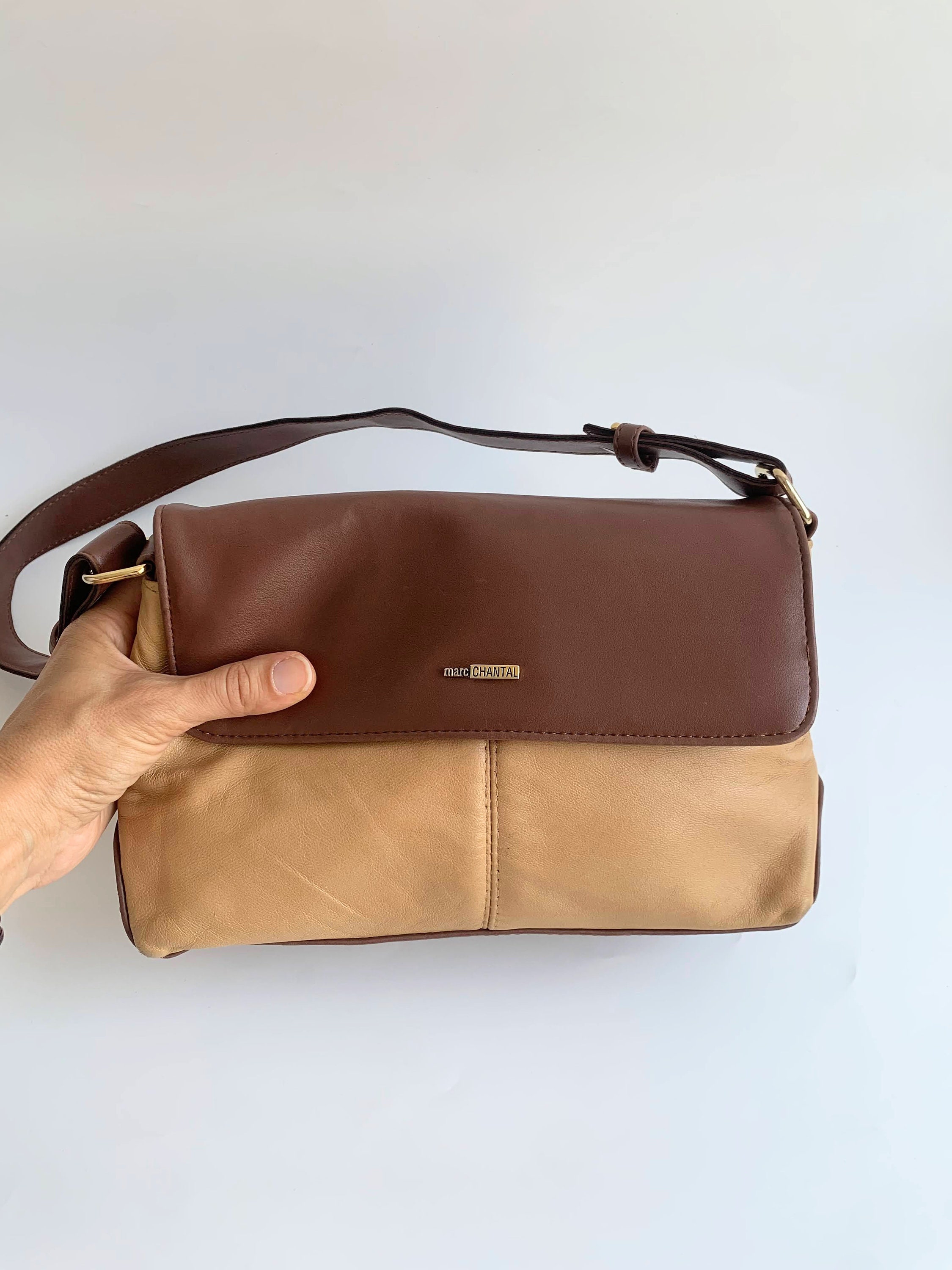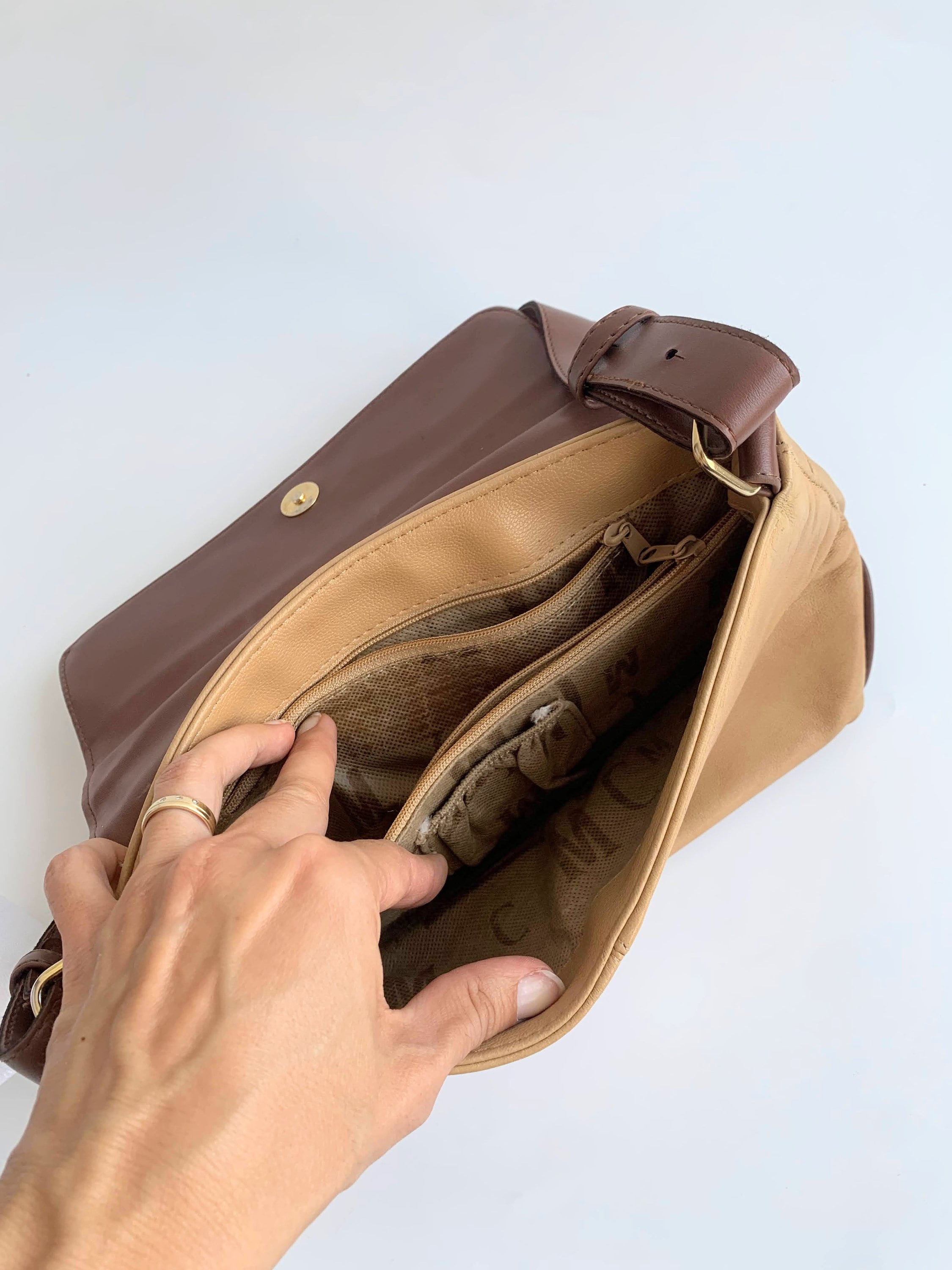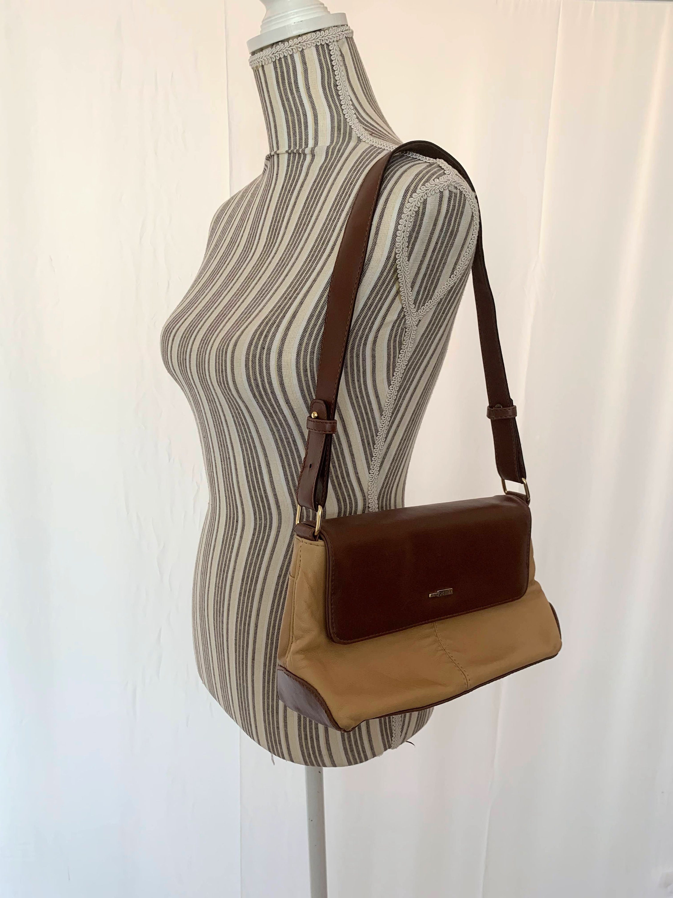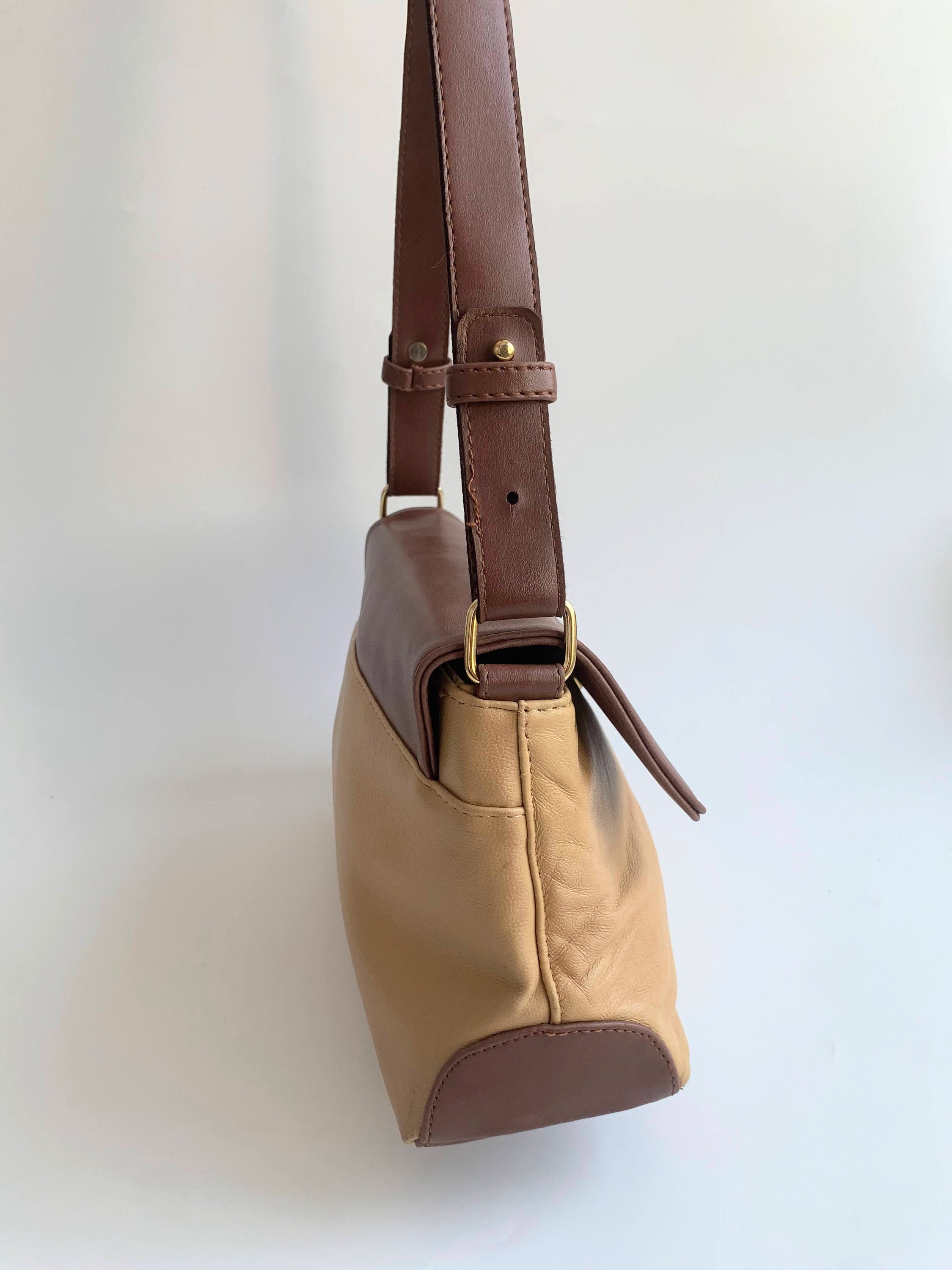 This is vintage 90s faux leather tote bag with flap over magnetic closure in warm brown and tan beige color. This everyday shoulder purse is very comfortable to wear and you can easily organize all your belongings with the multiple pockets and compartments. The interior of this vintage handbag is lined in monogrammed fabric.