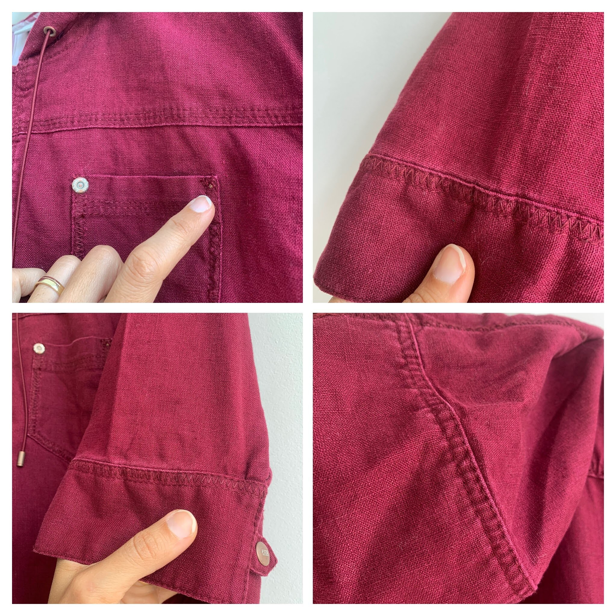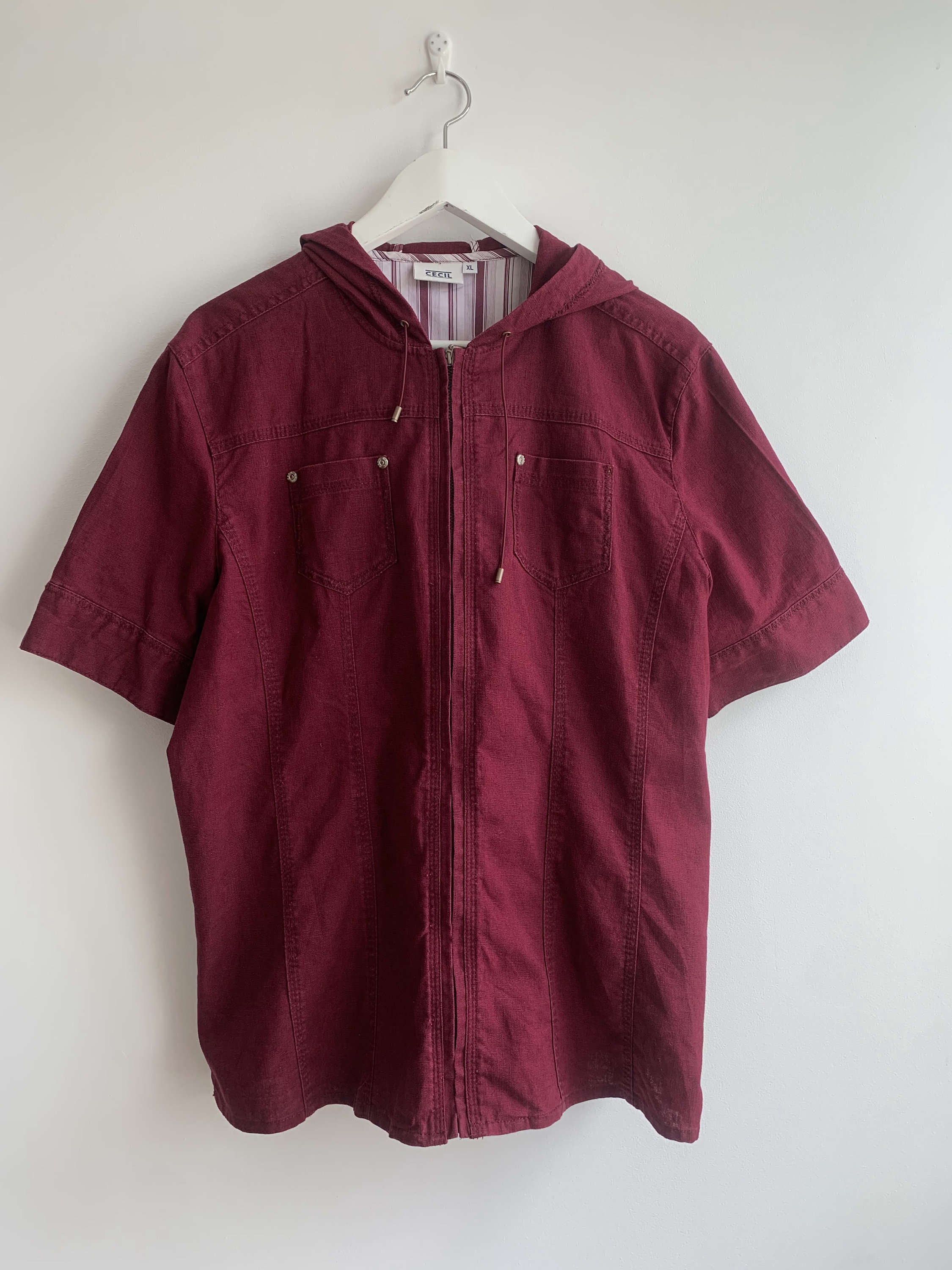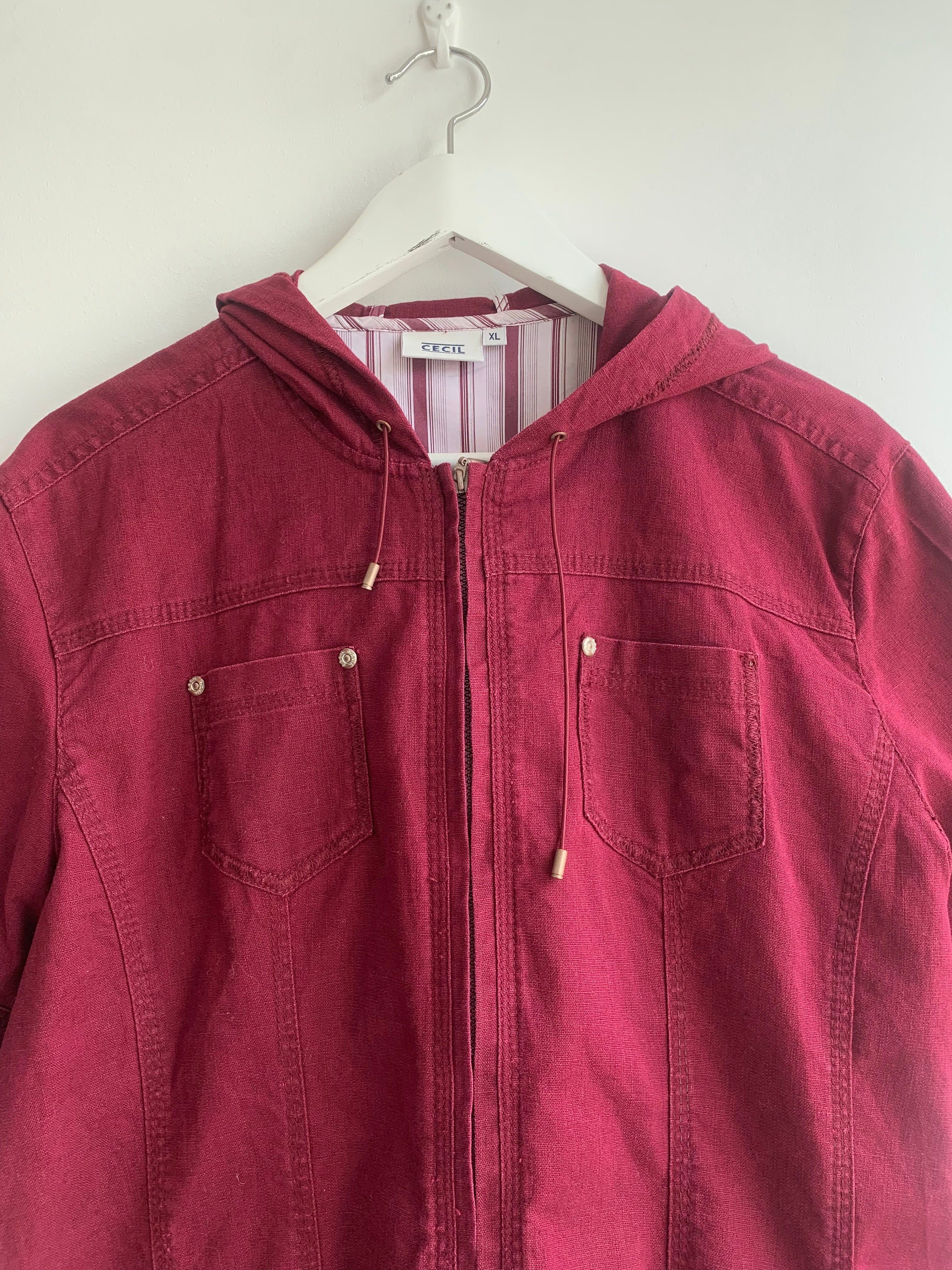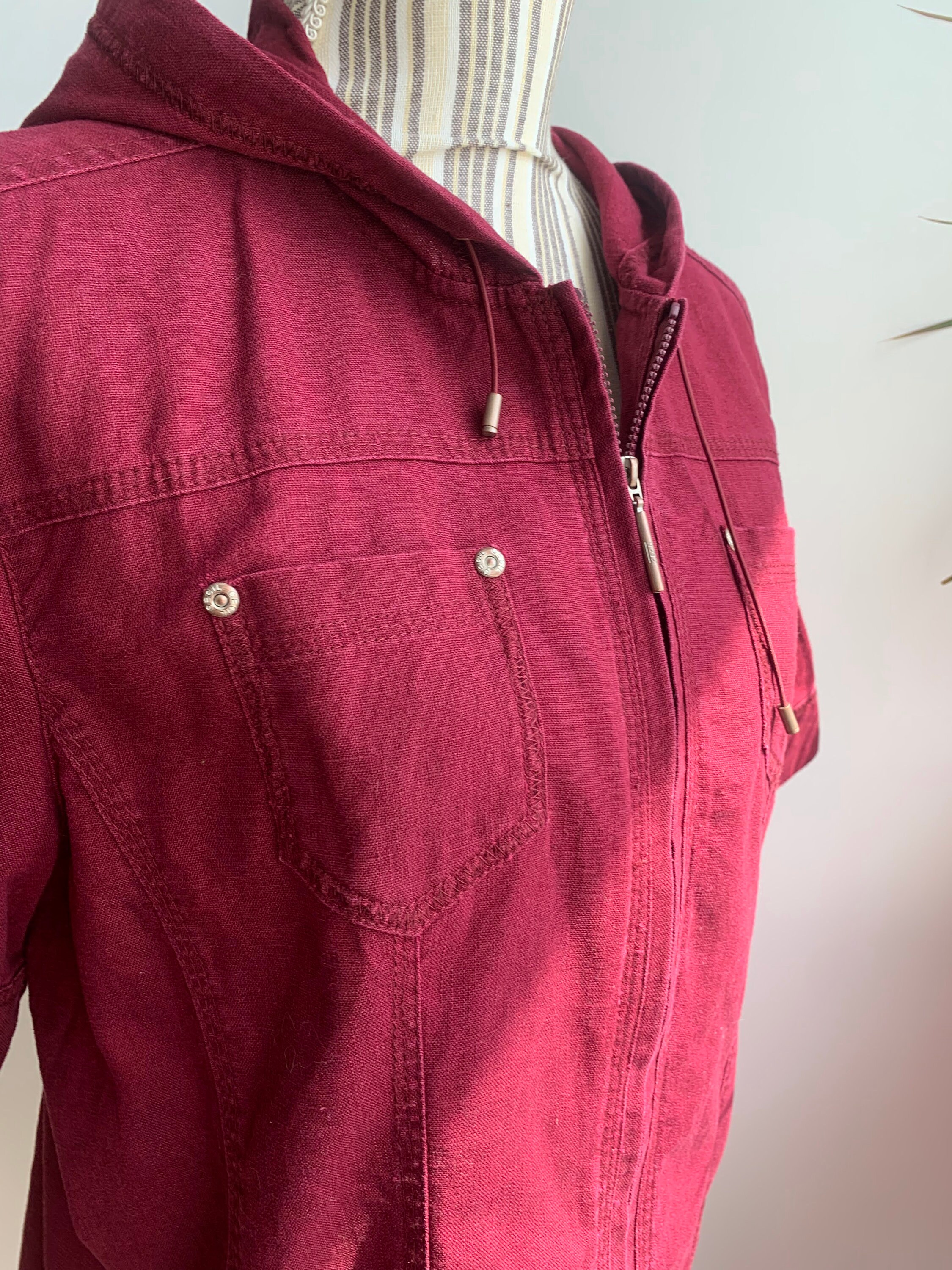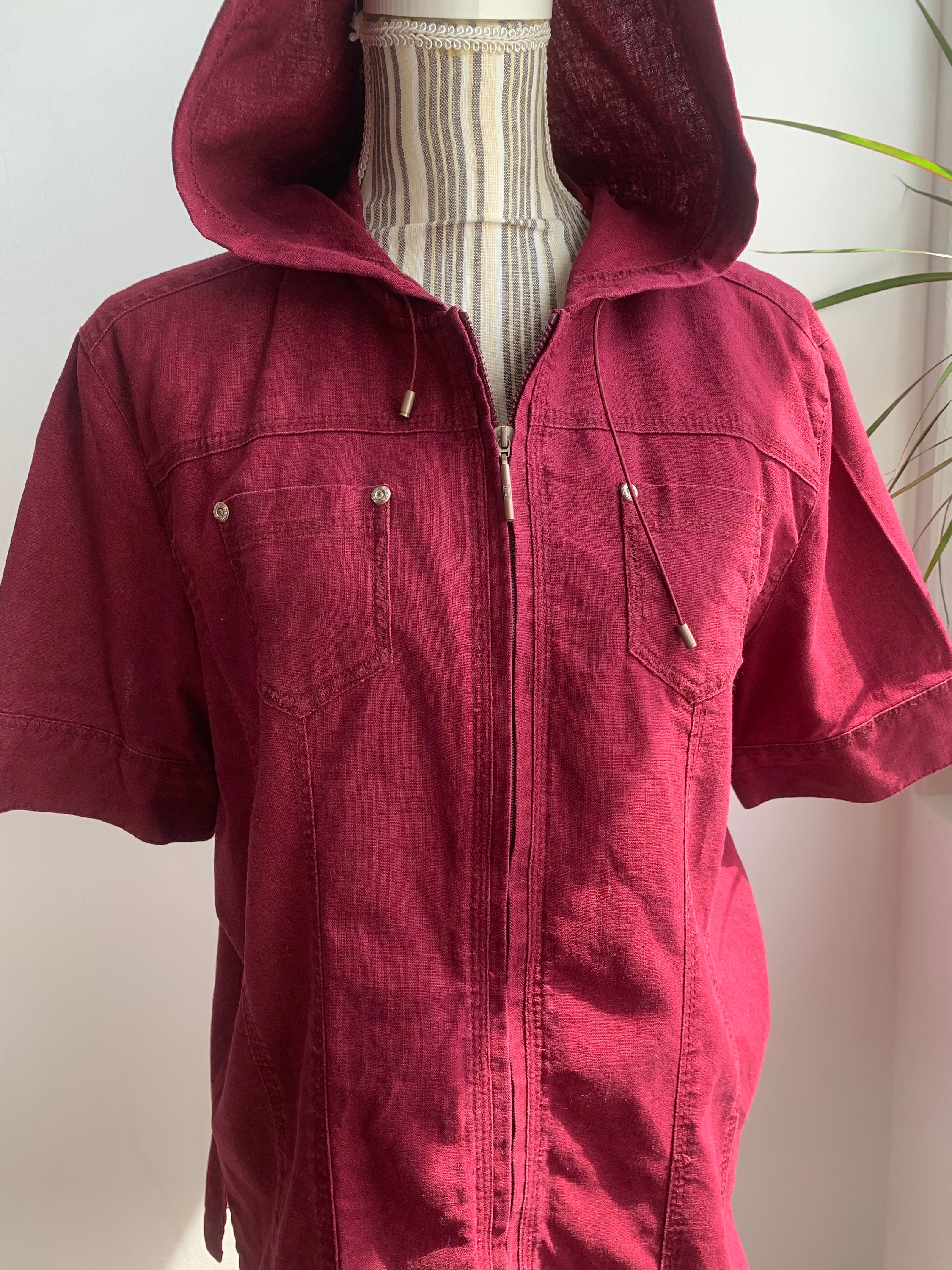 This is a beautiful vintage linen cotton blend short sleeve zip up shirt jacket with a hood. This burgundy linen jacket has simple loose fit silhouette. This loose fit short linen coat is made of 55% linen fabric and 45% cotton in burgundy color. The linen blend fabric has some texture but still in awesome condition. Sustainable piece of linen clothing that you can enjoy. The size marked is XL. Please check the measurements below