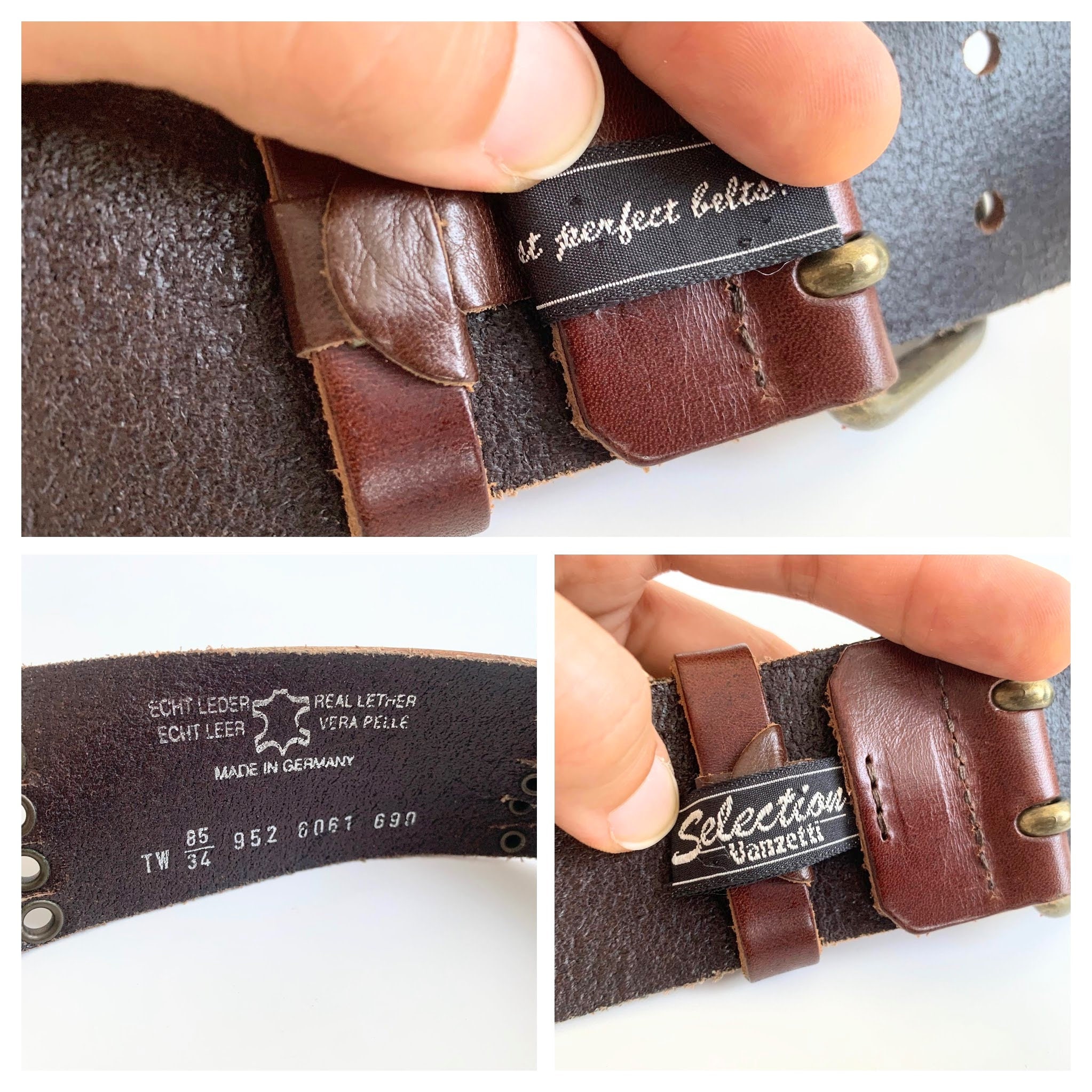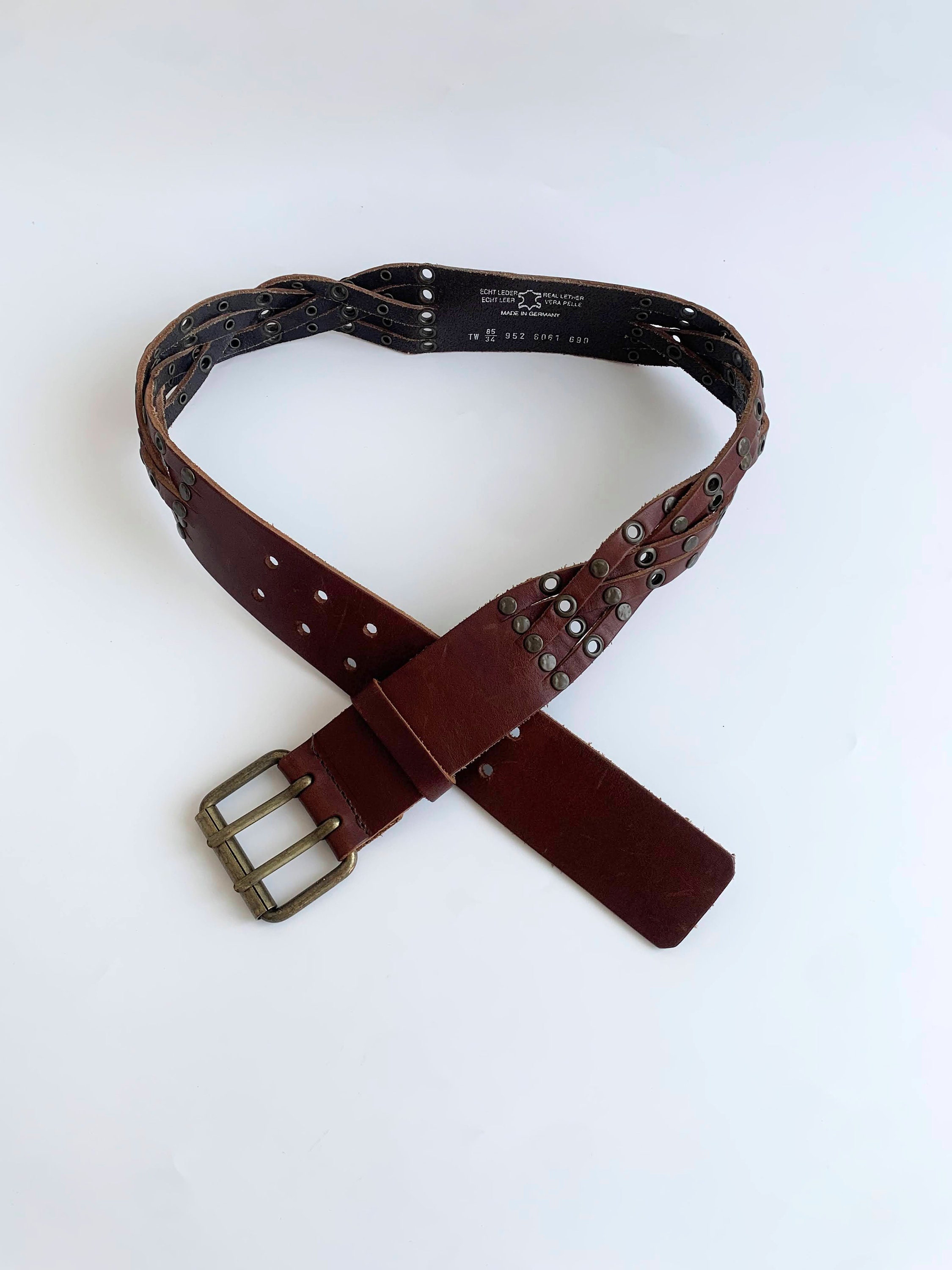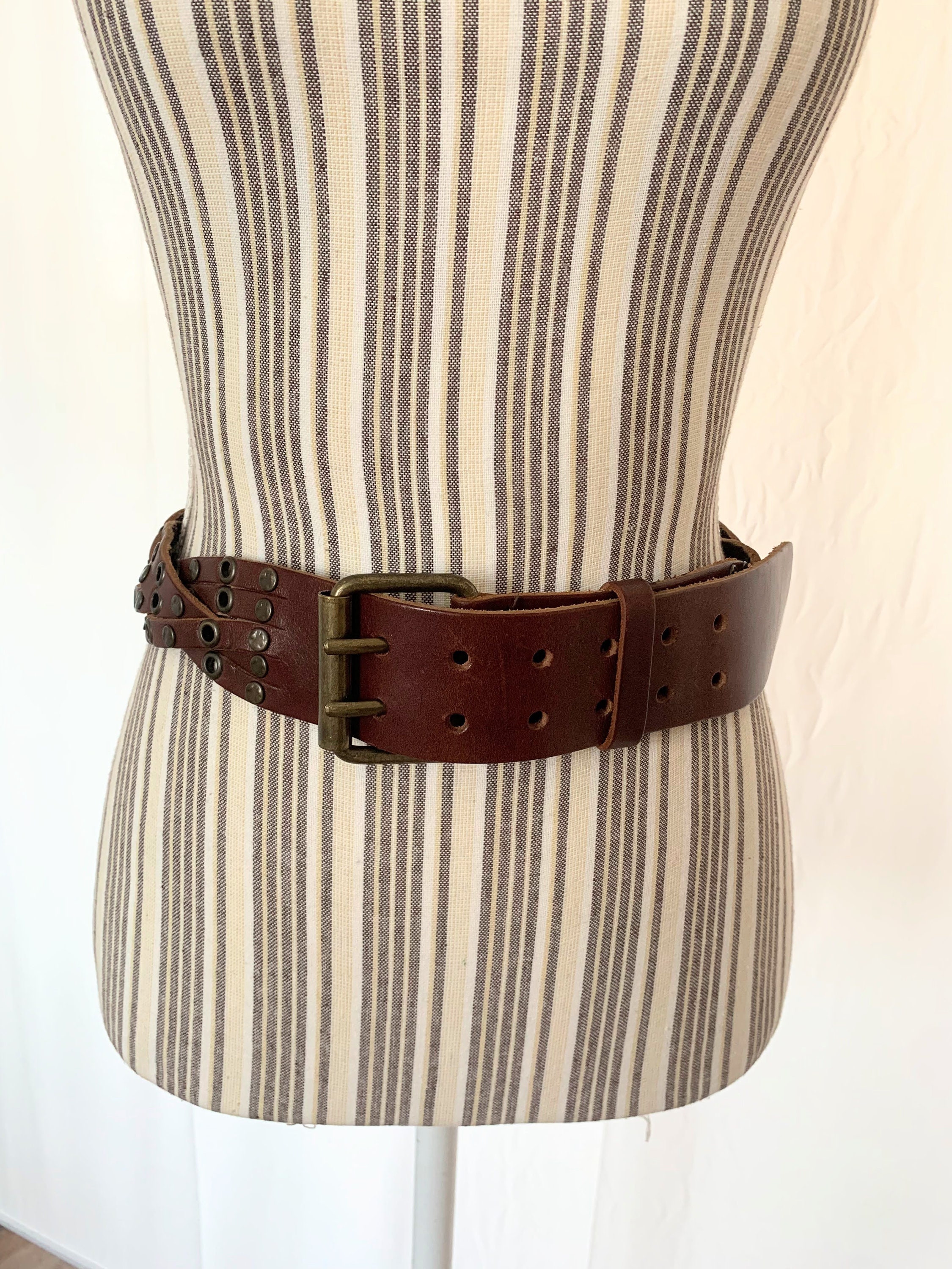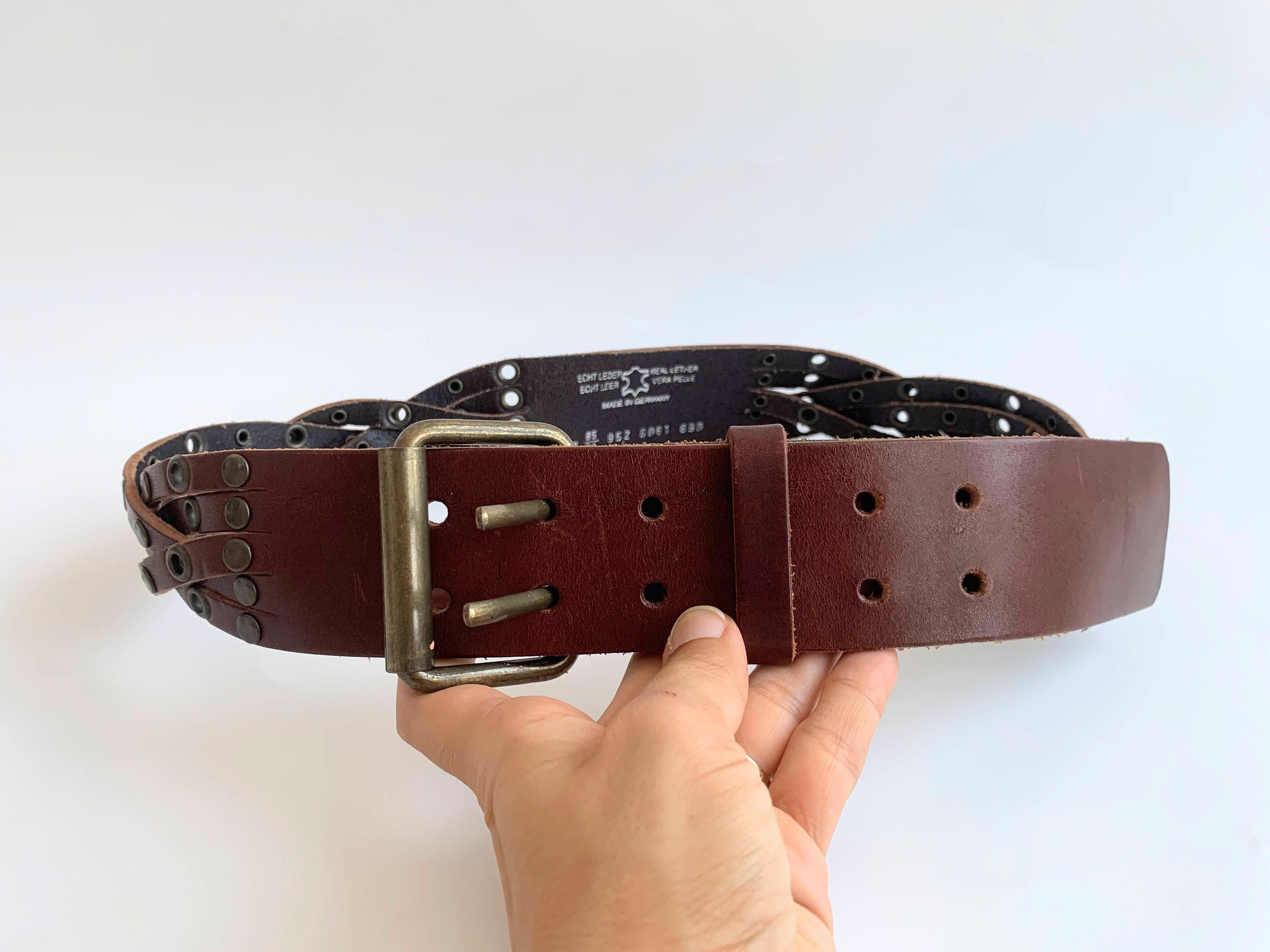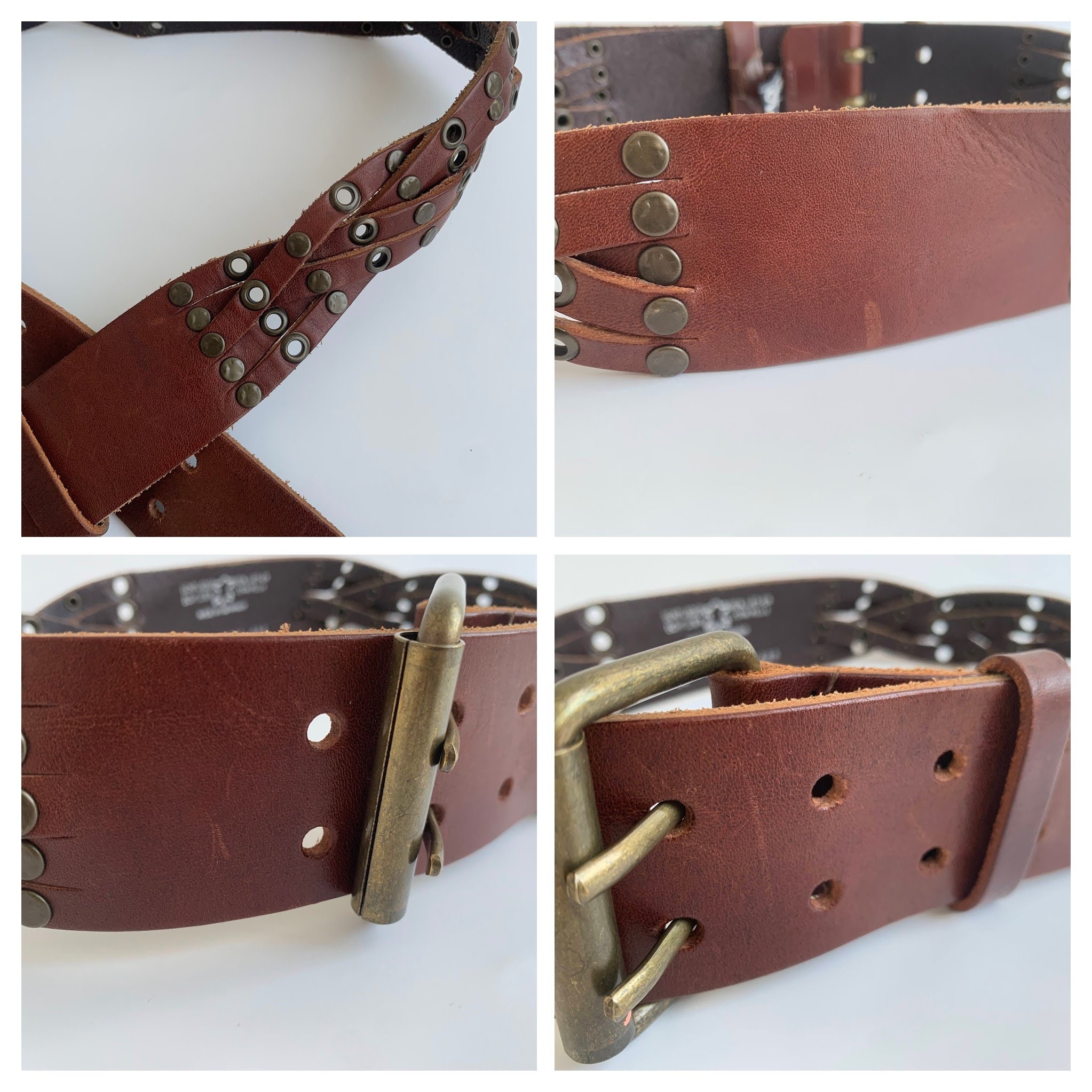 Condition: This cognac brown leather belt has a heavily distressed look as it was much loved. There are numerous scratches on the leather surface and some wear on the studs. I have tried to capture these details in the close up photos.