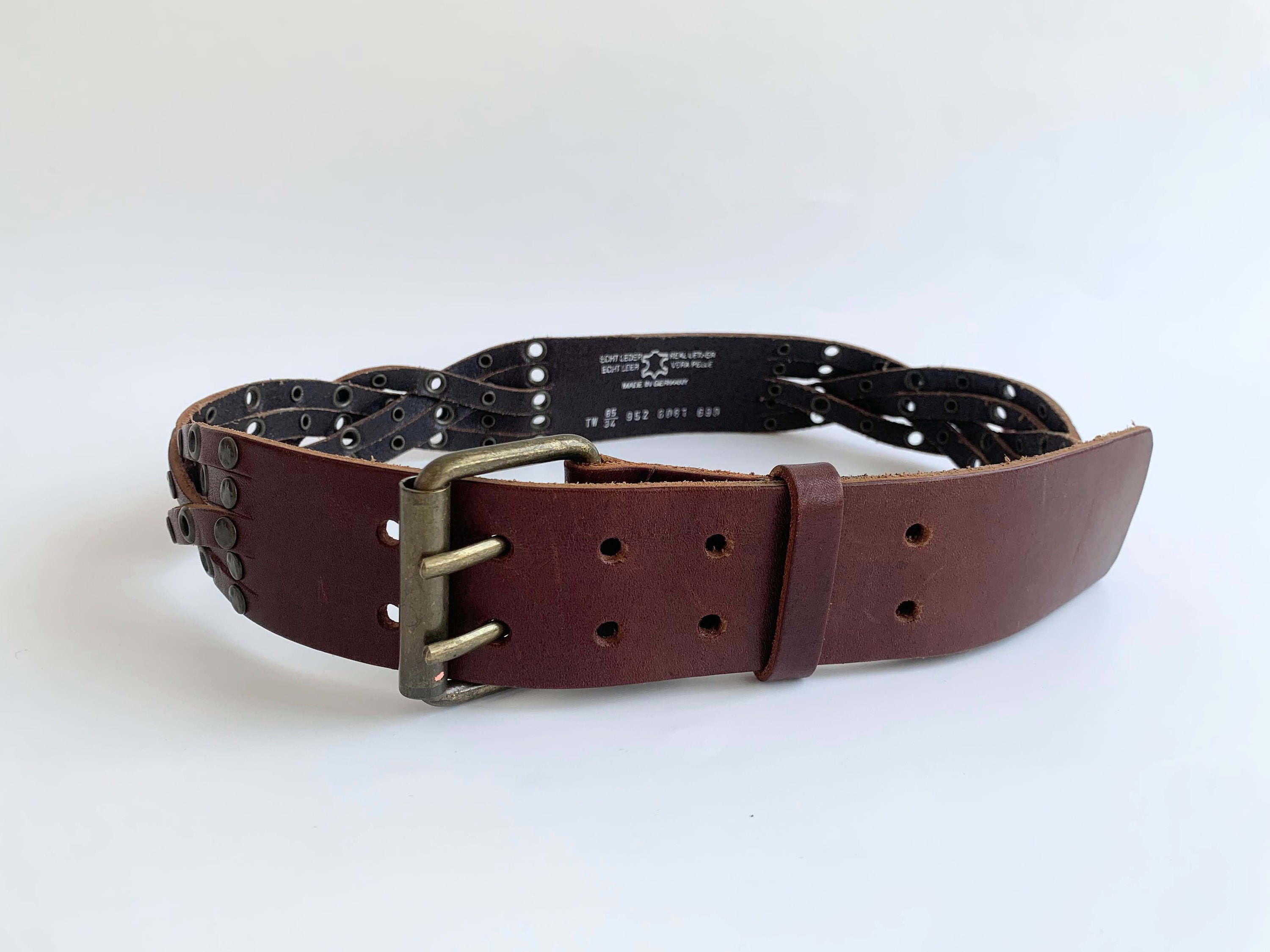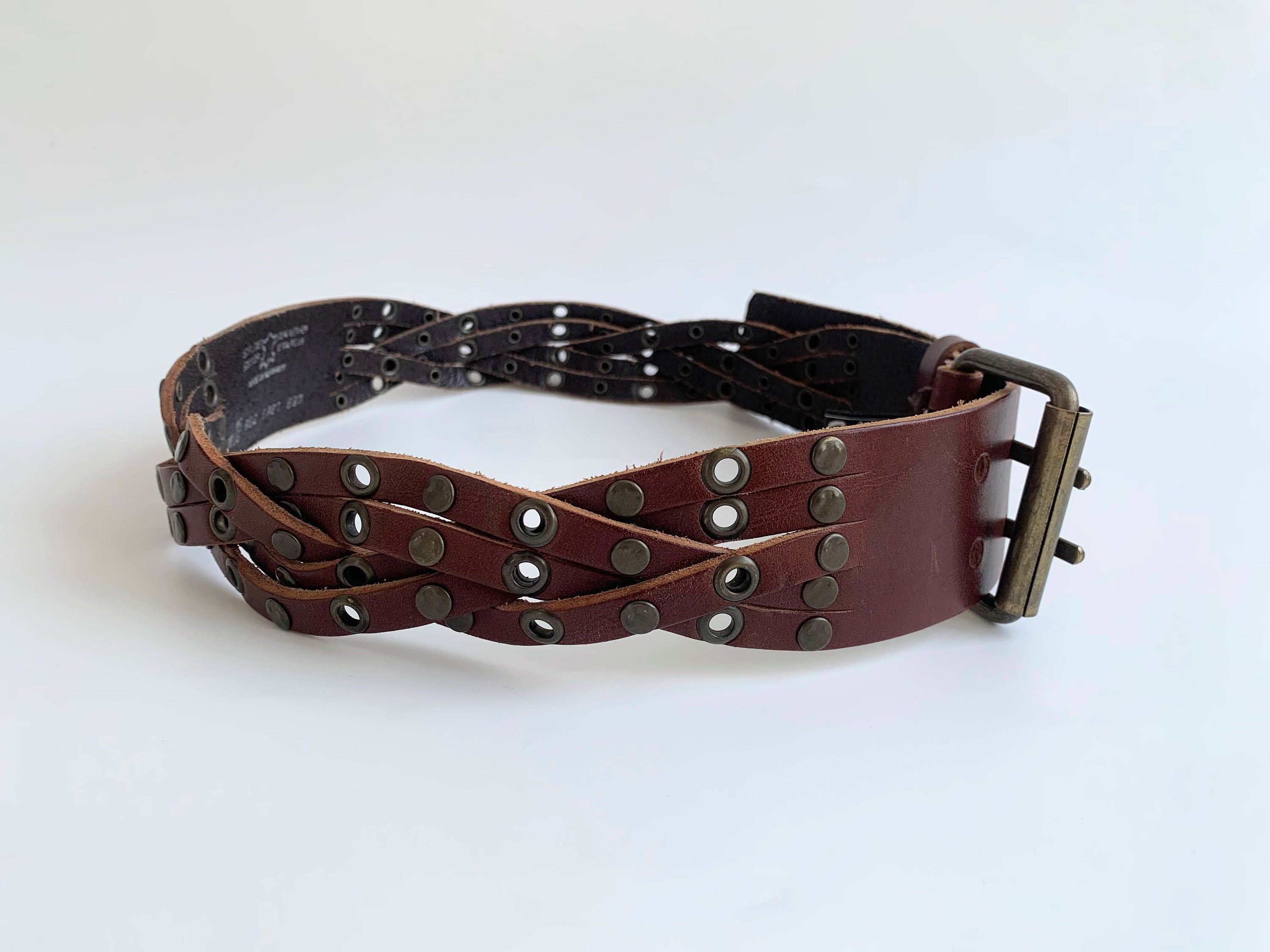This is a vintage woven leather belt for women in cognac brown color with brass buckle and studs. This wide waist belt is made of sturdy genuine leather which has a distressed leather look.