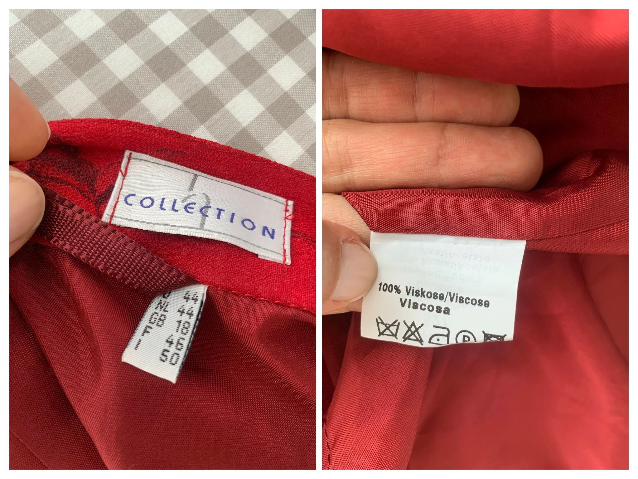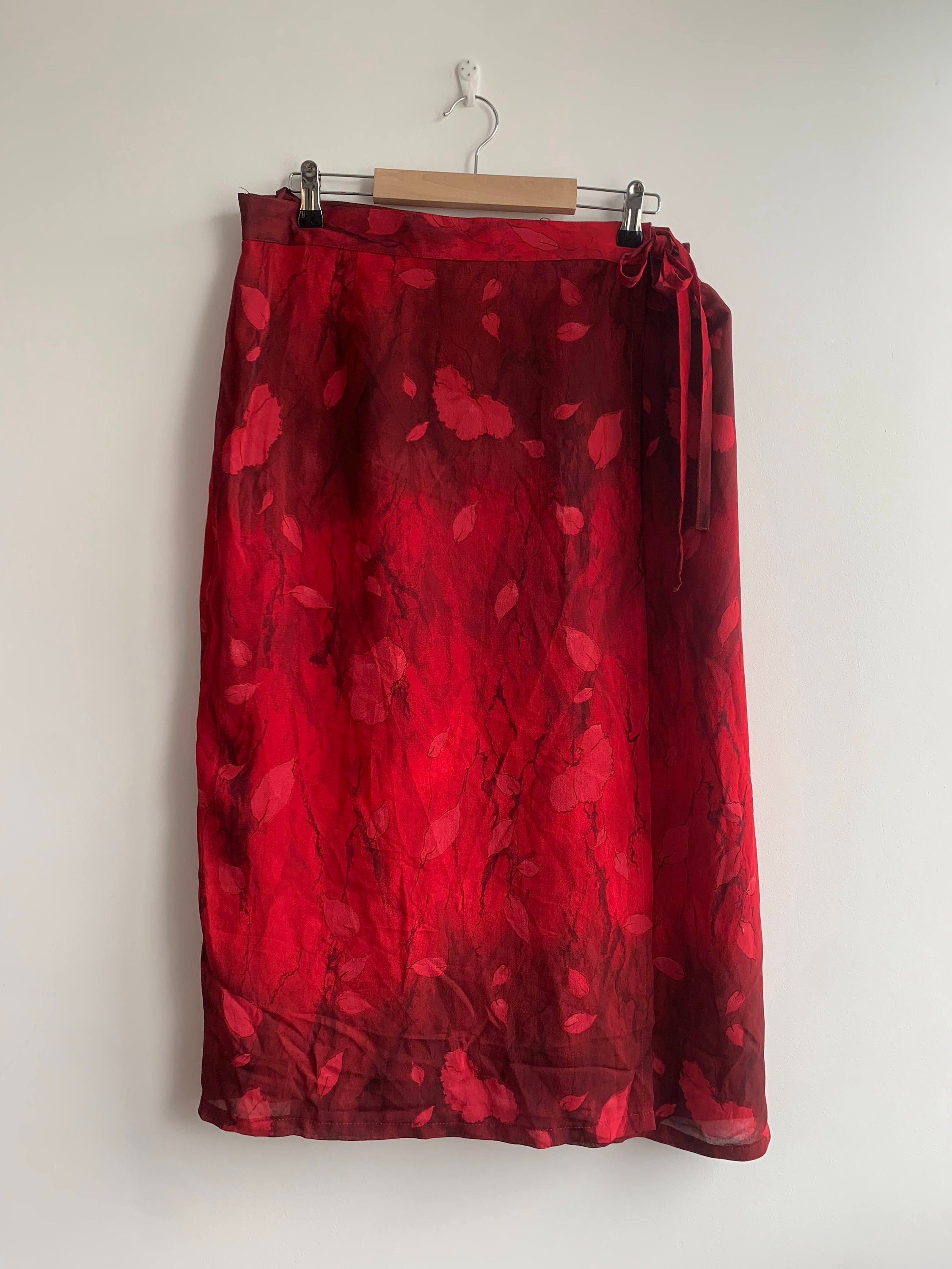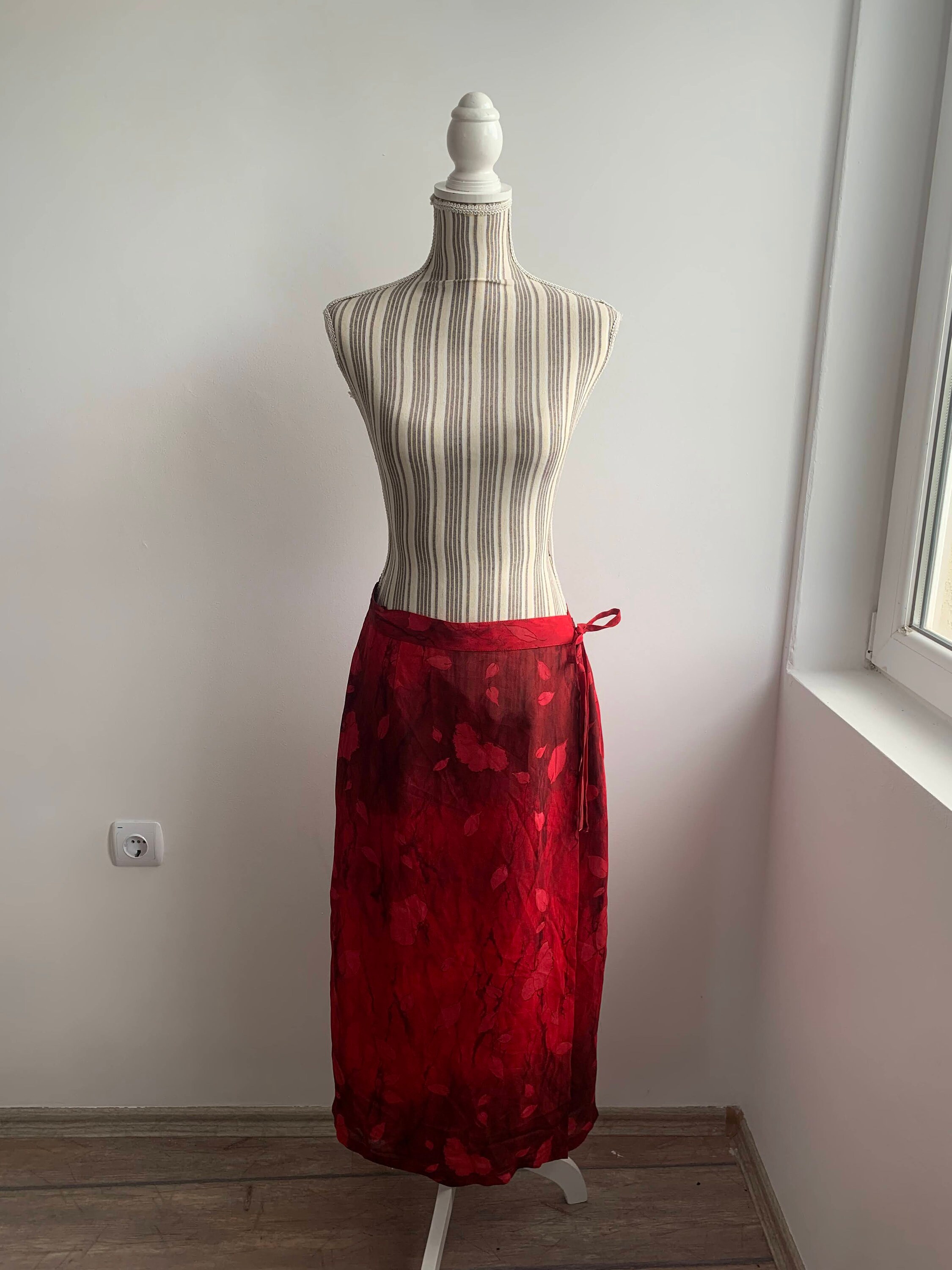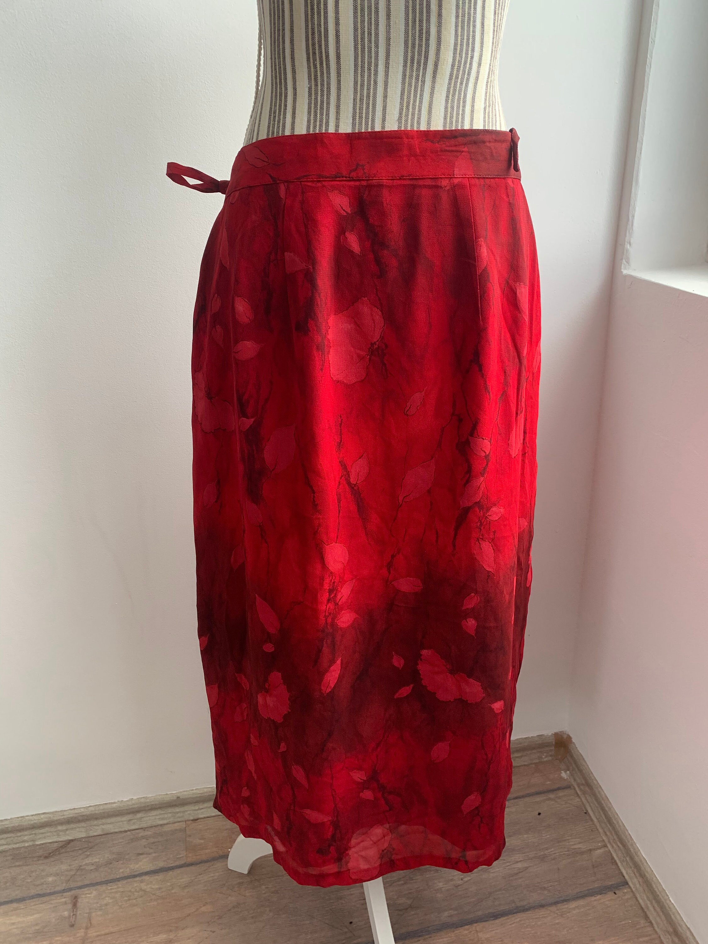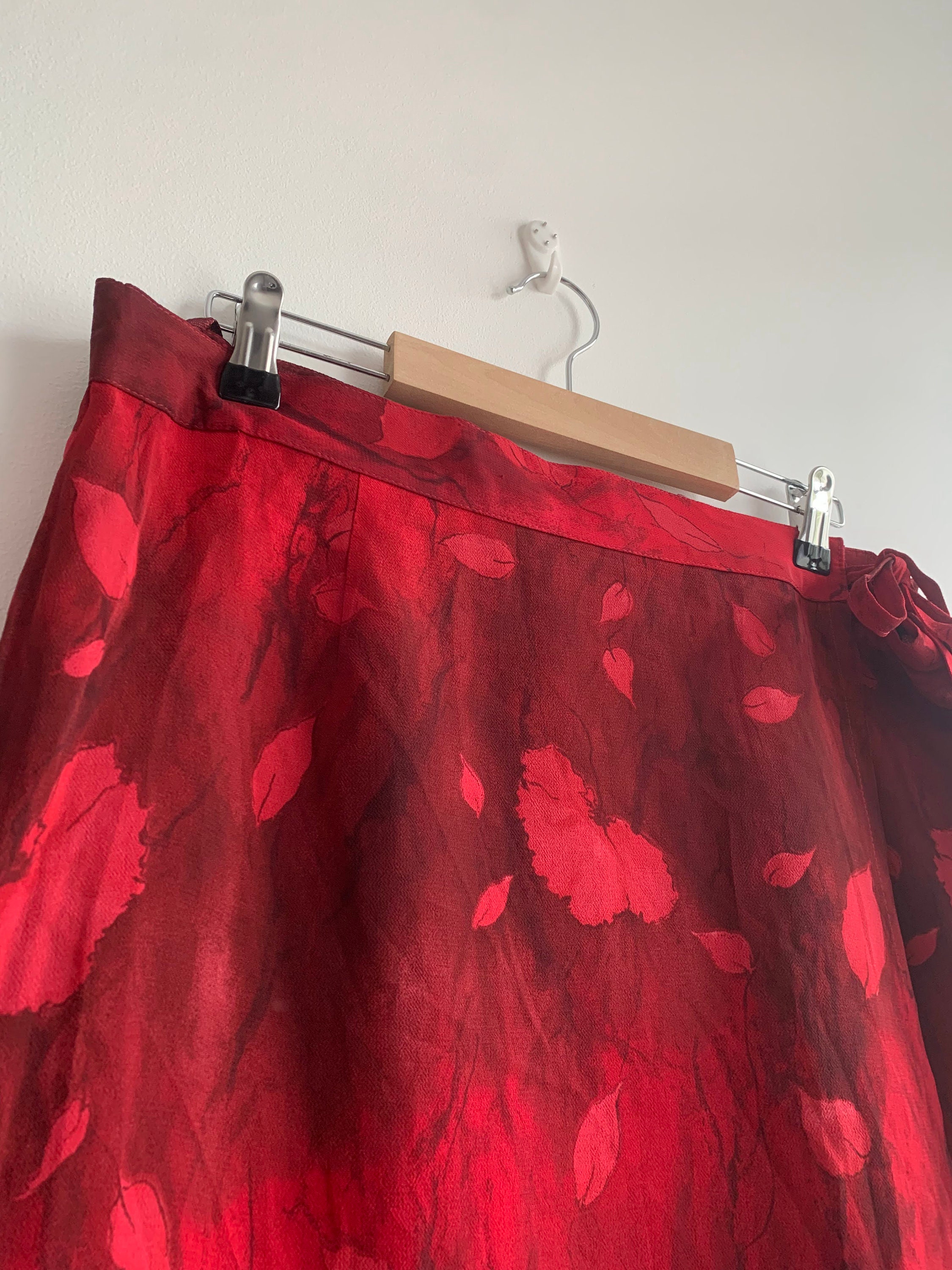 This is a vintage 90s red floral maxi skirt. This vintage maxi skirt was made has a straight silhouette and it wraps around your body with side tie up closure. This floral print skirt is made of 100% viscose fabric and acetate lining. The size marked on this 90s grunge skirt is D/ NL 44, GB 18, F 46, I 50 , which fits like size L/ XL. Please check the measurements below.