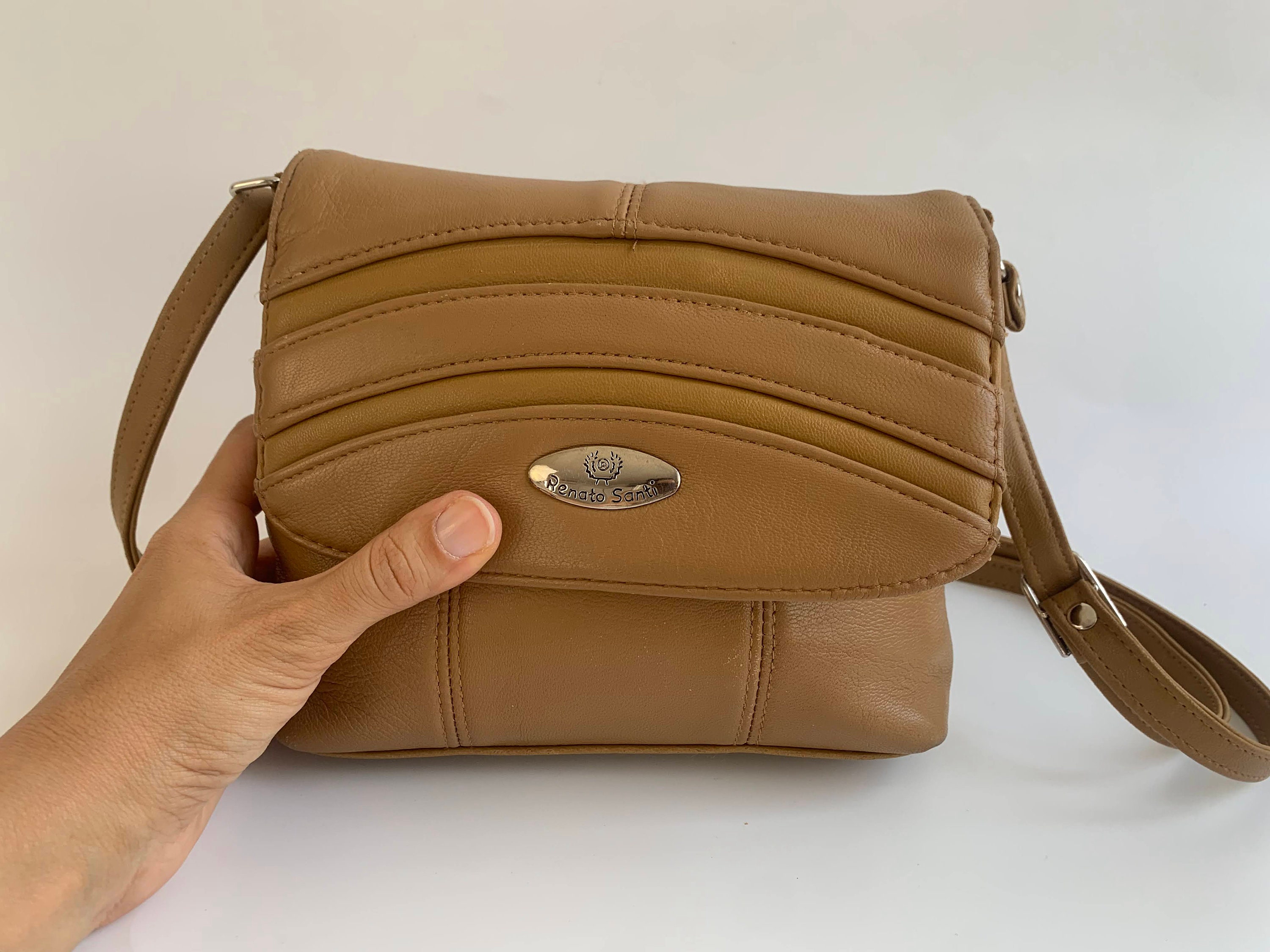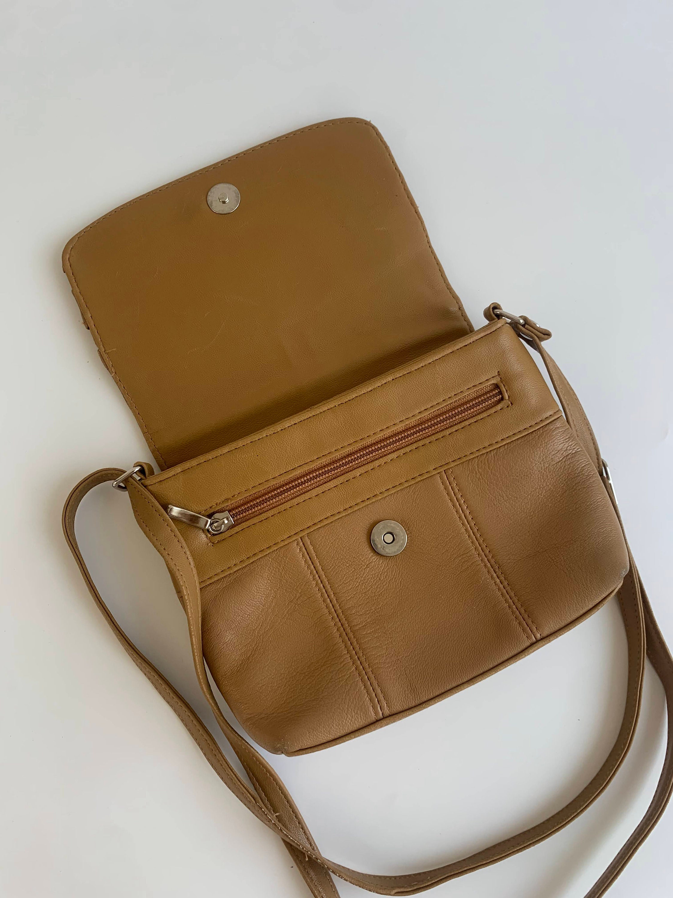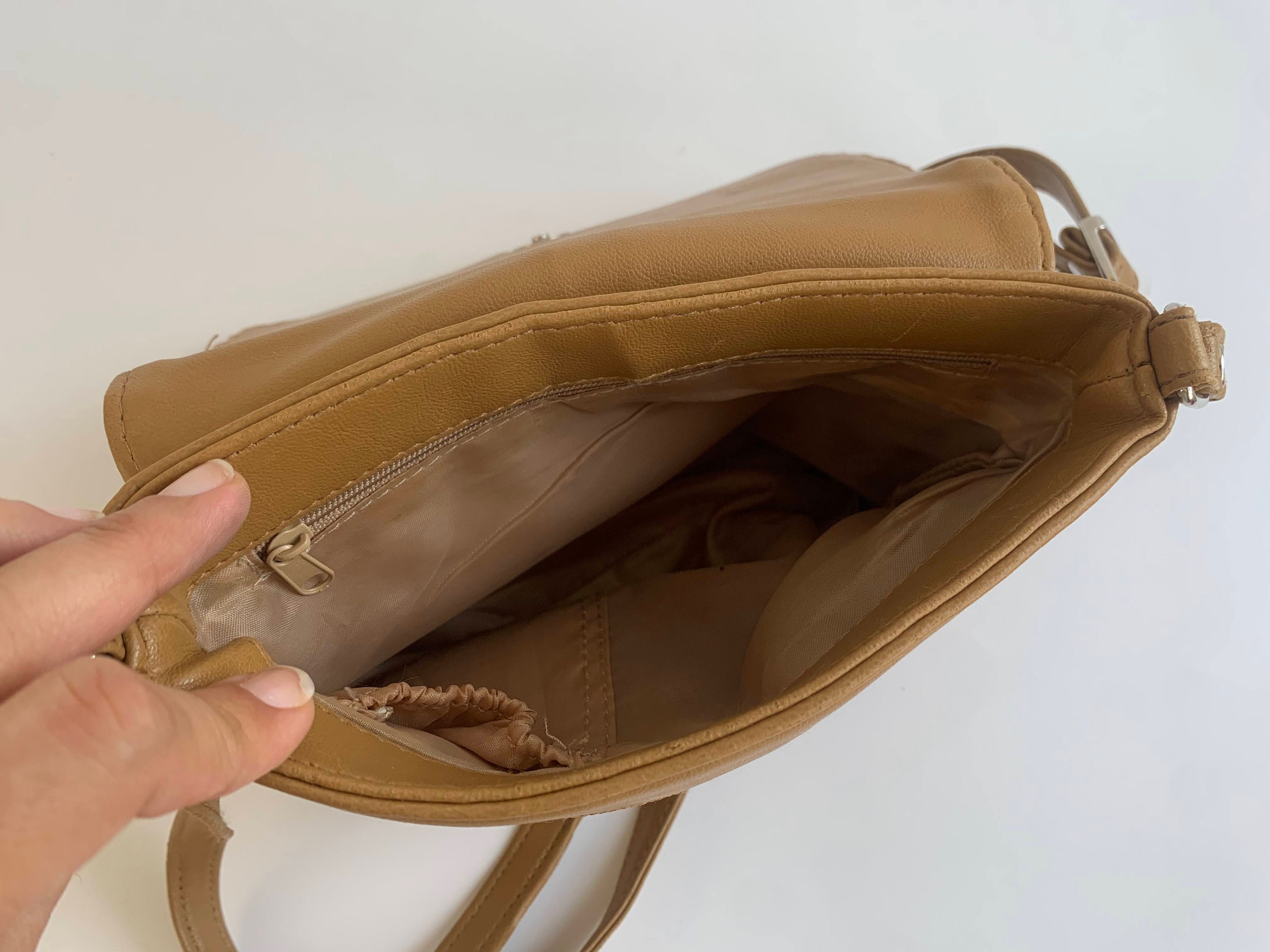 This is a classic vintage 90s small faux leather crossbody shoulder purse with adjustable shoulder strap and flap over magnetic closure. This minimalist vinyl purse is made of super soft faux leather in toffee brown color. This basic crossbody purse has a long adjustable strap which allows you to wear this purse as an underarm or top handle purse or as a shoulder or crossbody bag. This vegan leather messenger bag has synthetic lining. It has one compartment, one zipper pocket and one slip pocket inside.