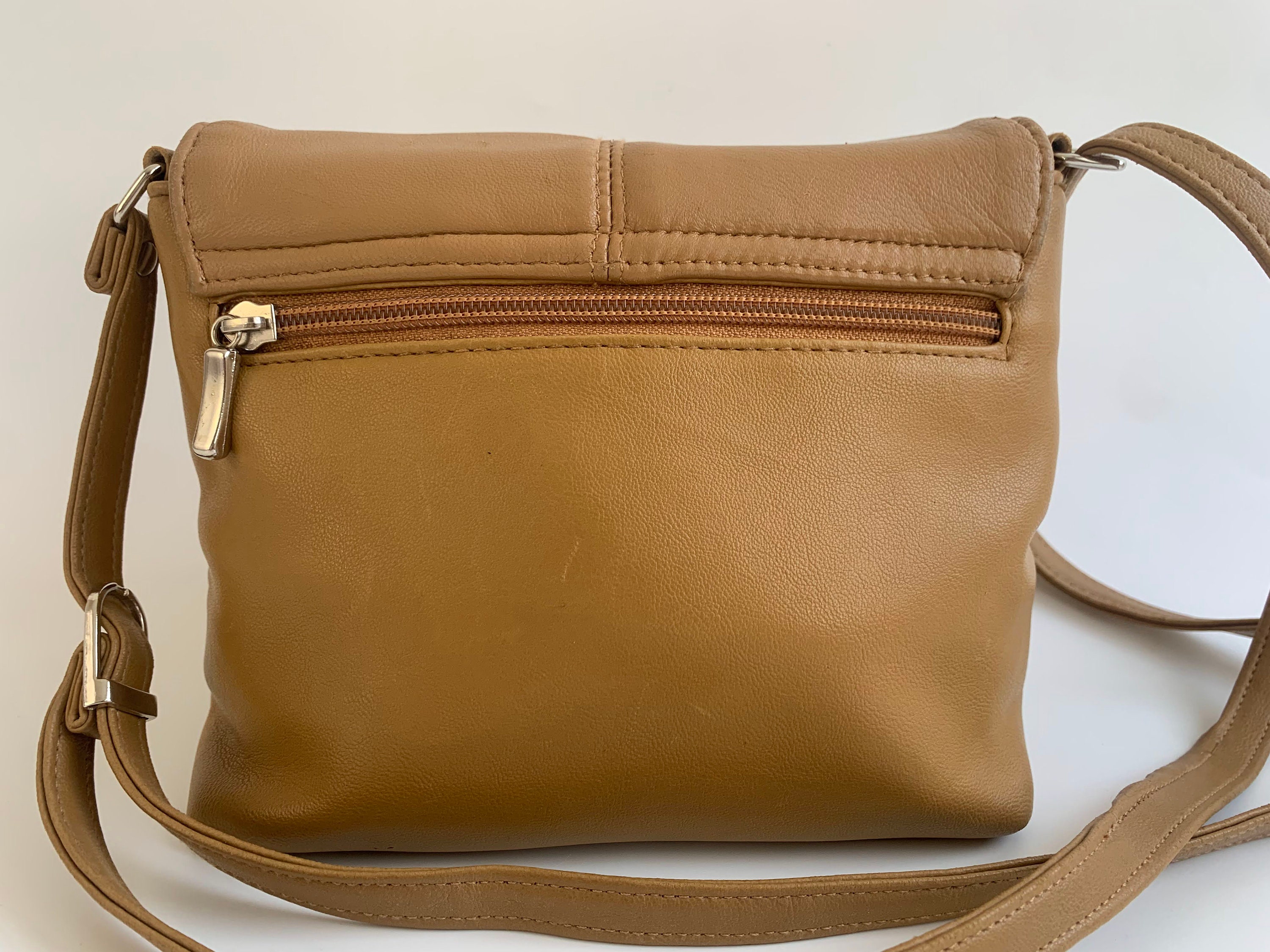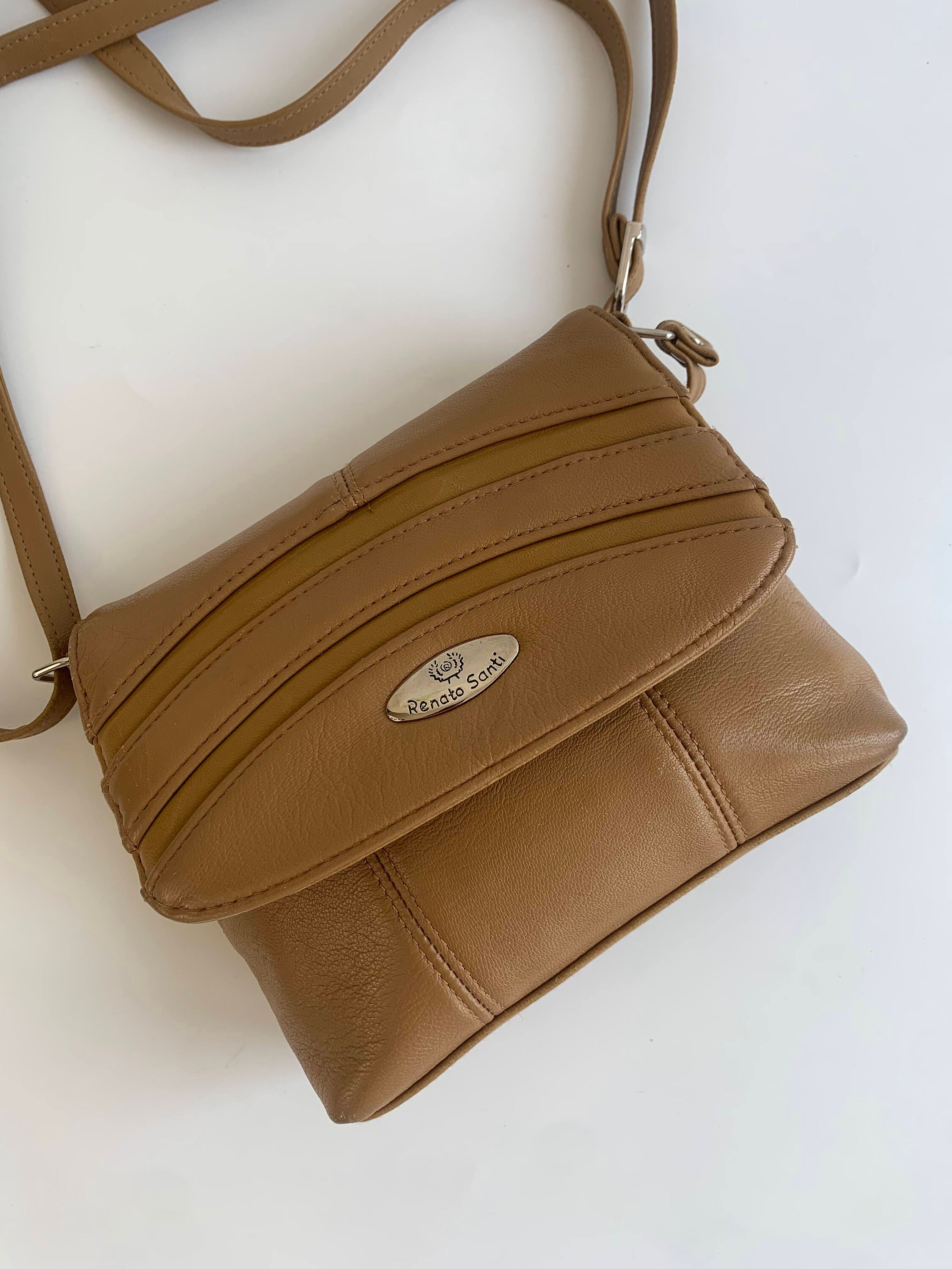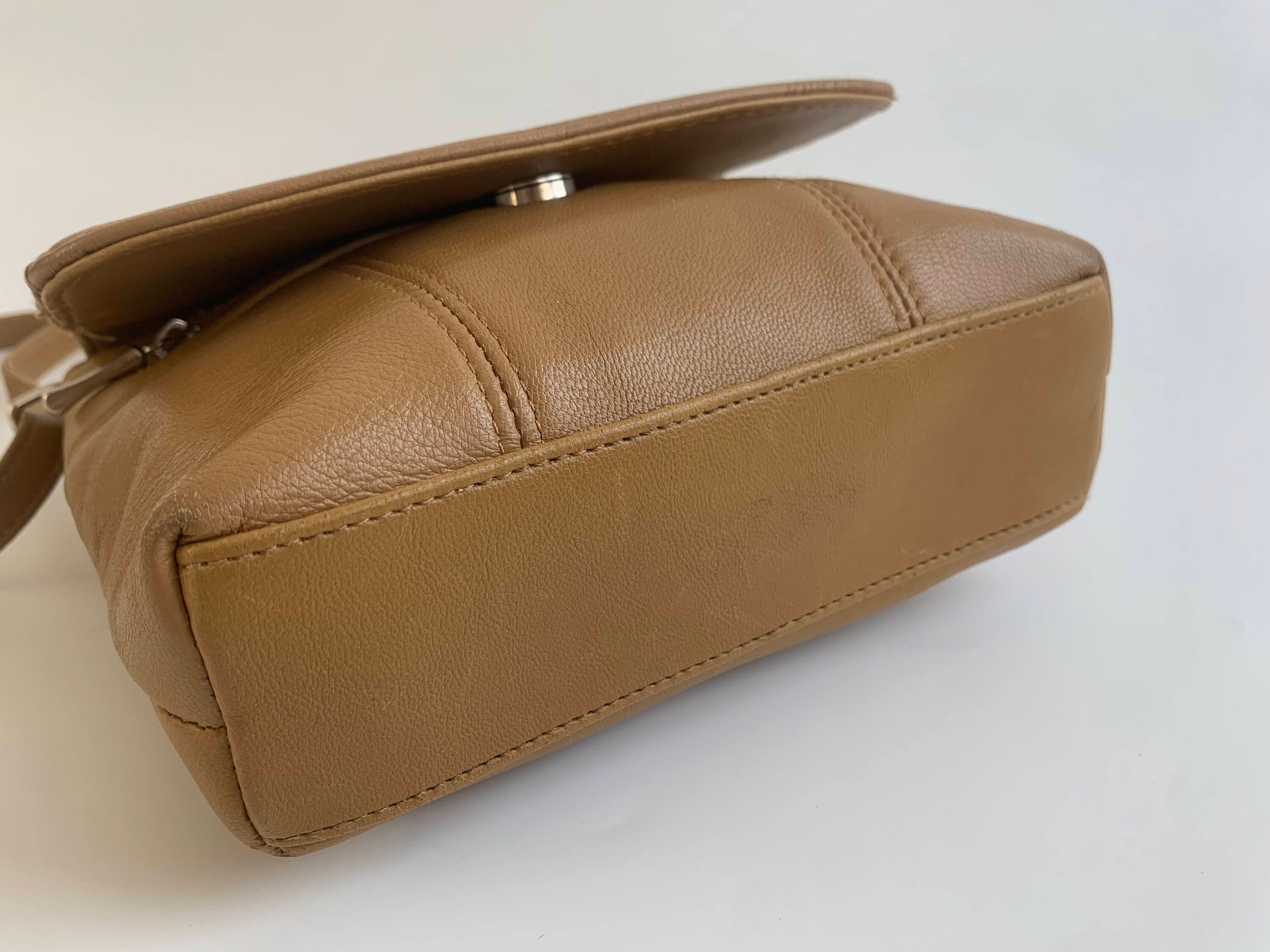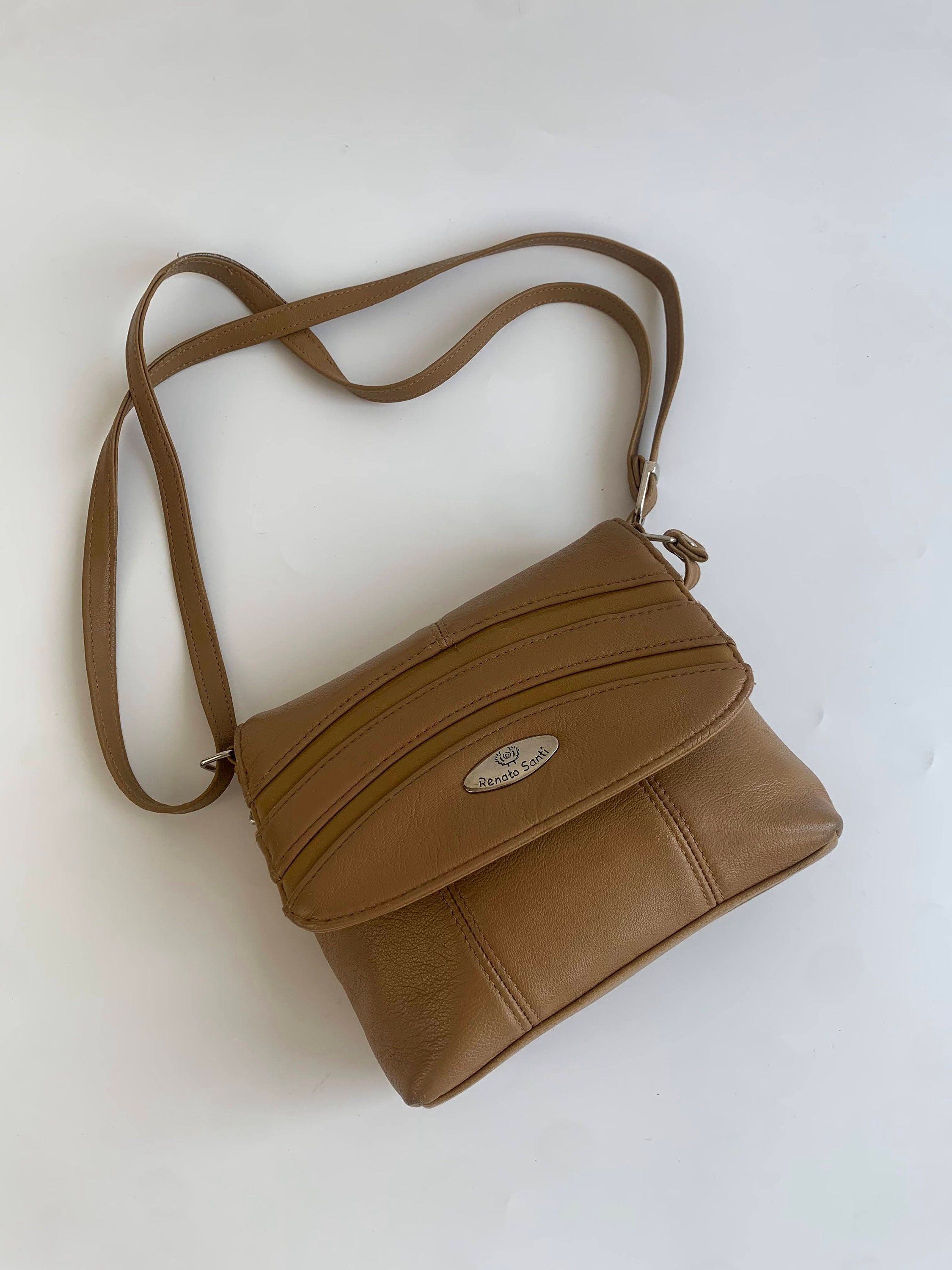 This is a classic vintage 90s small faux leather crossbody shoulder purse with adjustable shoulder strap and flap over magnetic closure. This minimalist vinyl purse is made of super soft faux leather in toffee brown color. This basic crossbody purse has a long adjustable strap which allows you to wear this purse as an underarm or top handle purse or as a shoulder or crossbody bag. This vegan leather messenger bag has synthetic lining. It has one compartment, one zipper pocket and one slip pocket inside.