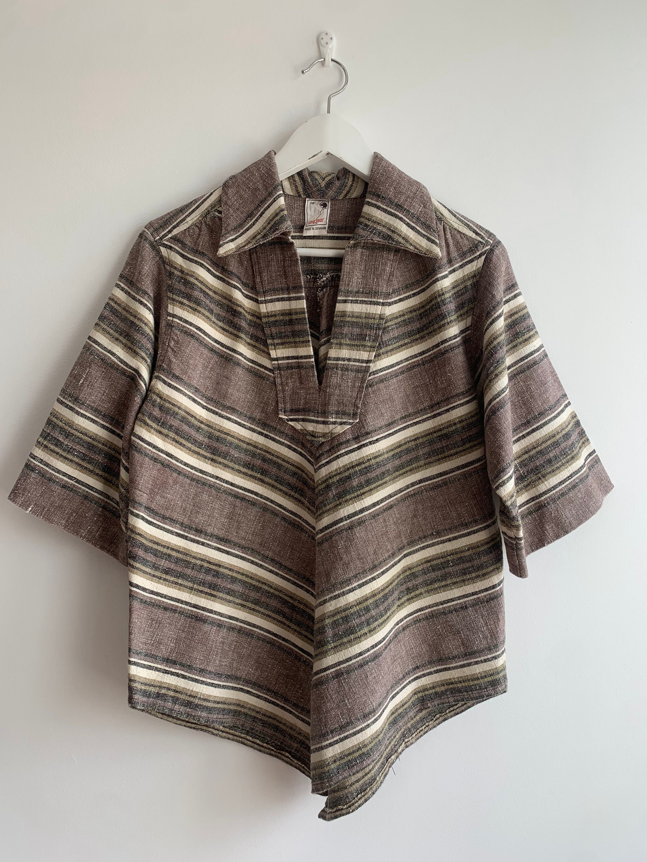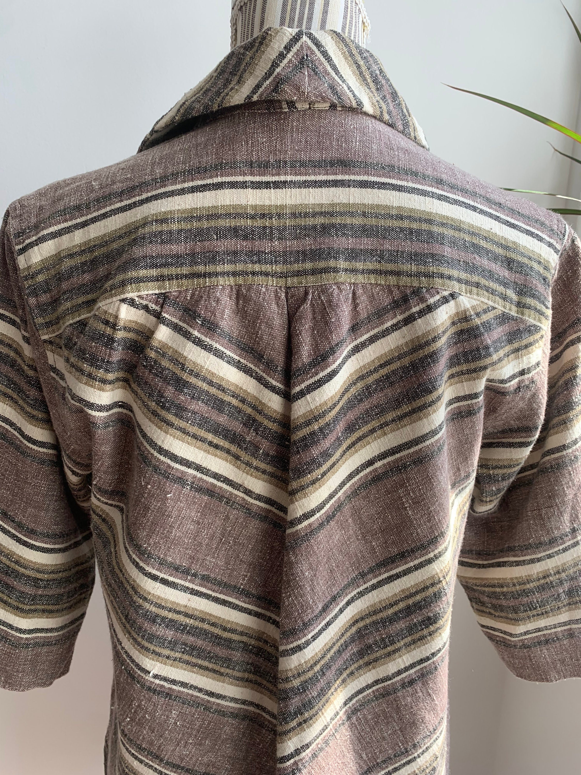 This is a vintage loose fit v neck collared linen shirt for women in taupe color with beige stripes. This linen tunic top has relaxed fit silhouette and half sleeves. The fabric is heavy natural fabric which feels like linen cotton blend, could be hemp too. There is no label to state the materials used. The size marked is 38, which fits like size S/M. Please check the measurements below.
