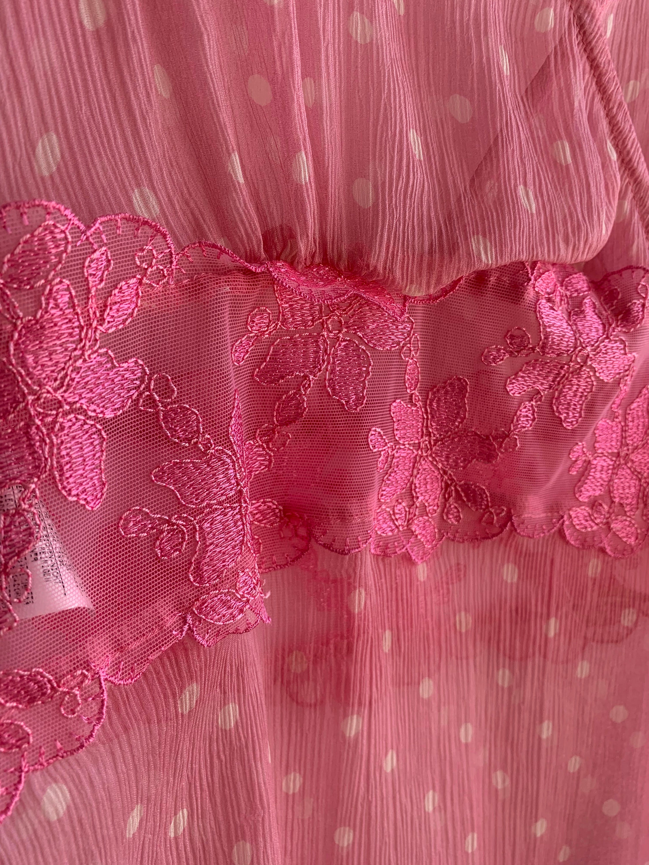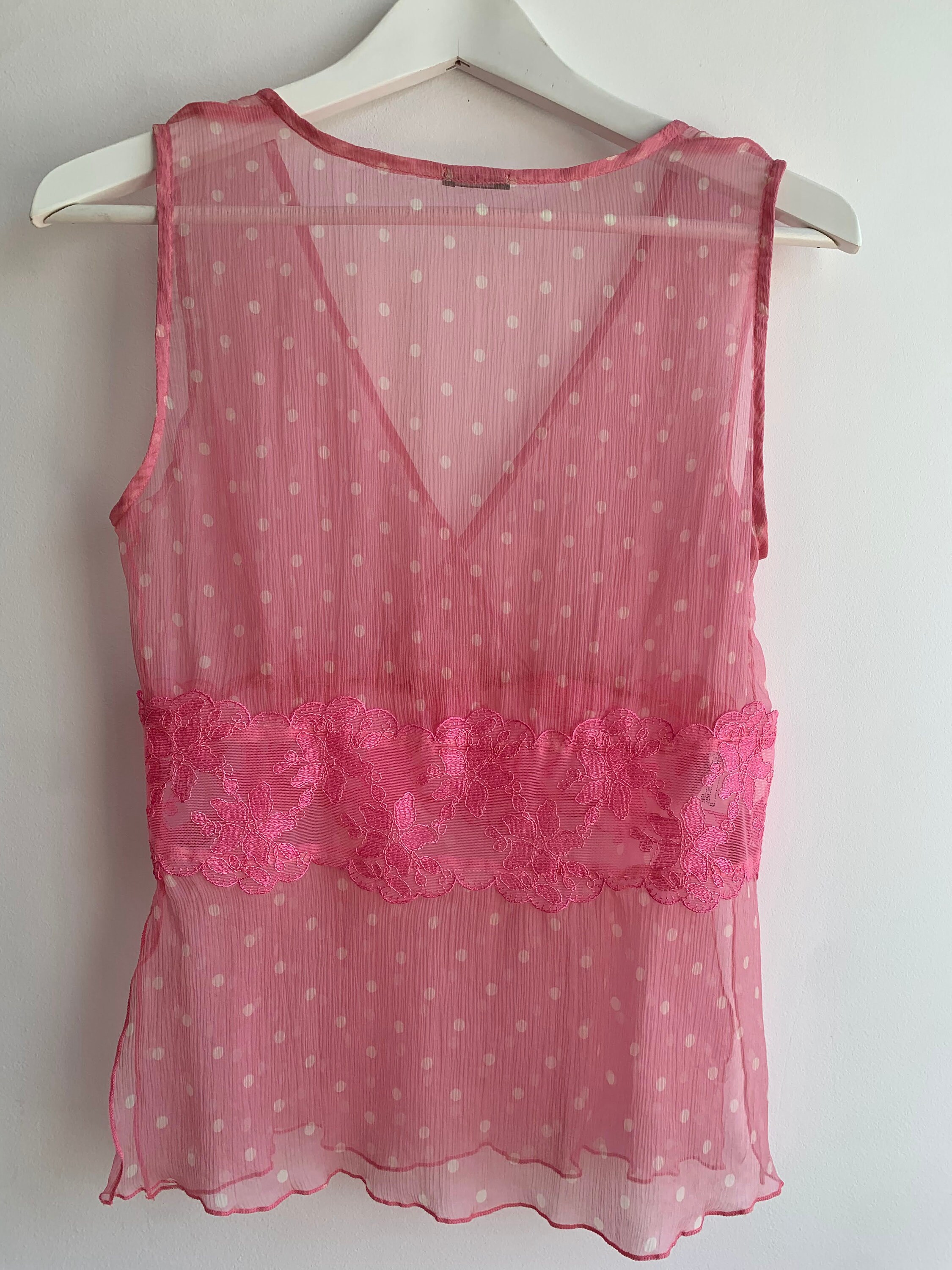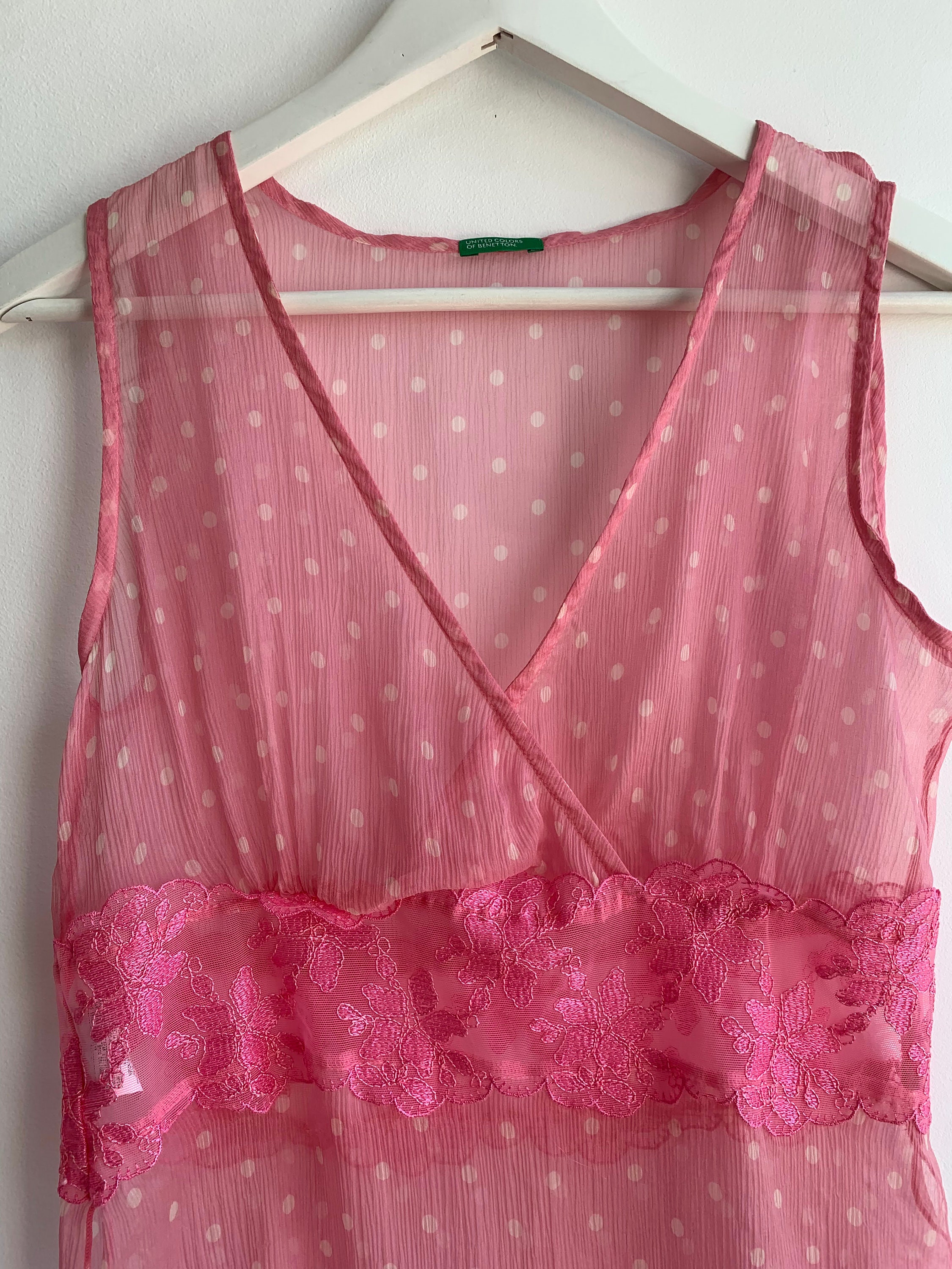 This is a vintage pure silk sheer mesh tank top in romantic pink color with white polka dots and lace decoration. This silk cami top is by the brand Benetton. It is made of 100% silk fabric which is super delicate and sheer. The size marked is S. Please check the measurements below