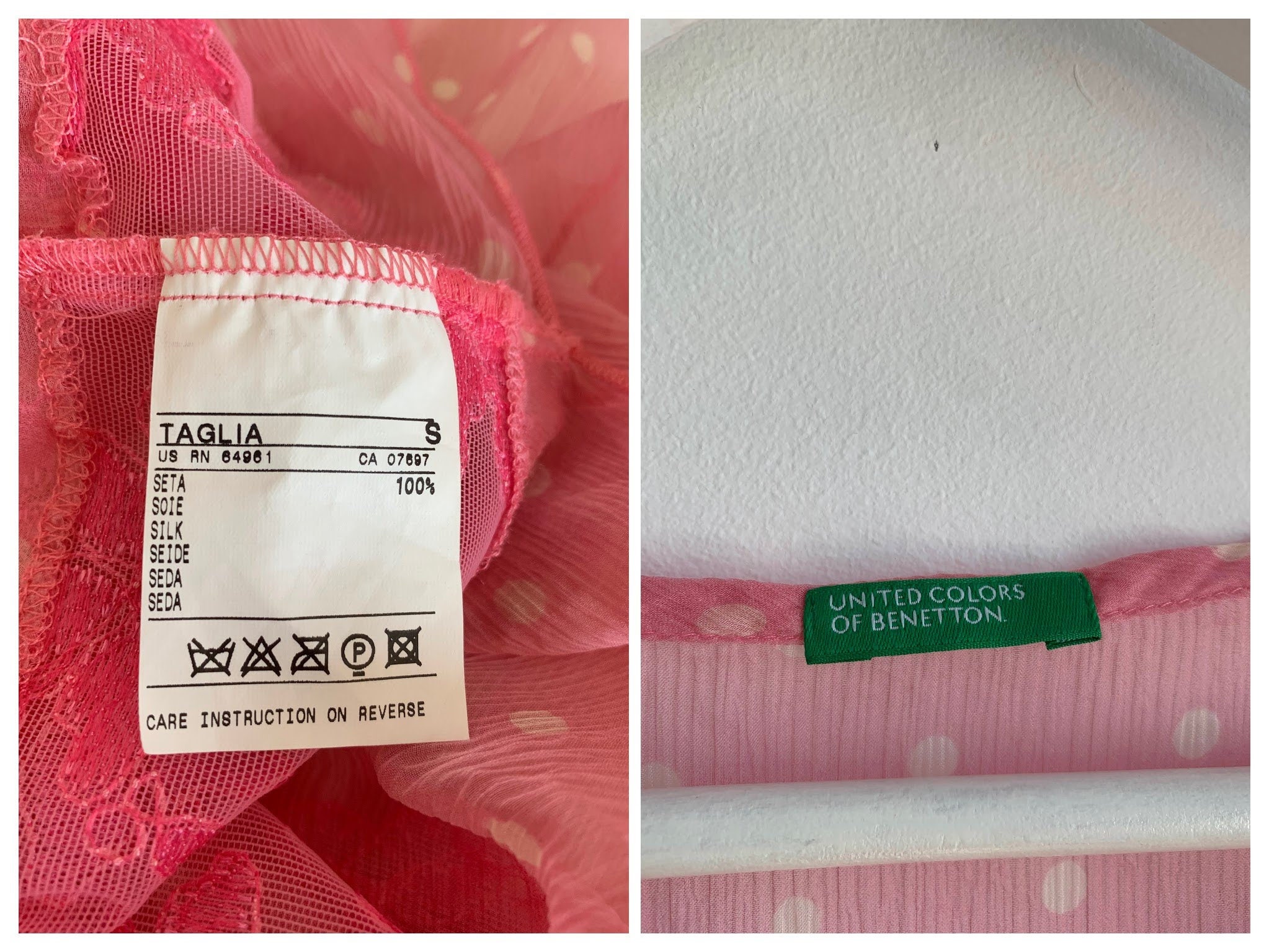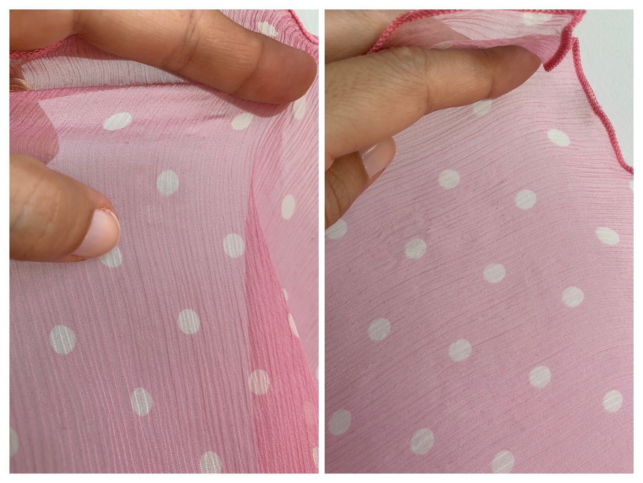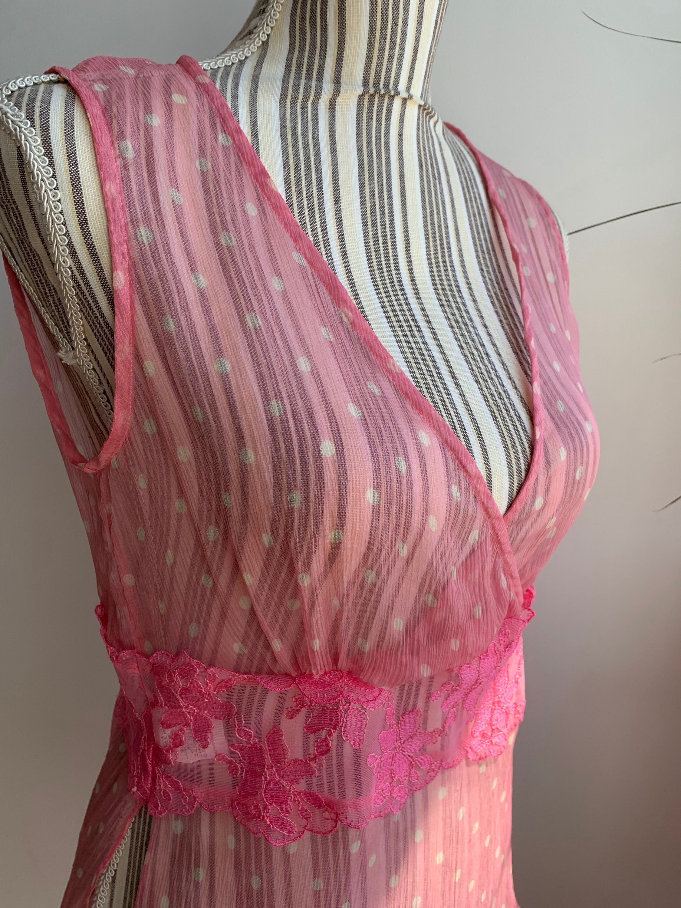 This is a vintage pure silk sheer mesh tank top in romantic pink color with white polka dots and lace decoration. This silk cami top is by the brand Benetton. It is made of 100% silk fabric which is super delicate and sheer. The size marked is S. Please check the measurements below