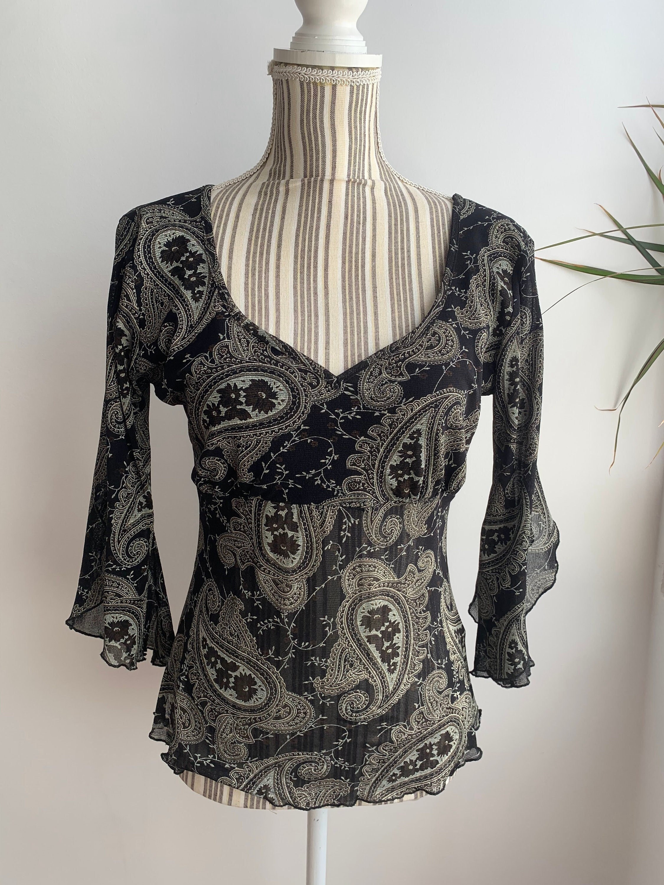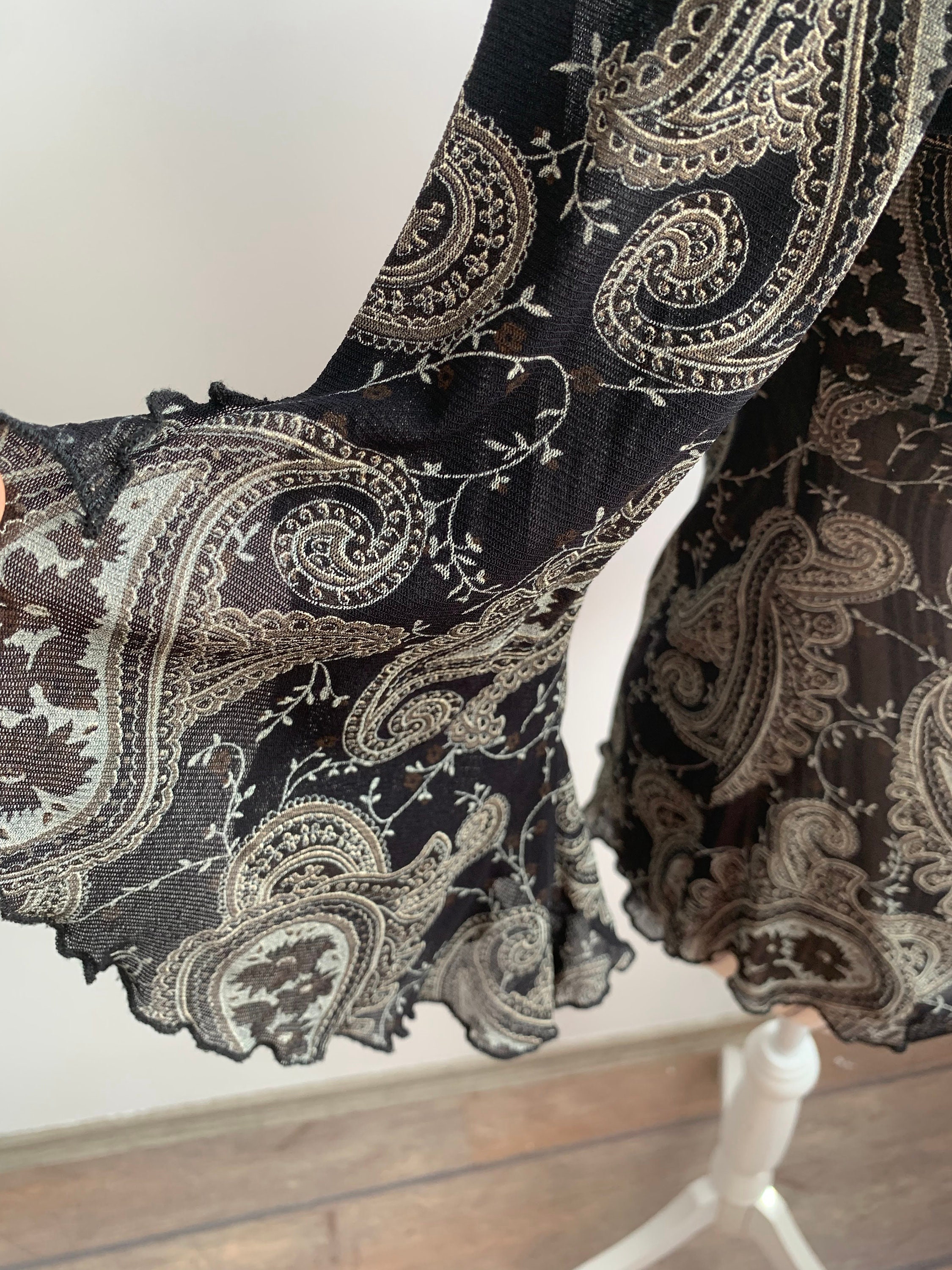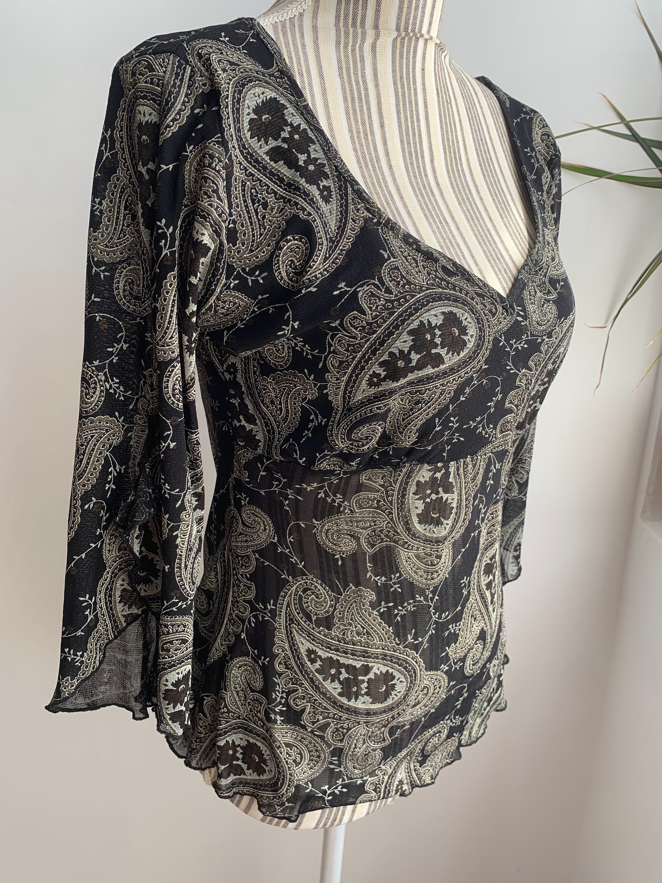 This is a lovely vintage 90s black sheer top for women with beige floral paisley print. It is made of lightweight stretchy polyamide fabric which beautifully embraces your body. This mesh top can be worn as a beach cover up or as a sexy black shirt with a cami underneath. This see through top has half flare sleeves. This mesh lace top is size L. It has quite a bit of stretch. Please check the measurements below.