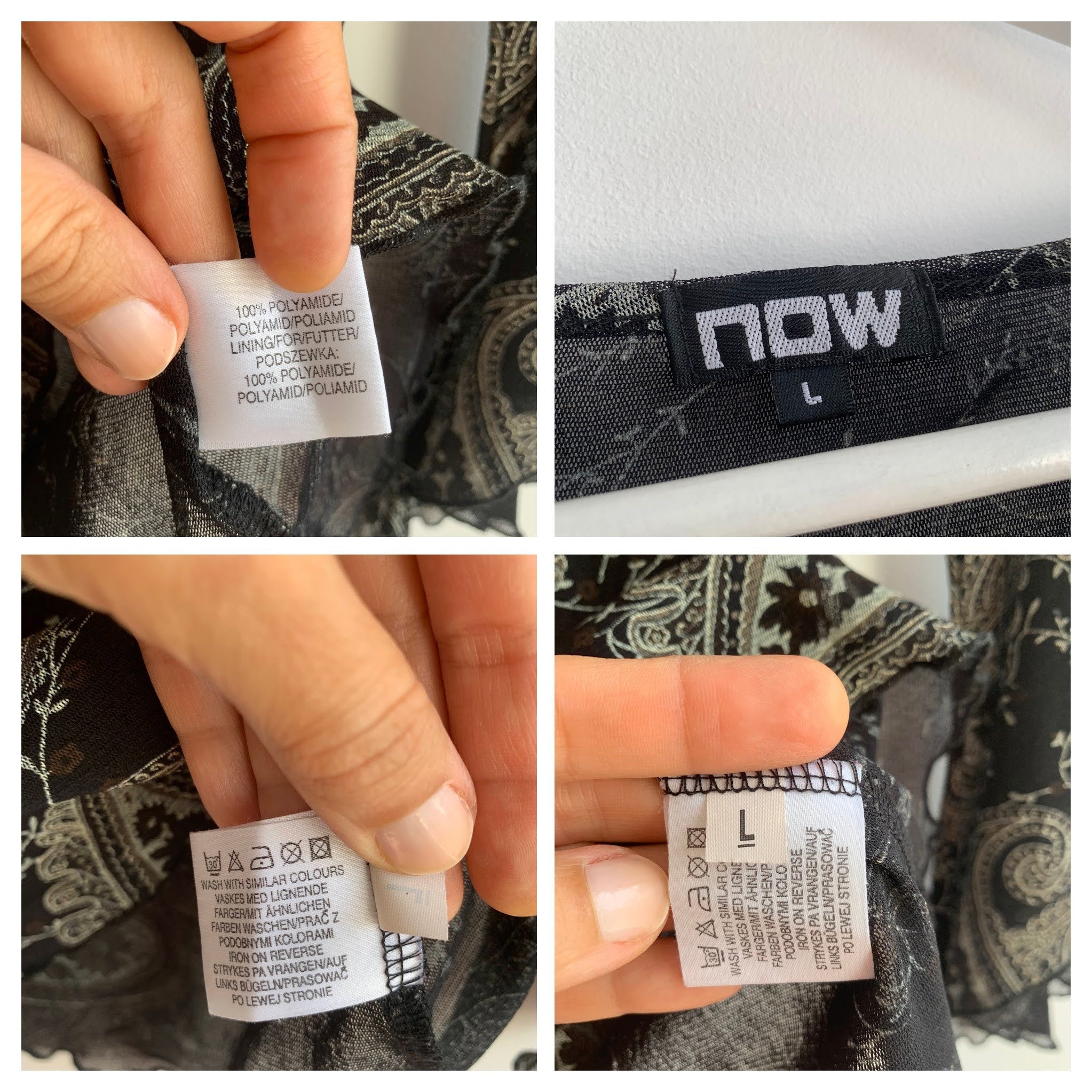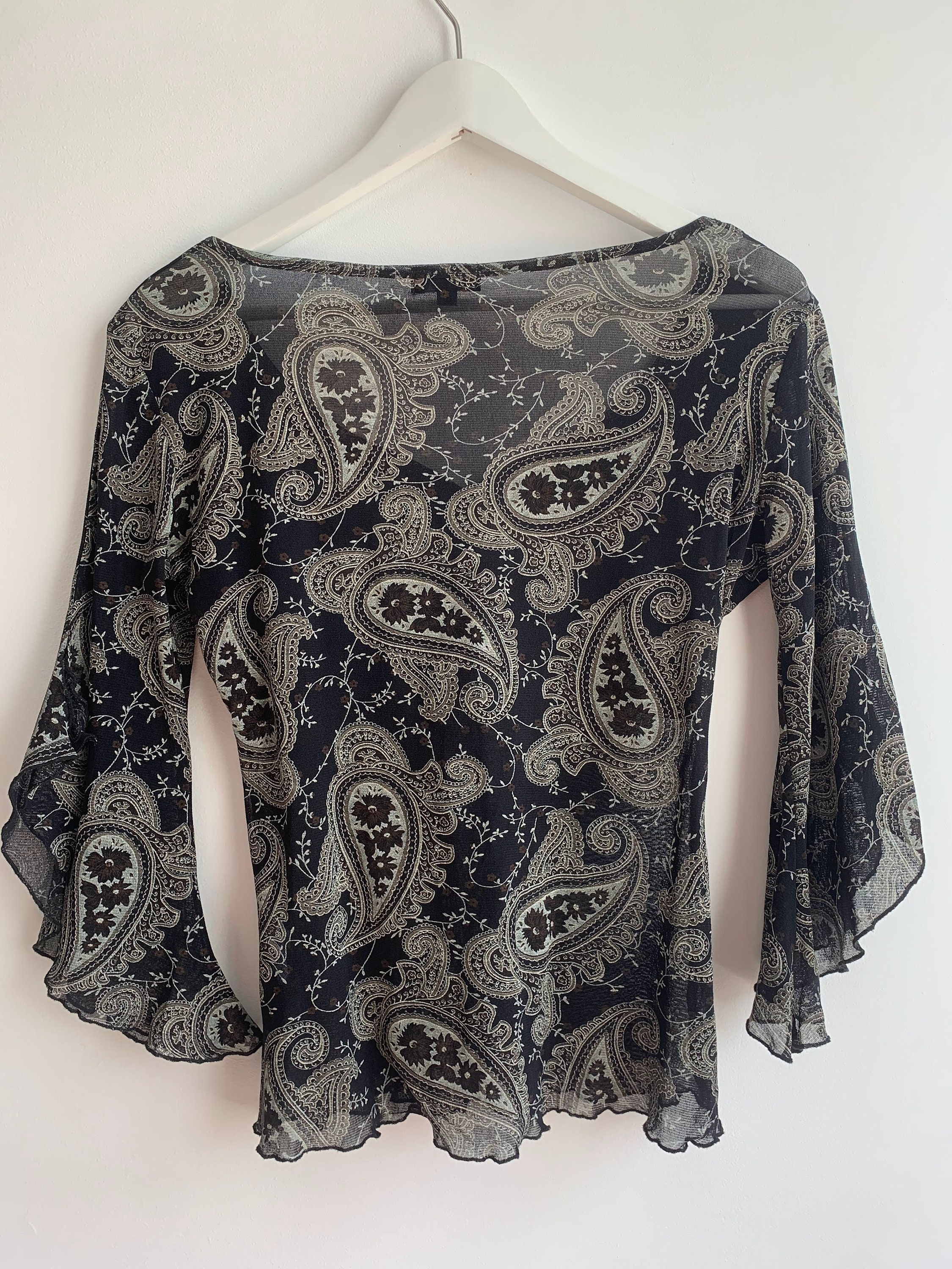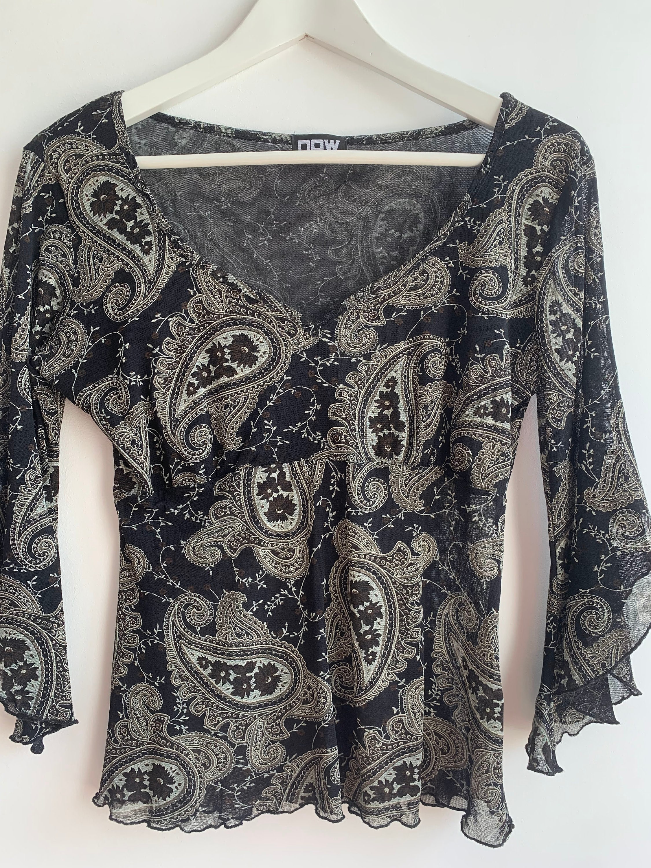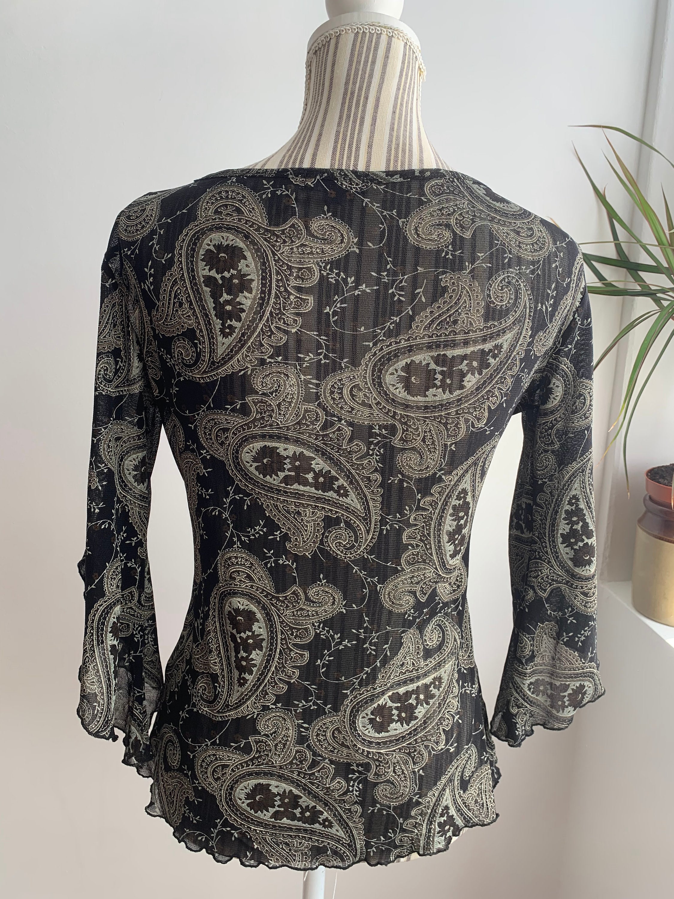 This is a lovely vintage 90s black sheer top for women with beige floral paisley print. It is made of lightweight stretchy polyamide fabric which beautifully embraces your body. This mesh top can be worn as a beach cover up or as a sexy black shirt with a cami underneath. This see through top has half flare sleeves. This mesh lace top is size L. It has quite a bit of stretch. Please check the measurements below.