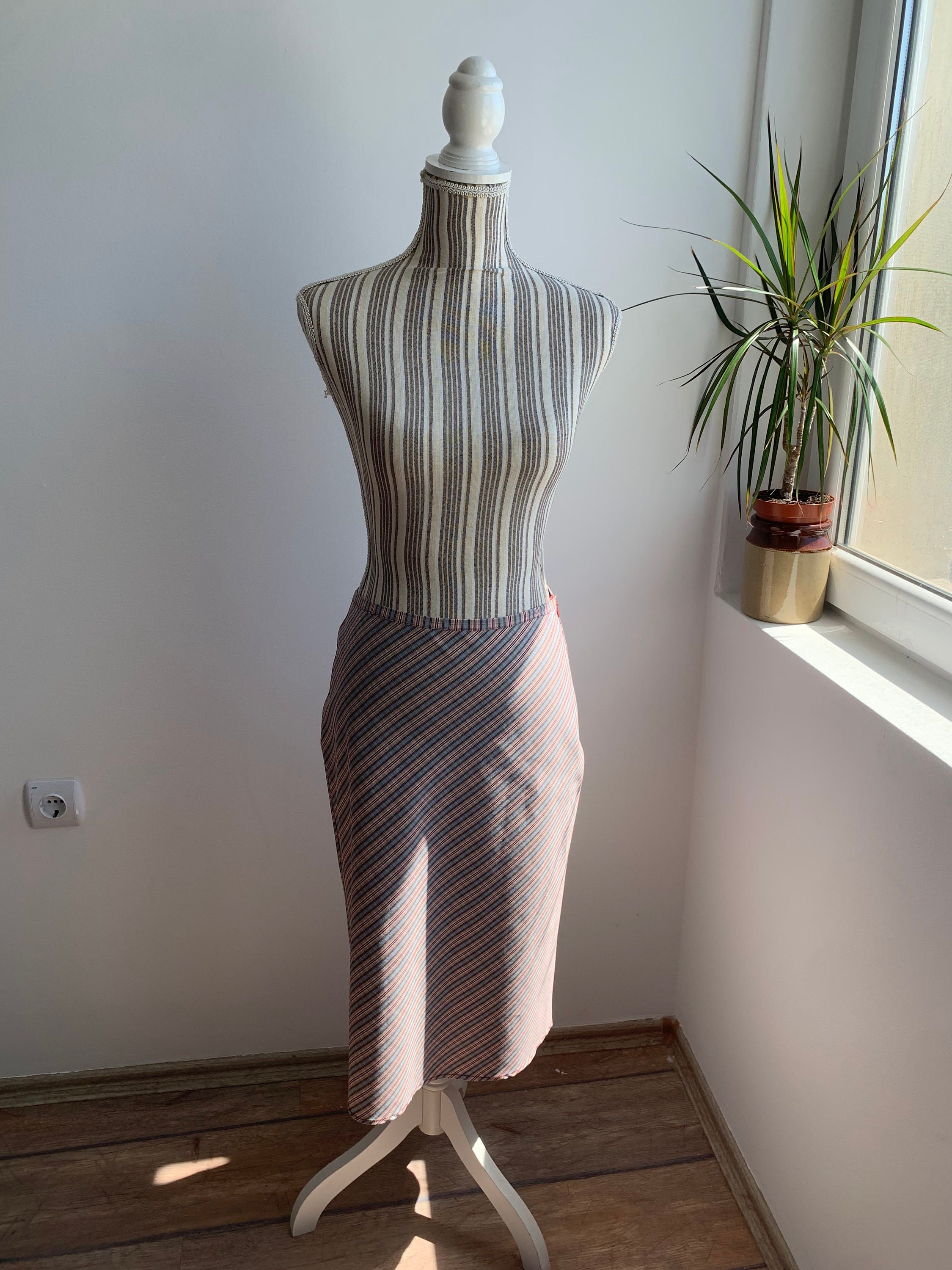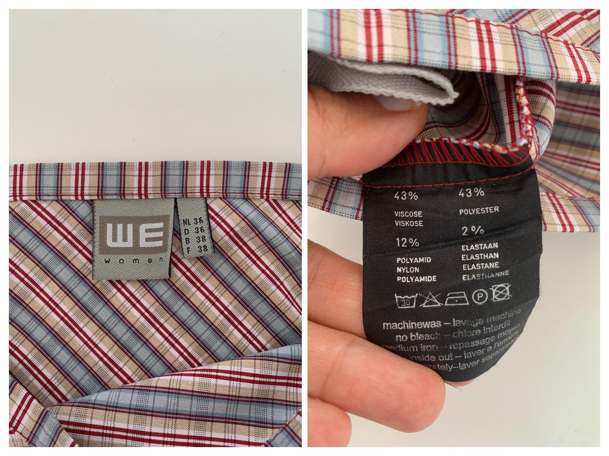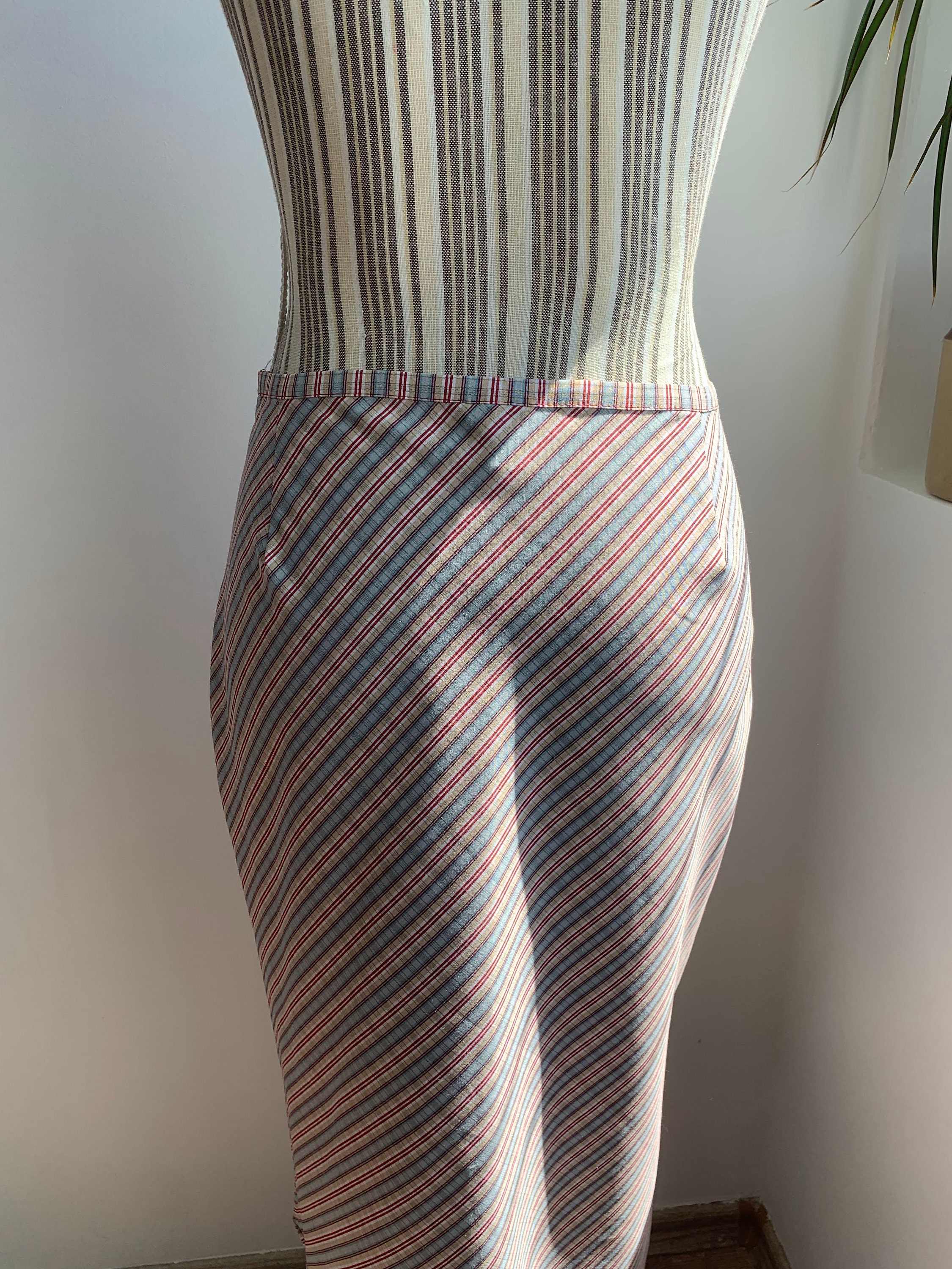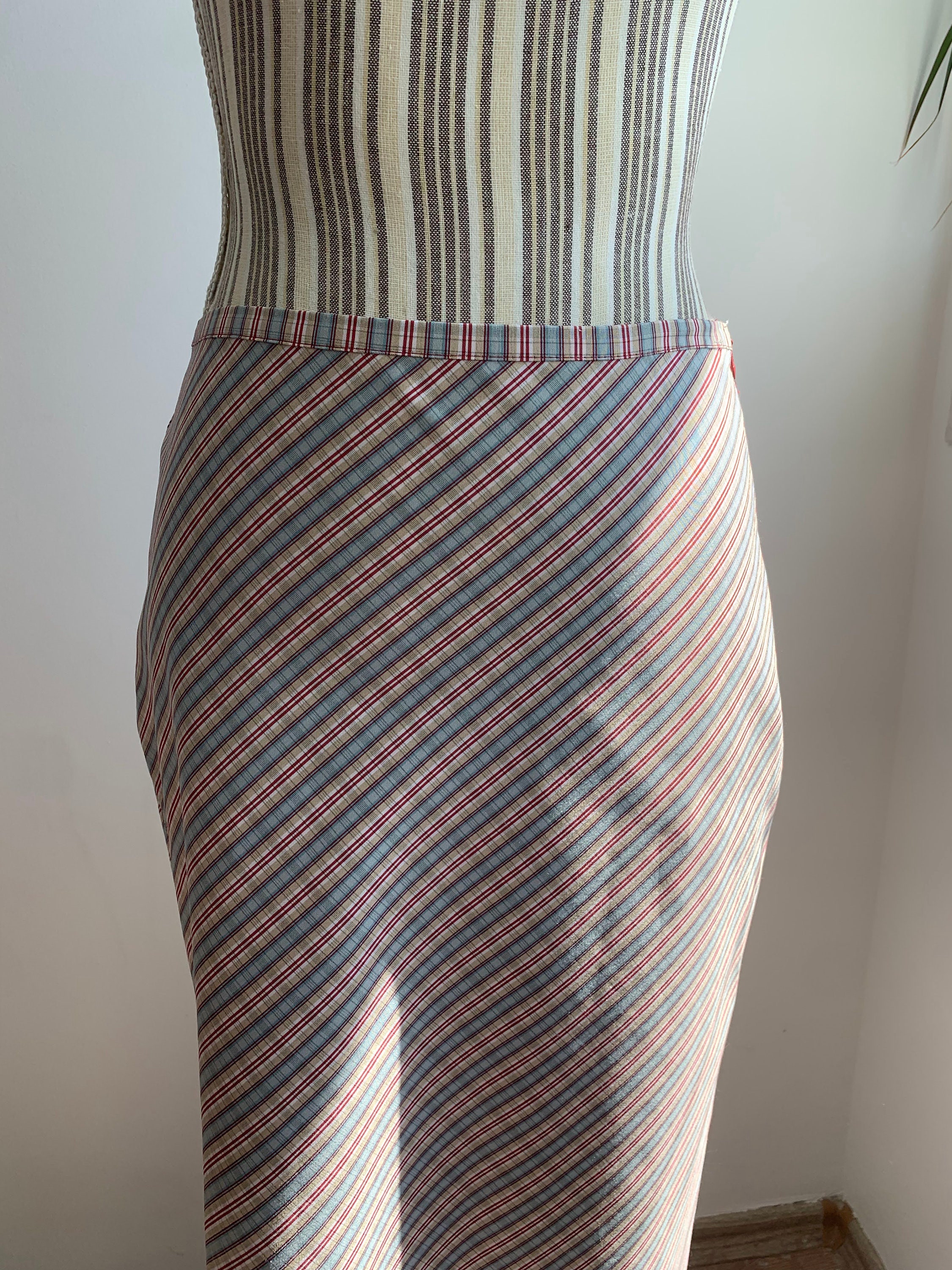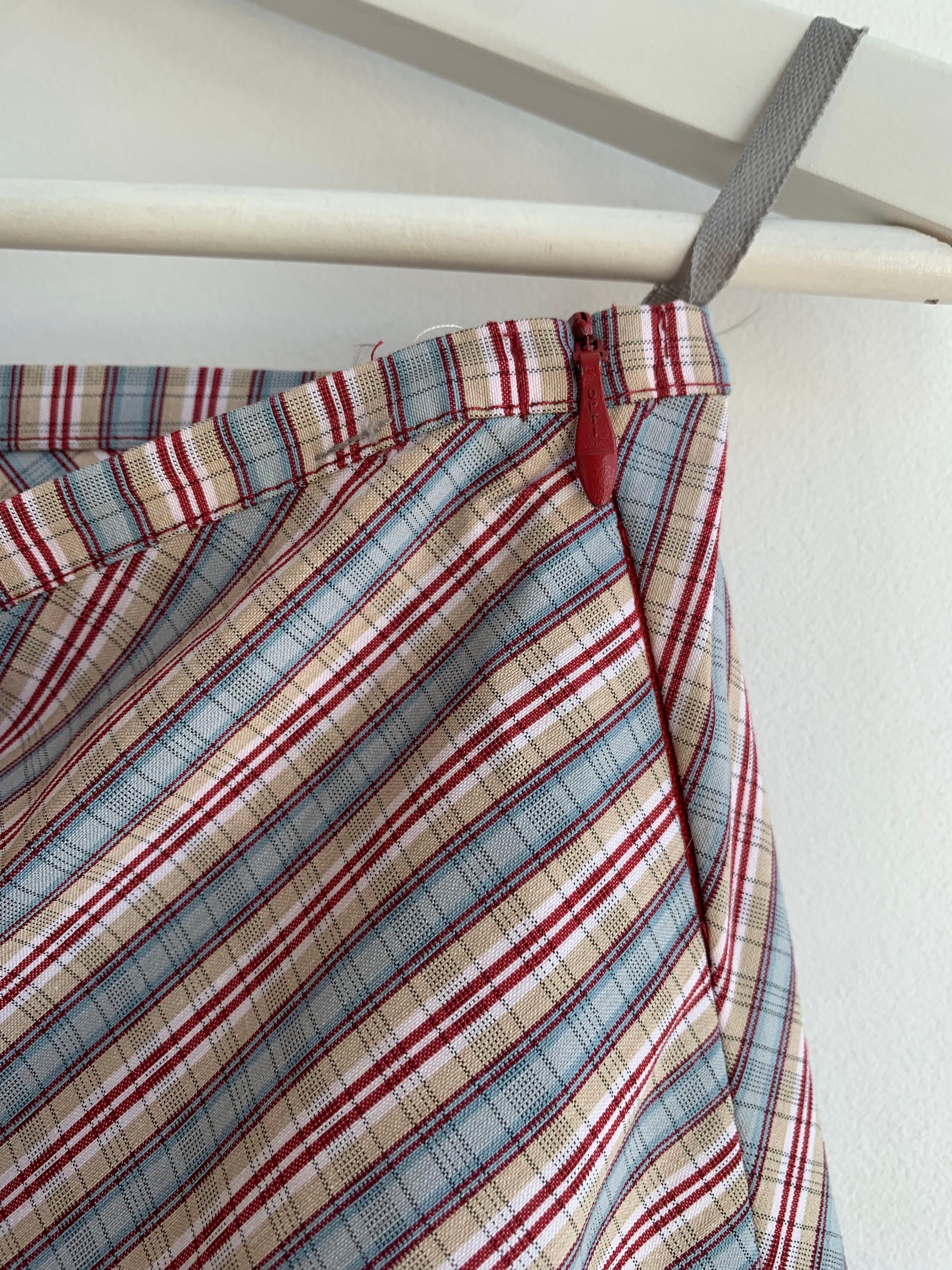 This is a vintage checkered midi skirt made of stretchy fabric with diagonal checkered print in light blue, beige, white and burgundy red. The size marked is 36, which fits like S. Please check the measurements below.