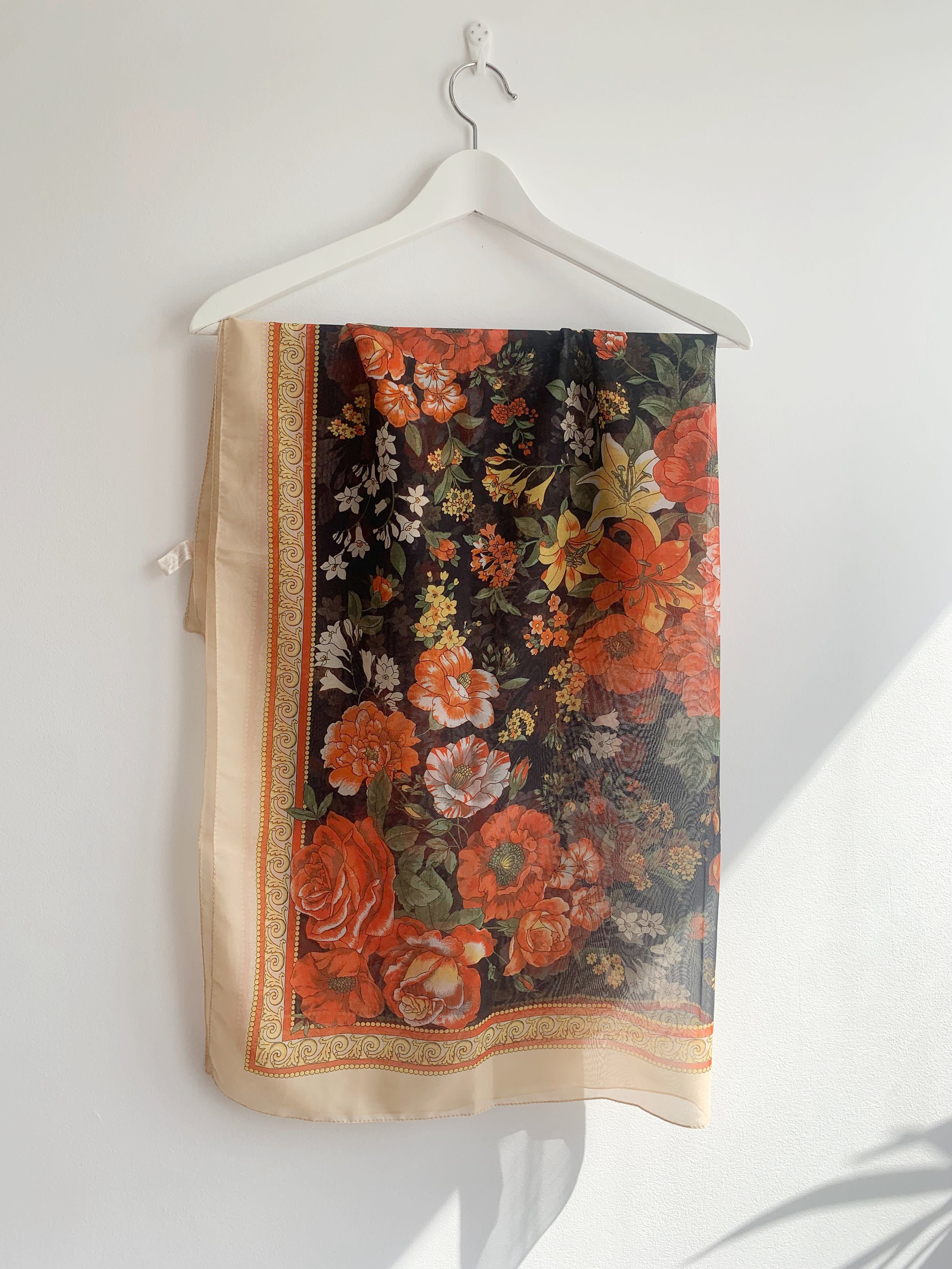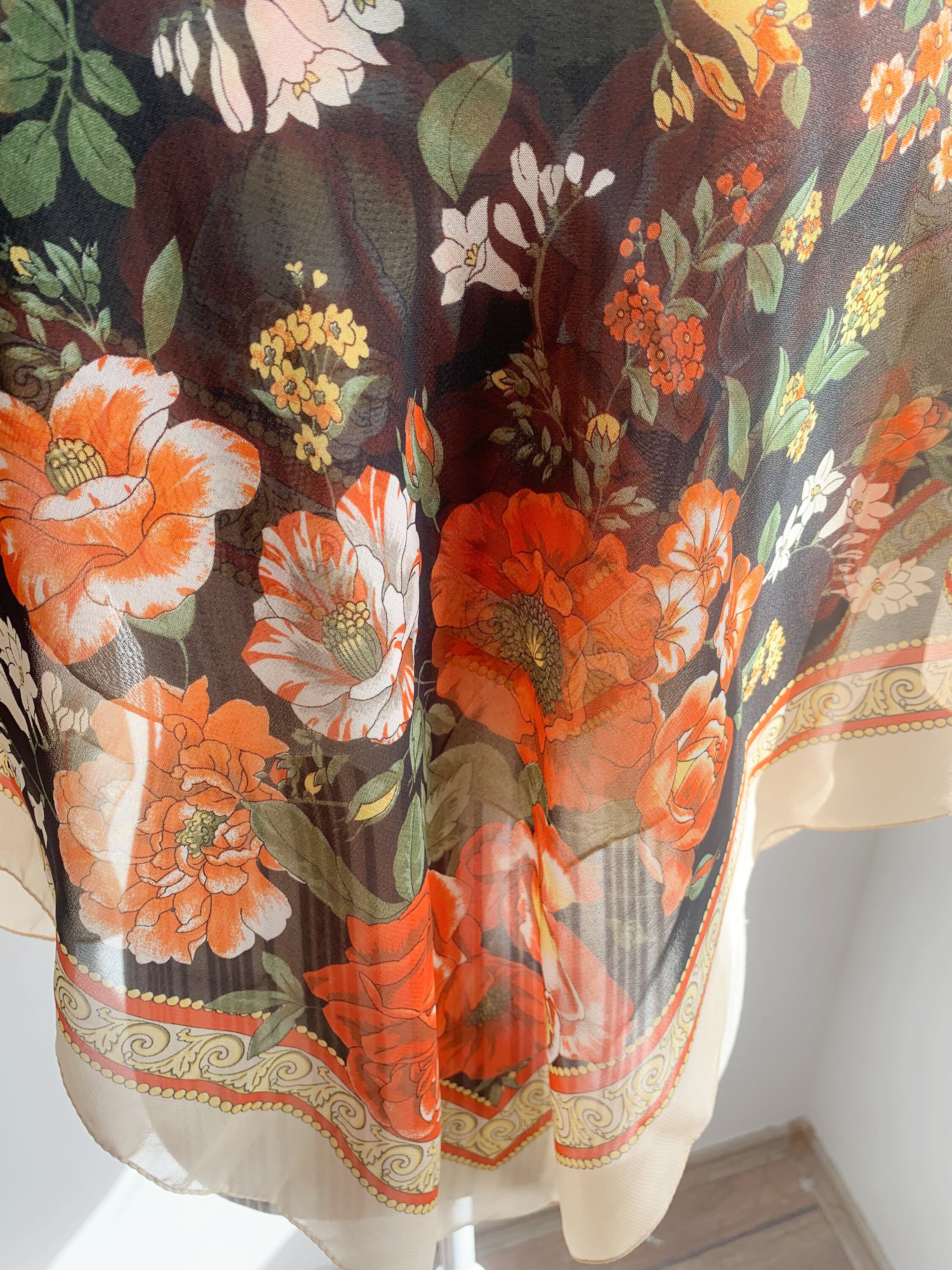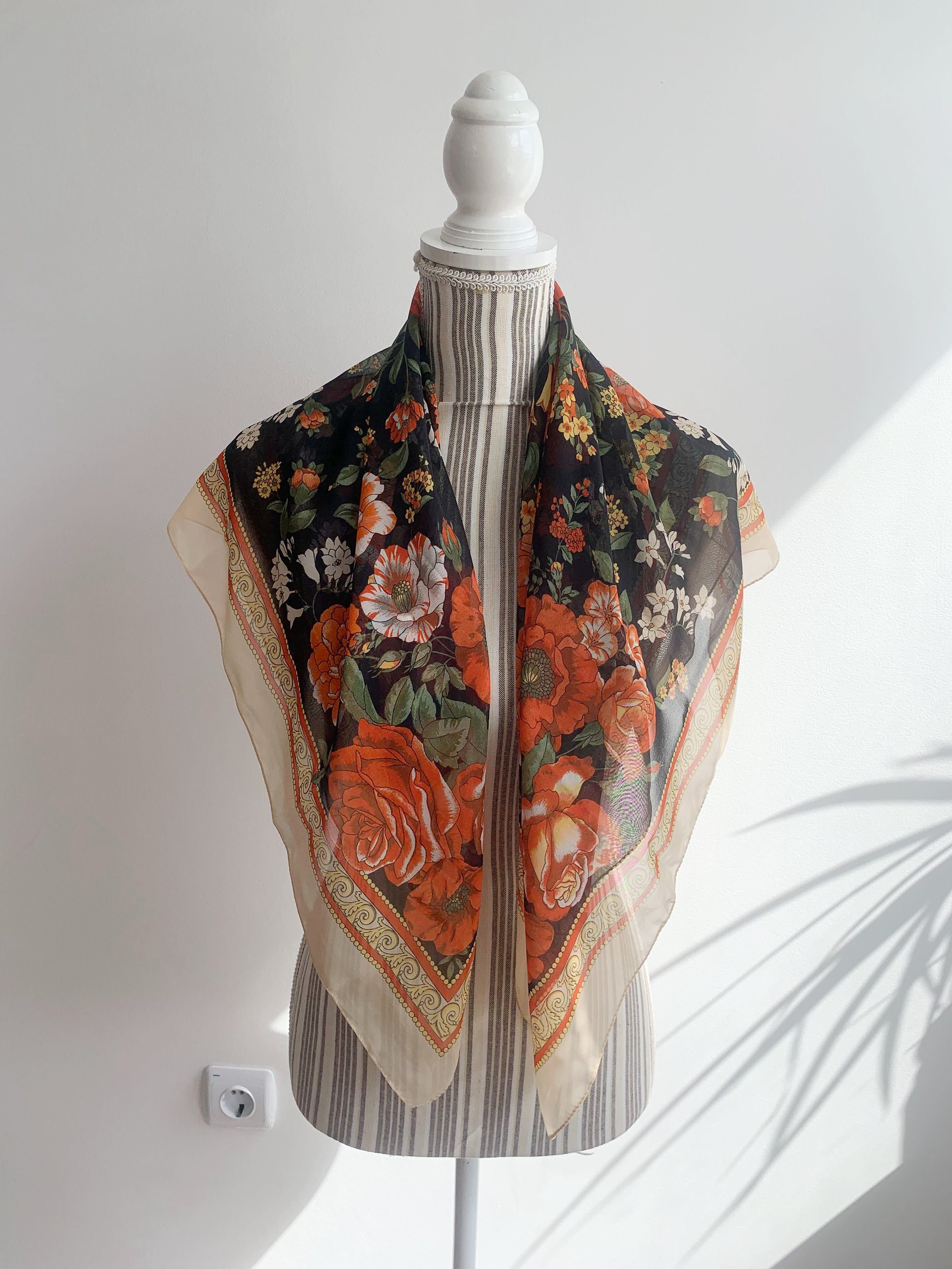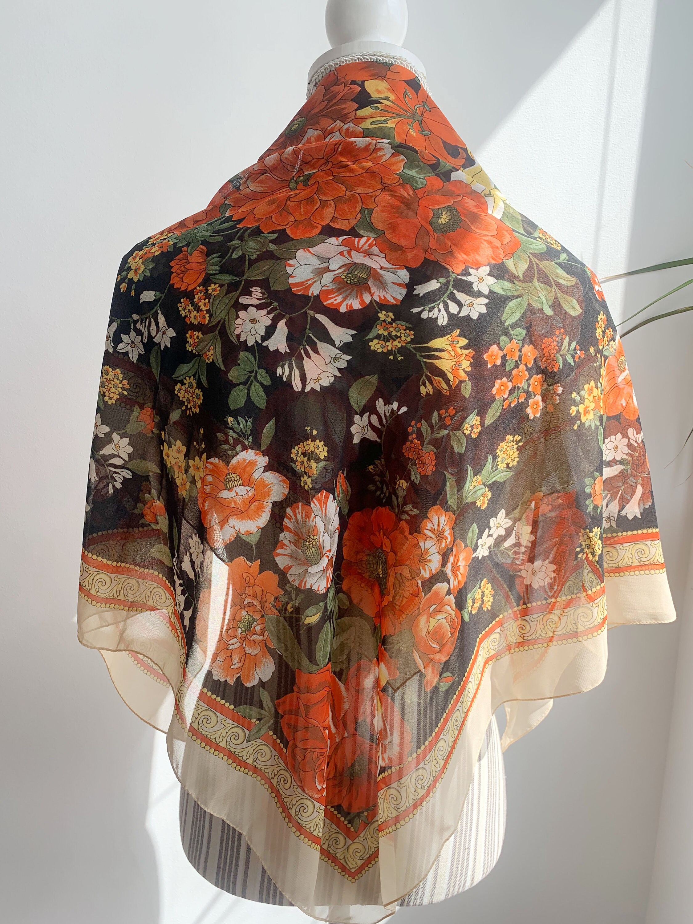 This is a vintage 80s Italian square neck scarf with gorgeous floral print in shades of orange, beige and green. This Babushka style scarf is super delicate and lightweight. It is made of sheer 100% polyester fabric. Perfect bohemian shawl to add a pop of color to your outfit. This square neck scarf can be worn in so many different ways - as a neck or head scarf, or as a shoulder shawl. It was made in Italy