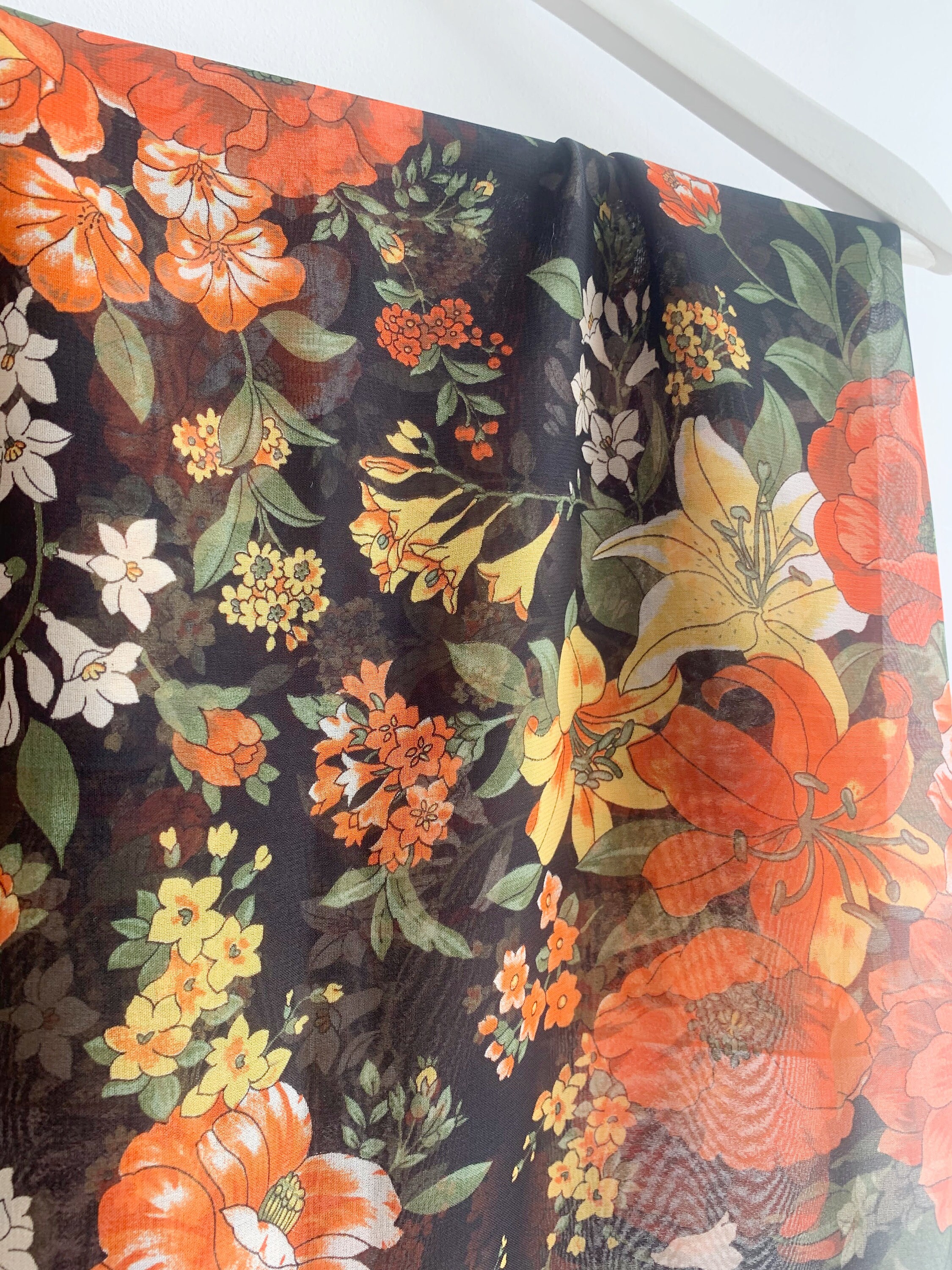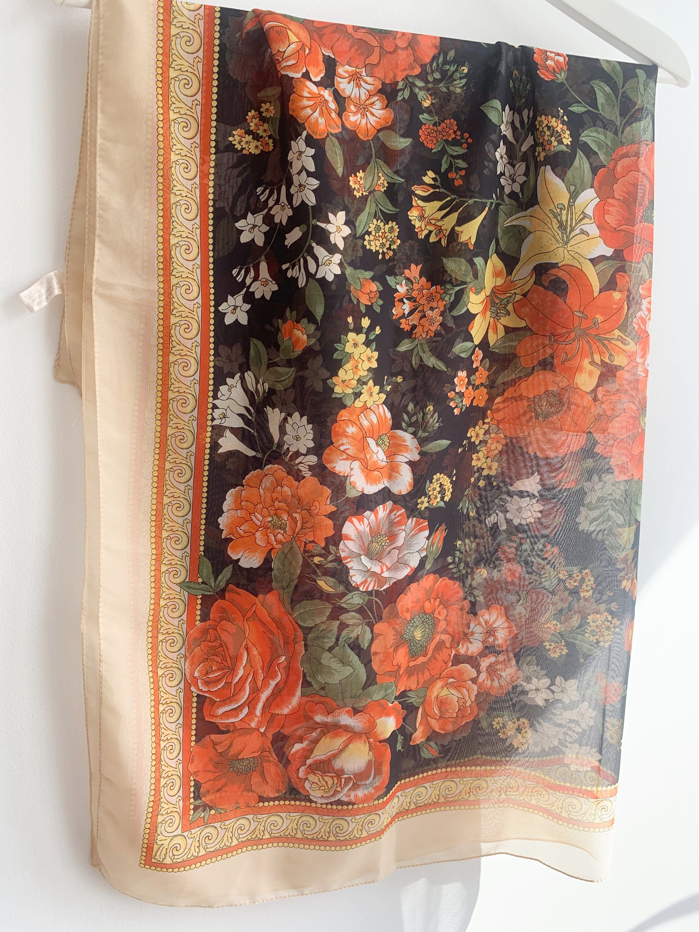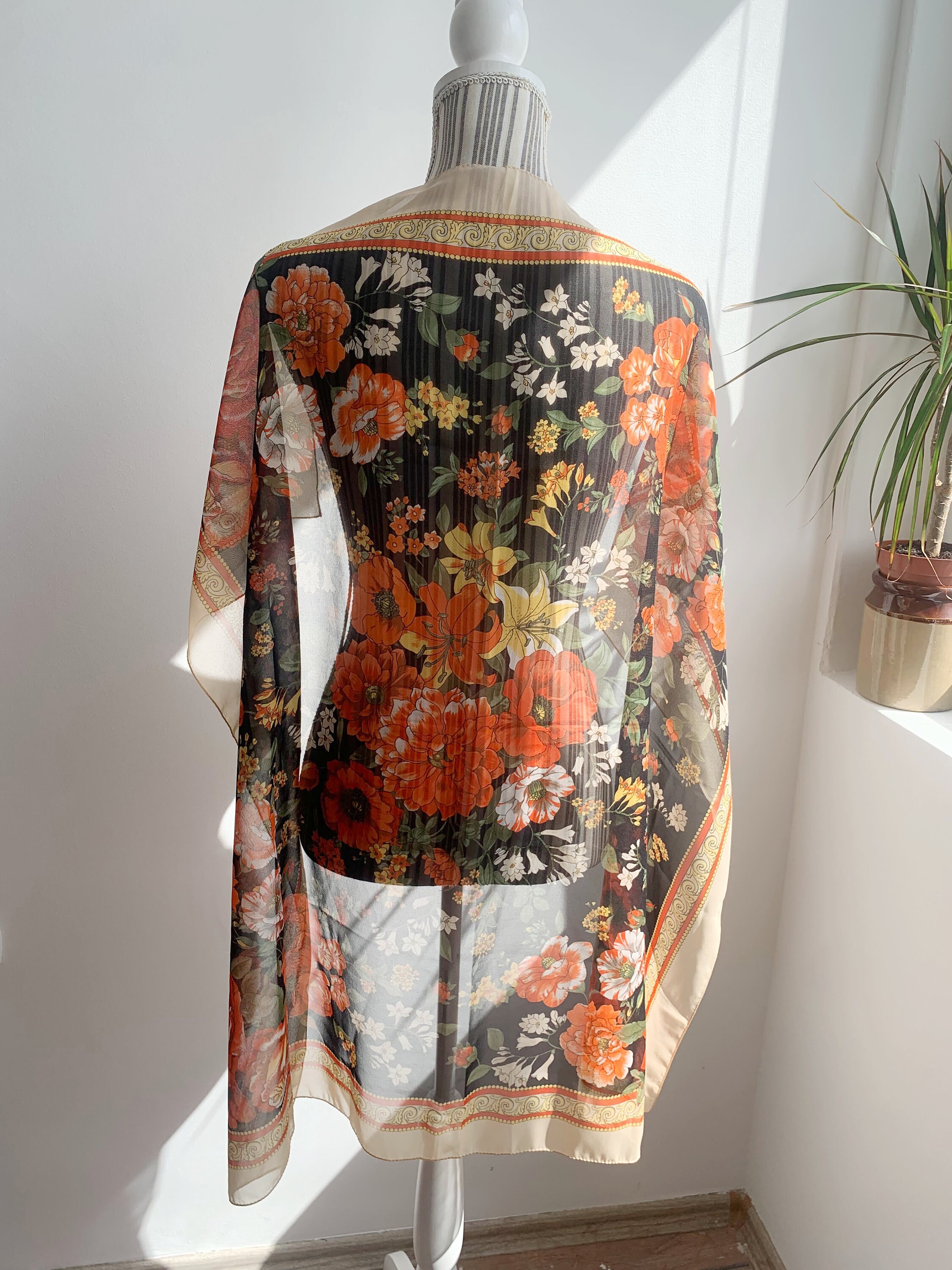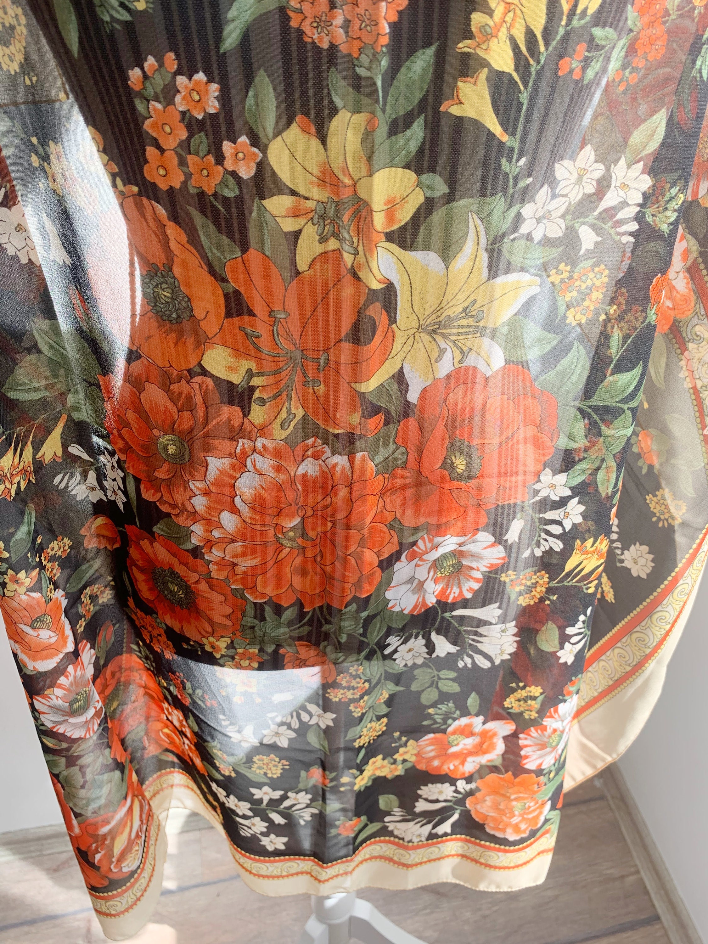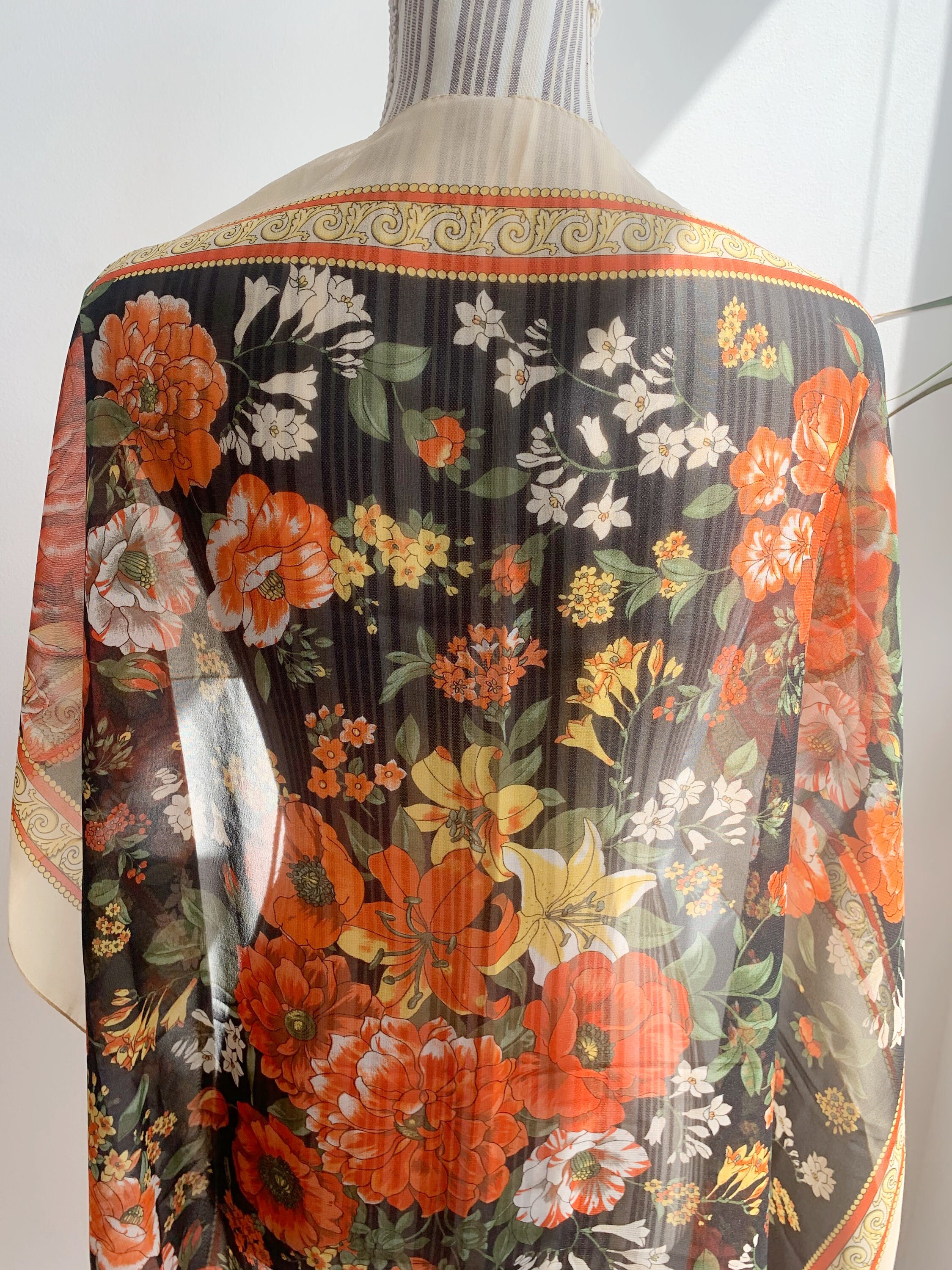 This is a vintage 80s Italian square neck scarf with gorgeous floral print in shades of orange, beige and green. This Babushka style scarf is super delicate and lightweight. It is made of sheer 100% polyester fabric. Perfect bohemian shawl to add a pop of color to your outfit. This square neck scarf can be worn in so many different ways - as a neck or head scarf, or as a shoulder shawl. It was made in Italy