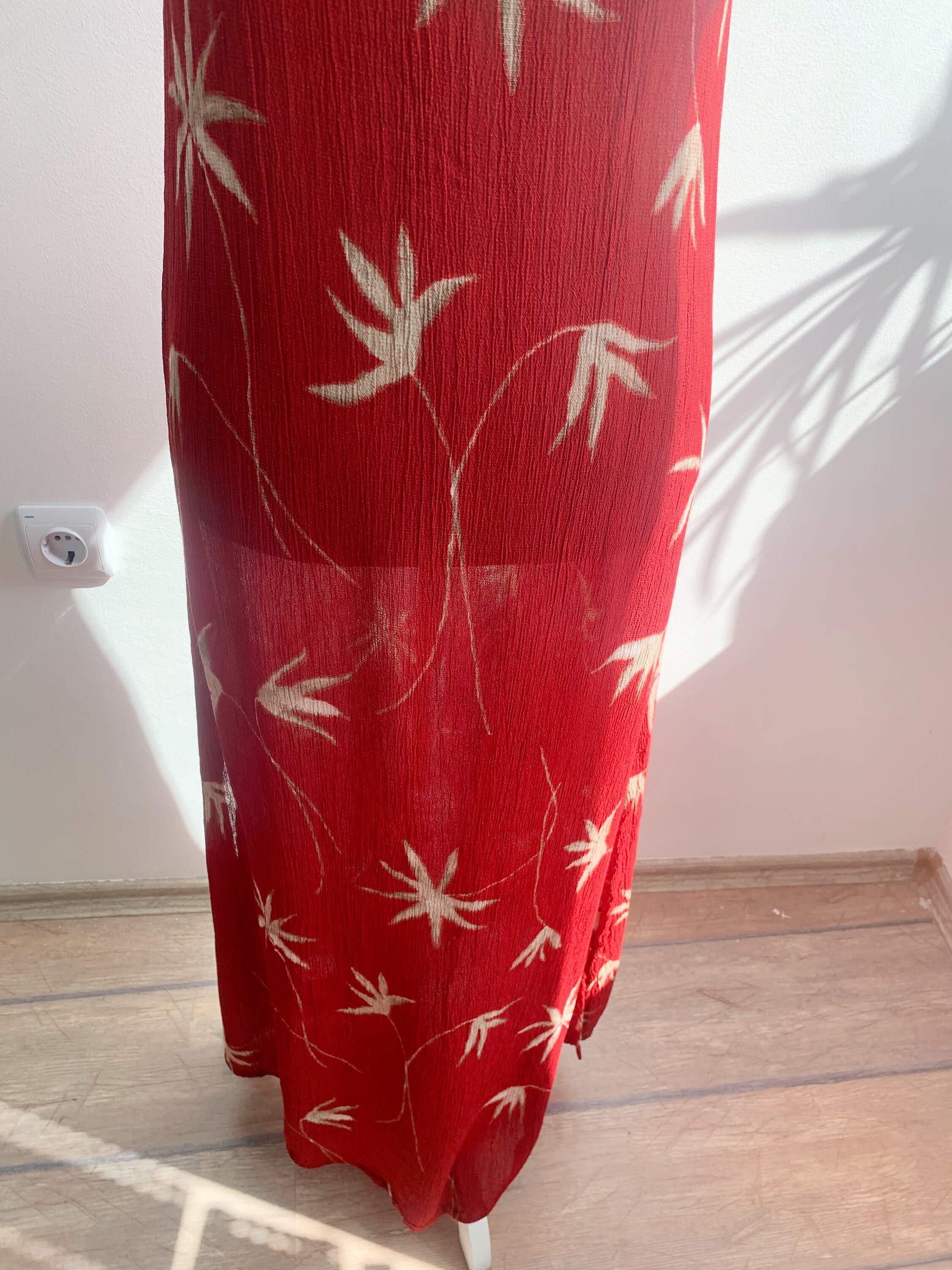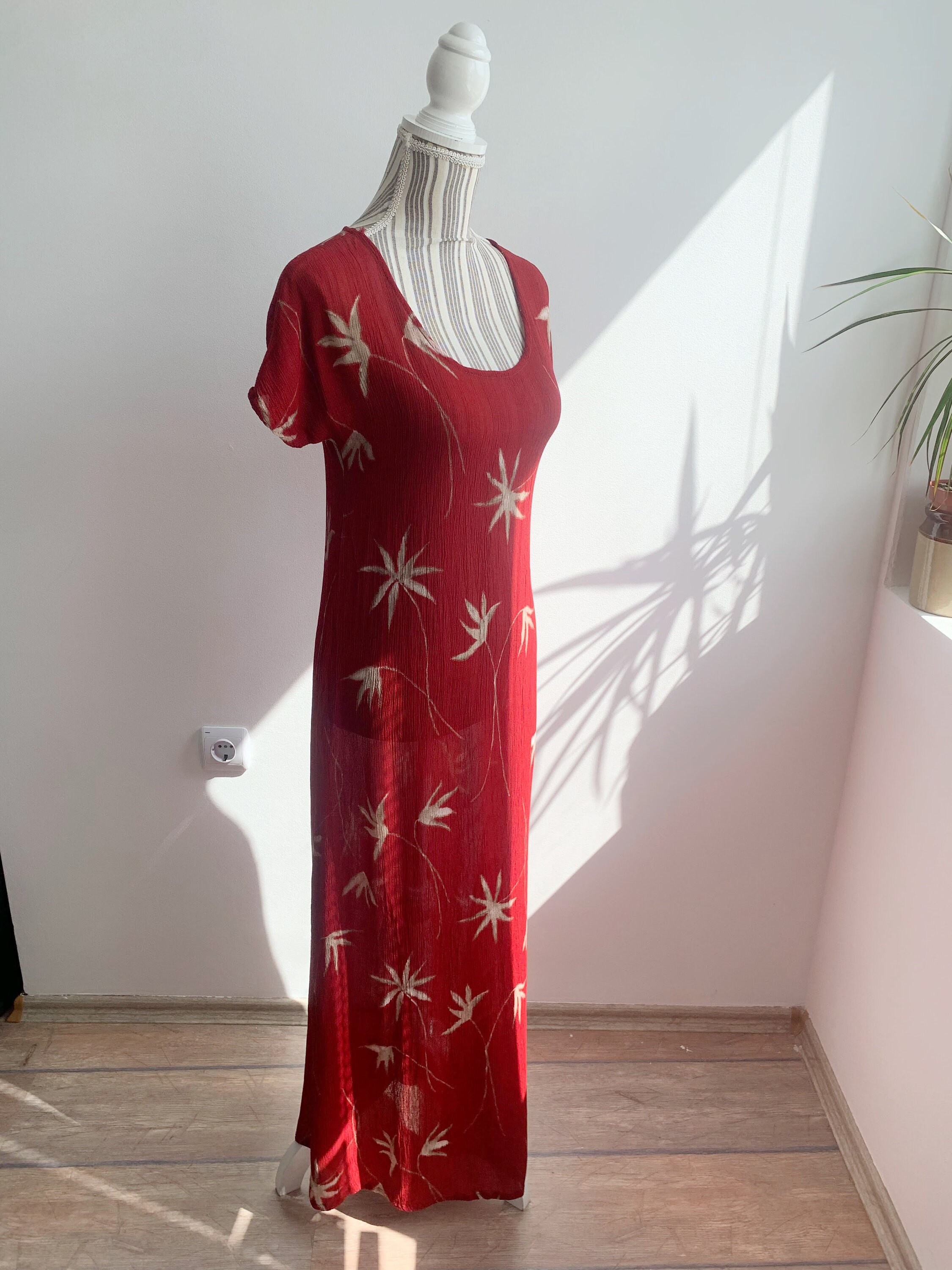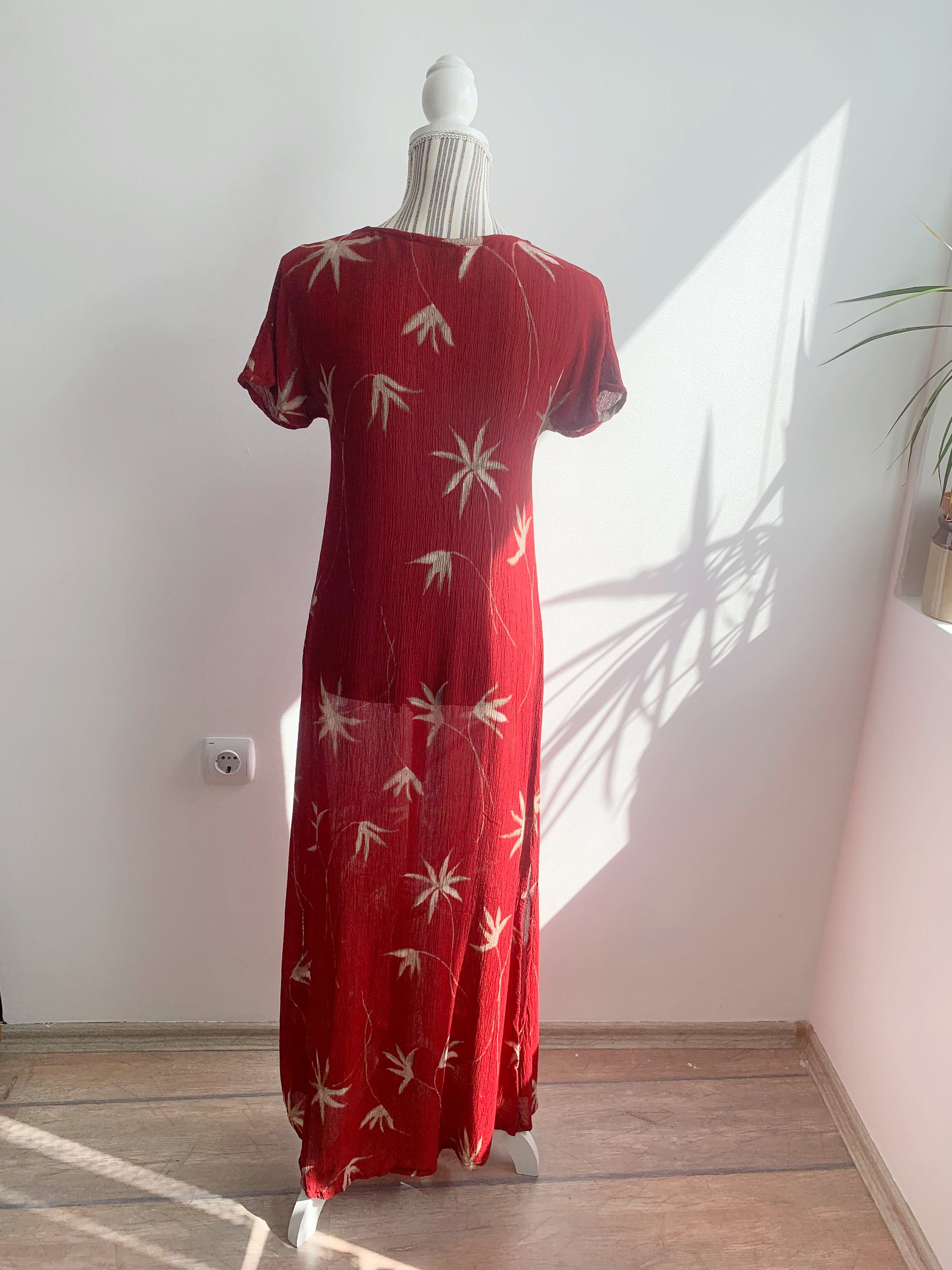 This is a wonderful grunge maxi dress which dates back to the 90s made of crinkle viscose fabric in red color with beige palm tree print. This 90s maxi dress is has straight cut silhouette with two side splits. This 90s grunge dress has a scoop neck and short sleeves. This summer maxi dress is size 38 which fits like S or M. Please check the measurements below.