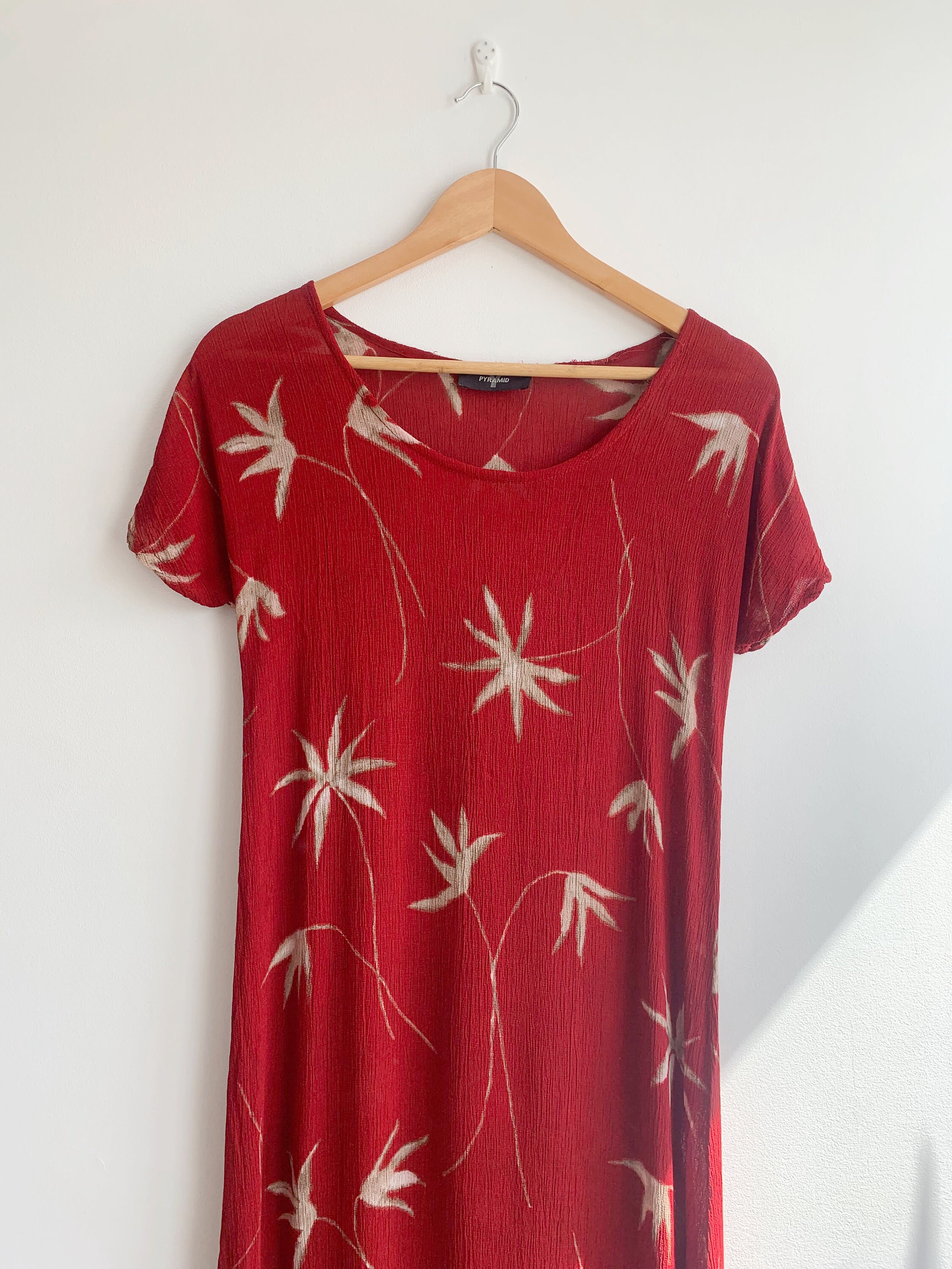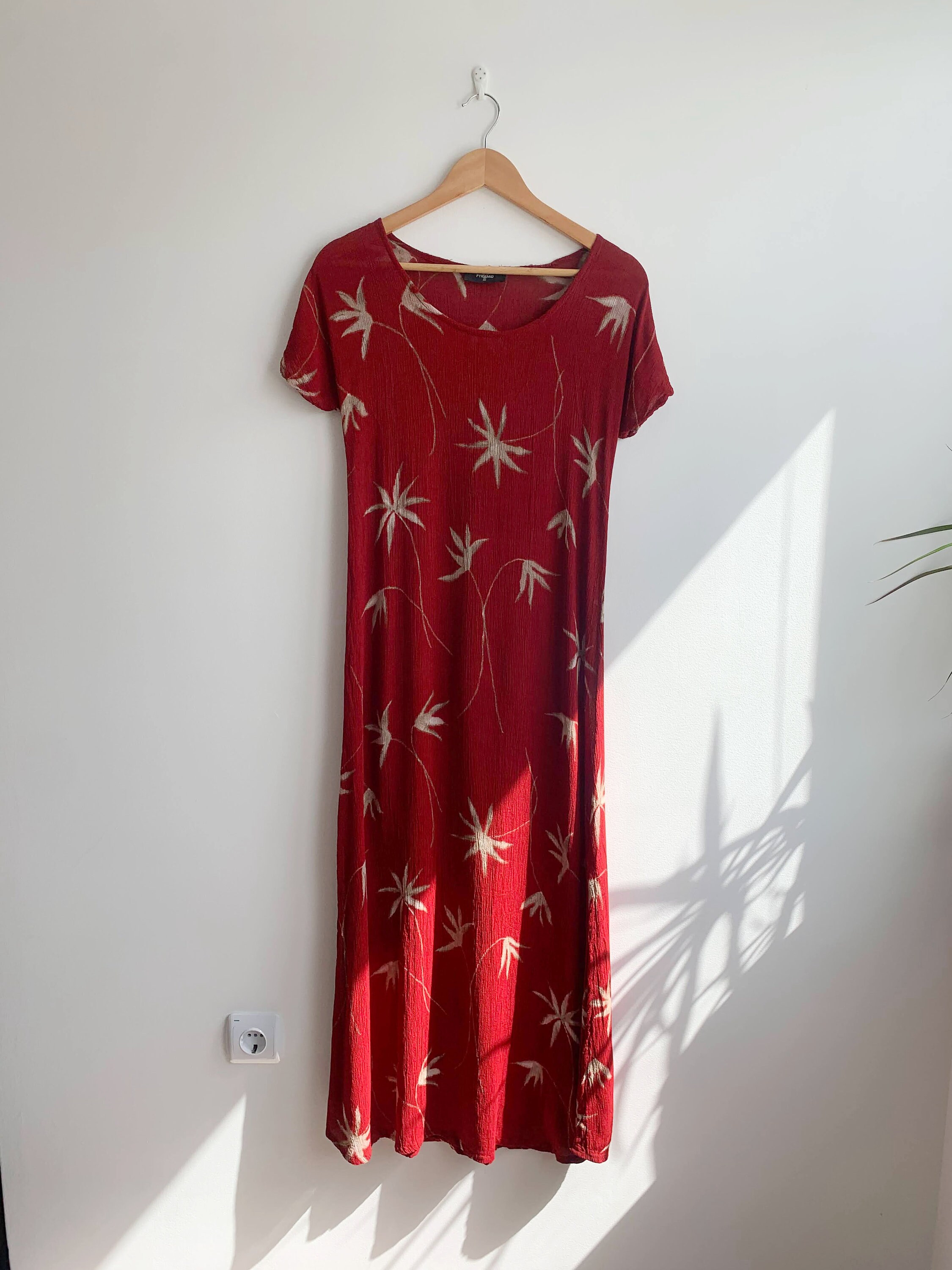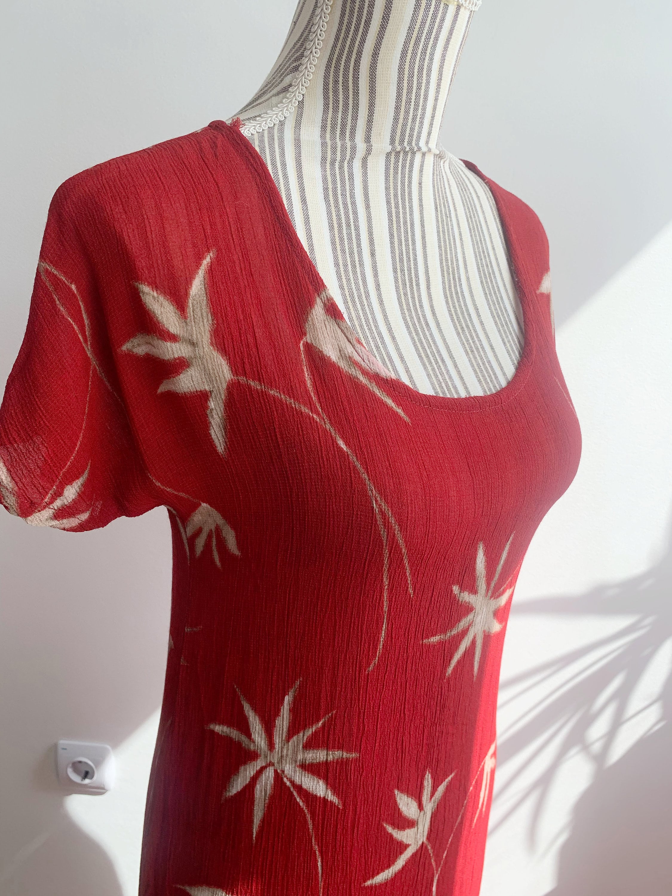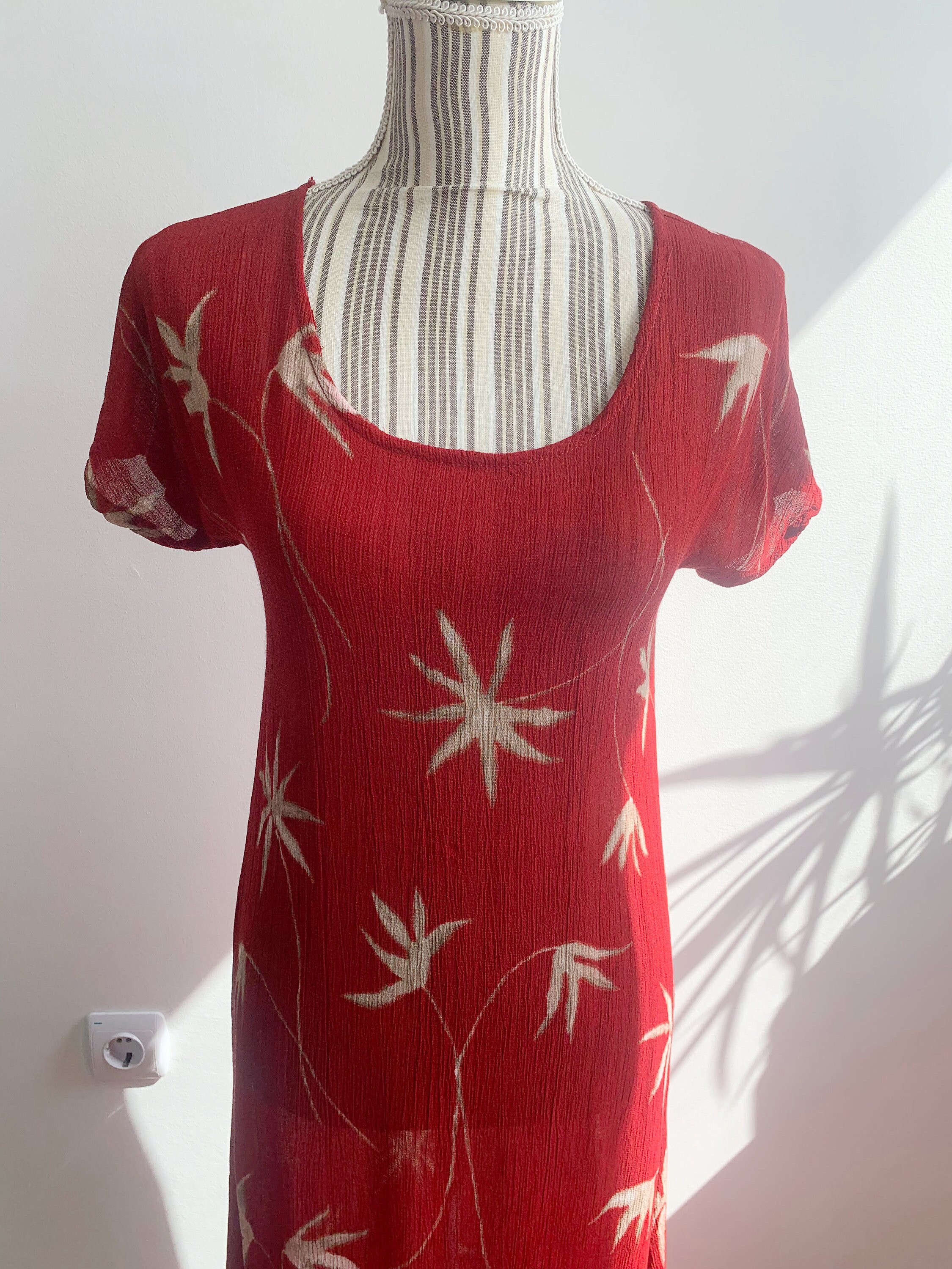 This is a wonderful grunge maxi dress which dates back to the 90s made of crinkle viscose fabric in red color with beige palm tree print. This 90s maxi dress is has straight cut silhouette with two side splits. This 90s grunge dress has a scoop neck and short sleeves. This summer maxi dress is size 38 which fits like S or M. Please check the measurements below.