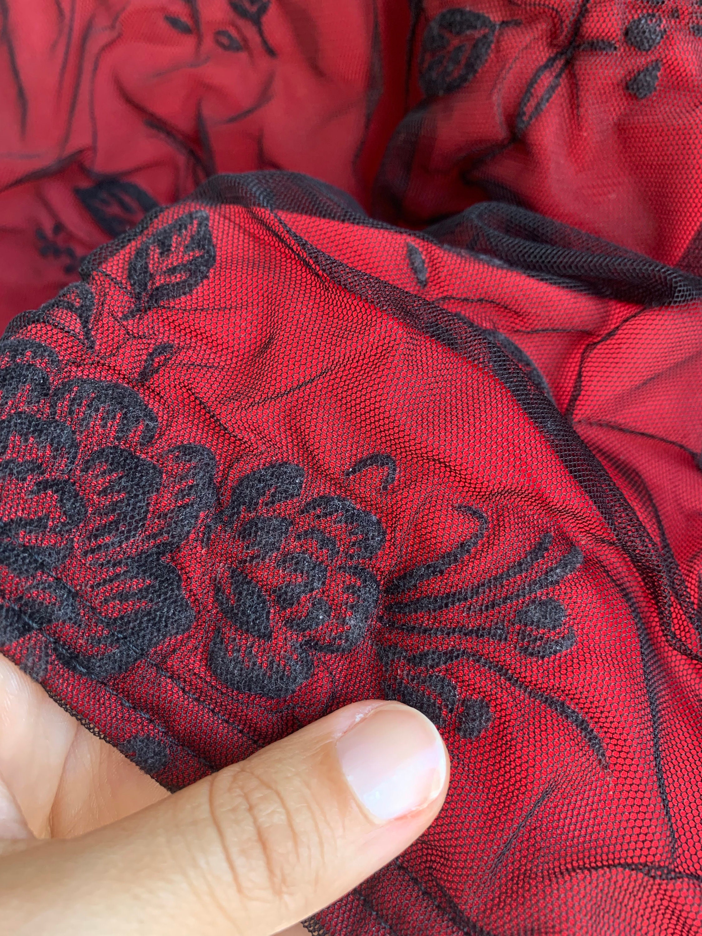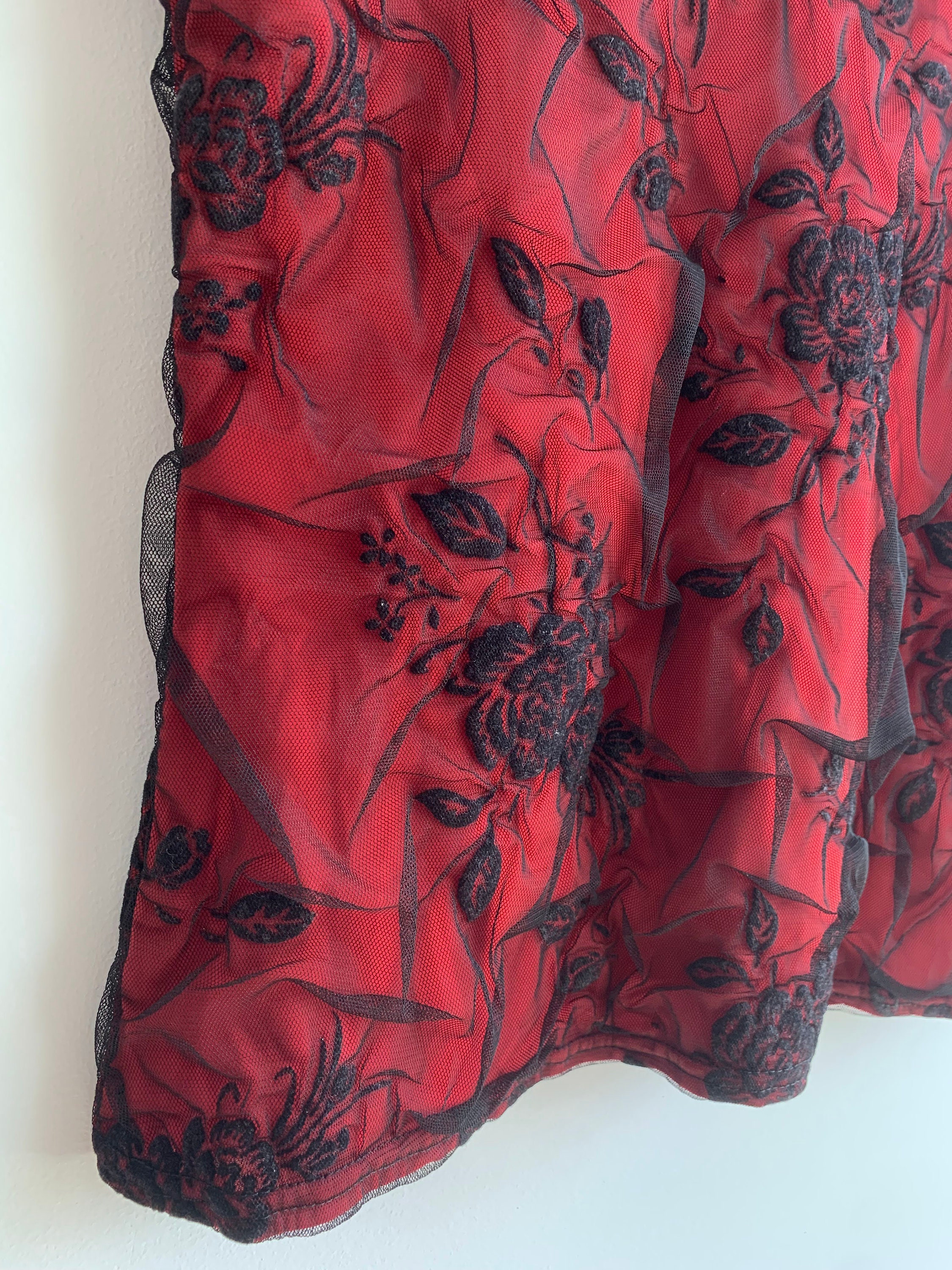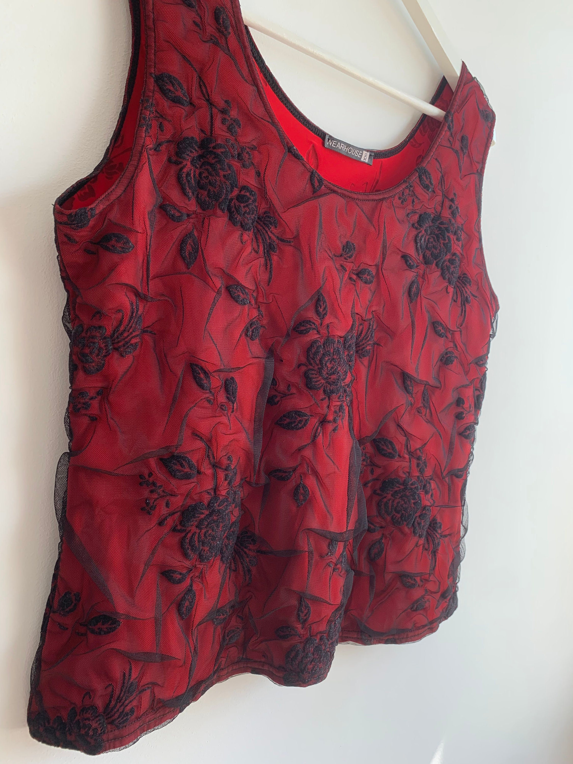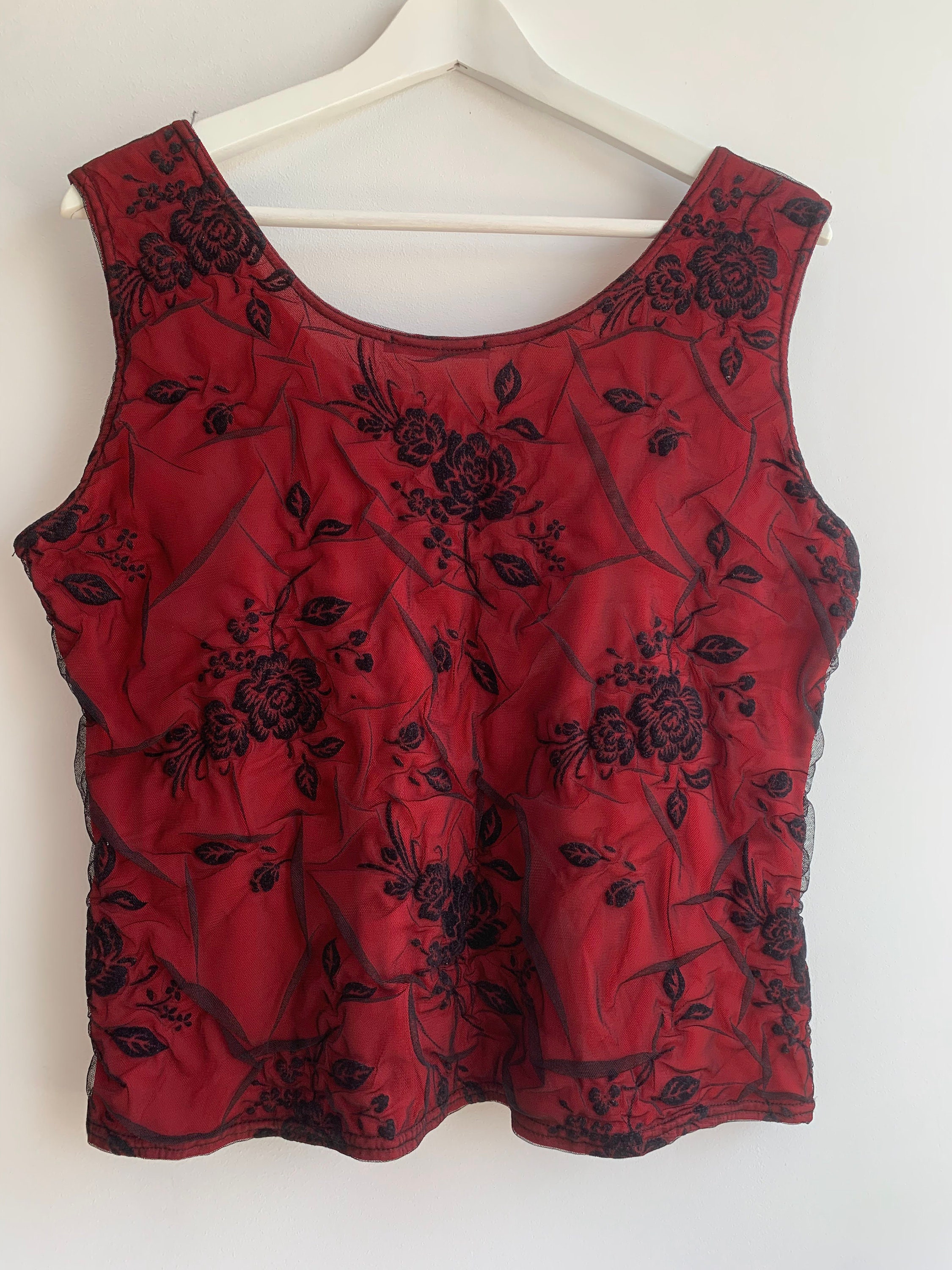 This is a vintage Y2K stretchy tank top made of red elastic fabric with black floral lace tulle top layer. The size marked is XXL, it fits like size L/ XL. Please check the measurements below: