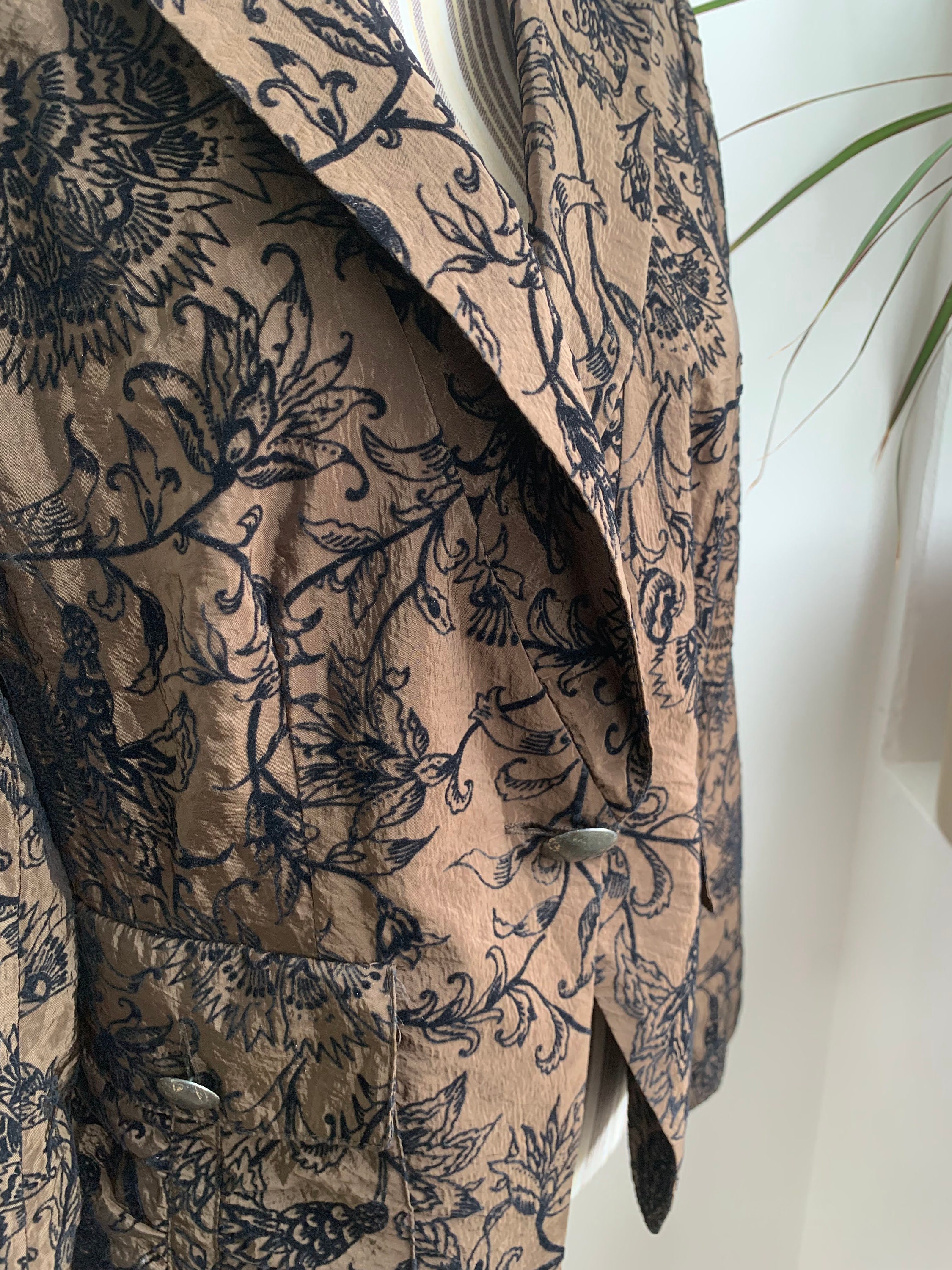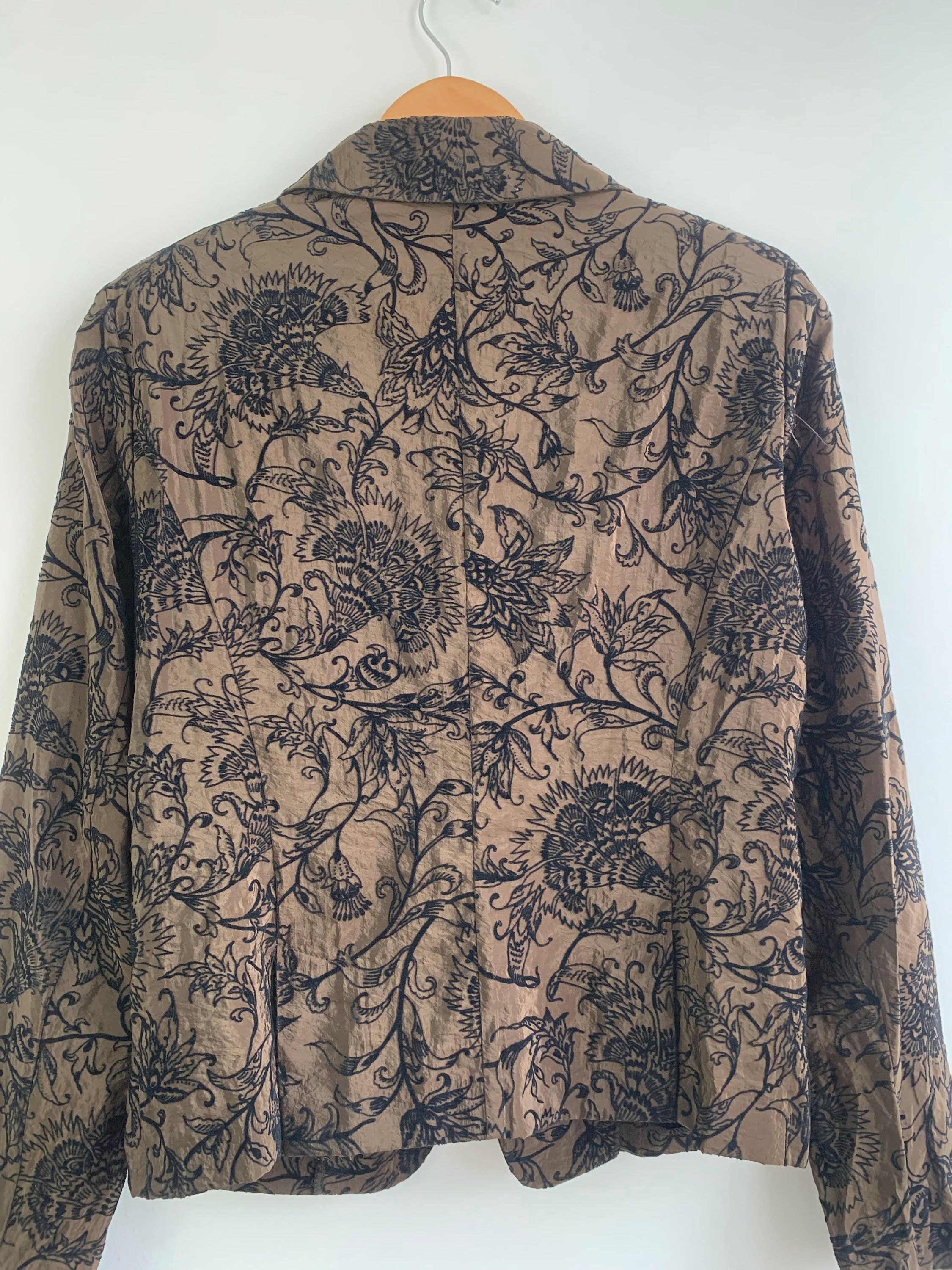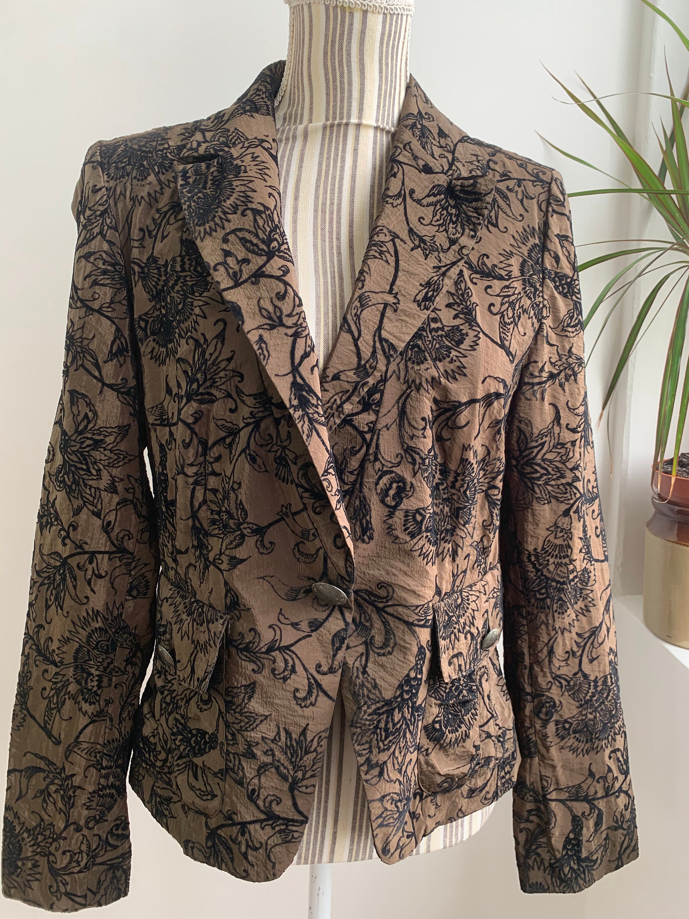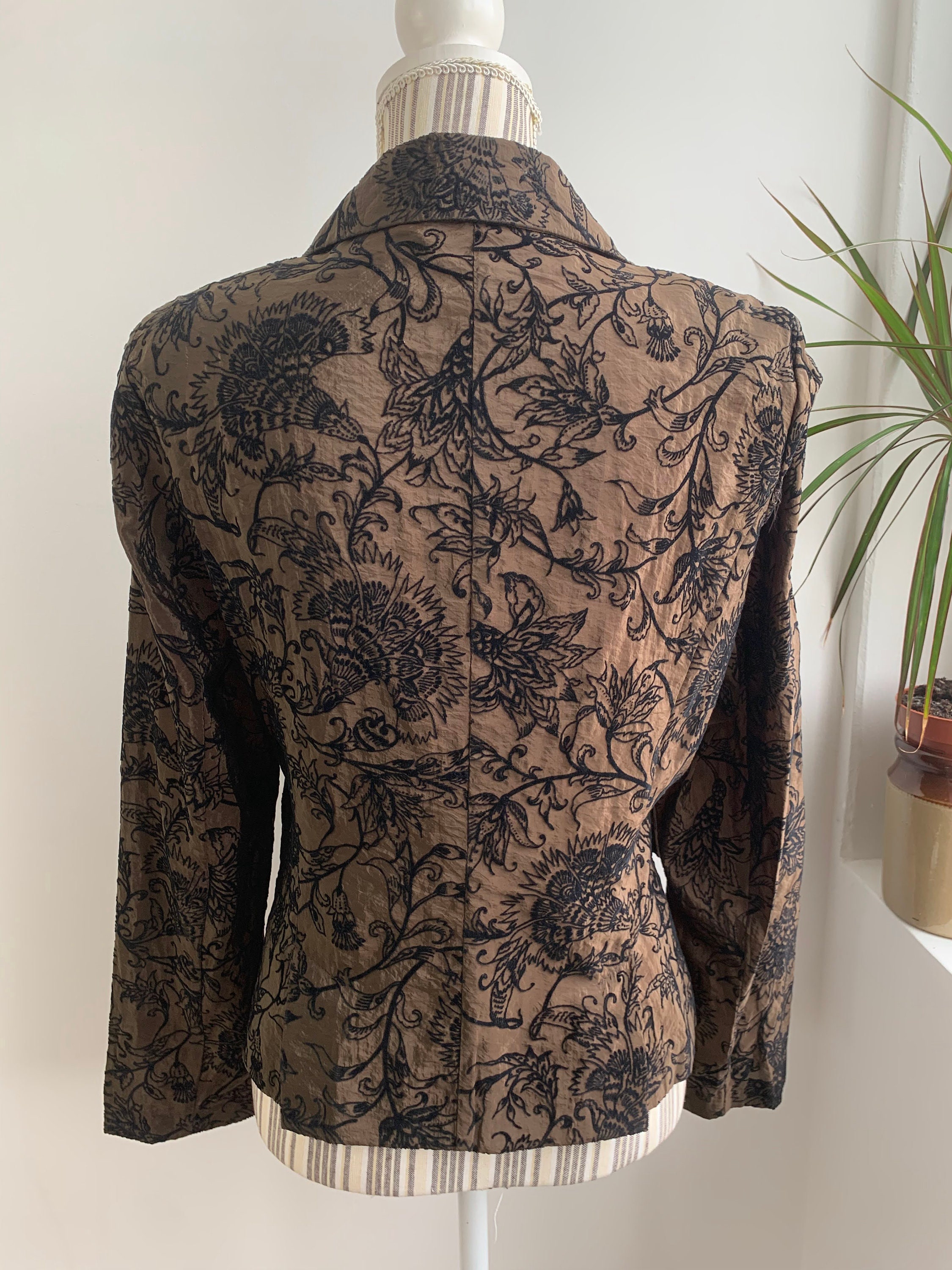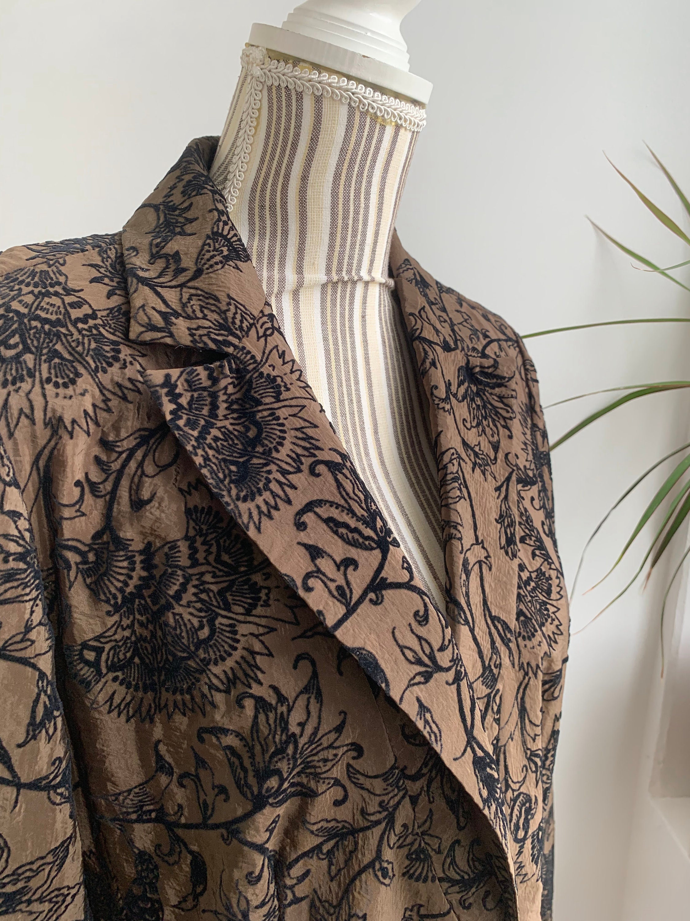 This is a wonderful vintage 90s Y2K floral blazer for women with single button closure and two pockets. This super thin lightweight jacket has beautiful Jacobean floral velvet embroidery pattern on warm olive green satin fabric. This light blazer coat shines beautifully in shades of warm brown, olive green and black. This psychedelic blazer jacket has a straight color and deep v neck. It is made of super light fabric and it's lightly lined. The fabric is soo thin, that it's almost transparent. This is a gorgeous piece of elegant outerwear that will get all eyes on you, adding a pop of elegance to your outfit. This amazing eclectic jacket that is made of shiny fabric, combining timeless elegance and functionality. This floral velvet blazer fits like size S or M. Please check the measurements below.