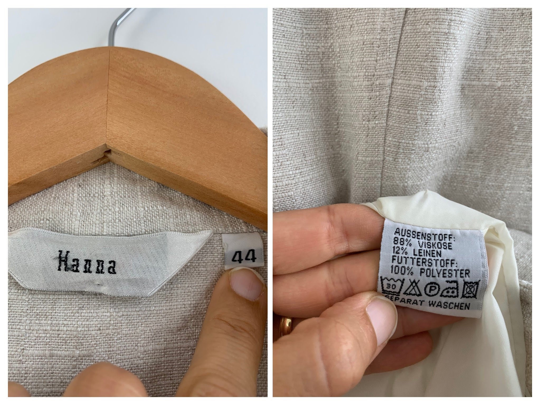 This is s beautiful vintage 90s cream beige viscose linen blend blazer jacket for women (88% viscose, 12% linen), it has polyester lining in matching color. This oversized boyfriend blazer jacket has button up front with two pockets and long sleeves. This soft casual blazer coat is perfect for the spring/fall season. The size marked is 44, it fits like size XL. Please check the measurements below.