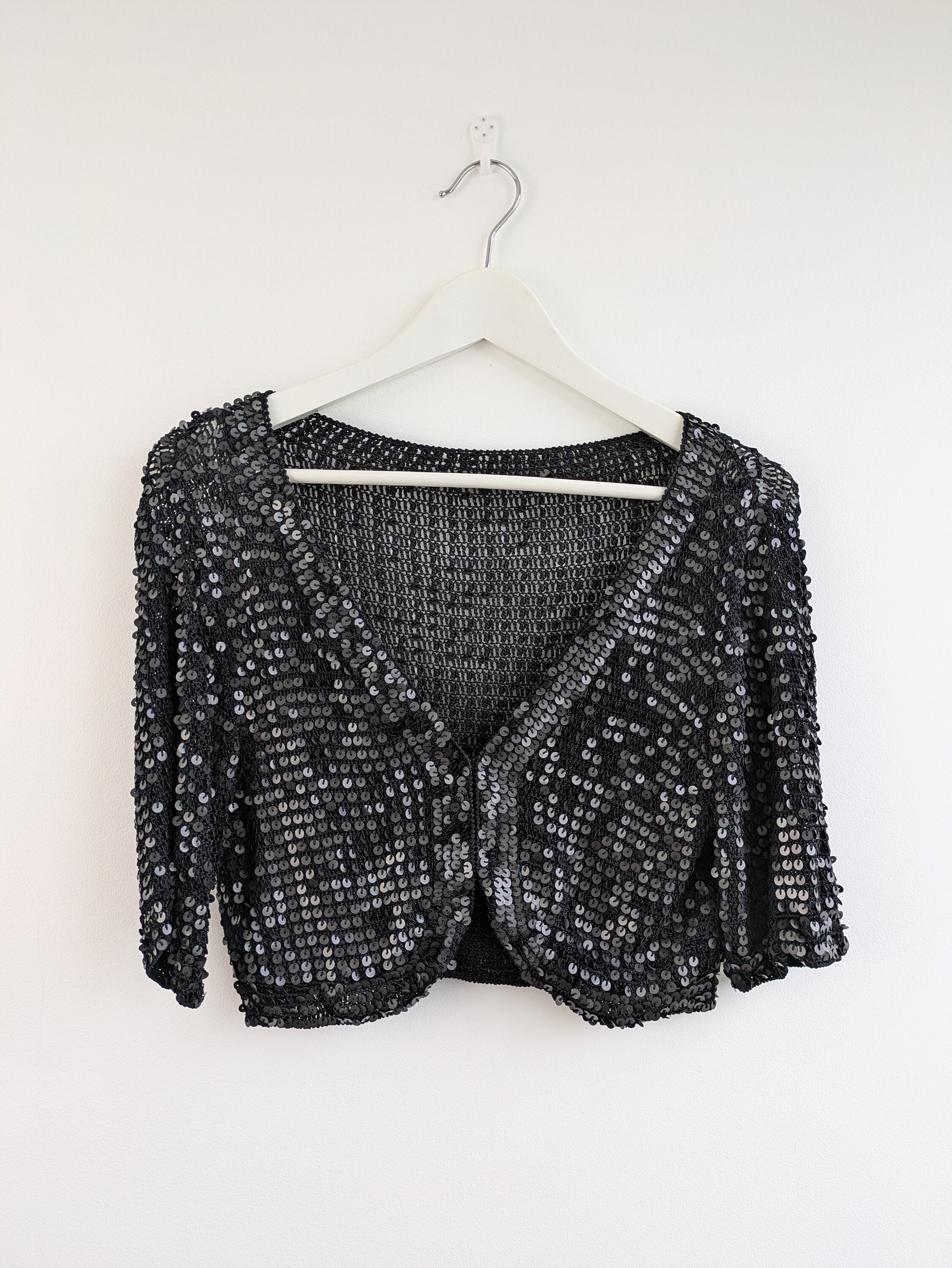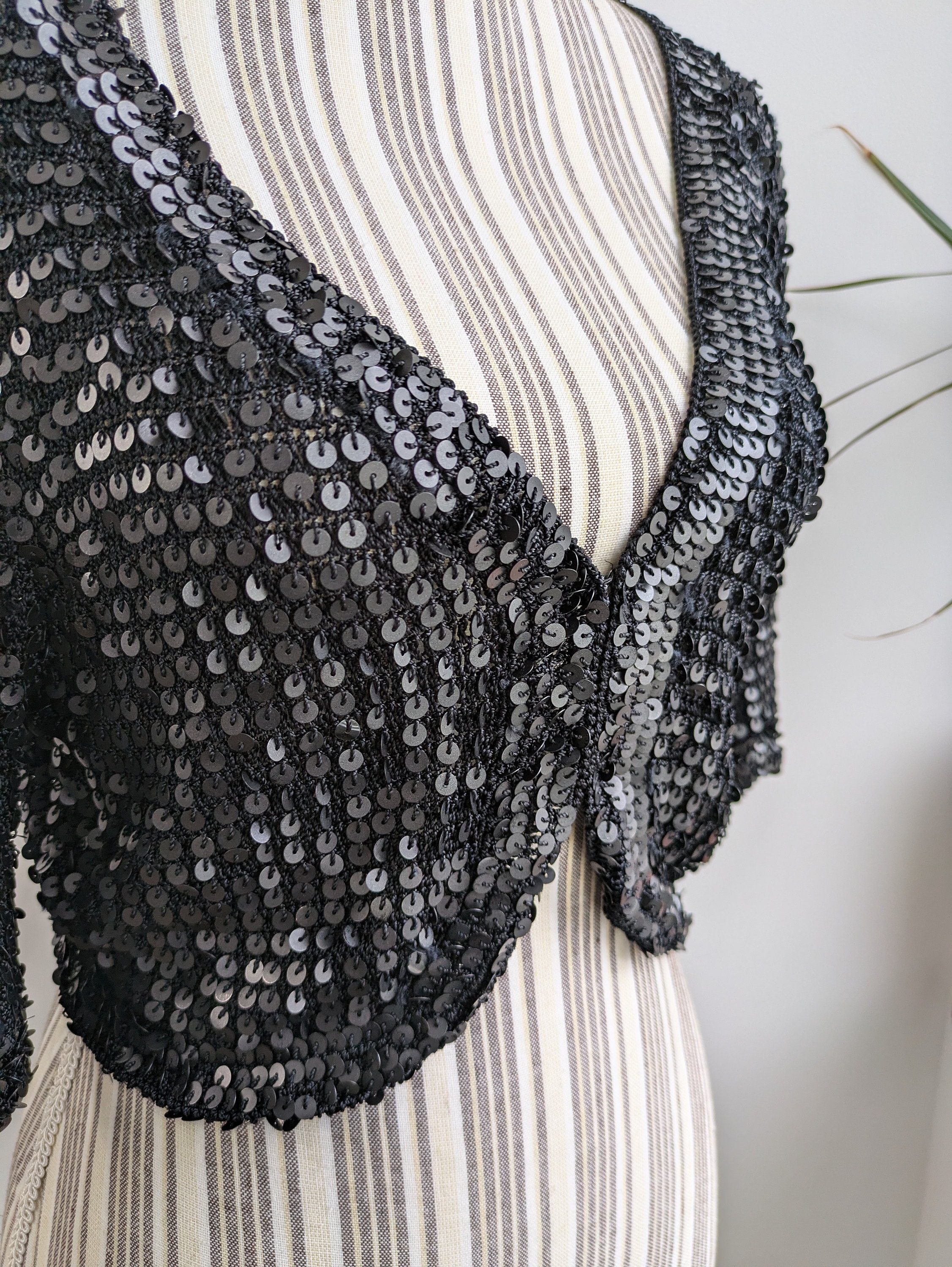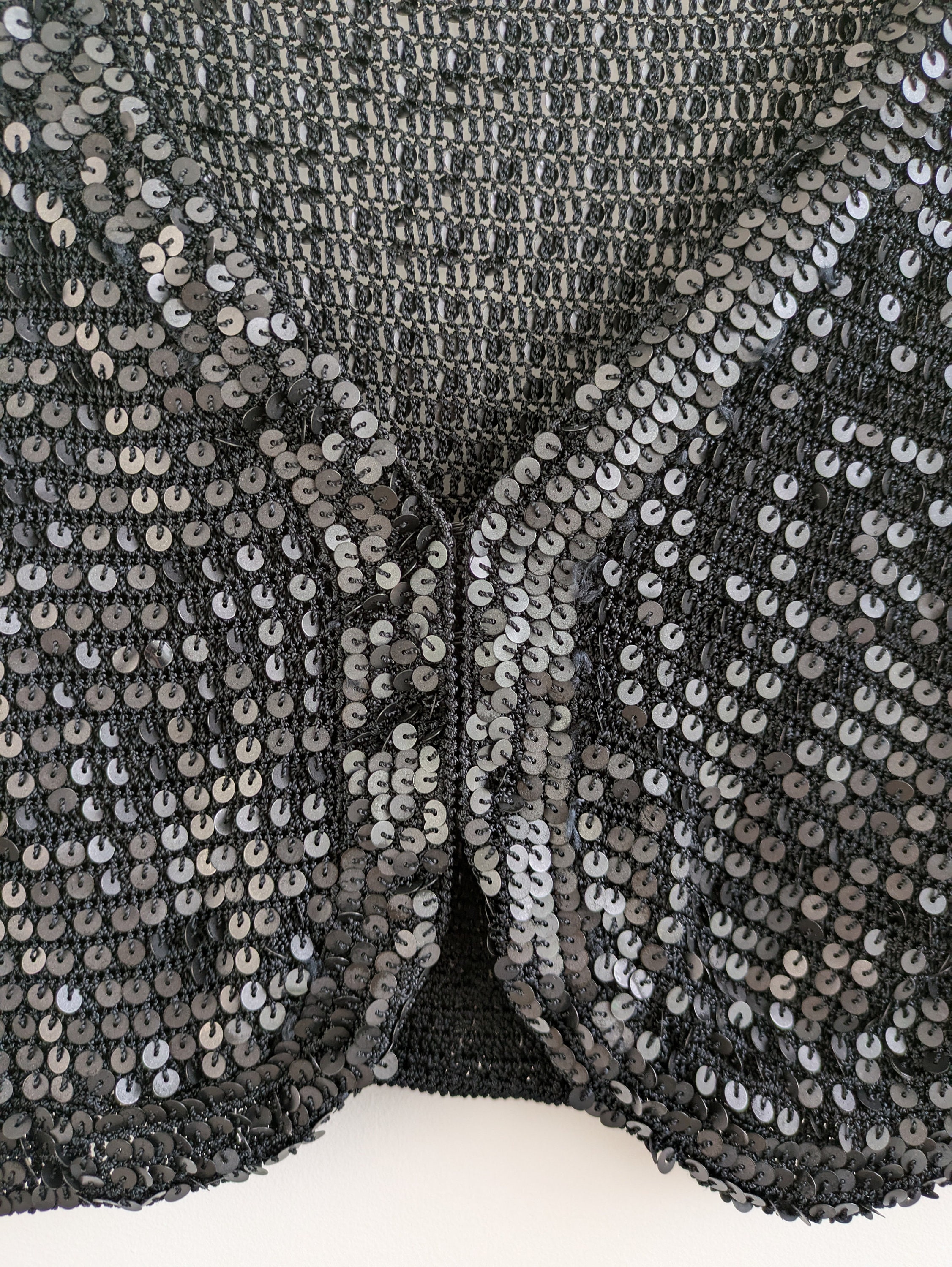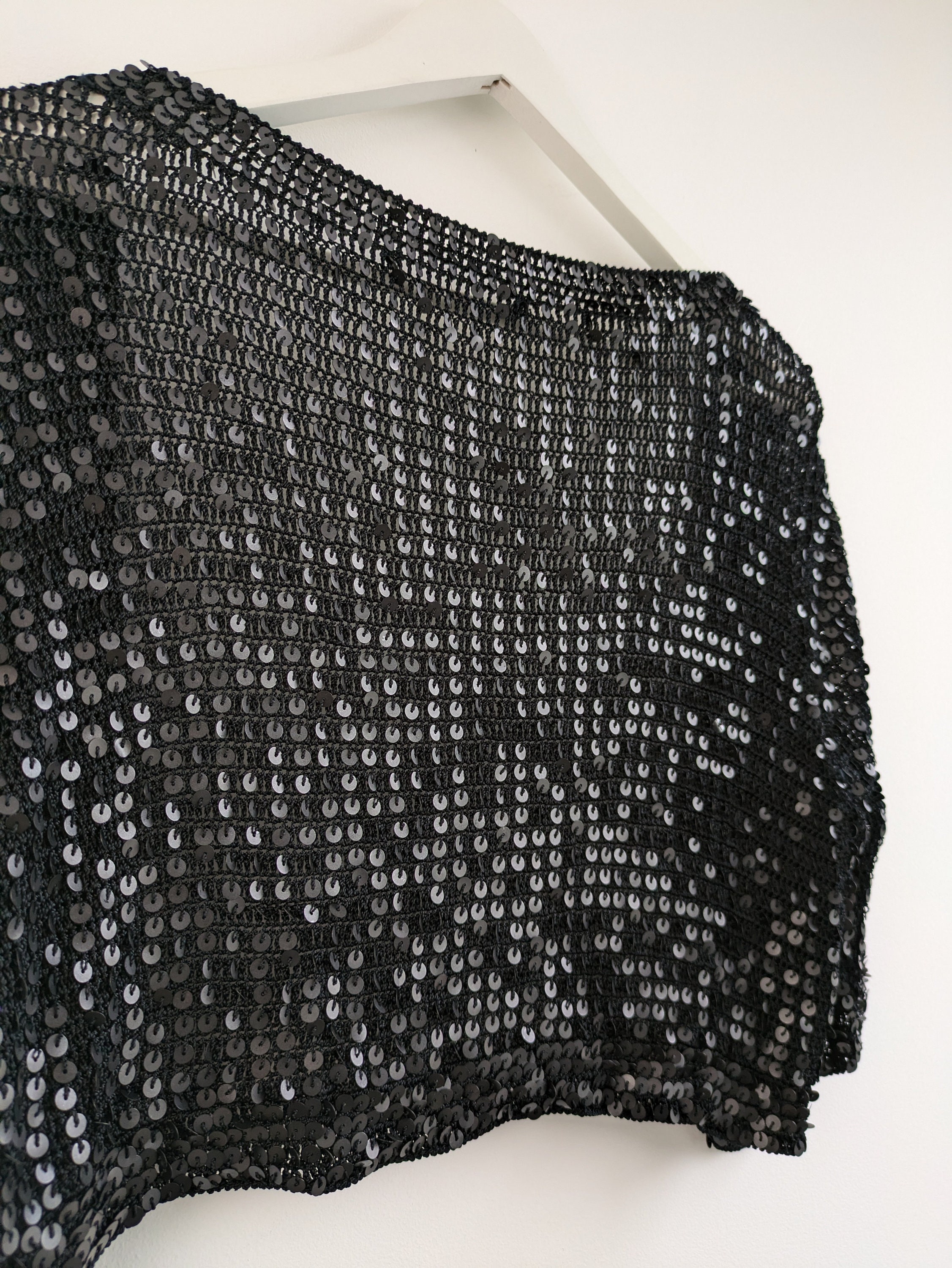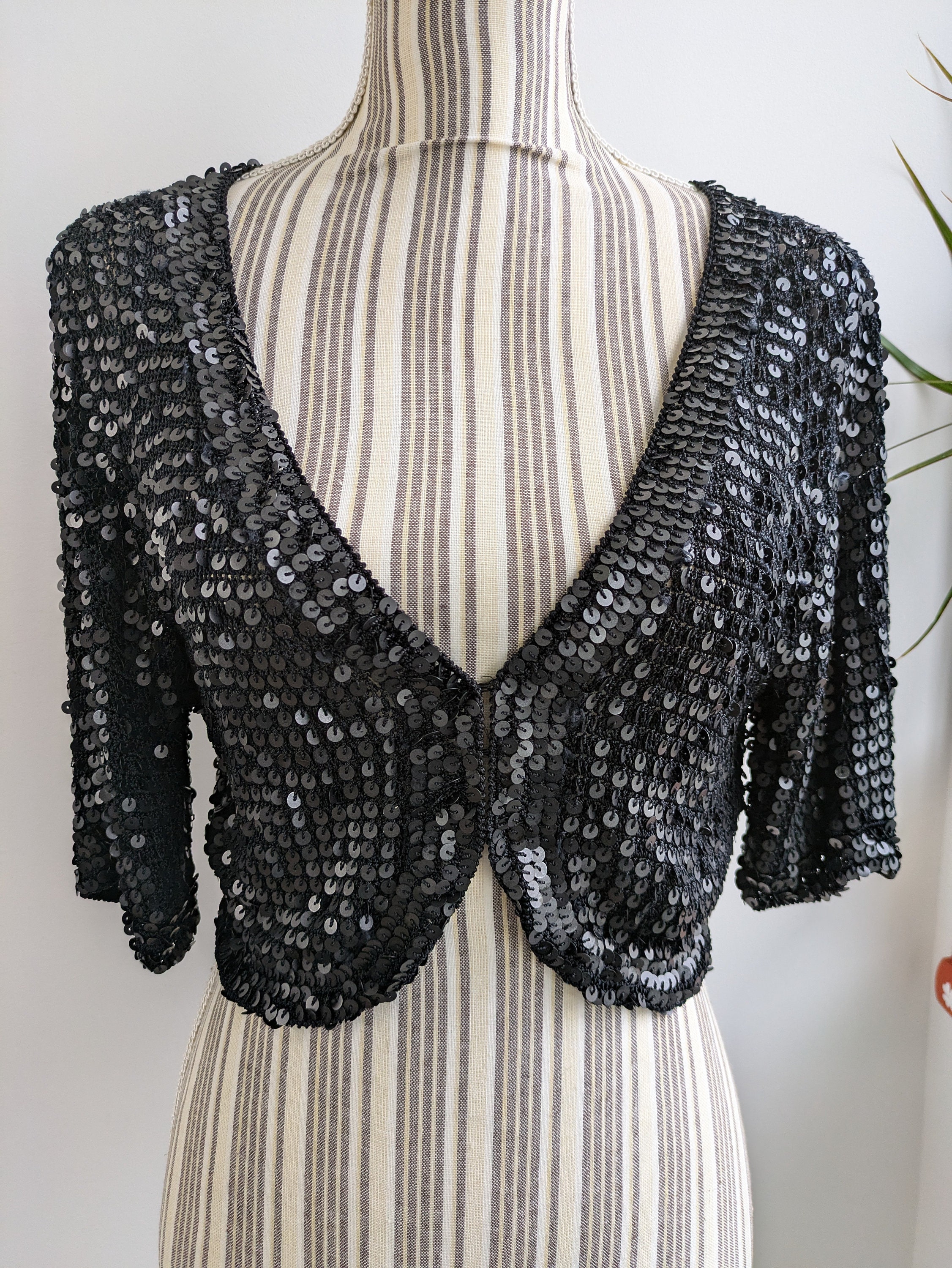 This is a pretty crochet lace cardigan with hook and eye closure and short sleeves. This elegant cropped cardigan is heavily embellished with black sequin beads. This evening bolero cardigan is made of silky viscose thread in stylish black color which has a beautiful shine when exposed to light. This cocktail party lace cropped cardigan has deep v neck and short sleeves. You can wear this sequinned bolero with an open front or wear it as a button front crop top. Lovely lace mesh top to pair with evening gowns. This y2k crochet top is a wonderful vintage gift for your girlfriend or wife for any special occasion. This black cardigan crop top fits like size M/L. Please check the measurements below.