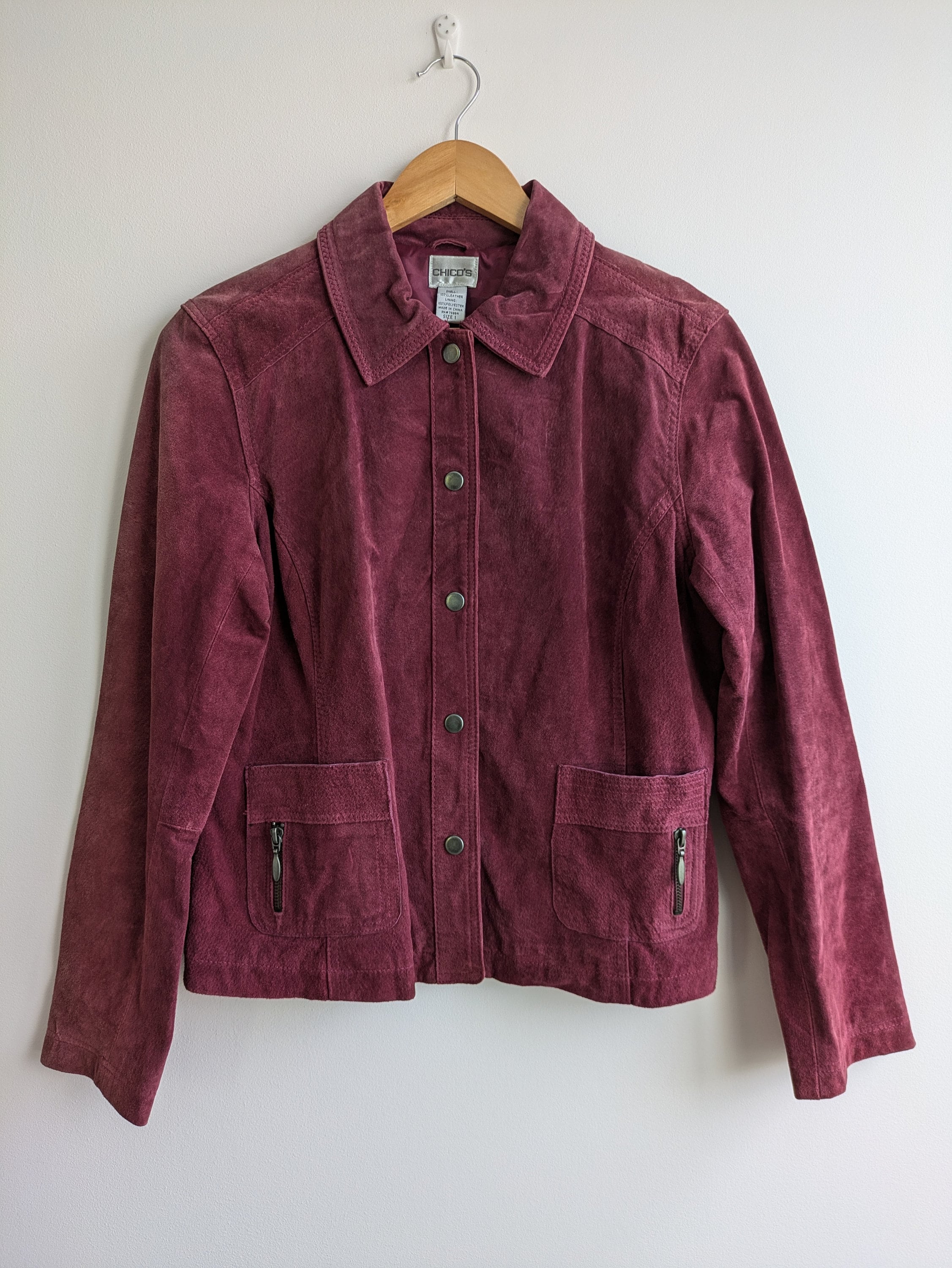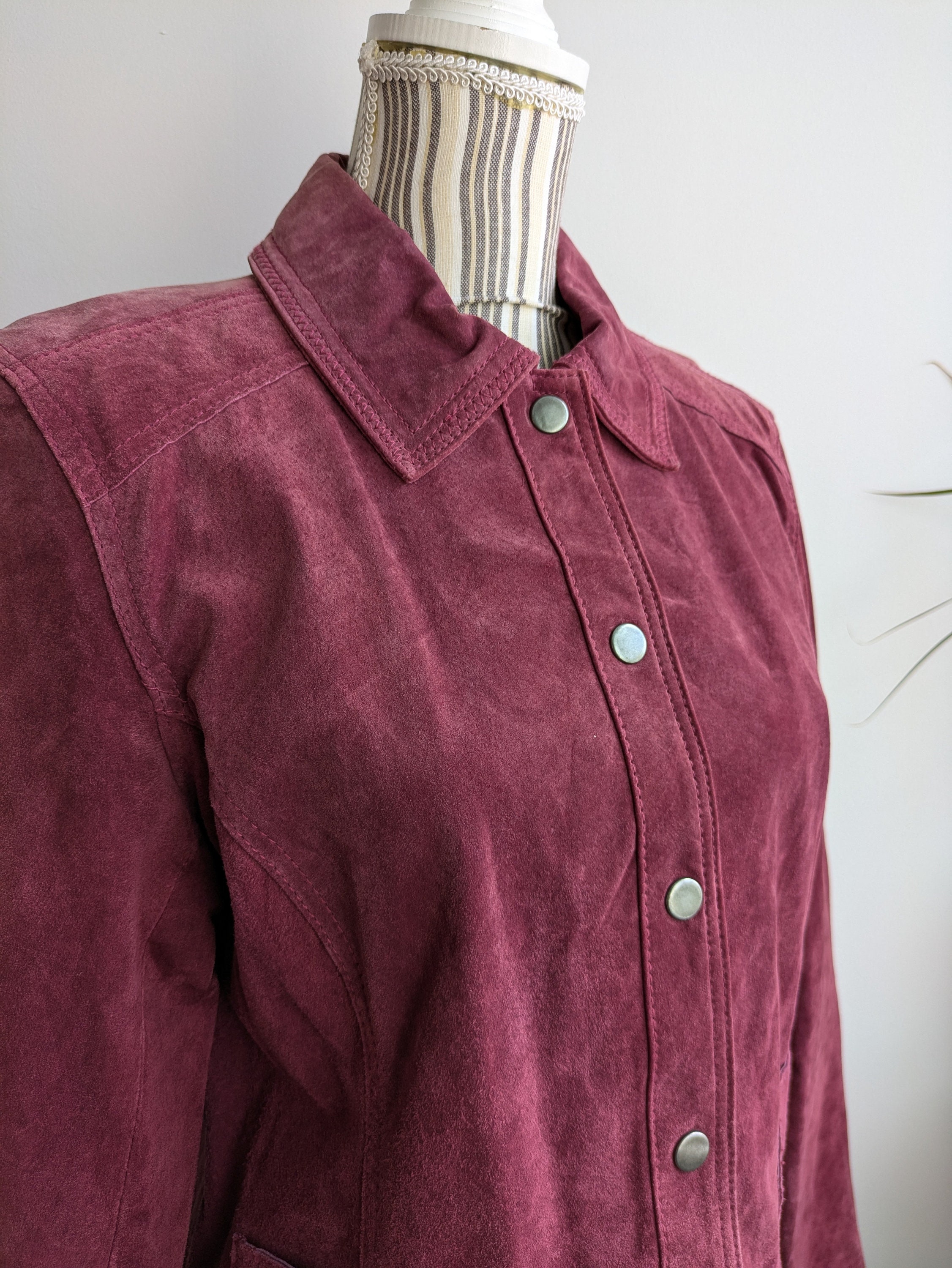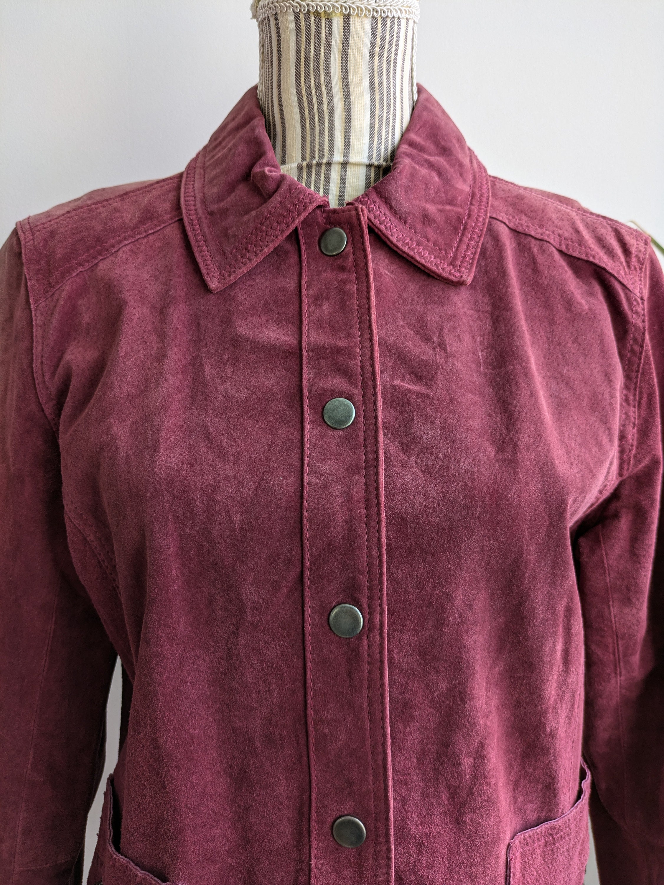 This is a vintage distressed suede leather trucker jacket for women with button up closure and pockets. This suede leather jacket is made of soft suede leather in mulberry purple pink color. The suede leather has an aged look due to the marks and scratches on the leather surface. This boho chic western leather jacket for women has two side pockets. It has polyester lining. This grunge jacket is by the brand Chico's. The size marked is 1, it fits like size S or M . Please check the measurements below.