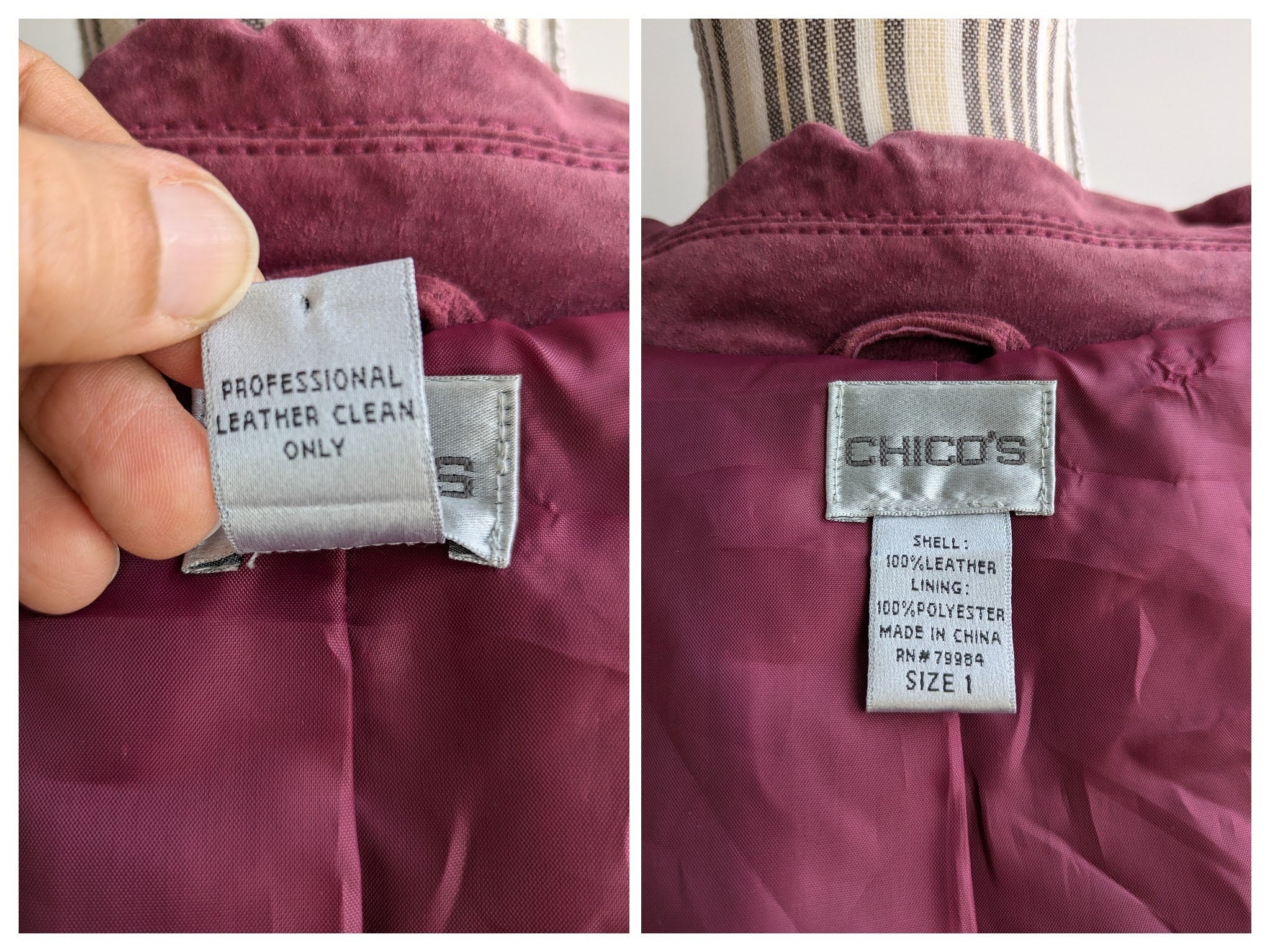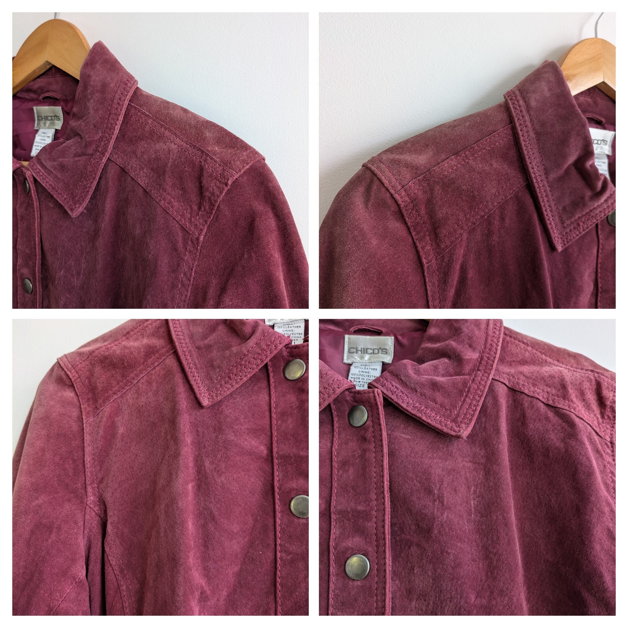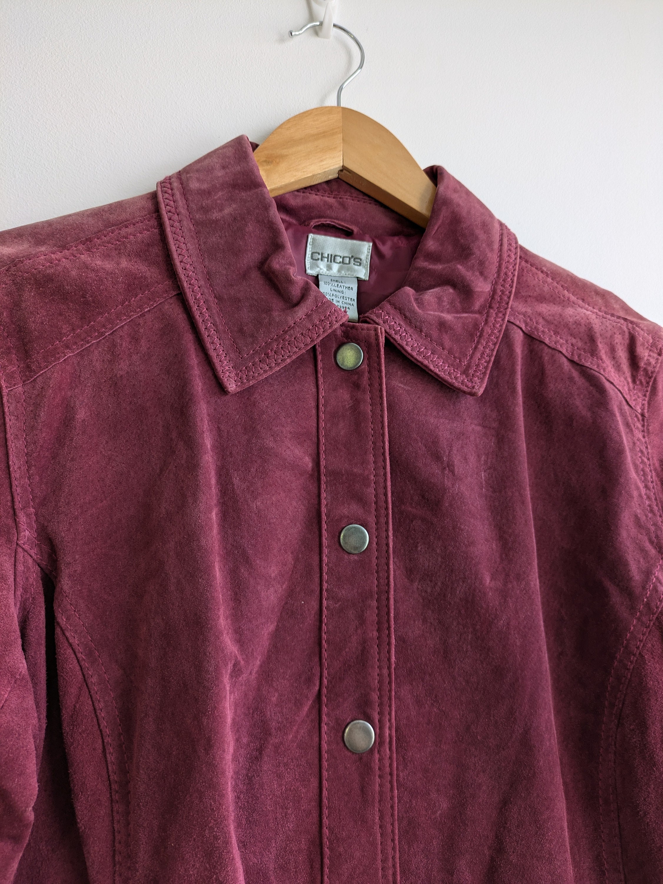 This is a vintage distressed suede leather trucker jacket for women with button up closure and pockets. This suede leather jacket is made of soft suede leather in mulberry purple pink color. The suede leather has an aged look due to the marks and scratches on the leather surface. This boho chic western leather jacket for women has two side pockets. It has polyester lining. This grunge jacket is by the brand Chico's. The size marked is 1, it fits like size S or M . Please check the measurements below.