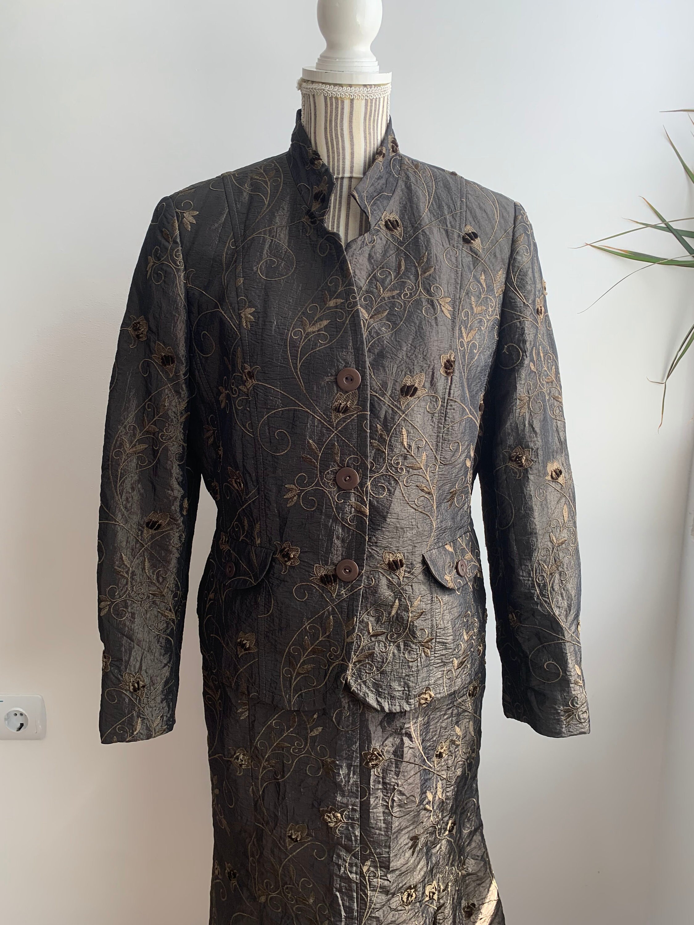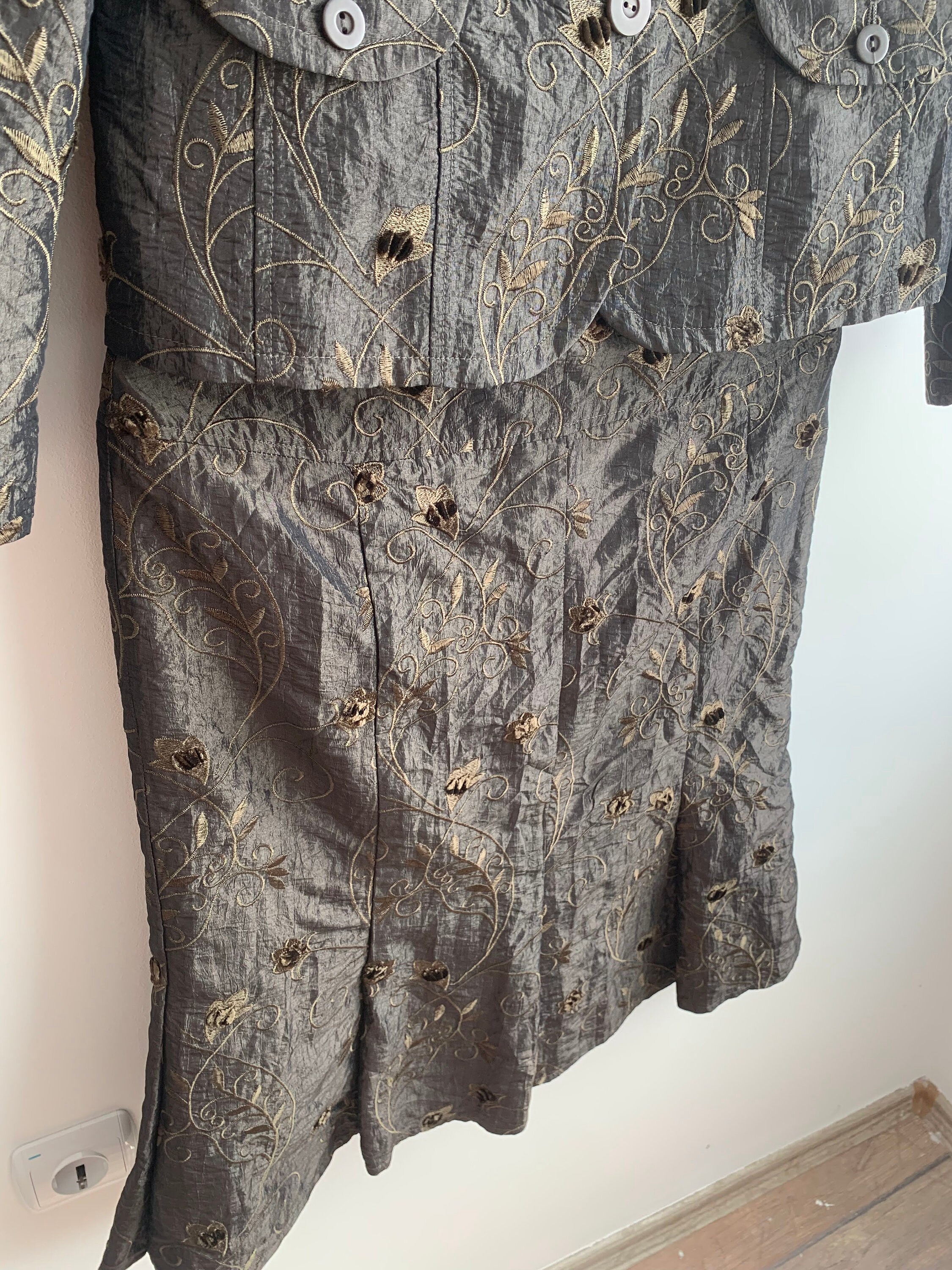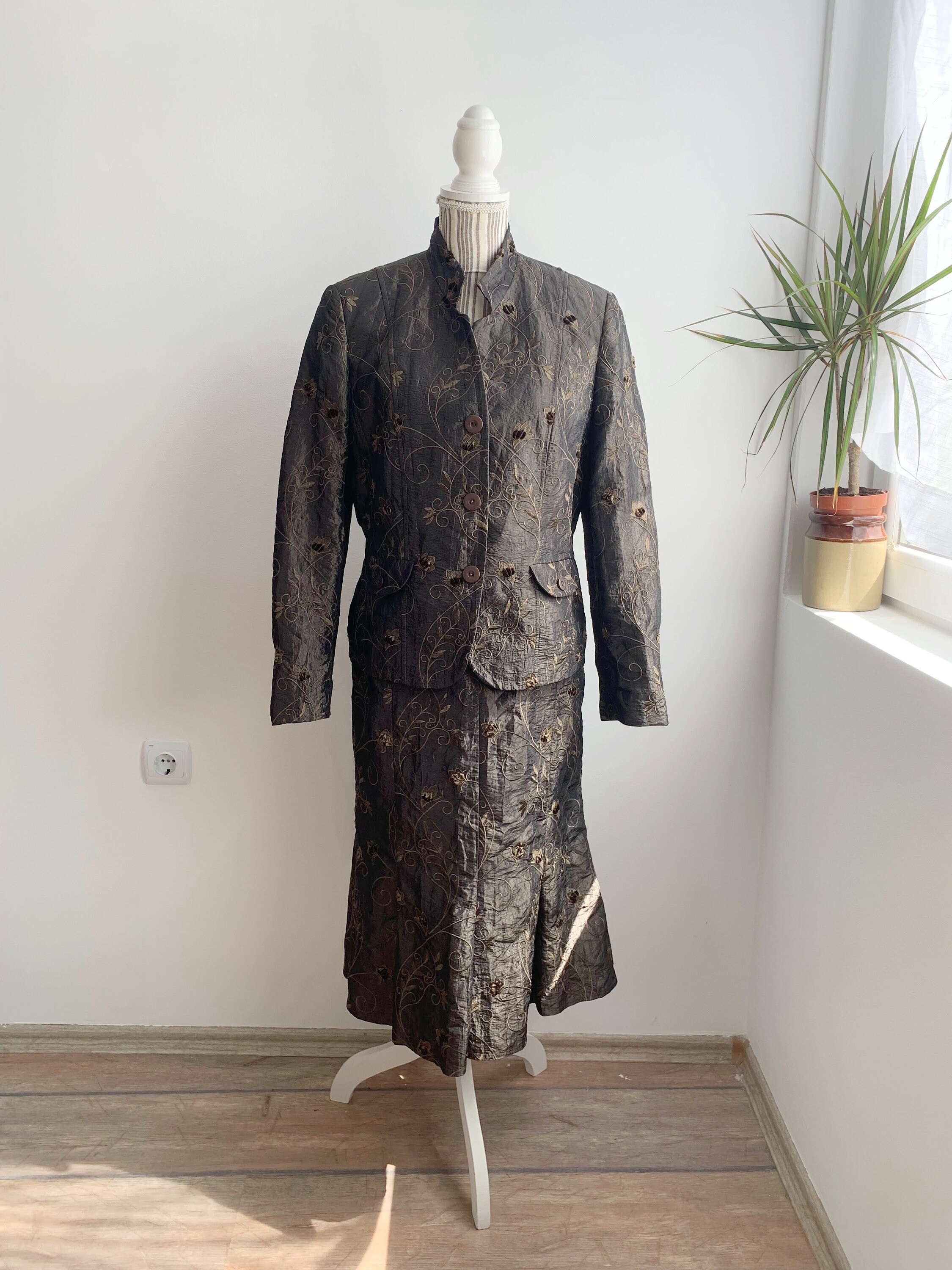 This is a wonderful Y2K blazer and skirt matching 2 piece set with tulip midi skirt and a blazer jacket in olive green bronze color with shiny satin finish and floral embroidery with velvet accents. This women suit set fits like size M/L. Please check the measurements below.