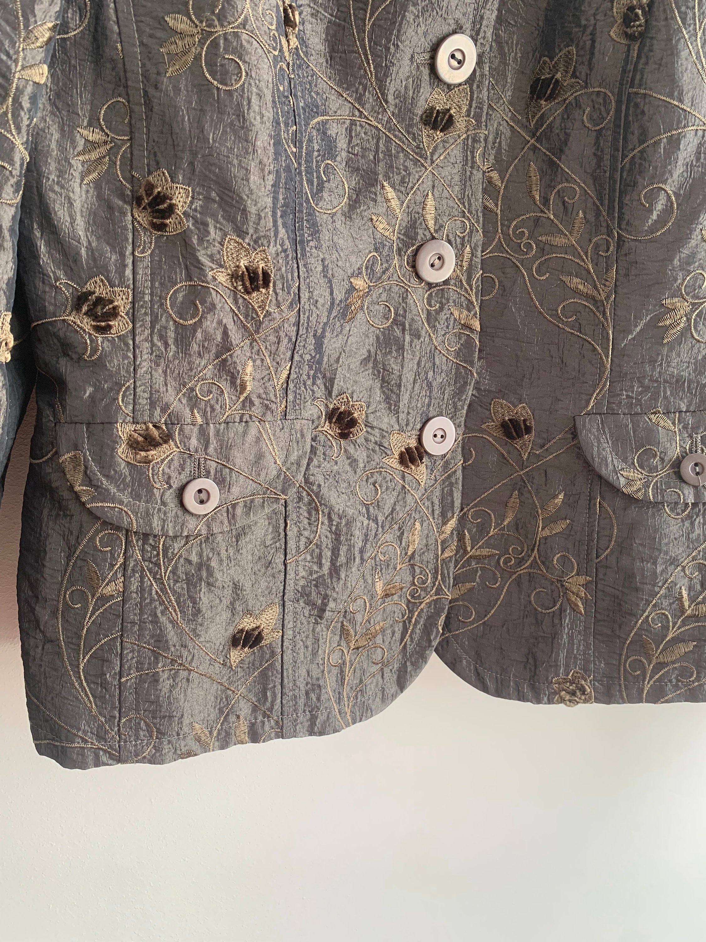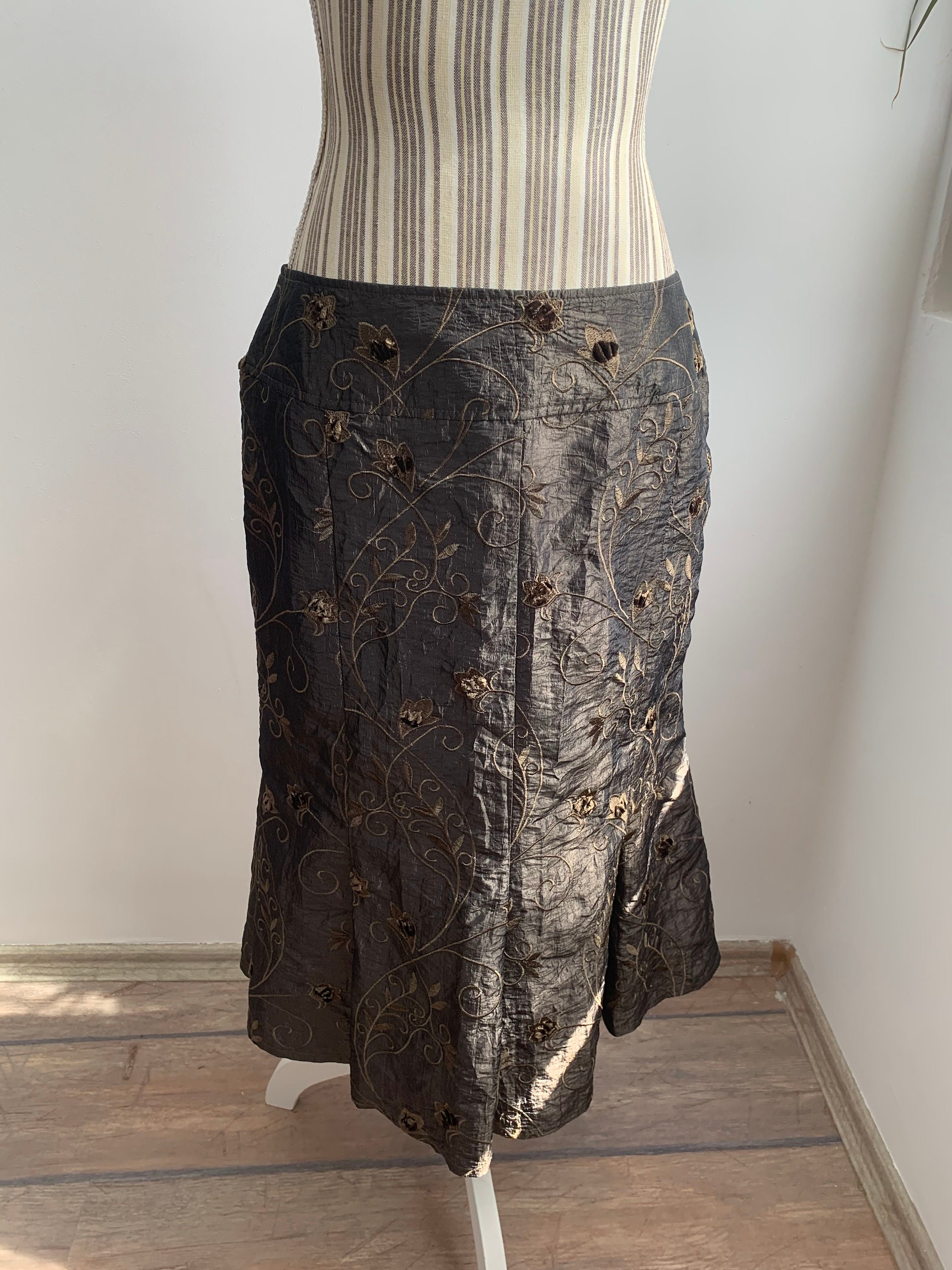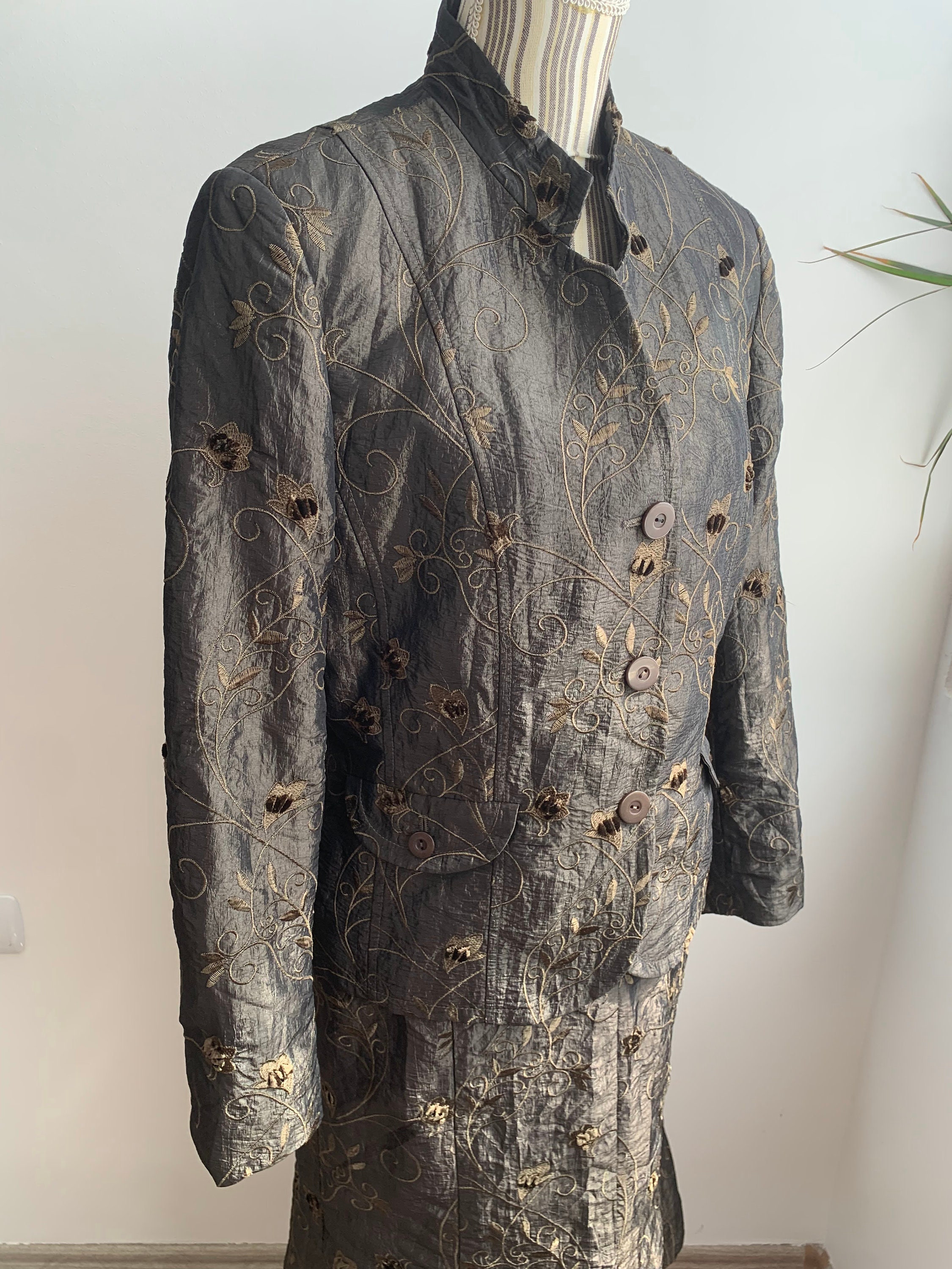 This is a wonderful Y2K blazer and skirt matching 2 piece set with tulip midi skirt and a blazer jacket in olive green bronze color with shiny satin finish and floral embroidery with velvet accents. This women suit set fits like size M/L. Please check the measurements below.