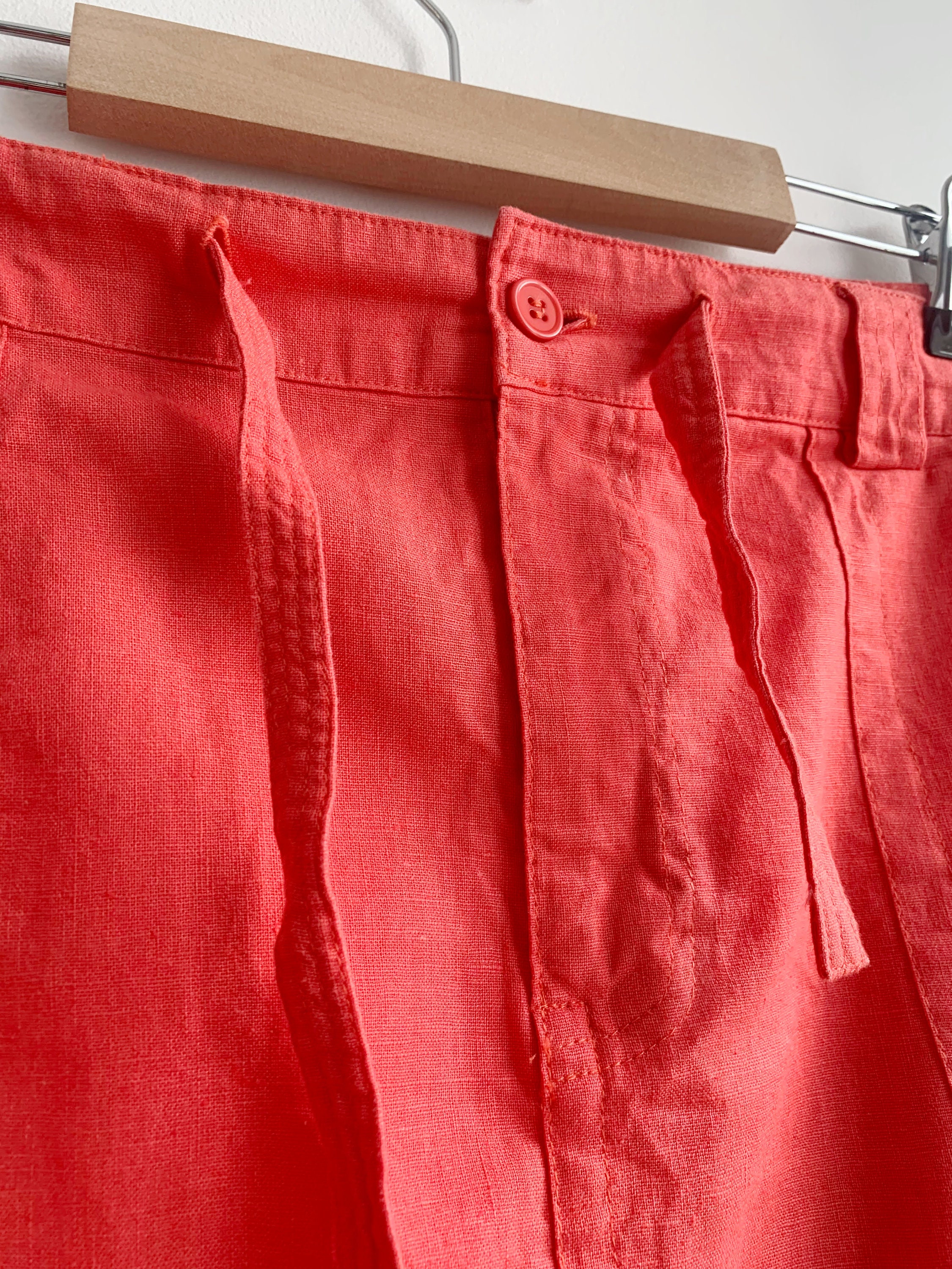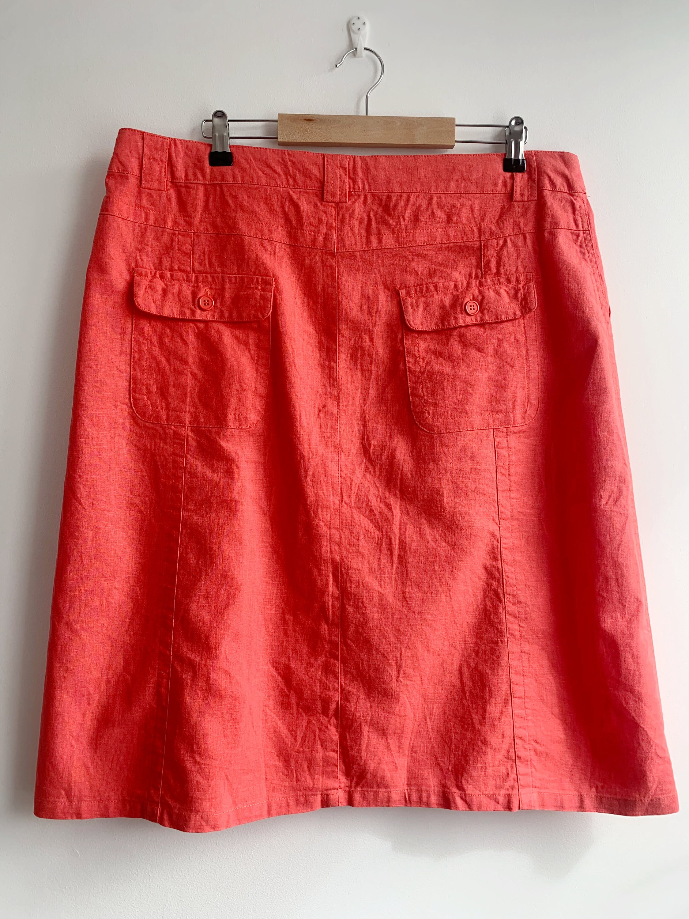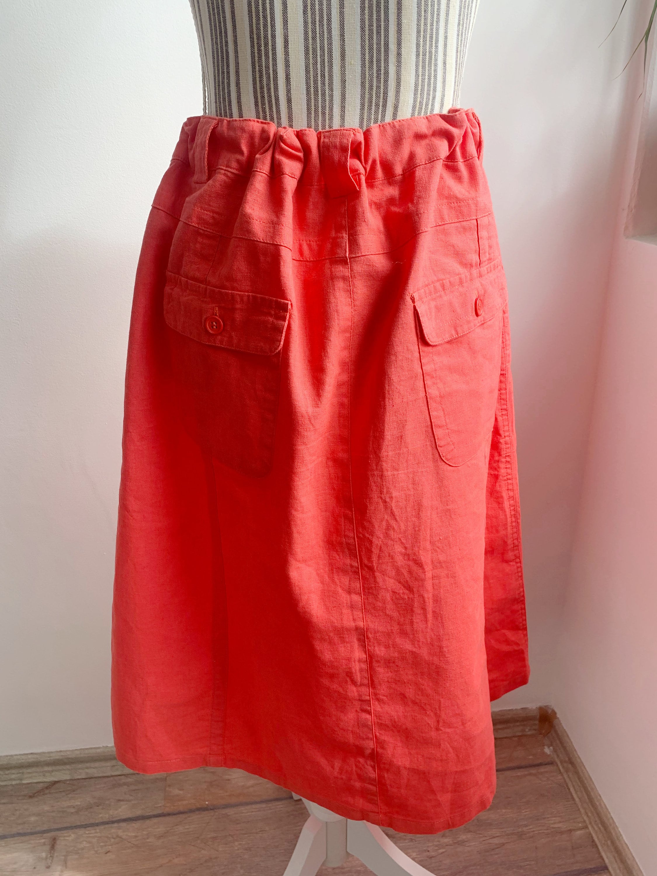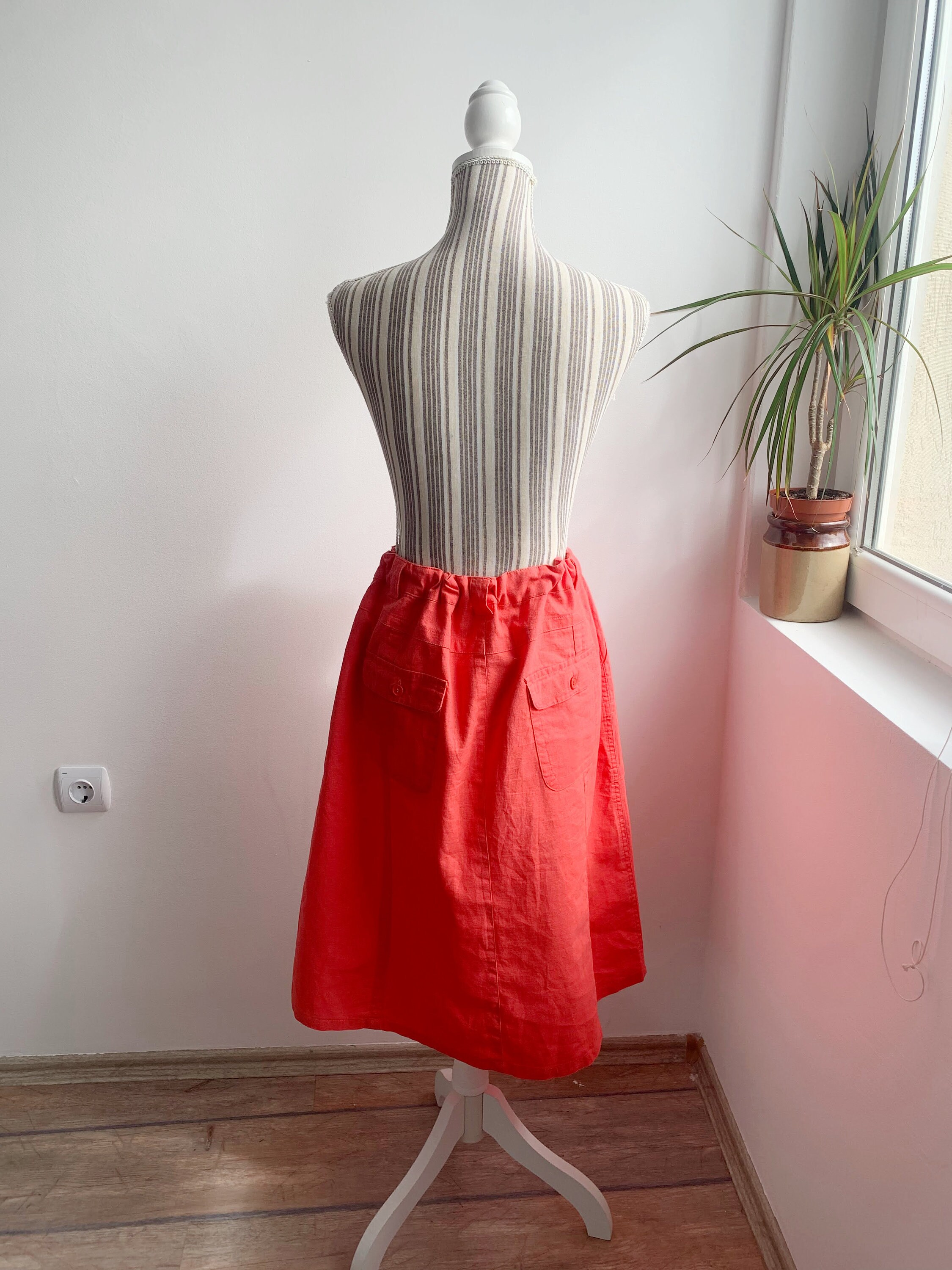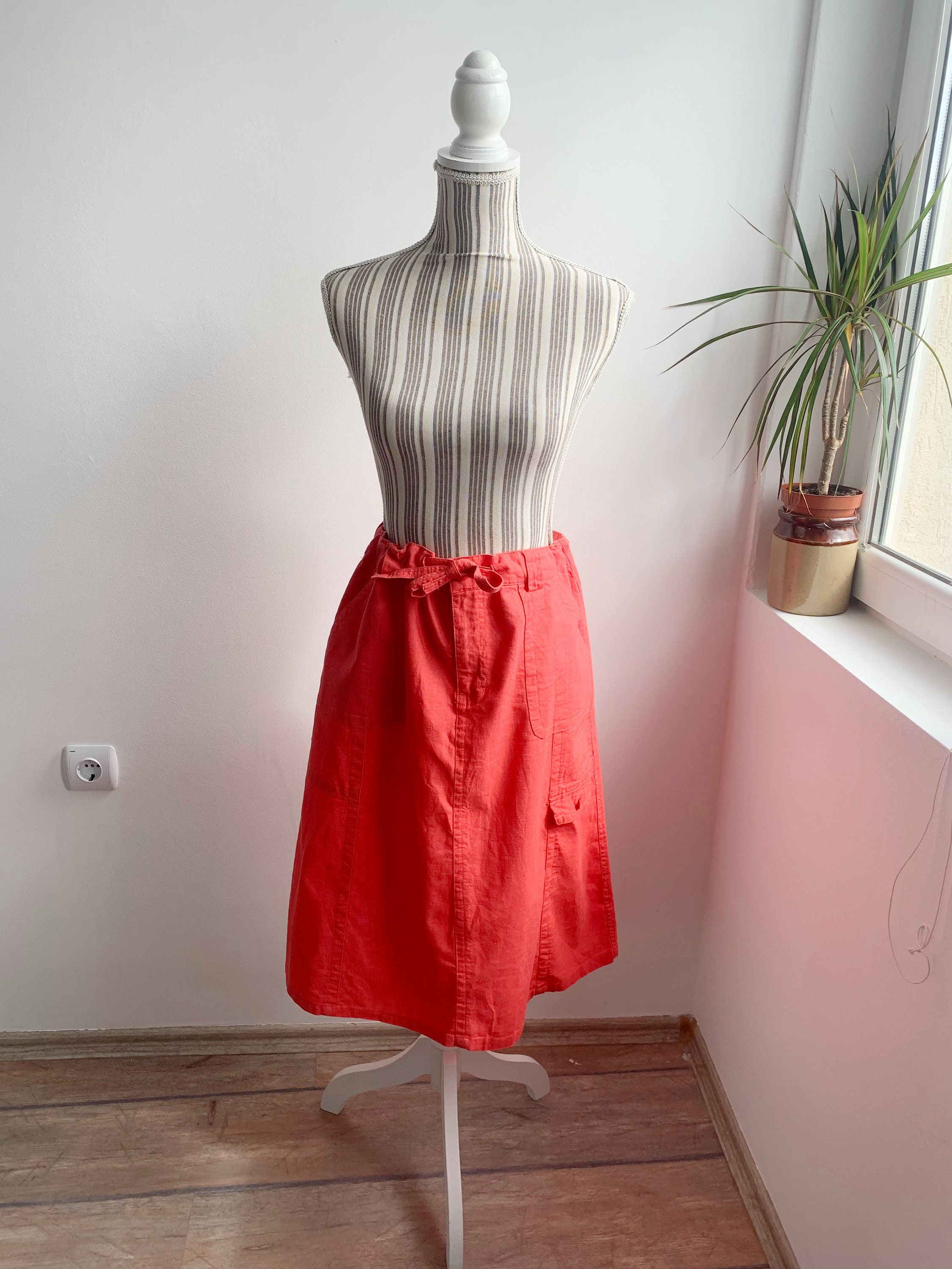 This is a casual linen cotton blend midi skirt in salmon orange color with front and back pockets and front zipper and button closure with drawstring belt. This simple linen skirt is made of 55% linen and 45% cotton, it has no lining underneath. The size marked is 44, it fits like XL. Please check the measurements below.