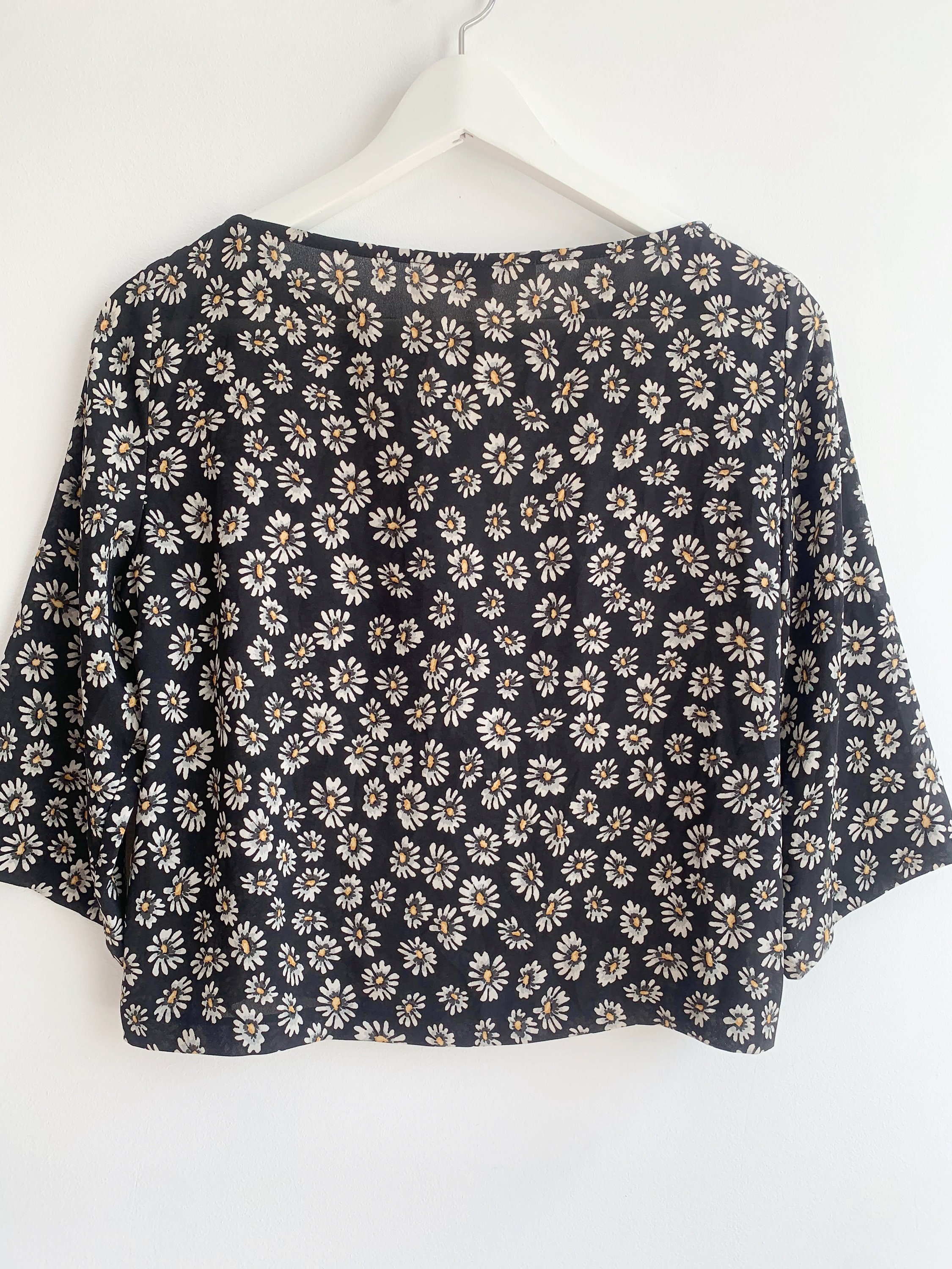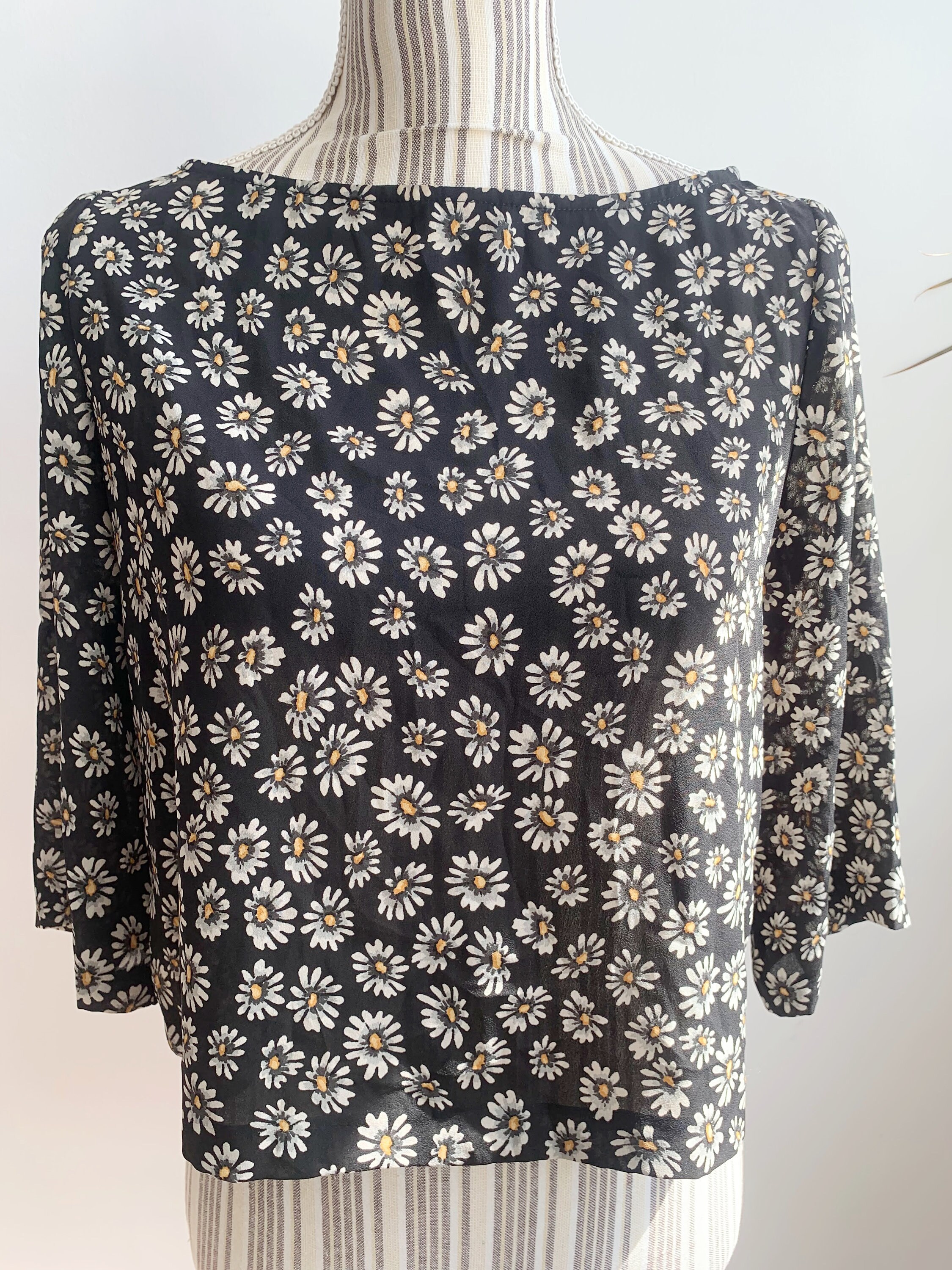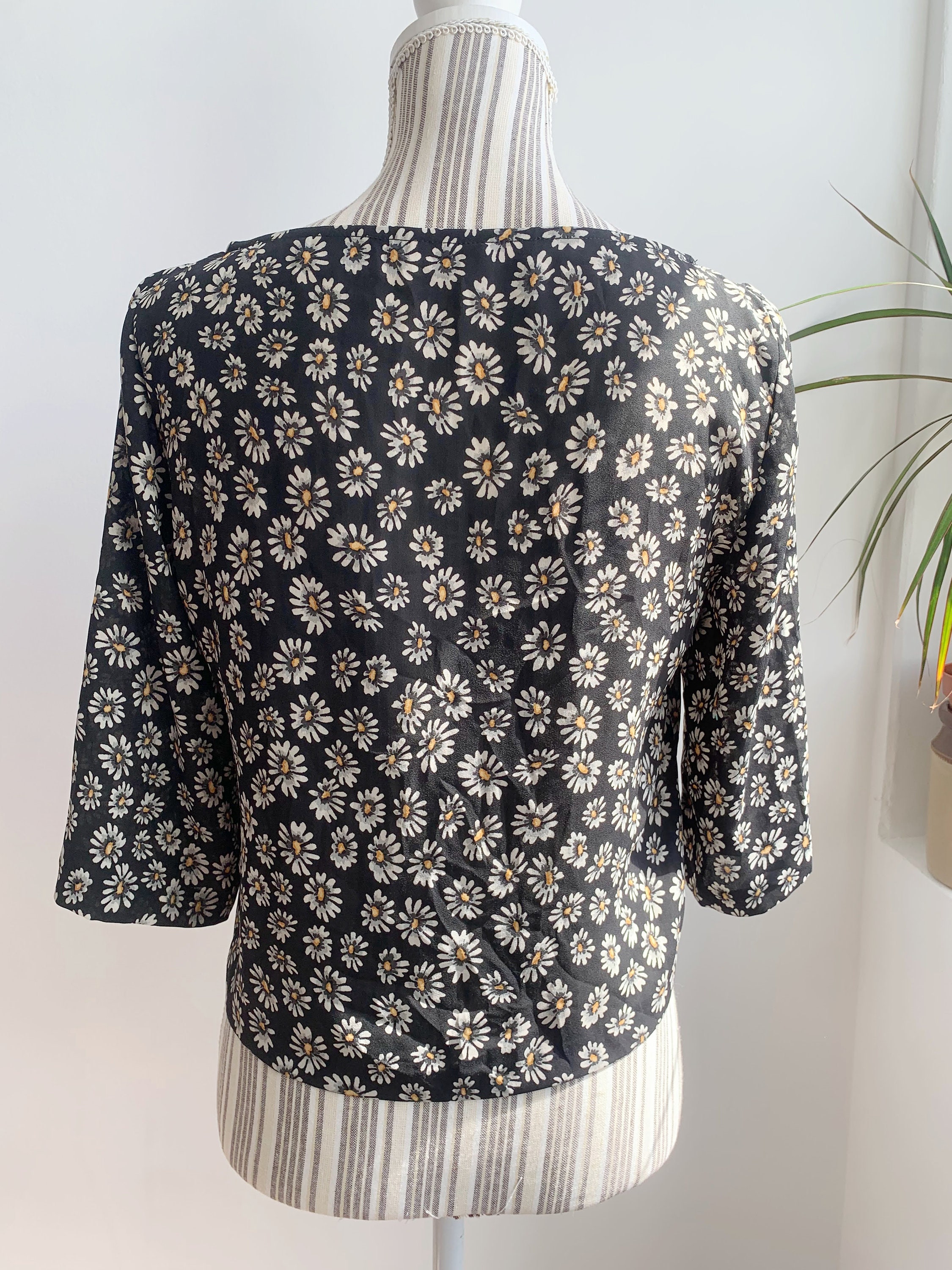 This is a lovely vintage Y2K semi sheer black top for women with floral daily print. It is made of lightweight polyester fabric. This semi transparent top can be worn as a beach cover up or as a dress shirt with a cami underneath. This grunge crop top has hald sleeves and scoop neck. It has a cropped sihouette. The size marked is 38, which fits like S. The fabric feels like light polyester fabric. It has no stretch. Beautiful vintage blouse that will add some feminine look to your closet.