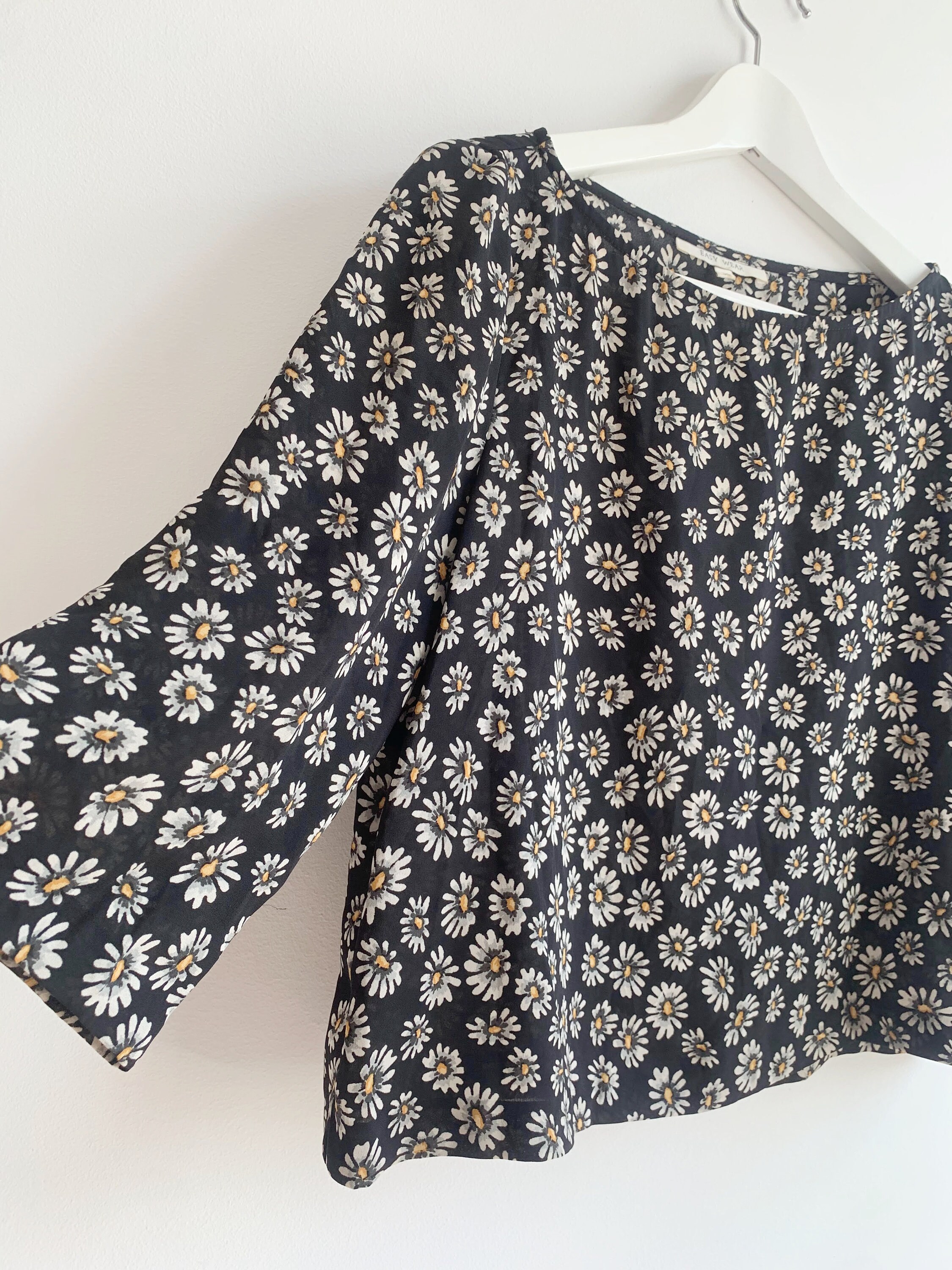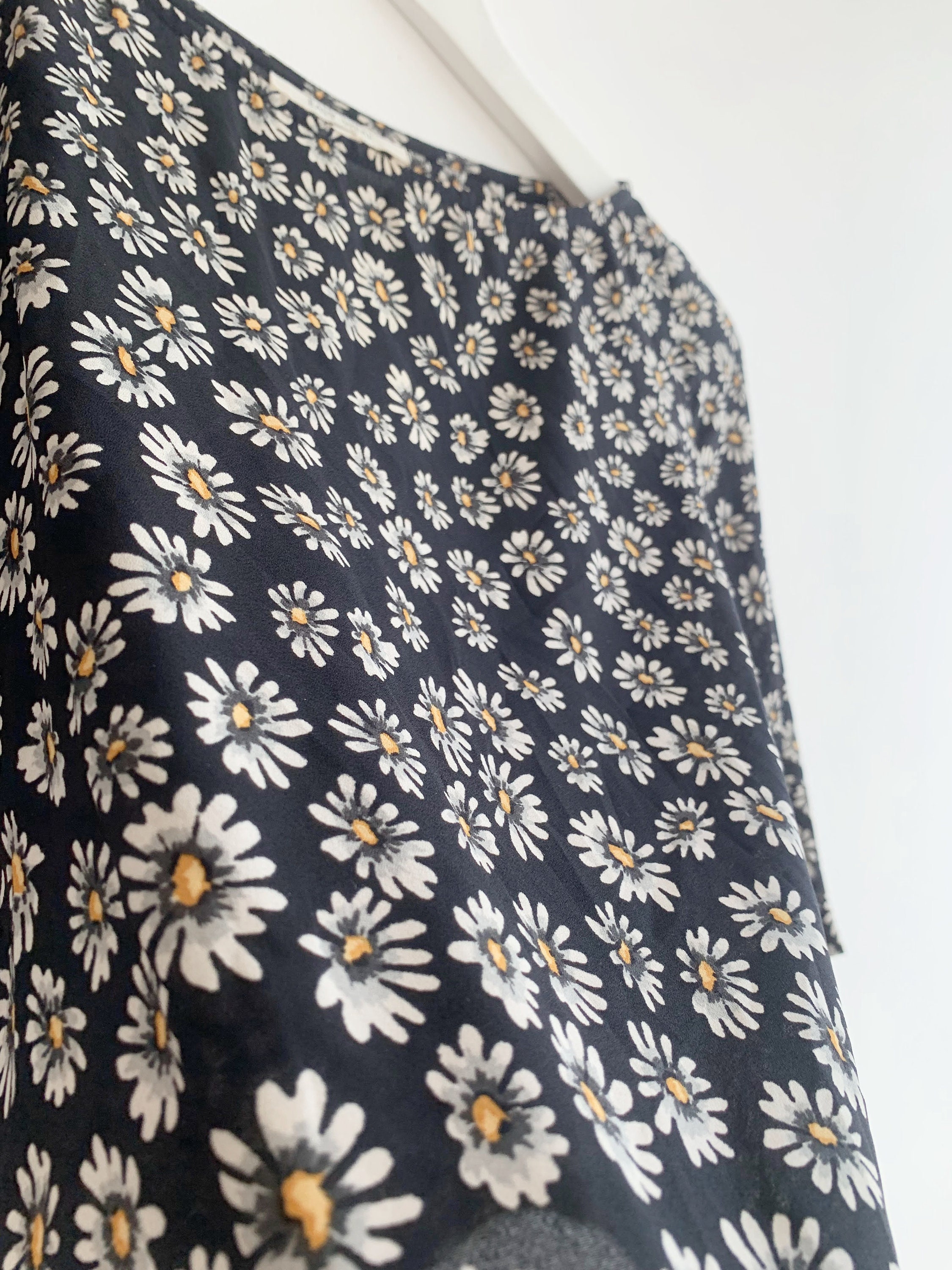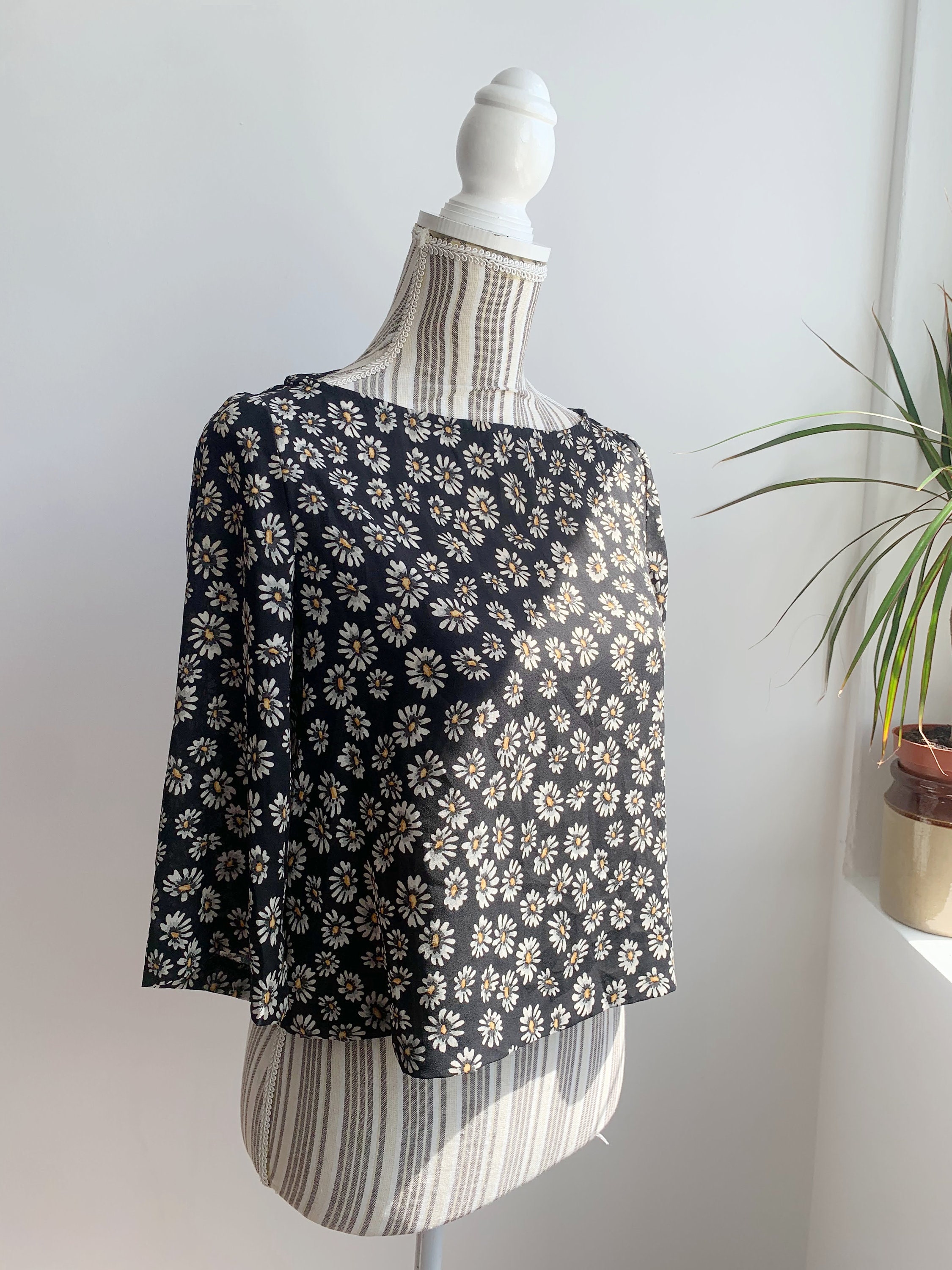 This is a lovely vintage Y2K semi sheer black top for women with floral daily print. It is made of lightweight polyester fabric. This semi transparent top can be worn as a beach cover up or as a dress shirt with a cami underneath. This grunge crop top has hald sleeves and scoop neck. It has a cropped sihouette. The size marked is 38, which fits like S. The fabric feels like light polyester fabric. It has no stretch. Beautiful vintage blouse that will add some feminine look to your closet.