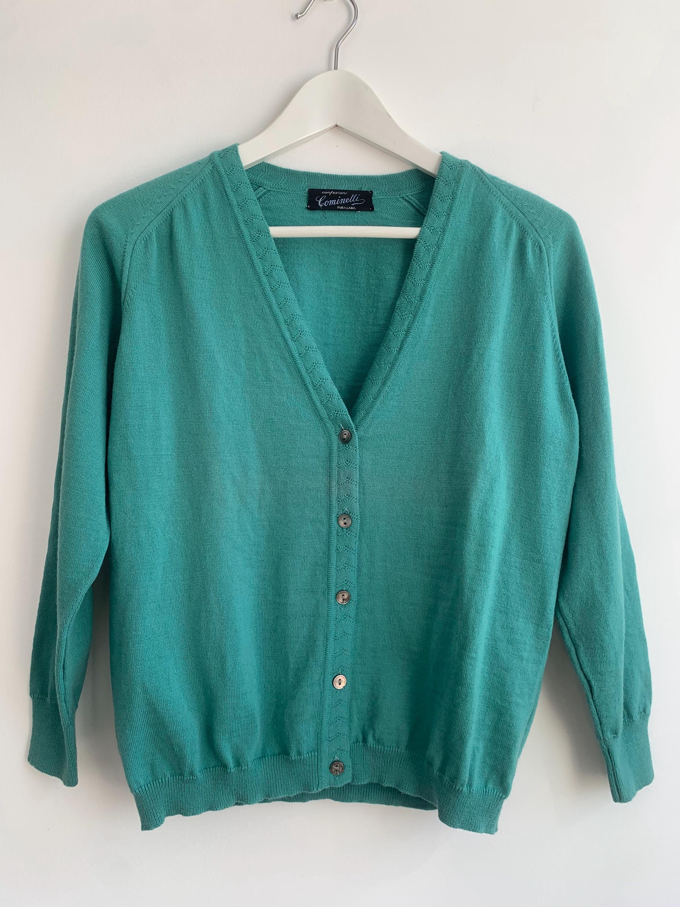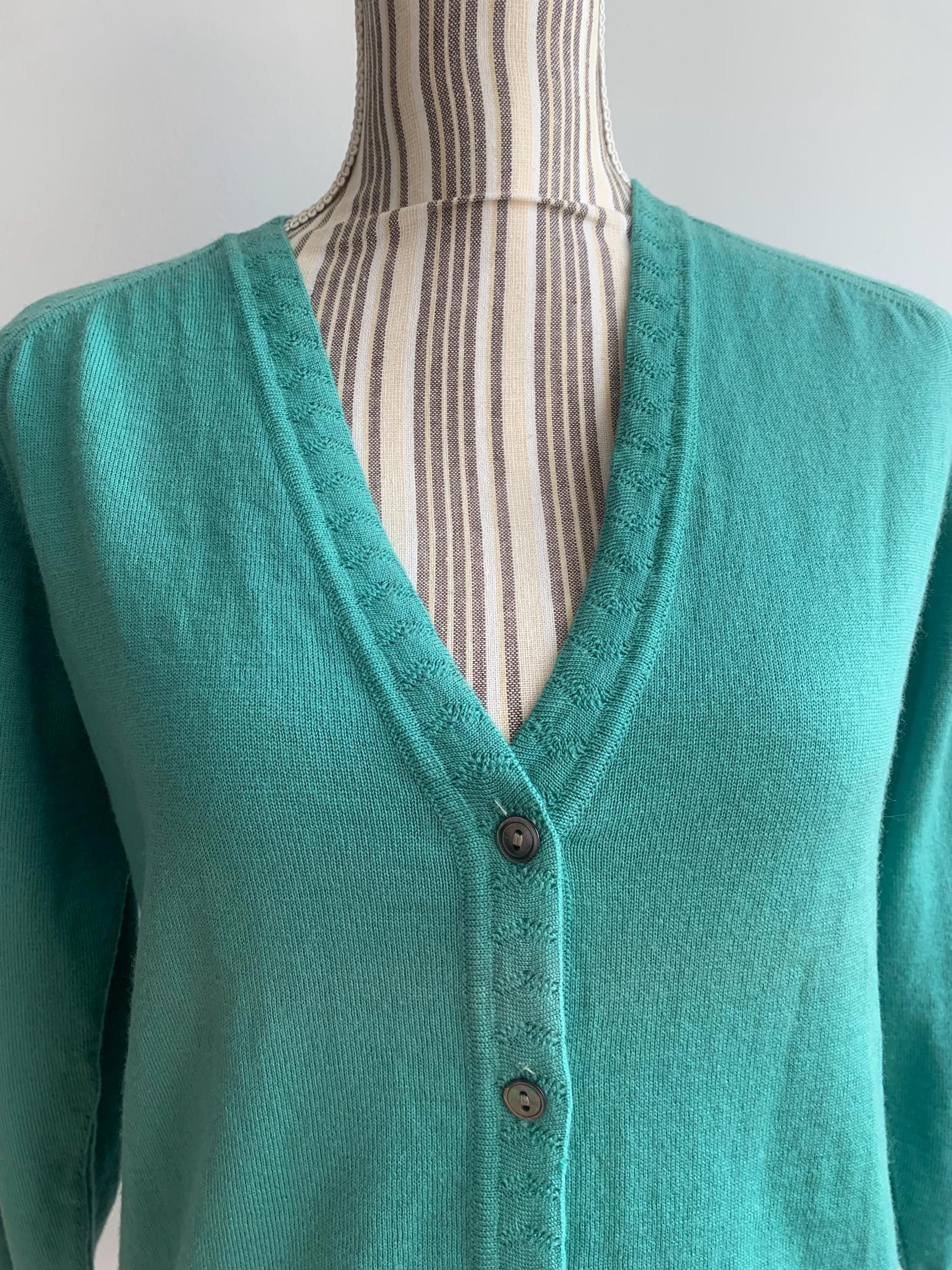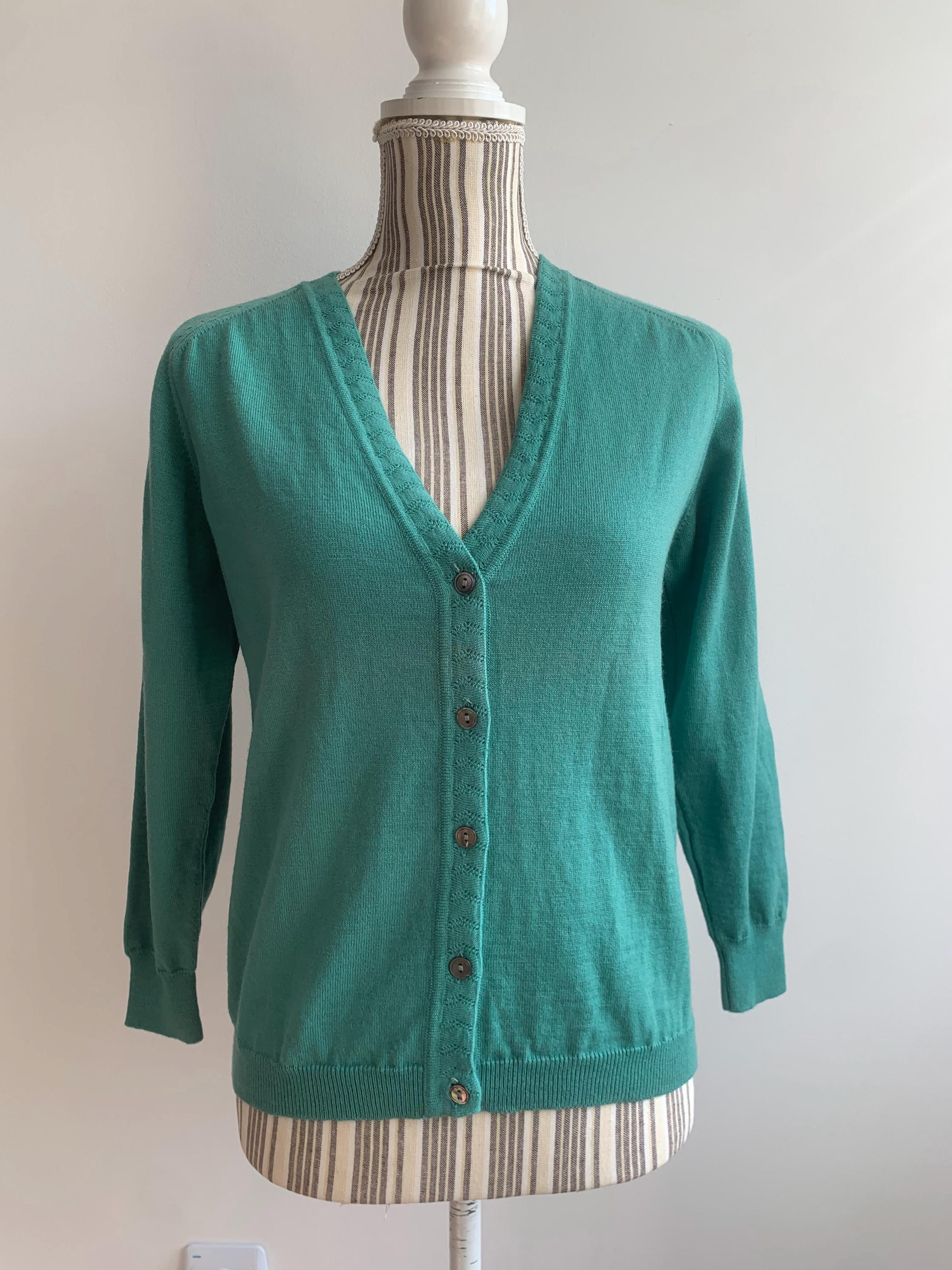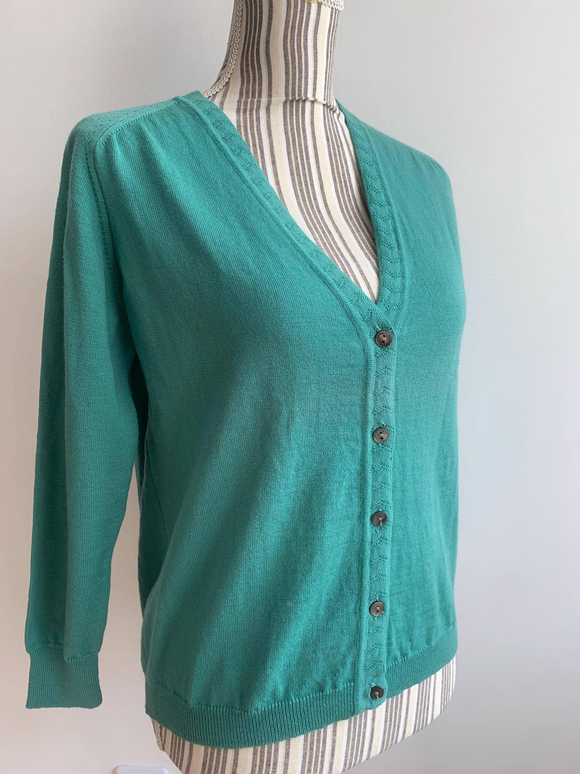 Check out this gorgeous vintage 80s teal pure wool sweater delicate knitted pattern and button front closure. This warm and cozy pure wool cardigan is made of soft pure wool knitted fabric which is warm and cozy. This soft wool cardigan has a relaxed cropped silhouette with bracelet sleeve. This knitted cardigan is so romantic, perfect to pair with boho chic dresses or midi skirts. It fits like size S