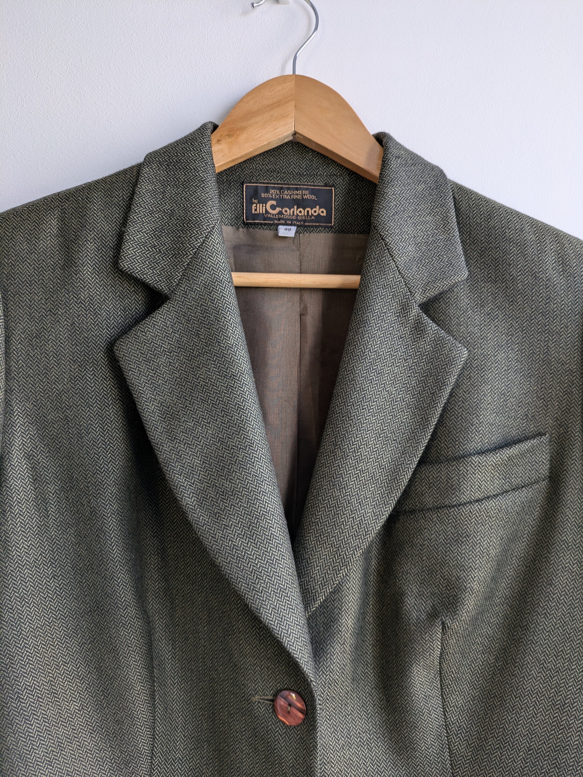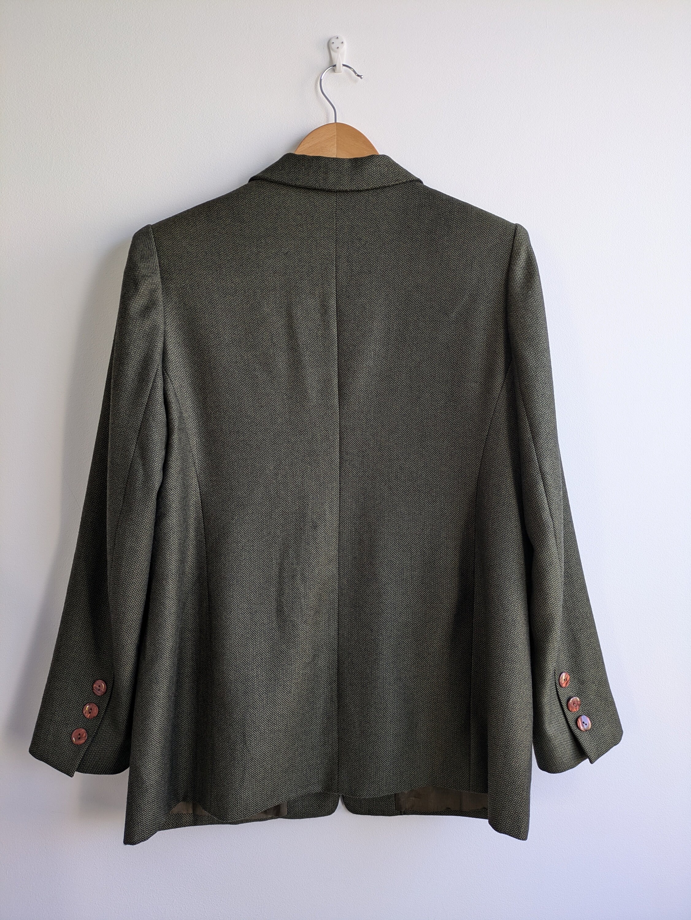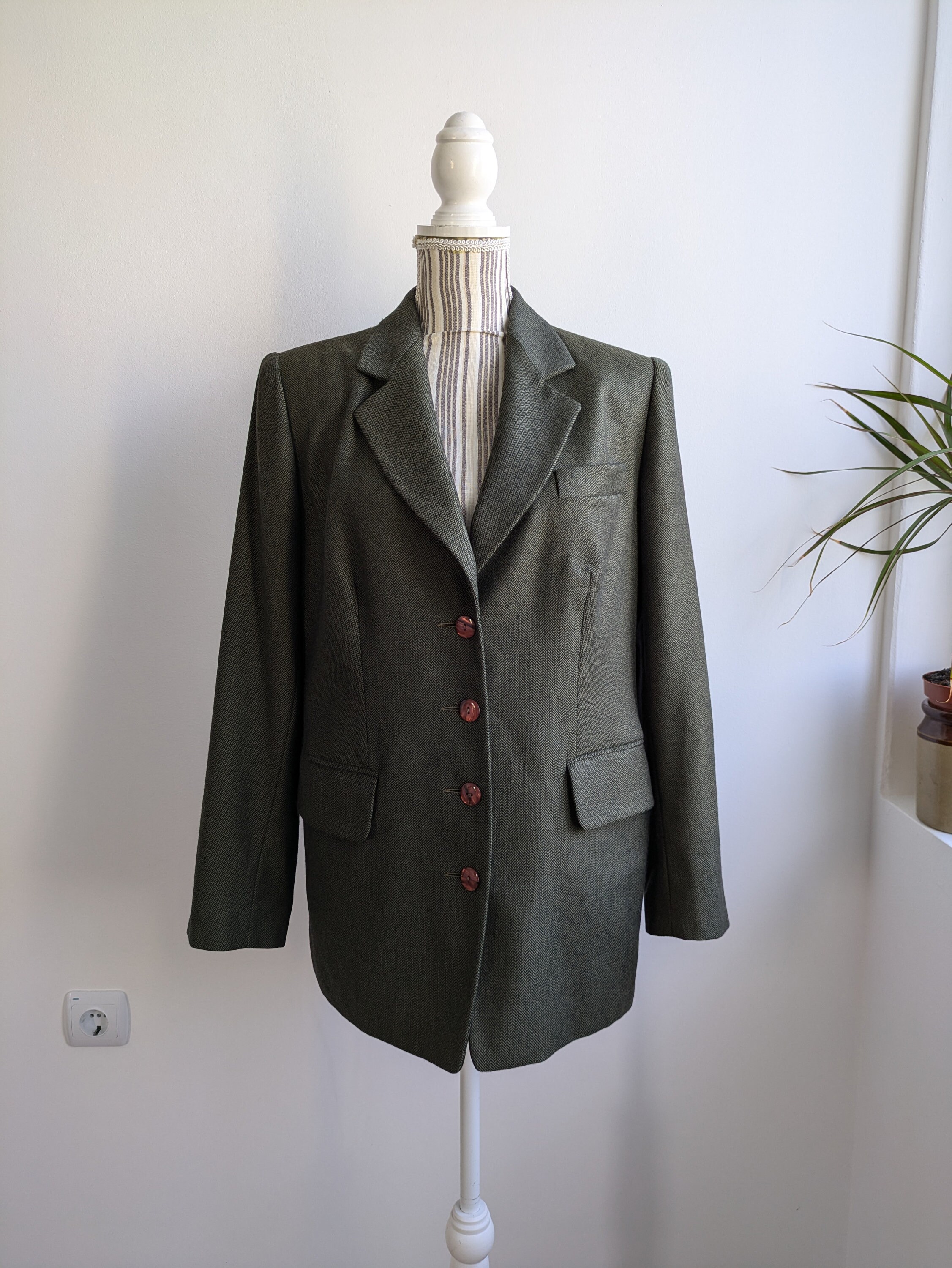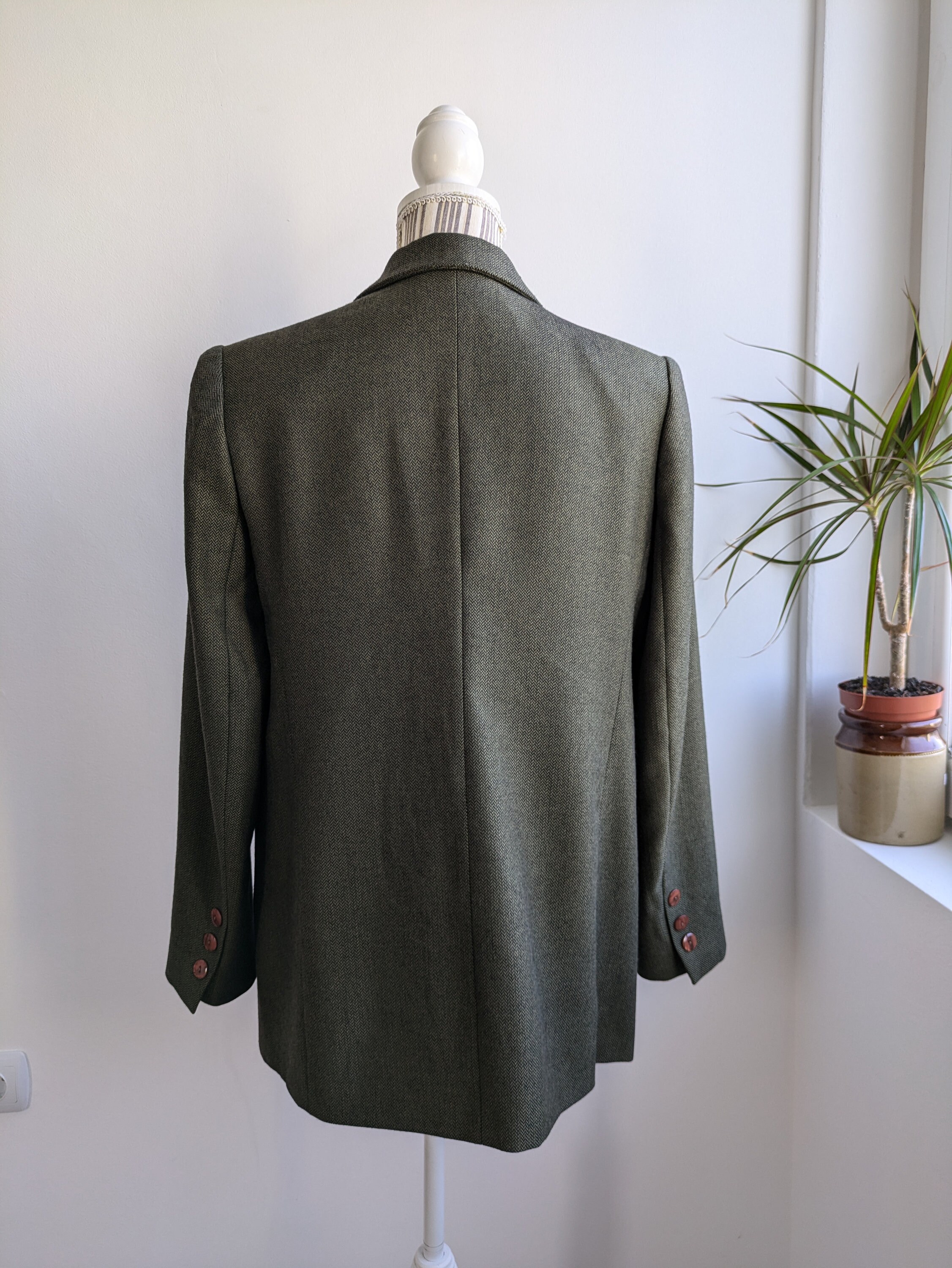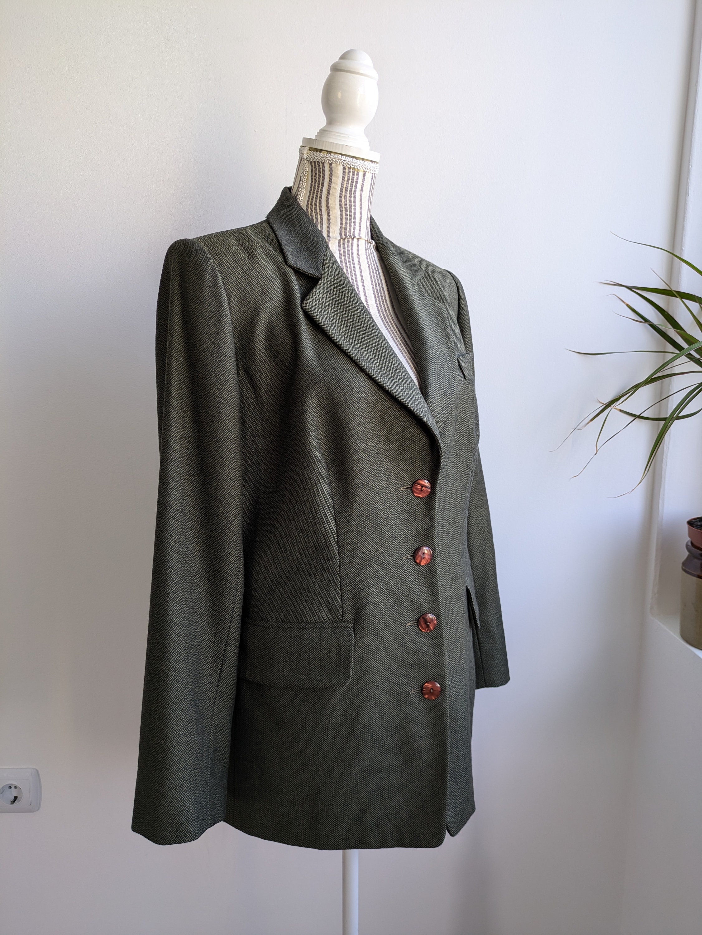 This is s beautiful vintage 90s simple minimalist tweed herringbone blazer for women in beautiful olive green color. This tweed blazer coat has button front closure and two flap pockets and a small chest pocket. This tweed blazer jacket is made of cozy warm wool blend tweed fabric - 20% cashmere and 80 % pure extra fine wool. It has polyester lining. This grey herringbone blazer is perfect for the fall spring season. You can also wear it in the warmer winter days with an oversized scarf and a warm hat. This relaxed fit blazer coat is size 40. It fits like size M/ L women's. Please check the measurements below.