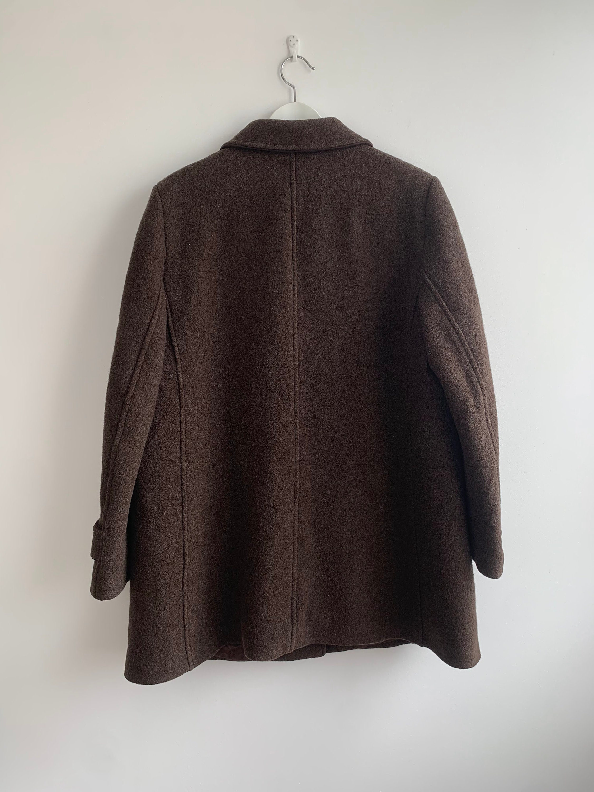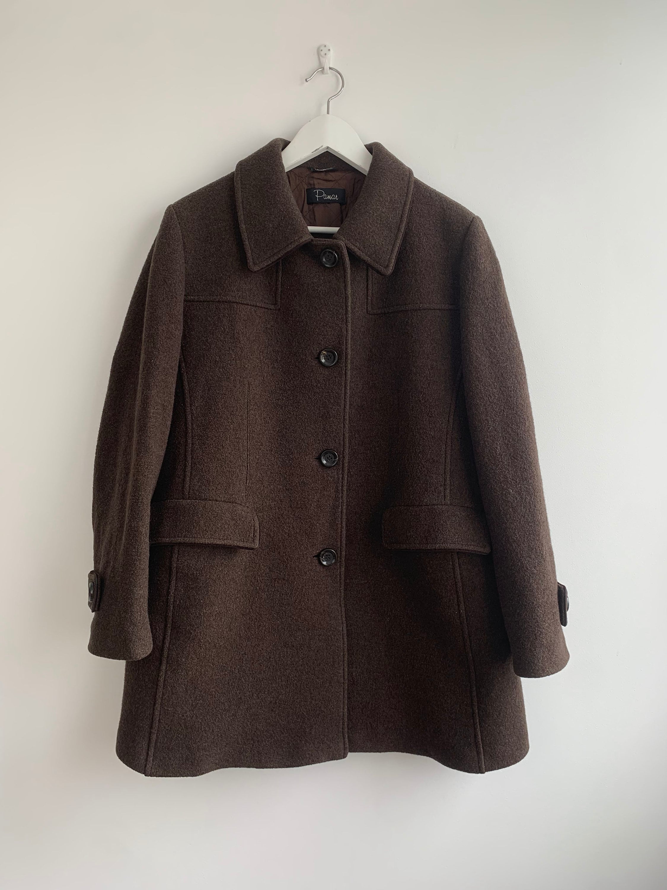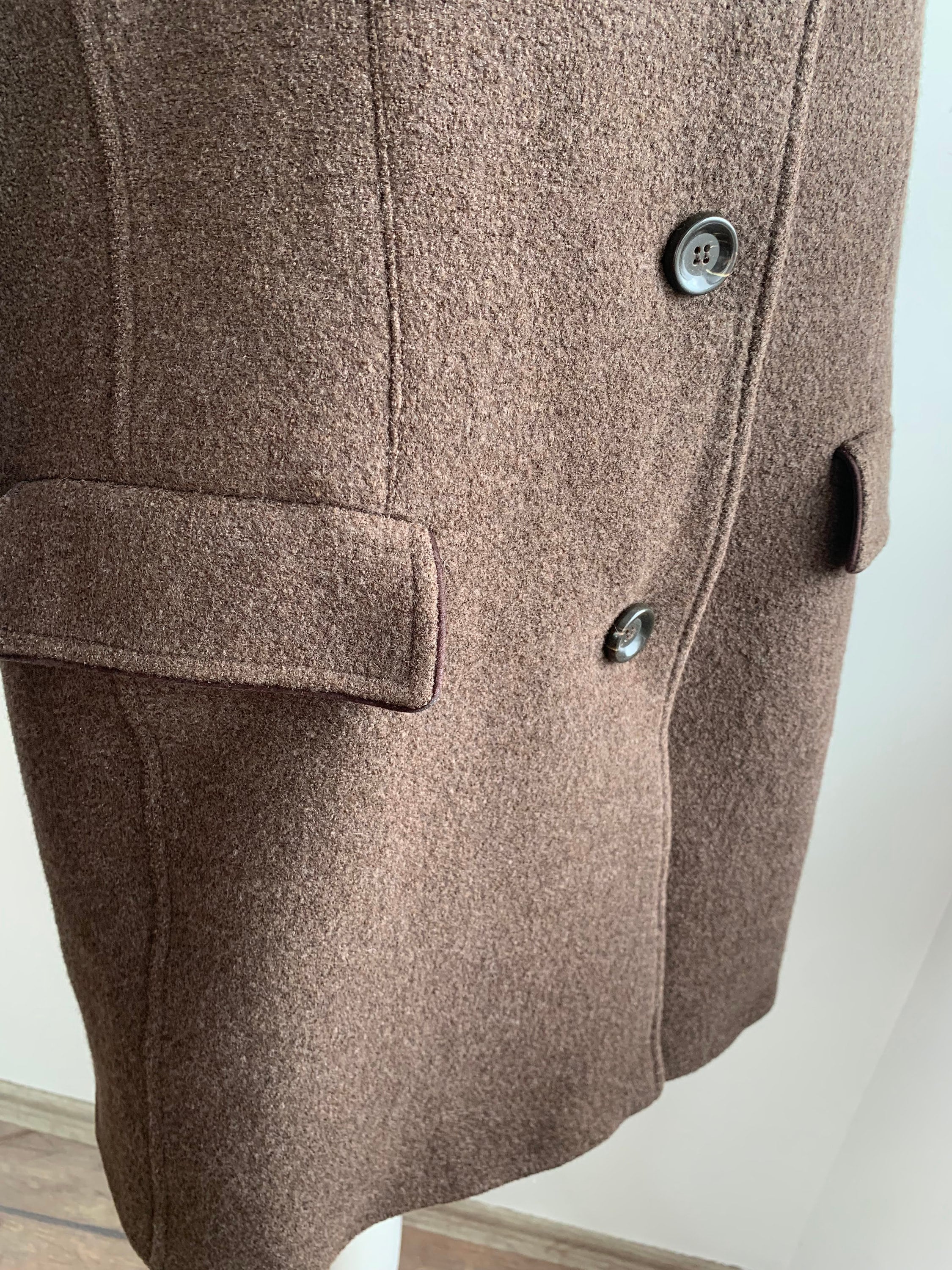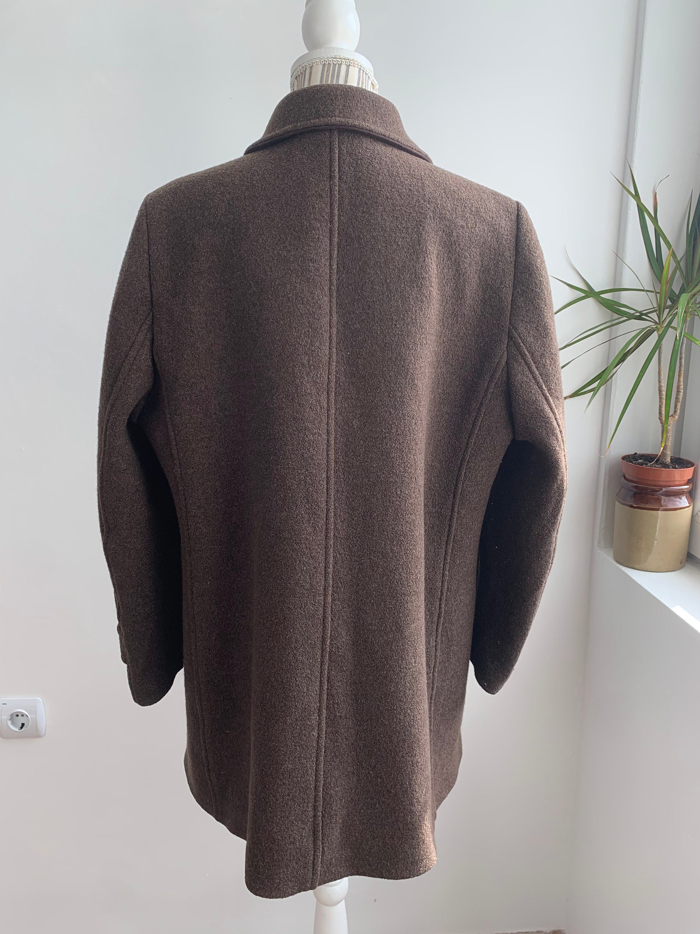 This is s beautiful vintage pure wool coat for women by Pamar Italy. It is is warm brown color. This classic warm winter coat is made of 100% wool. This menswear style overcoat has viscose lining. It has front single- breasted button closure and two side pockets. This long line wool coat has midi length to about the knees, depending on your hight. This long wool coat has size 49 marked on it. It fits like size L. Please check the measurements below.