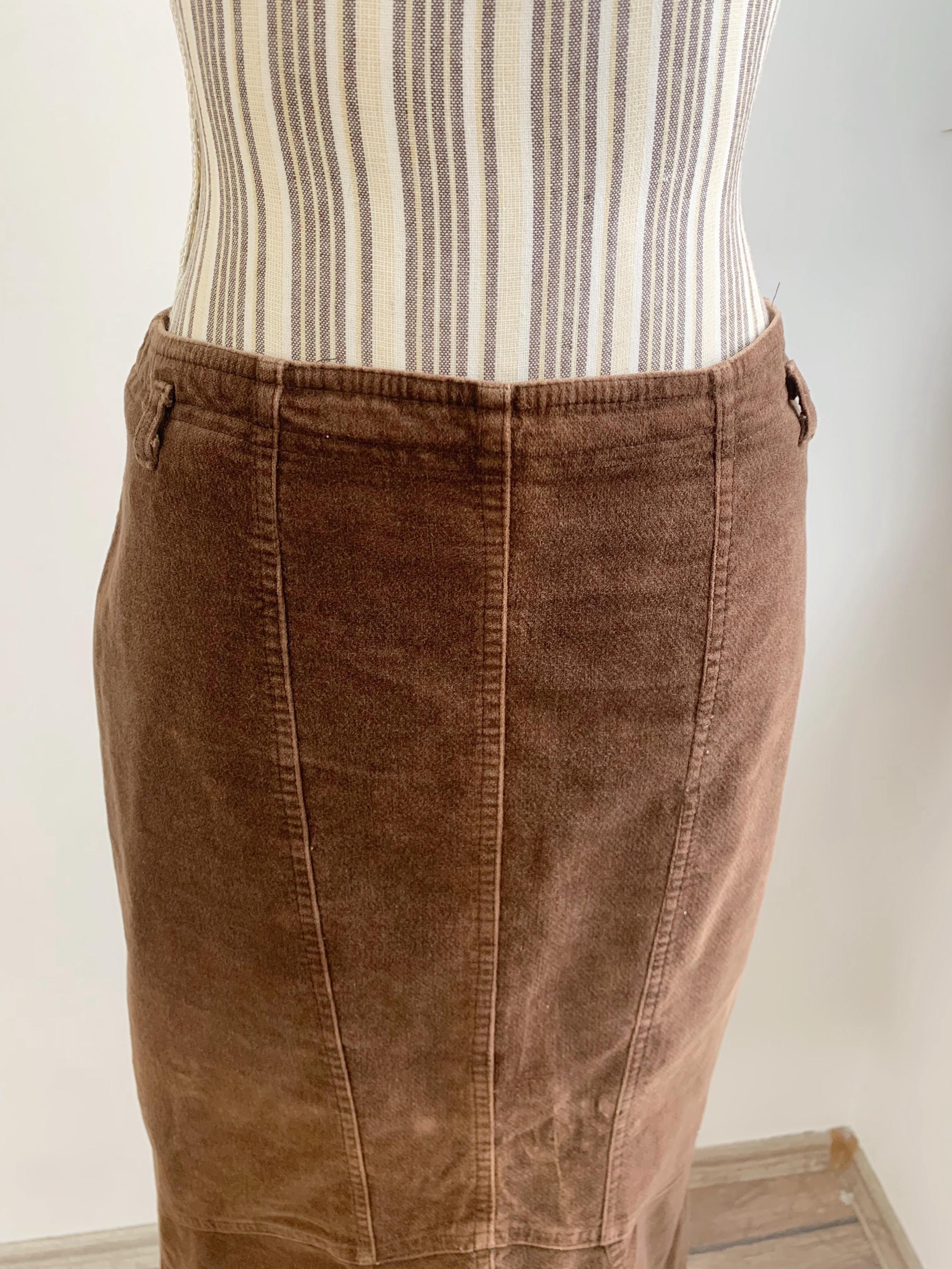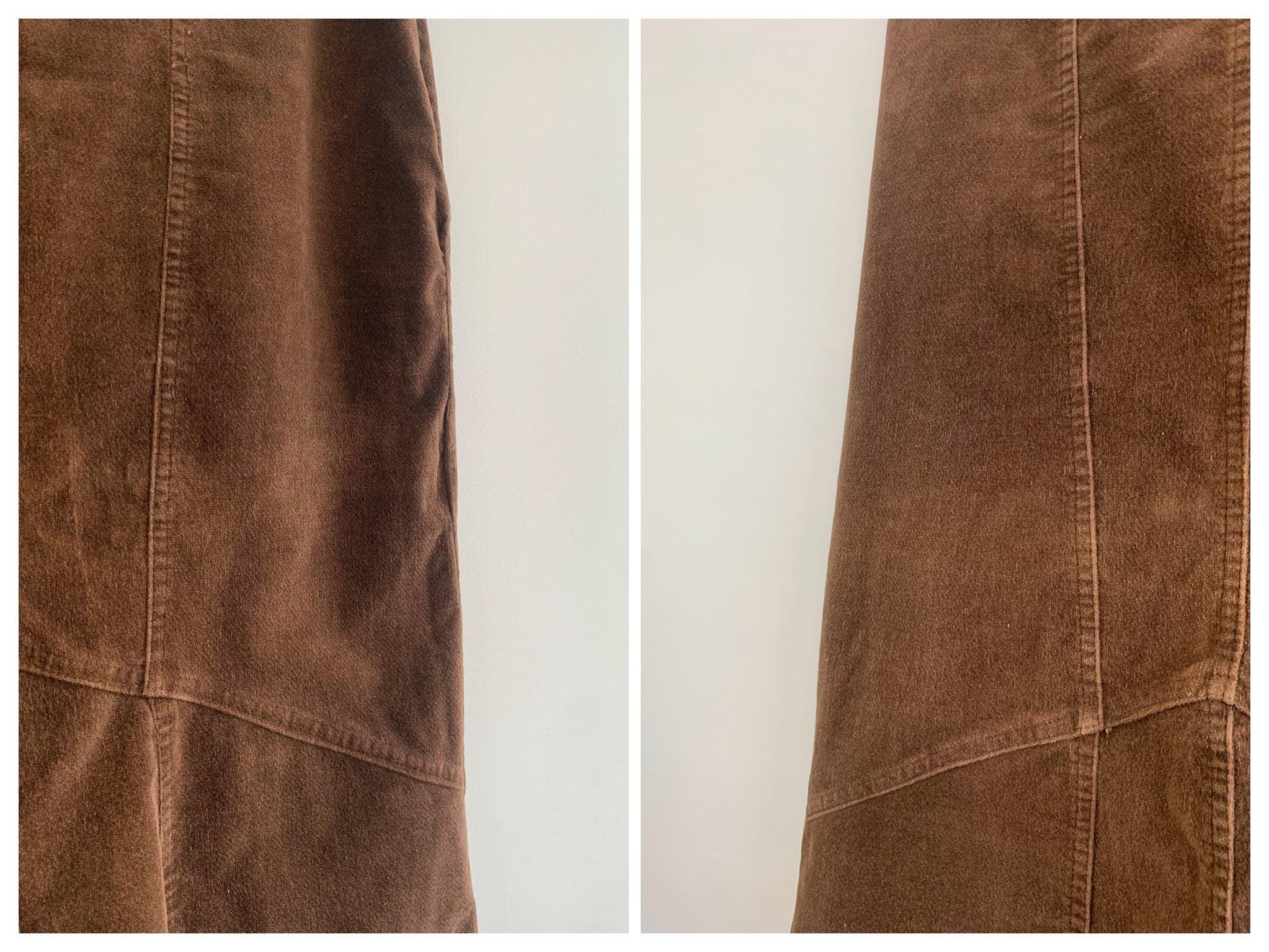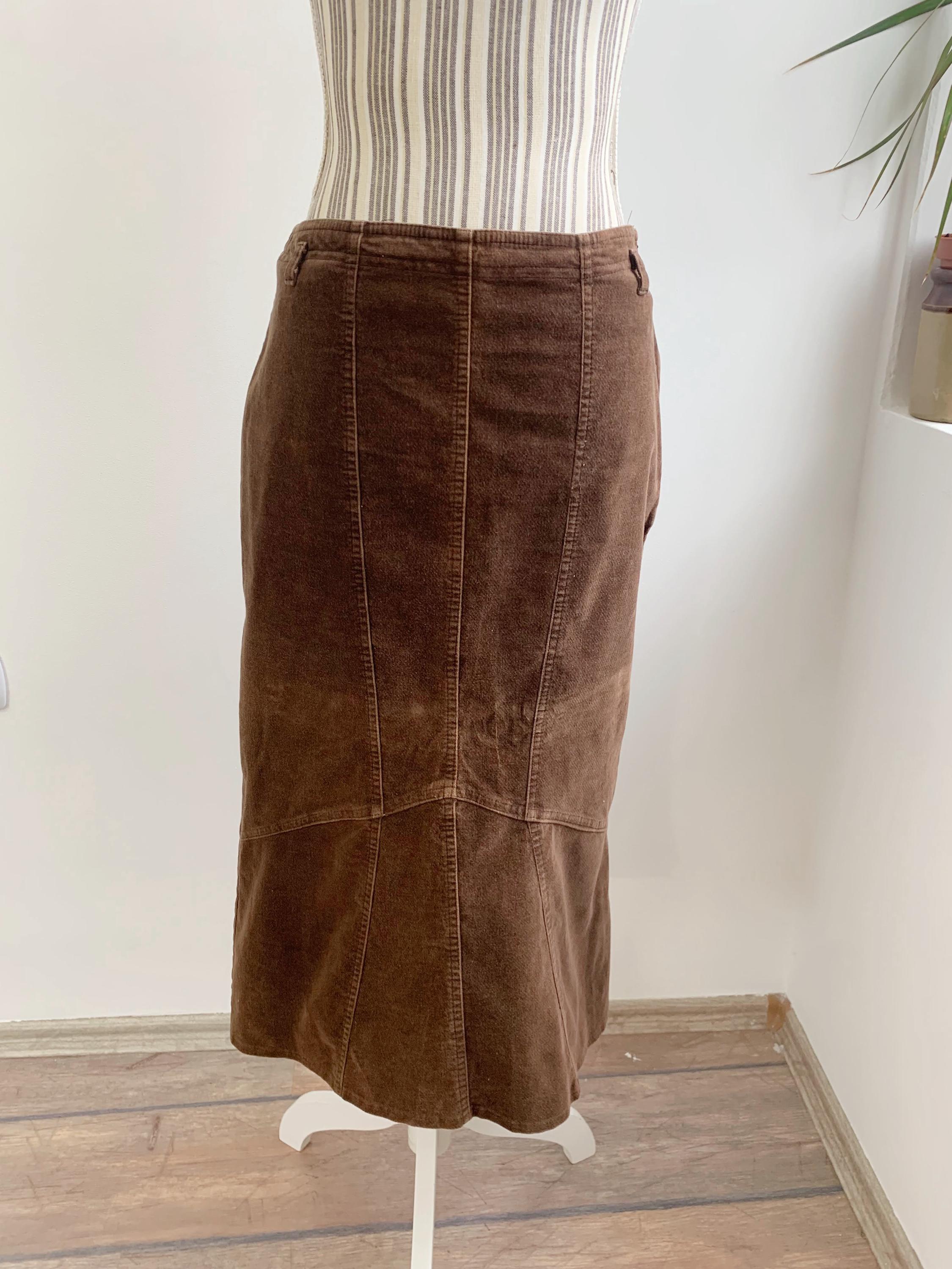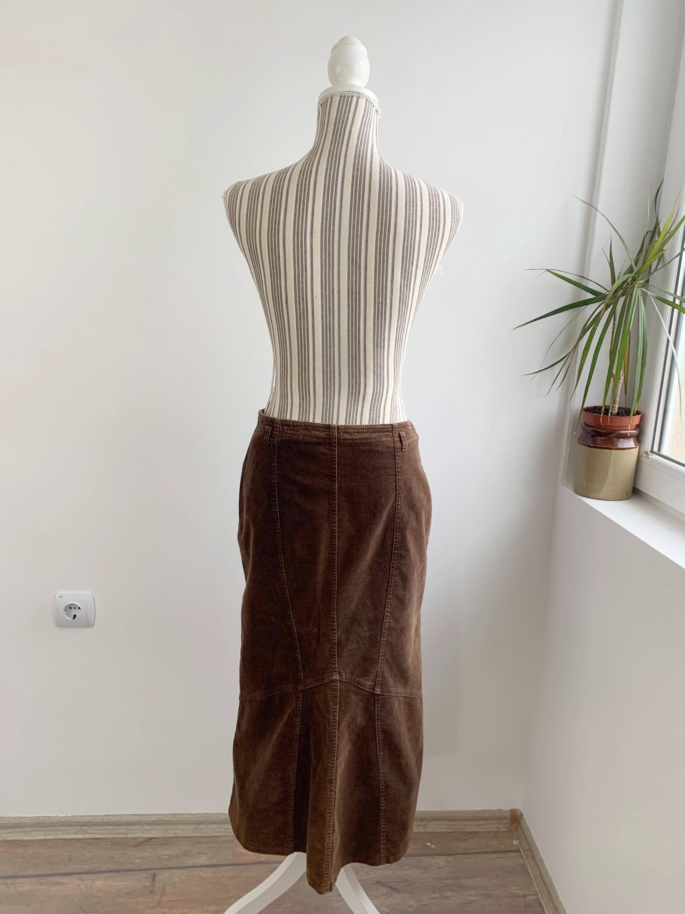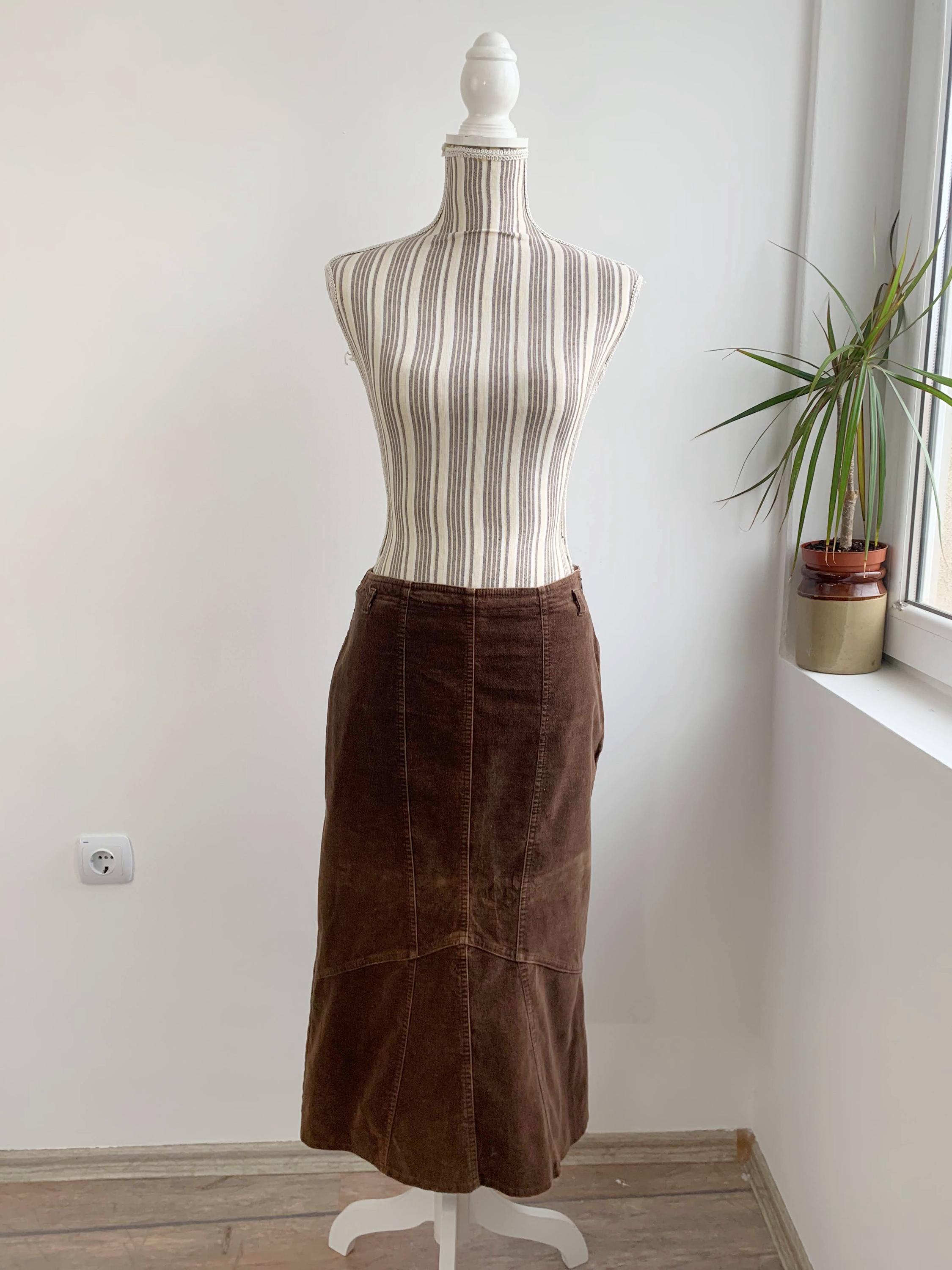 This is a vintage 90s brown cotton corduroy skirt for women made of soft and warm velvet corduroy fabric made of 97% cotton and 3% elastane. This long asymmetrical skirt has fitted silhouette which flares at the bottom. This autumn grunge midi skirt fits like size S or M. Please check the measurements below.