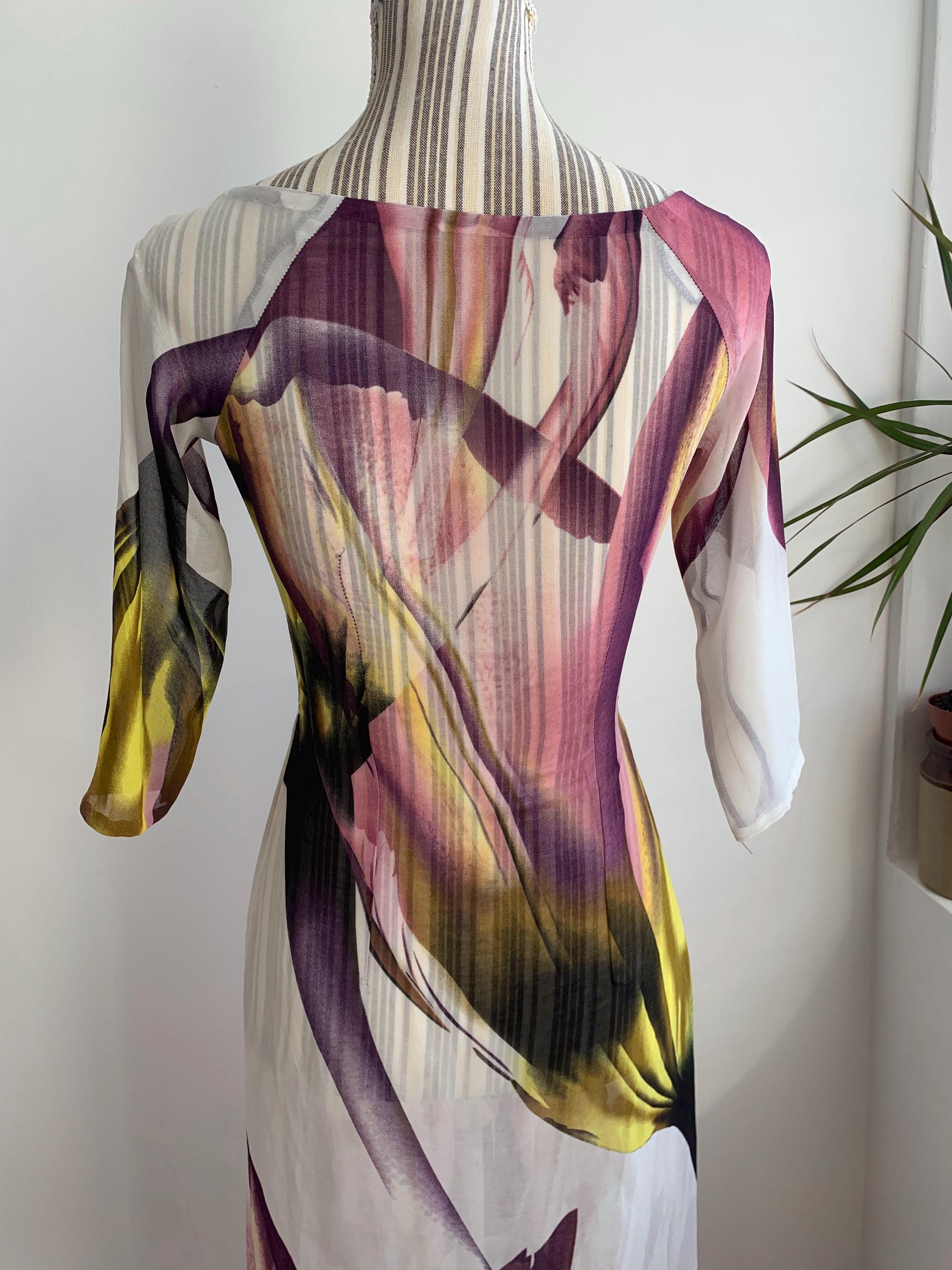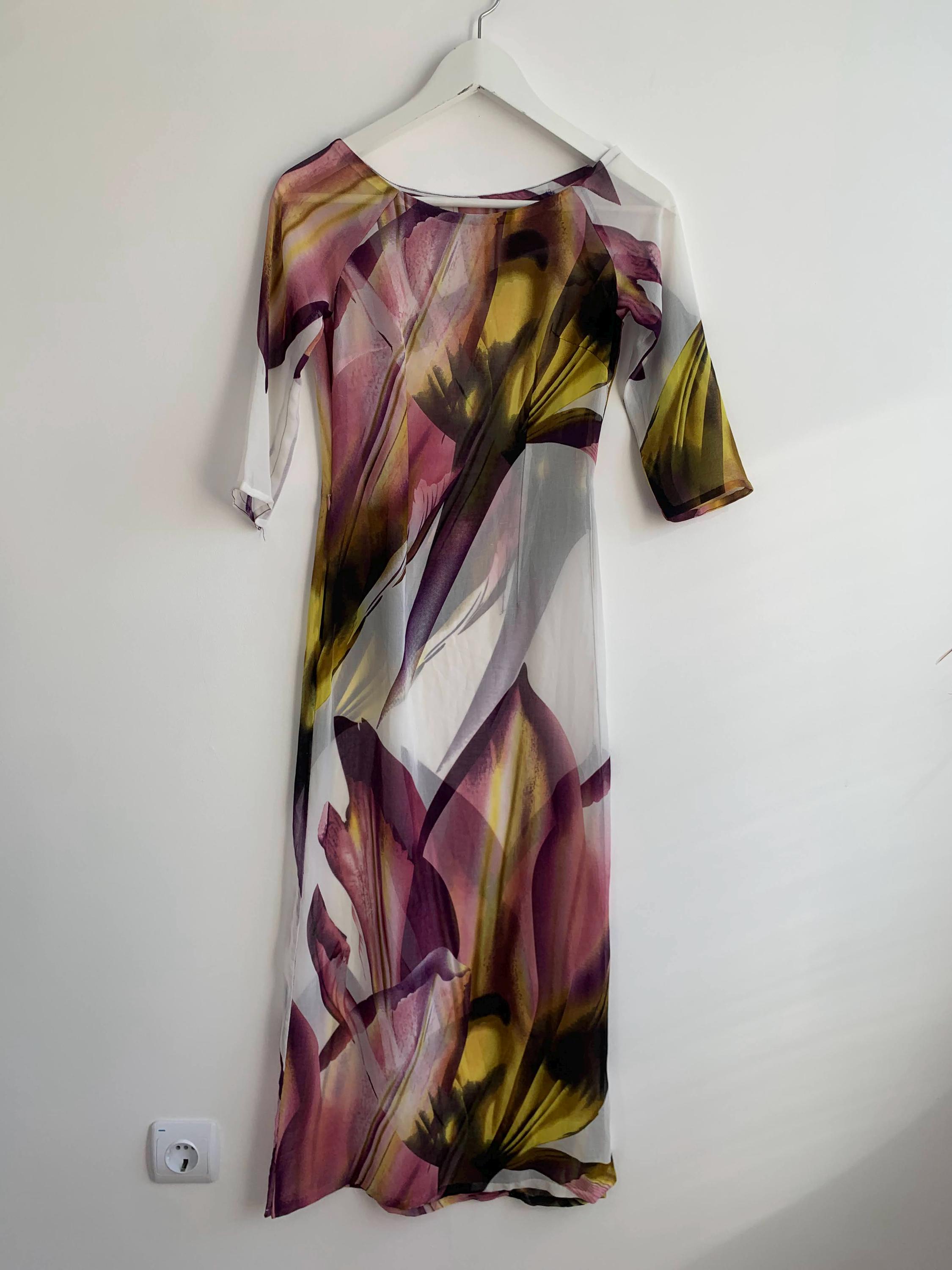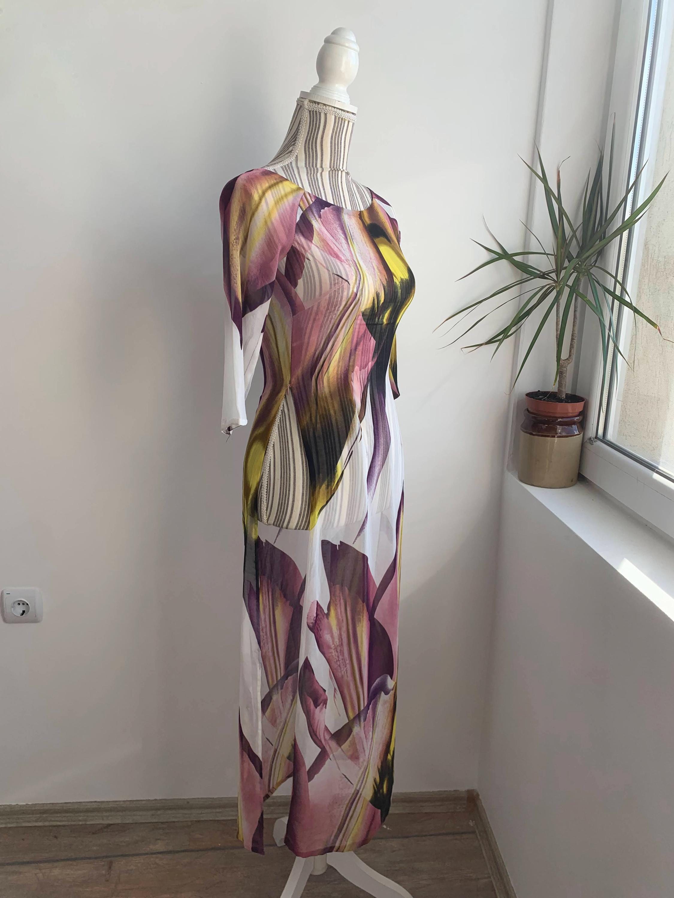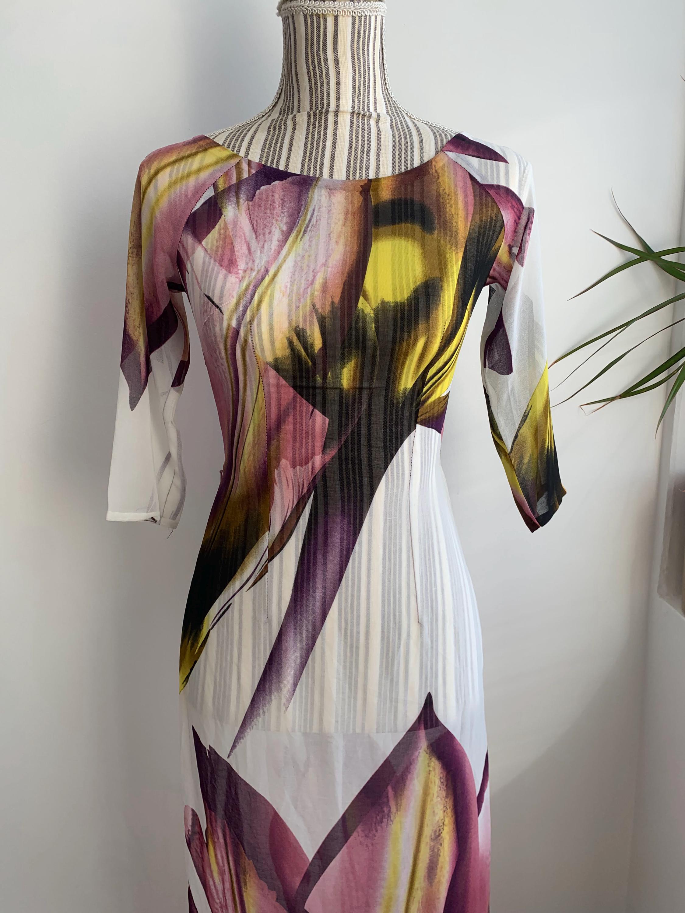 This is a beautiful vintage 90s sheer mesh maxi dress with high side slits on both sides to about the waist and side zip up closure. This grunge overlay dress has scoop neck and half sleeves. It has a fitted bodycon silhouette. There is no size marked, it fits like women's size XXS.