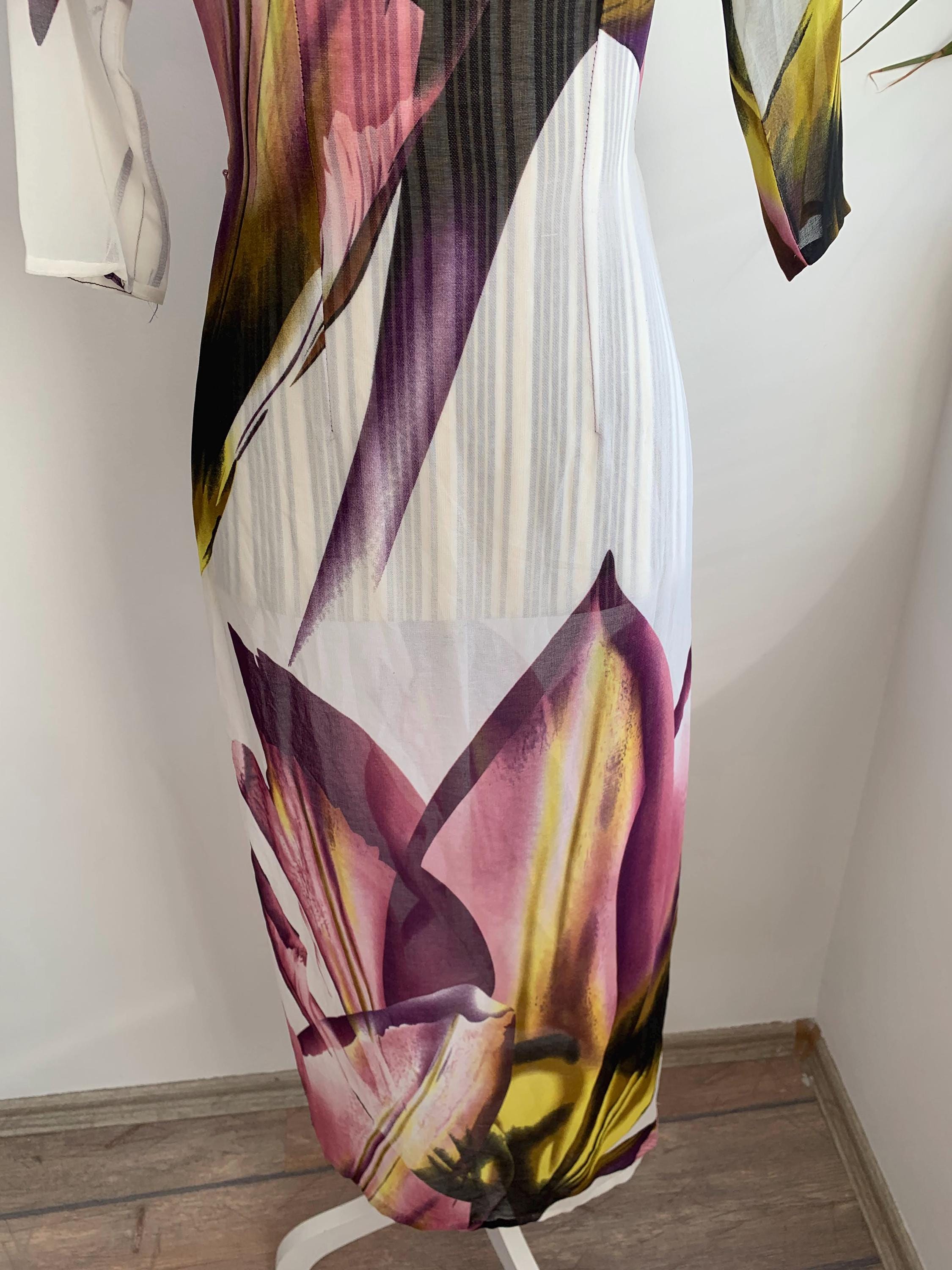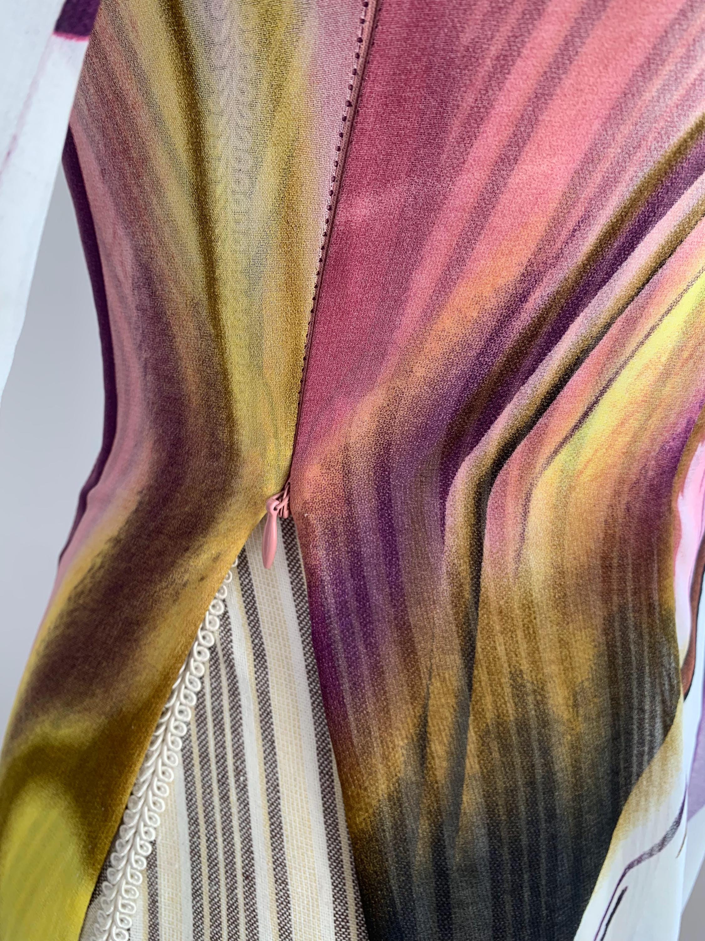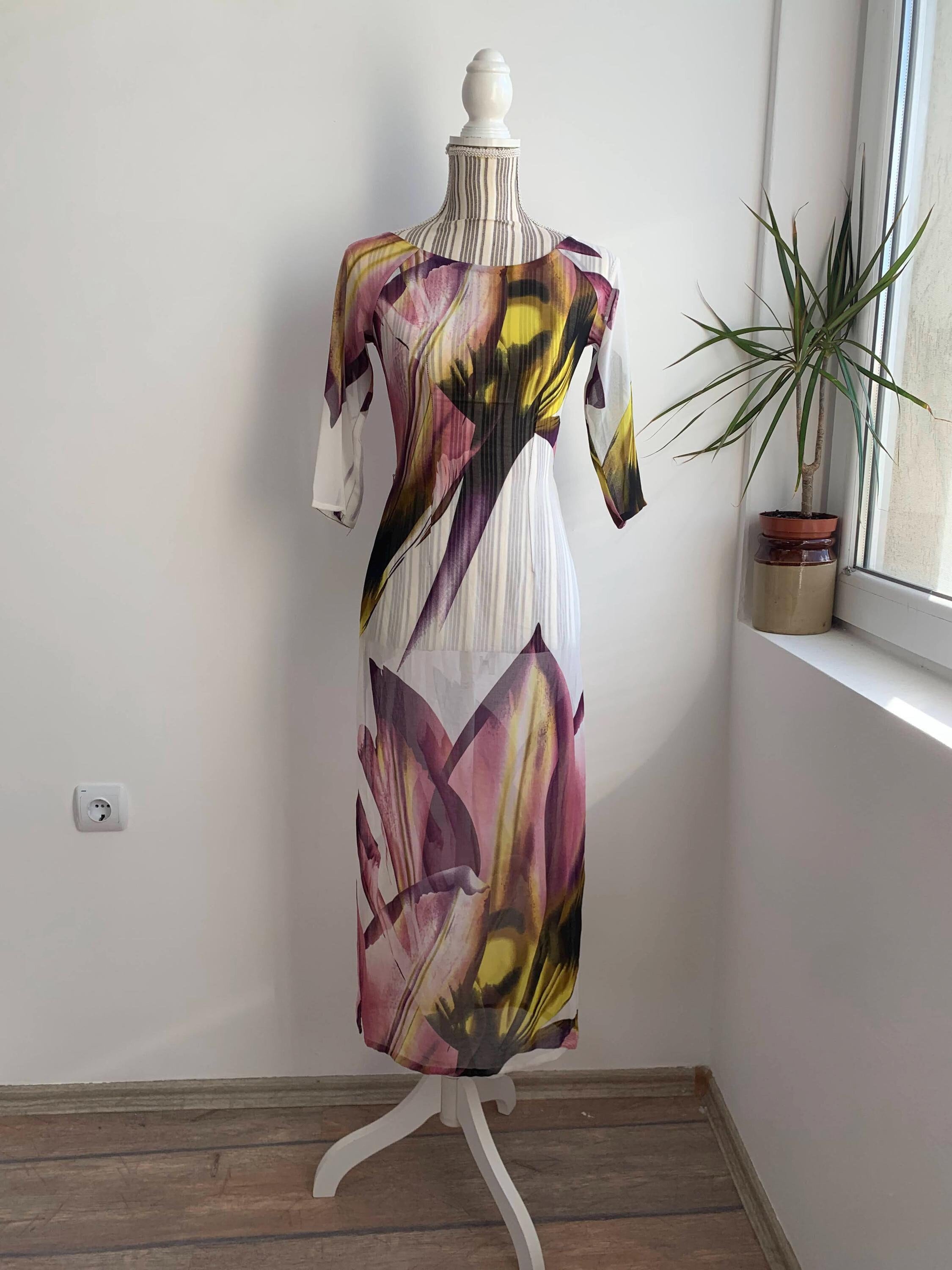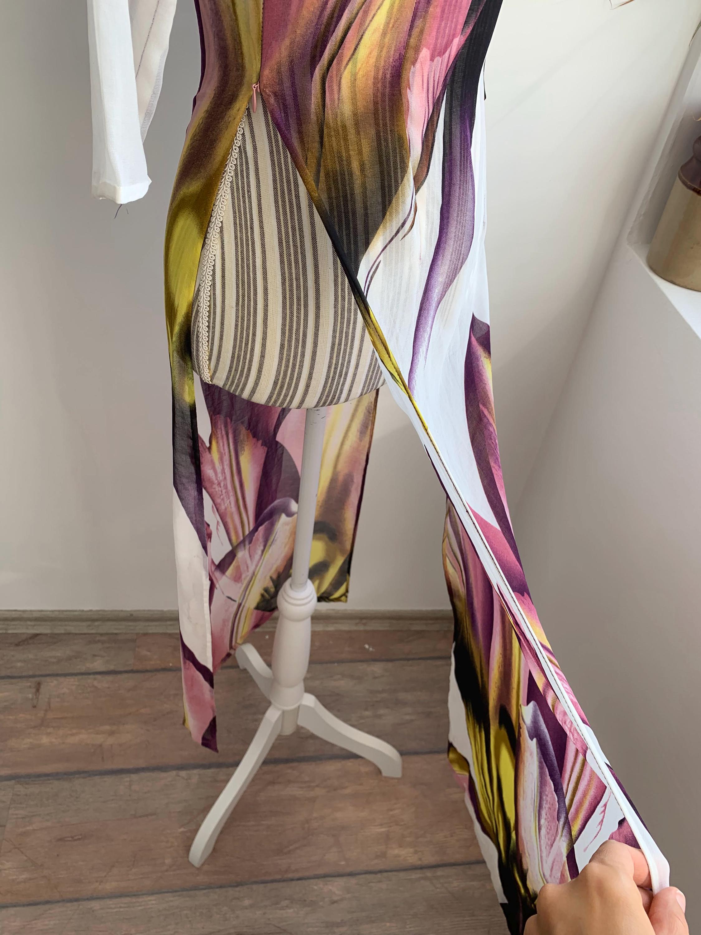This is a beautiful vintage 90s sheer mesh maxi dress with high side slits on both sides to about the waist and side zip up closure. This grunge overlay dress has scoop neck and half sleeves. It has a fitted bodycon silhouette. There is no size marked, it fits like women's size XXS.