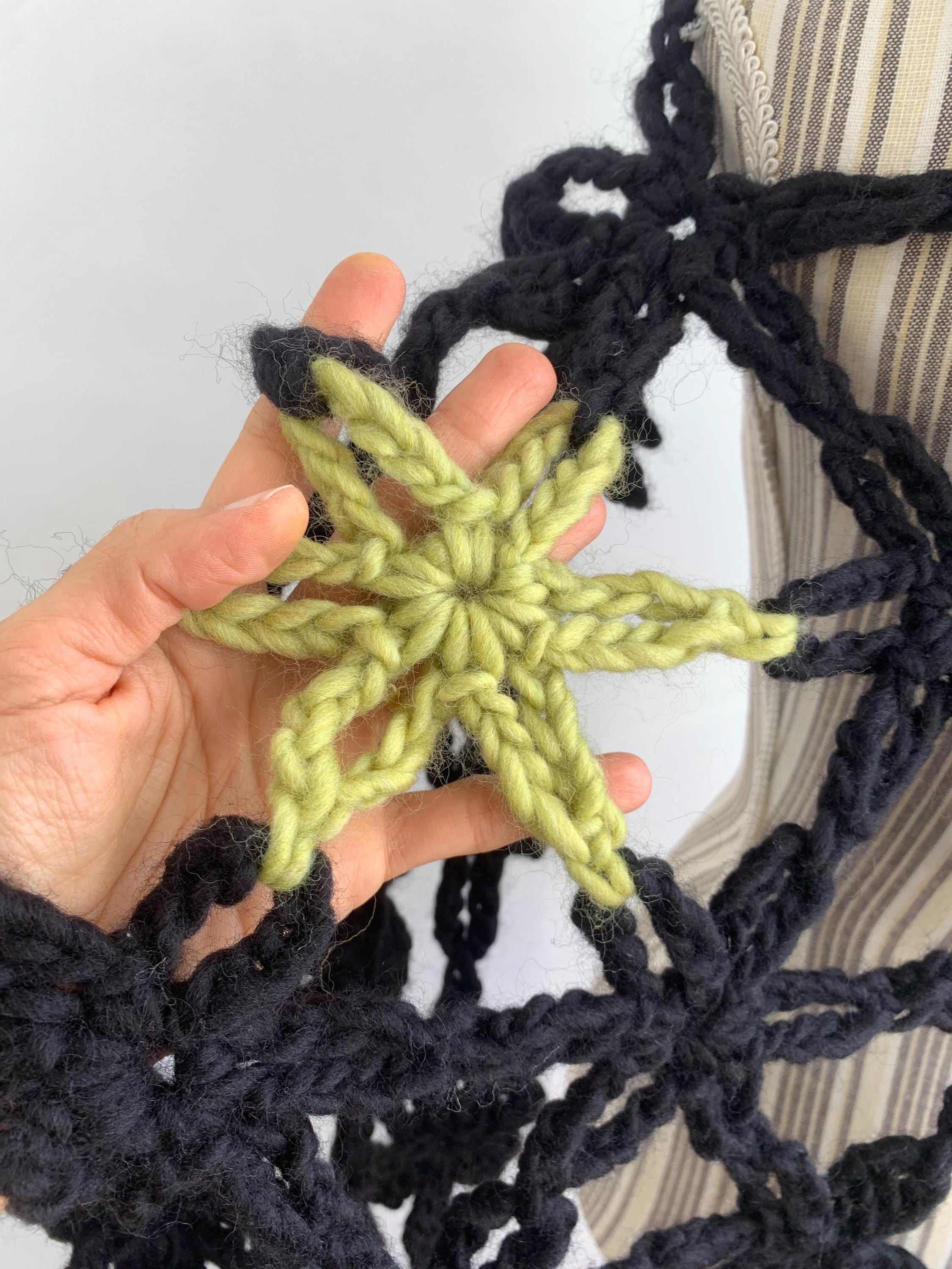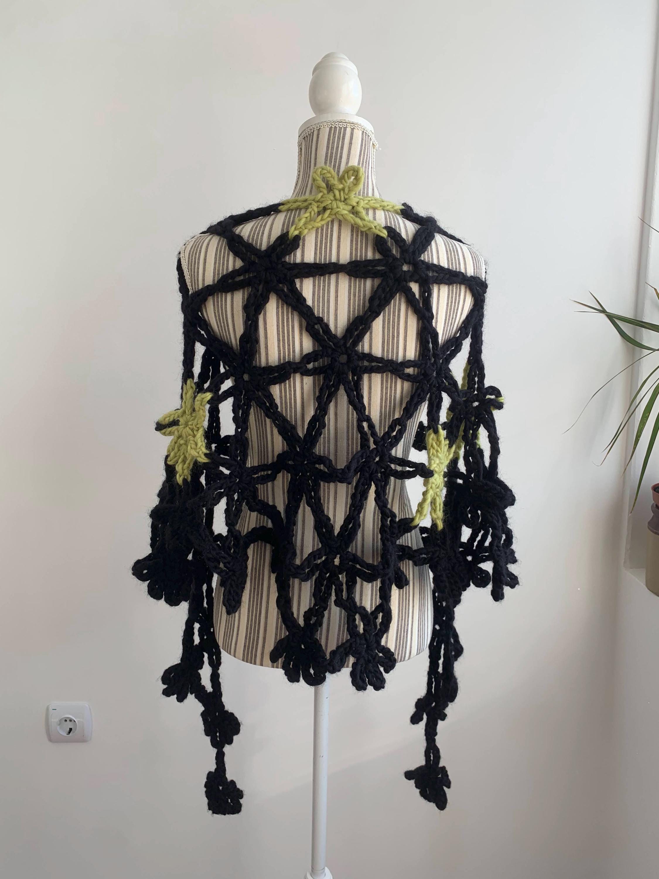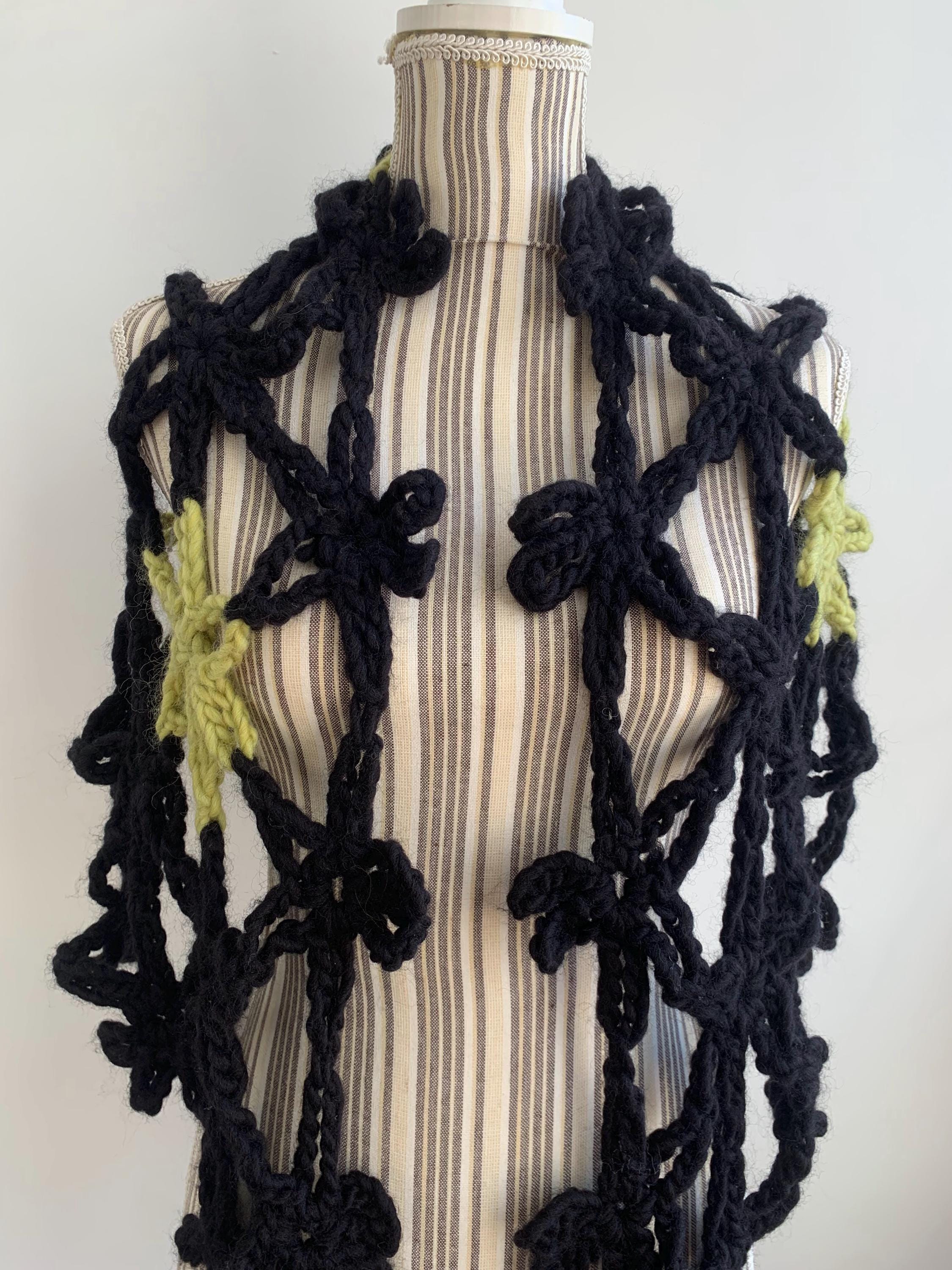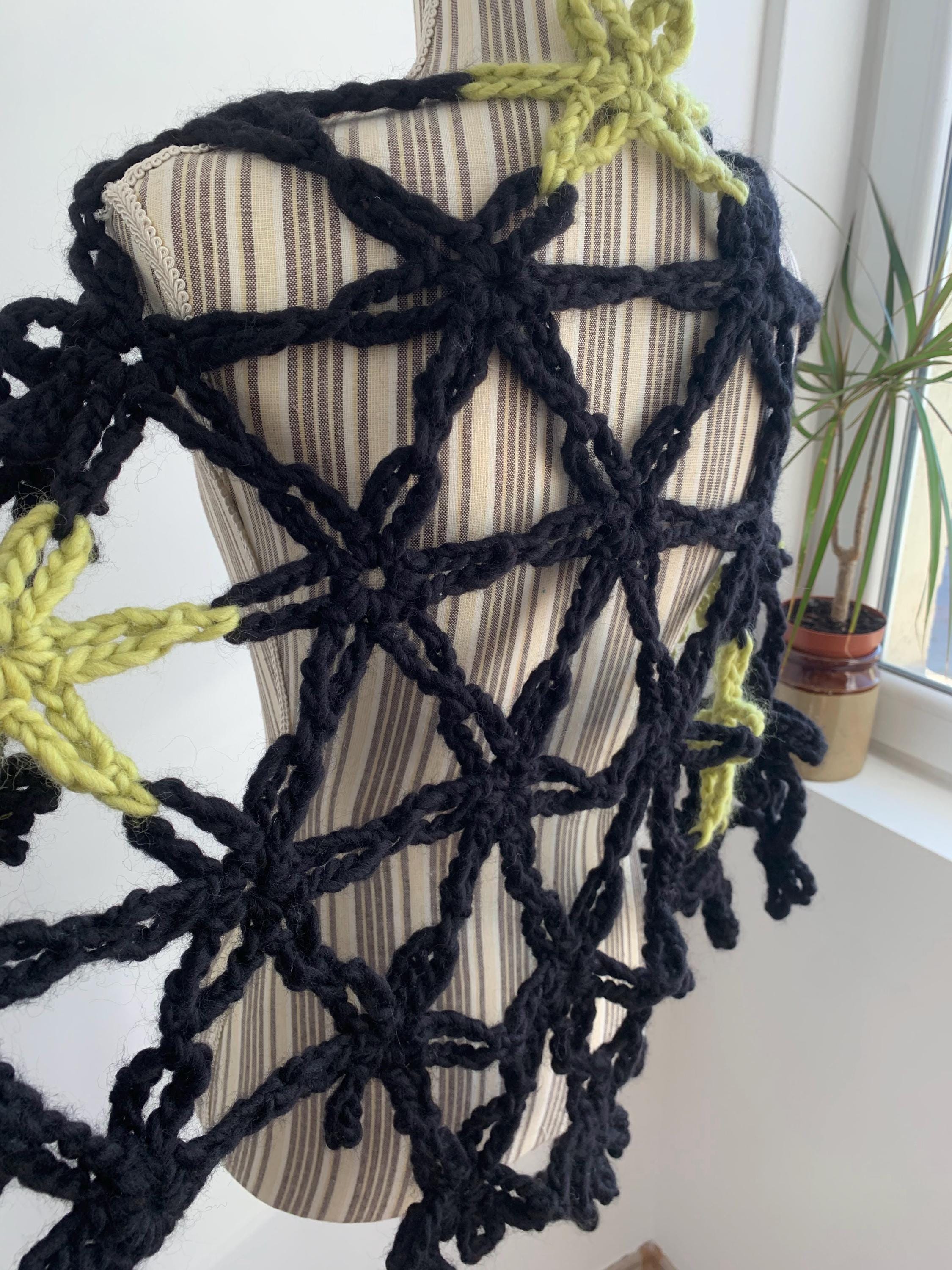 This is a beautiful vintage 90s jumbo flower crochet shawl in black and lime green. This chunky knit shawl is so versatile that you can wear in a variety of ways. This bohemian cover up is made of thick super soft and fluffy mohair acrylic wool yarn which will keep you warm and cozy. Perfect romantic wrap shawl for any occasion. Wonderful vintage gift for her