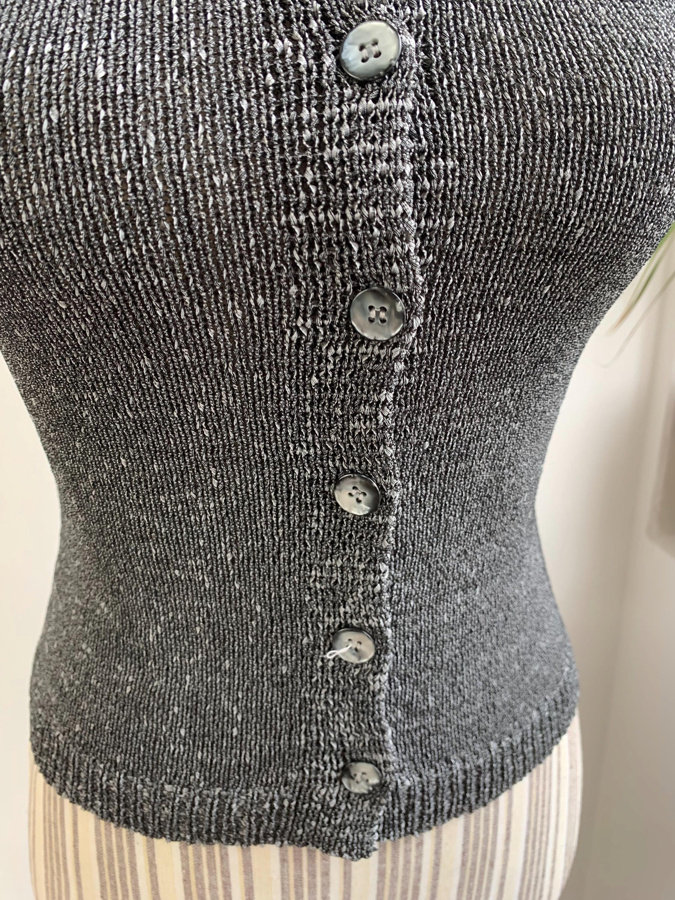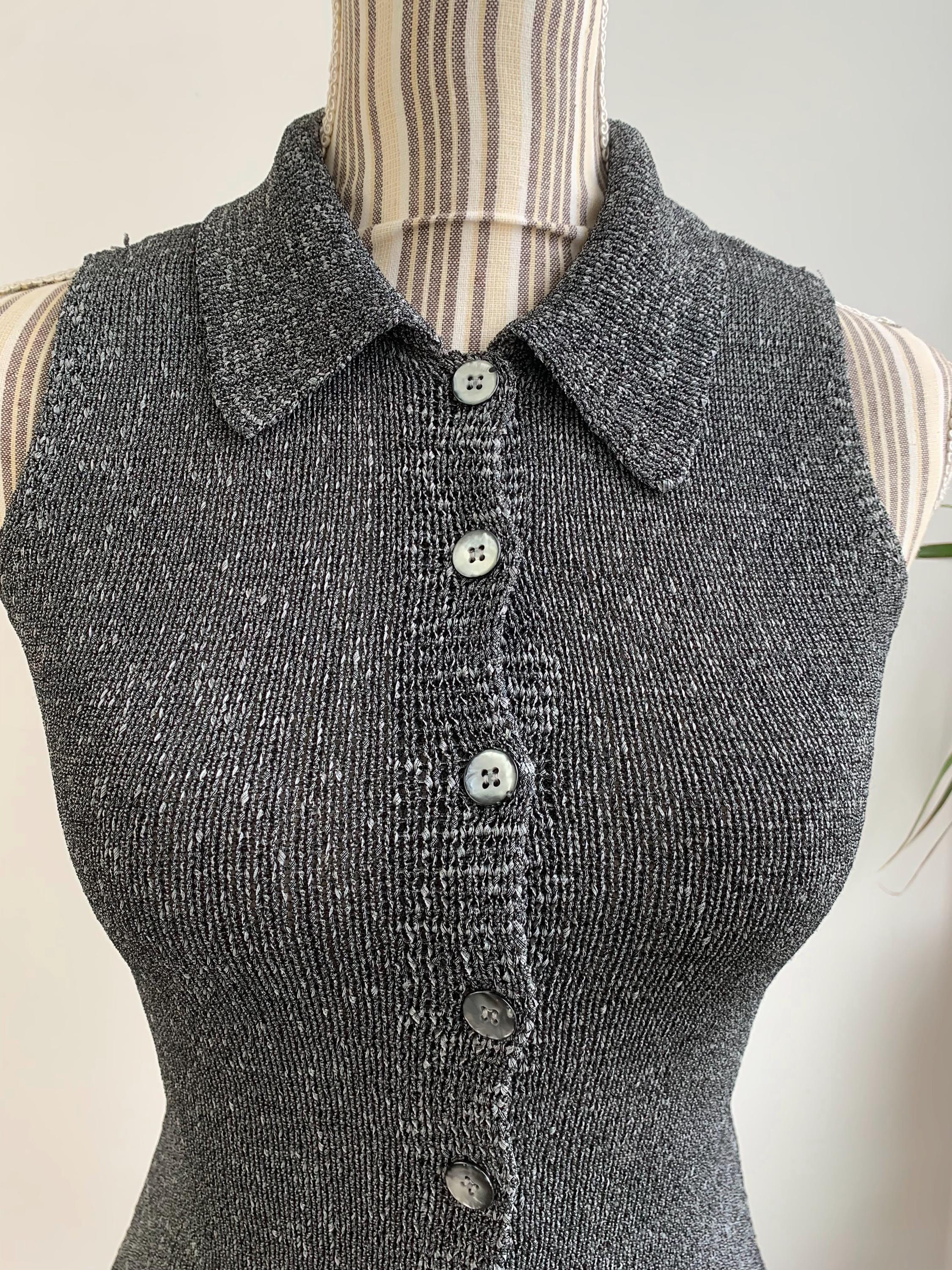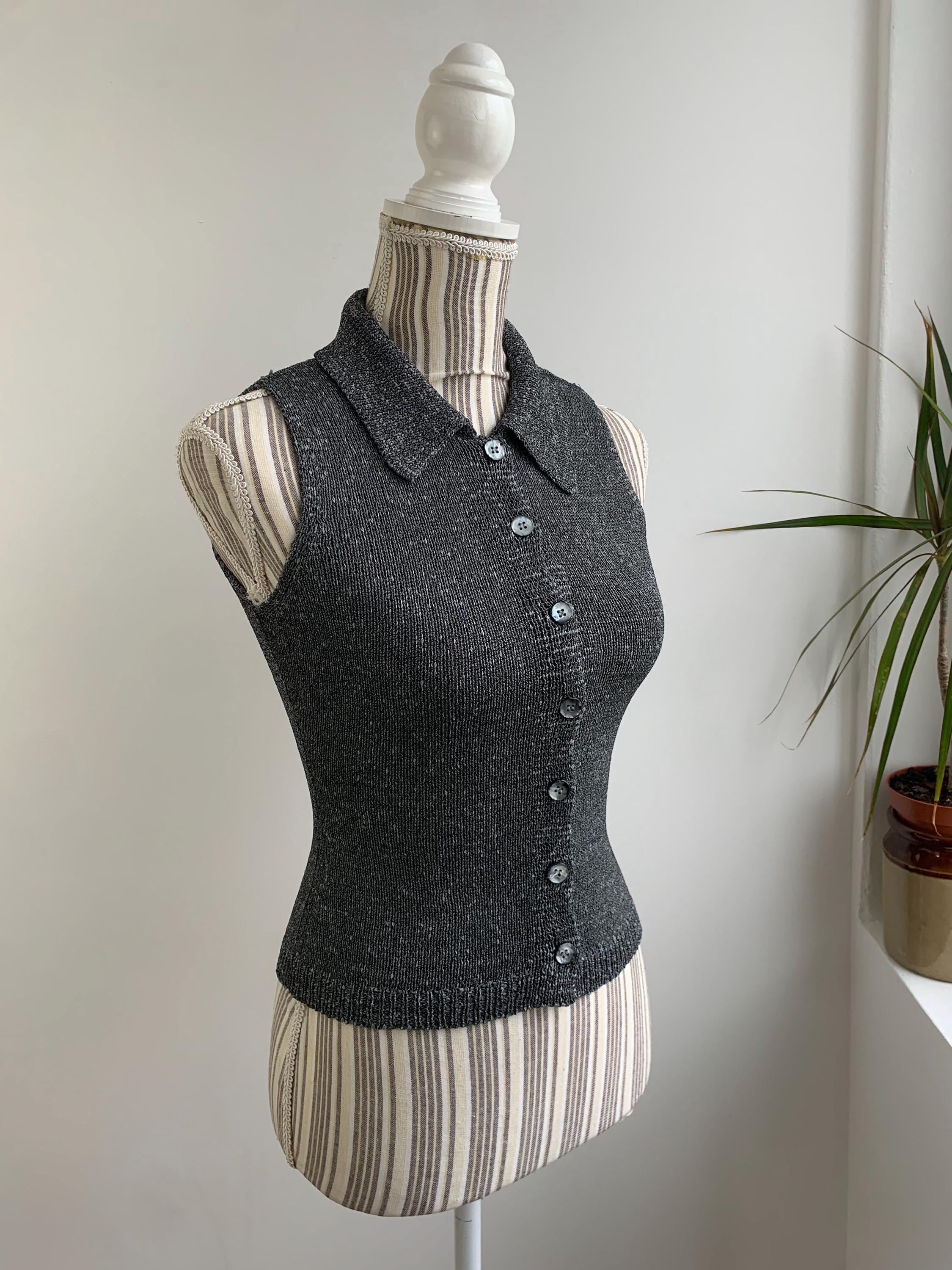 This is a lovely vintage 90s knitted stretchy collared tank top button front closure. This slim fit elastic vest top fits like size XXS. This collared neck vest top has a good bit of stretch. The fabric feels like stretchy viscose, cotton blend.